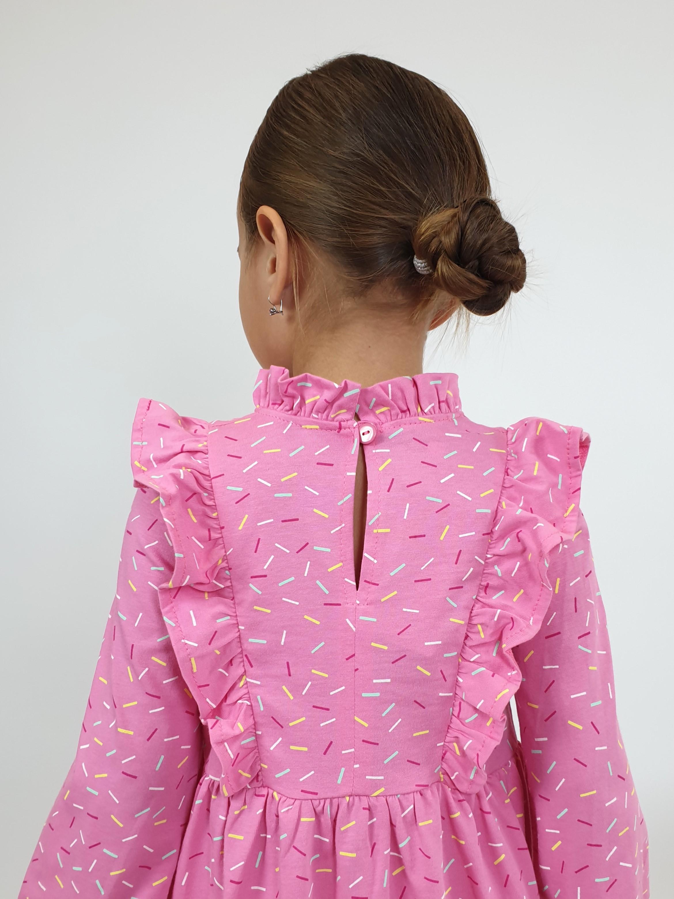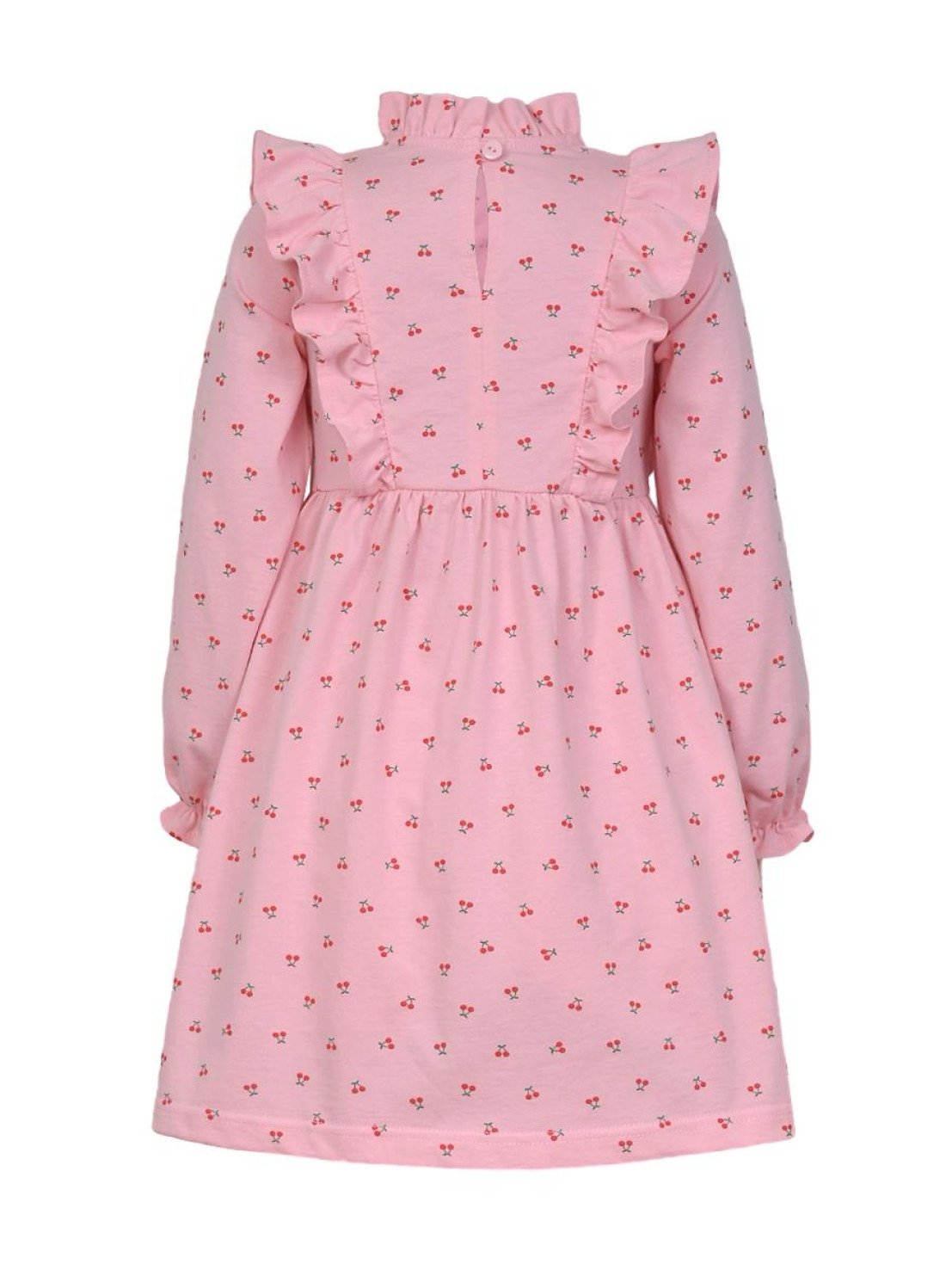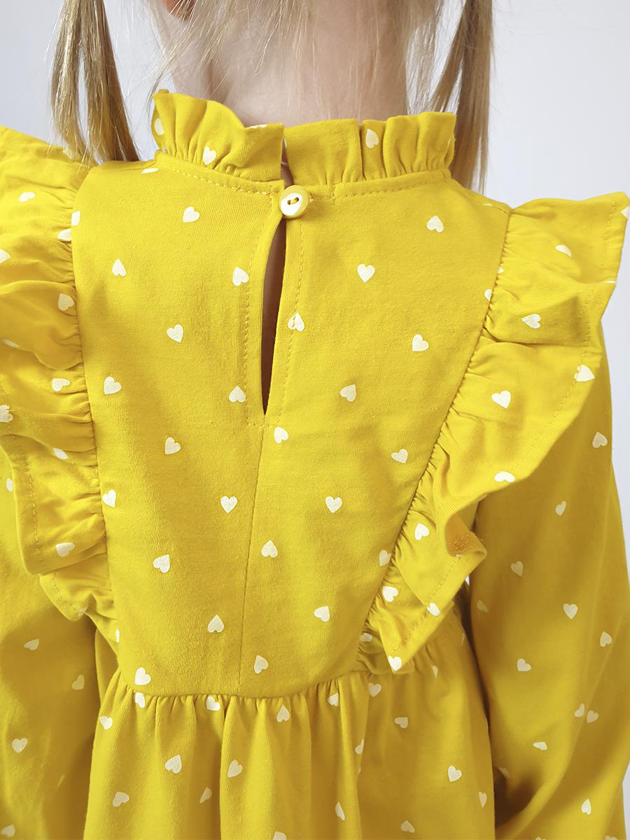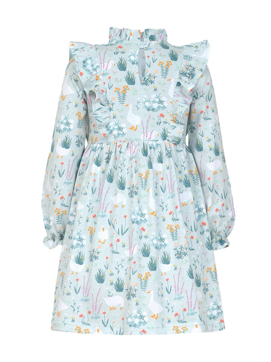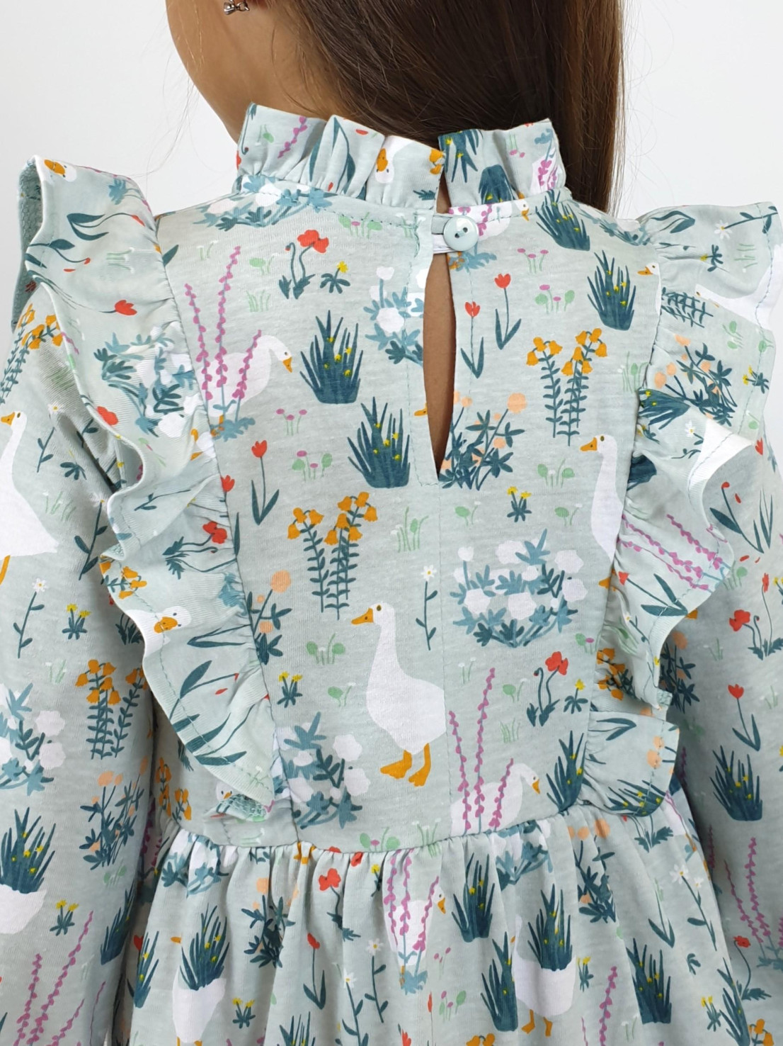 Кулирное полотно (набивка):100%х/б. Платье-отрезная юбка в сборку,кокетка переда и рельефы спинки с рюшей.Рукав длинный,внизу на резинке(венгерке).В горловине рюша со сгибом,шов окантован и подшит.Застежка по спинке на пуговицу.