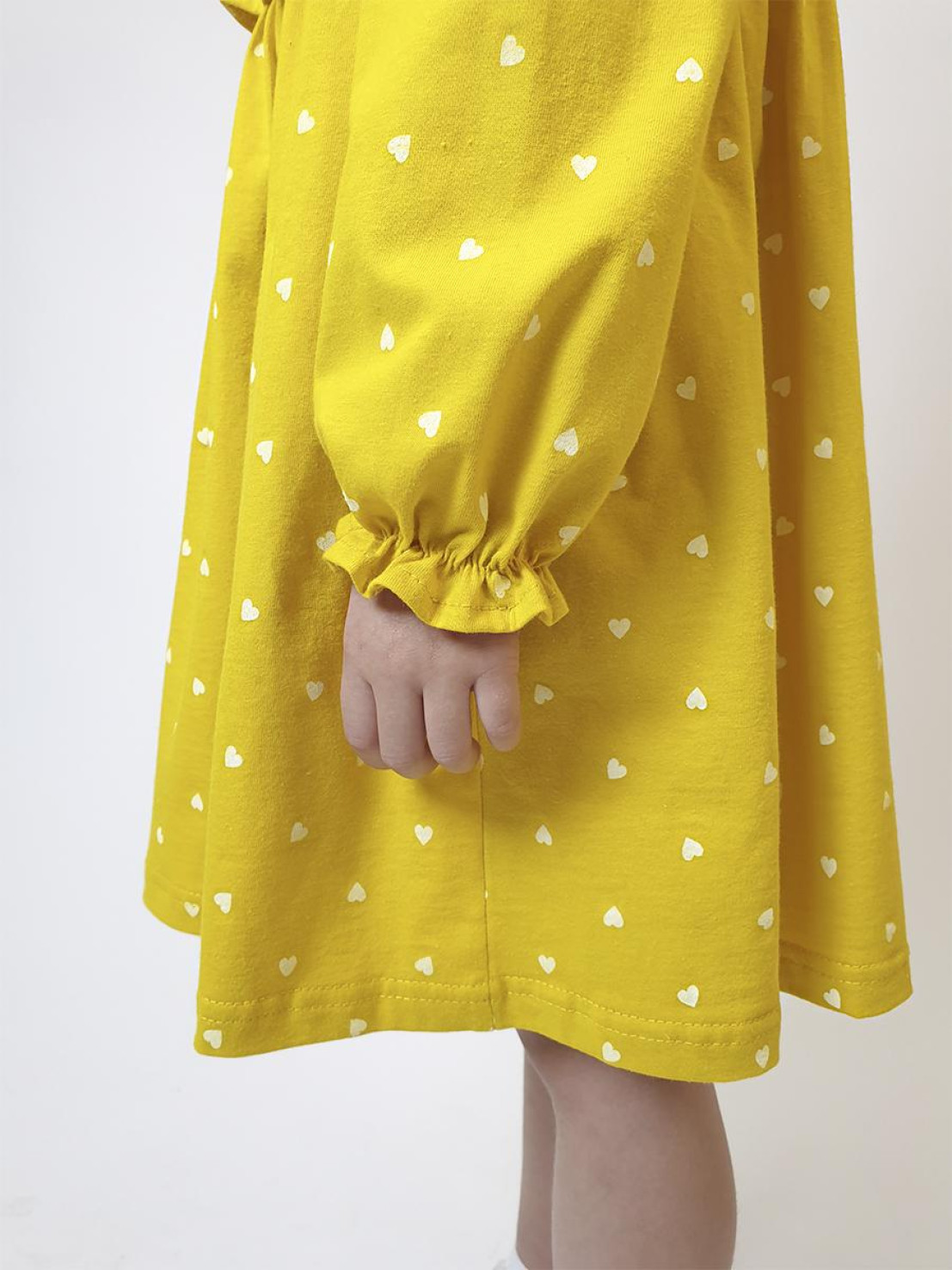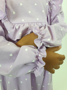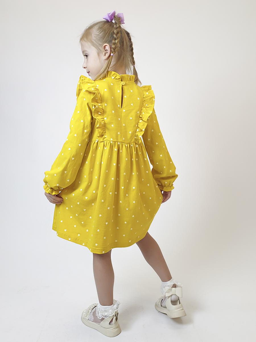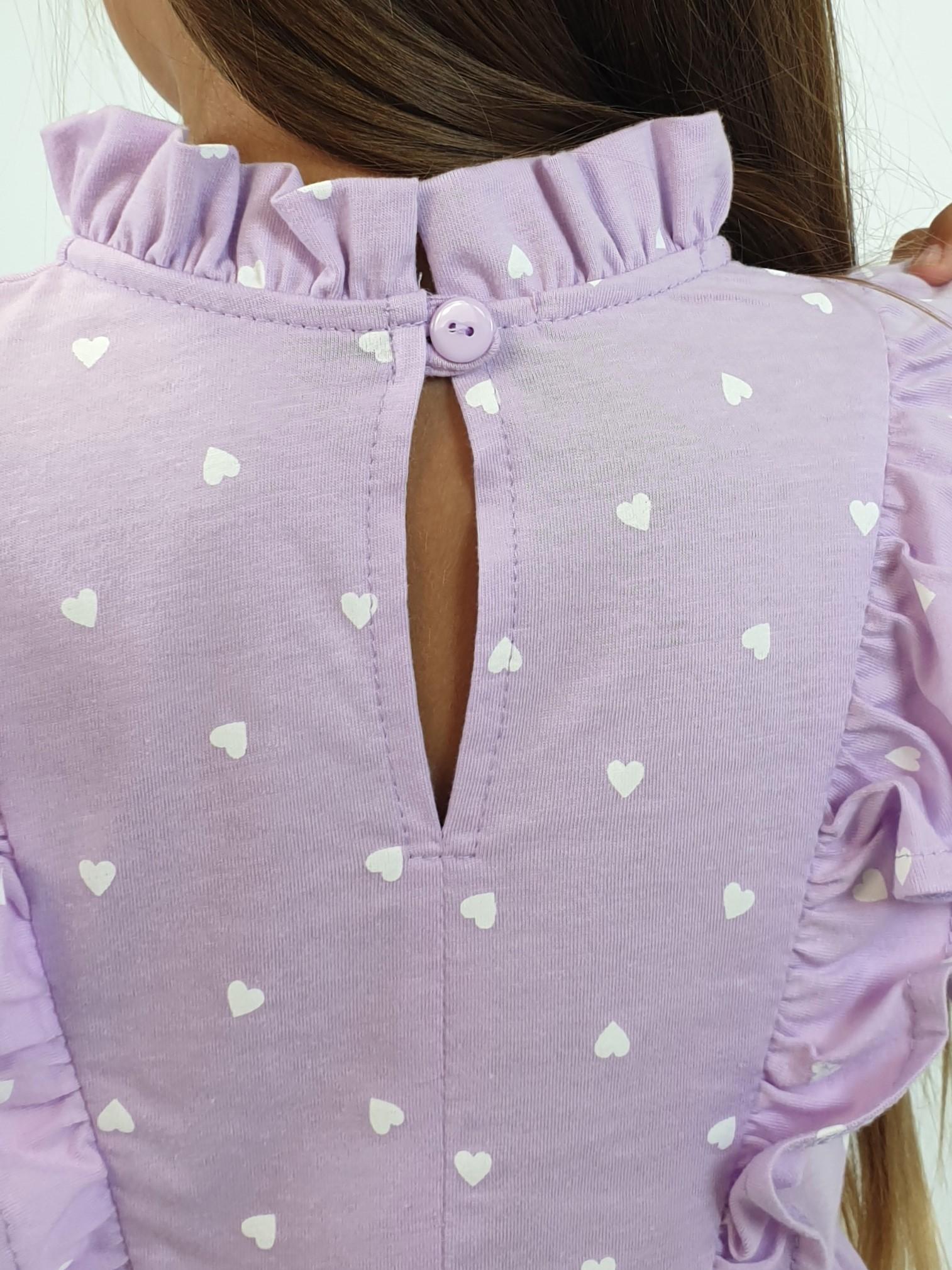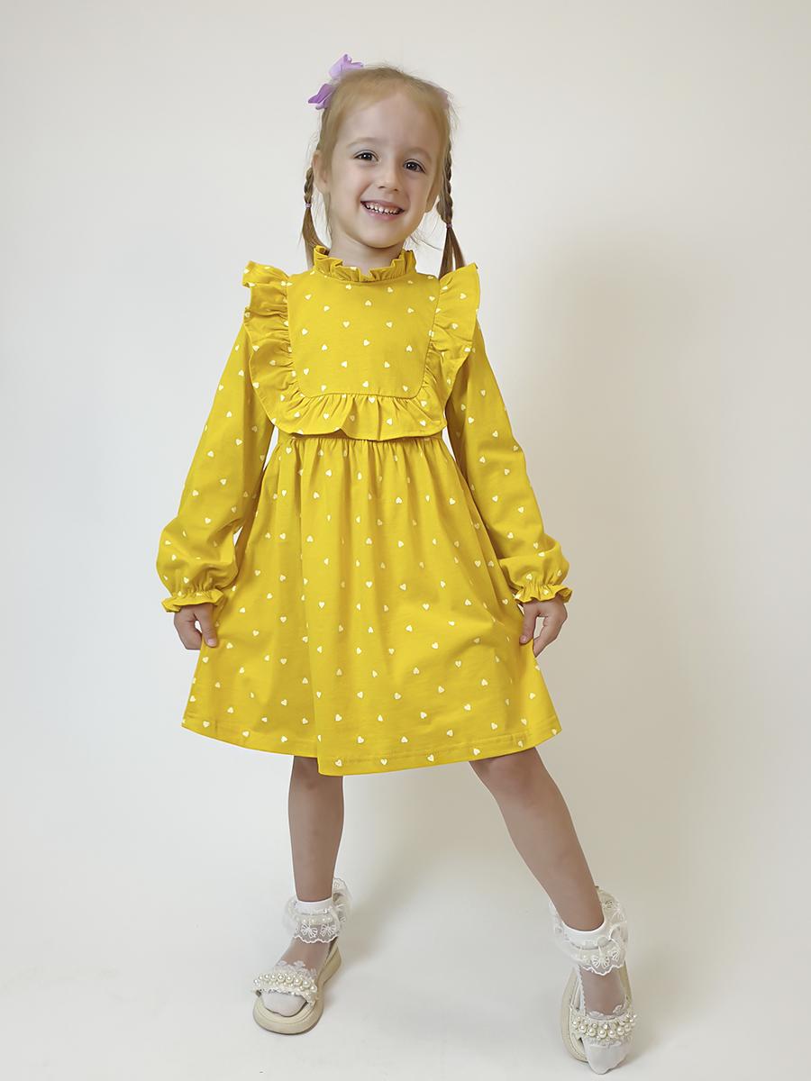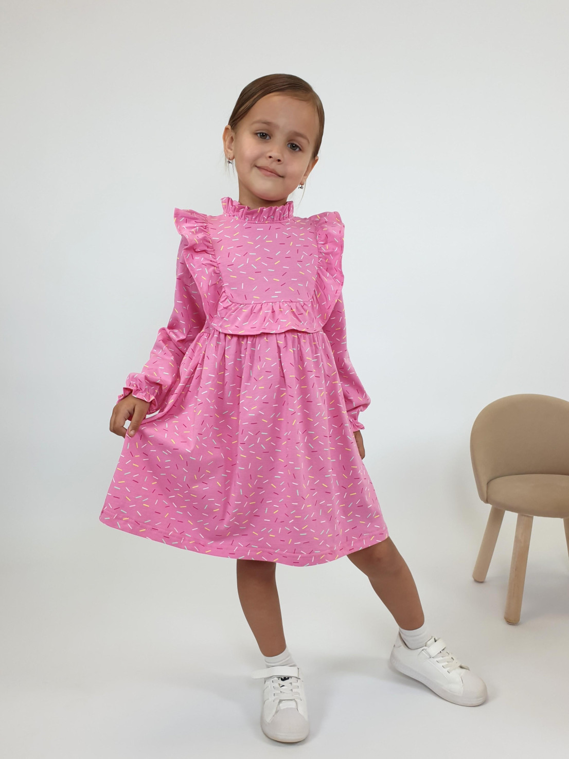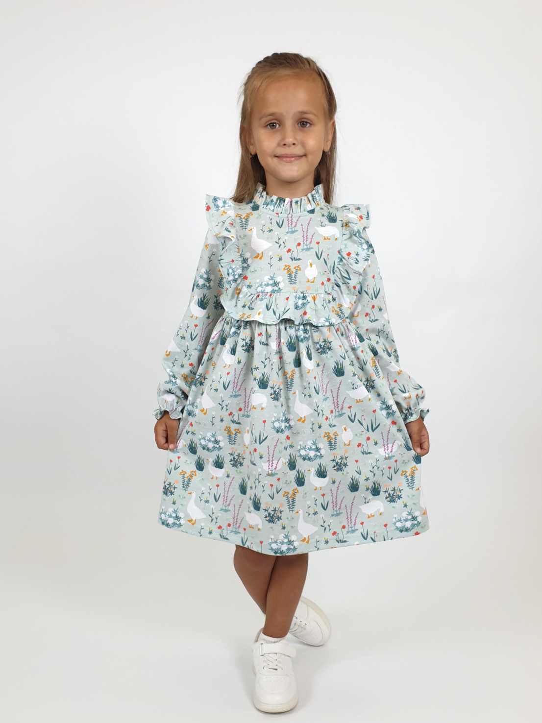 Кулирное полотно (набивка):100%х/б. Платье-отрезная юбка в сборку,кокетка переда и рельефы спинки с рюшей.Рукав длинный,внизу на резинке(венгерке).В горловине рюша со сгибом,шов окантован и подшит.Застежка по спинке на пуговицу.