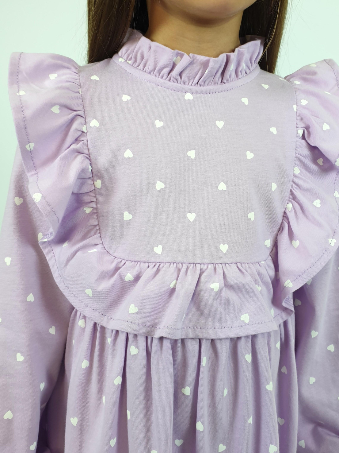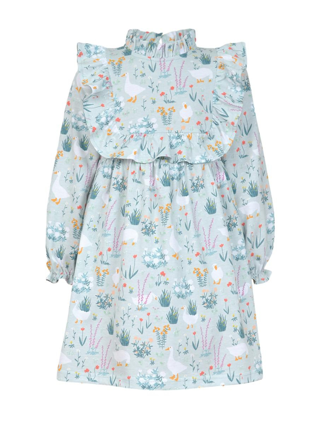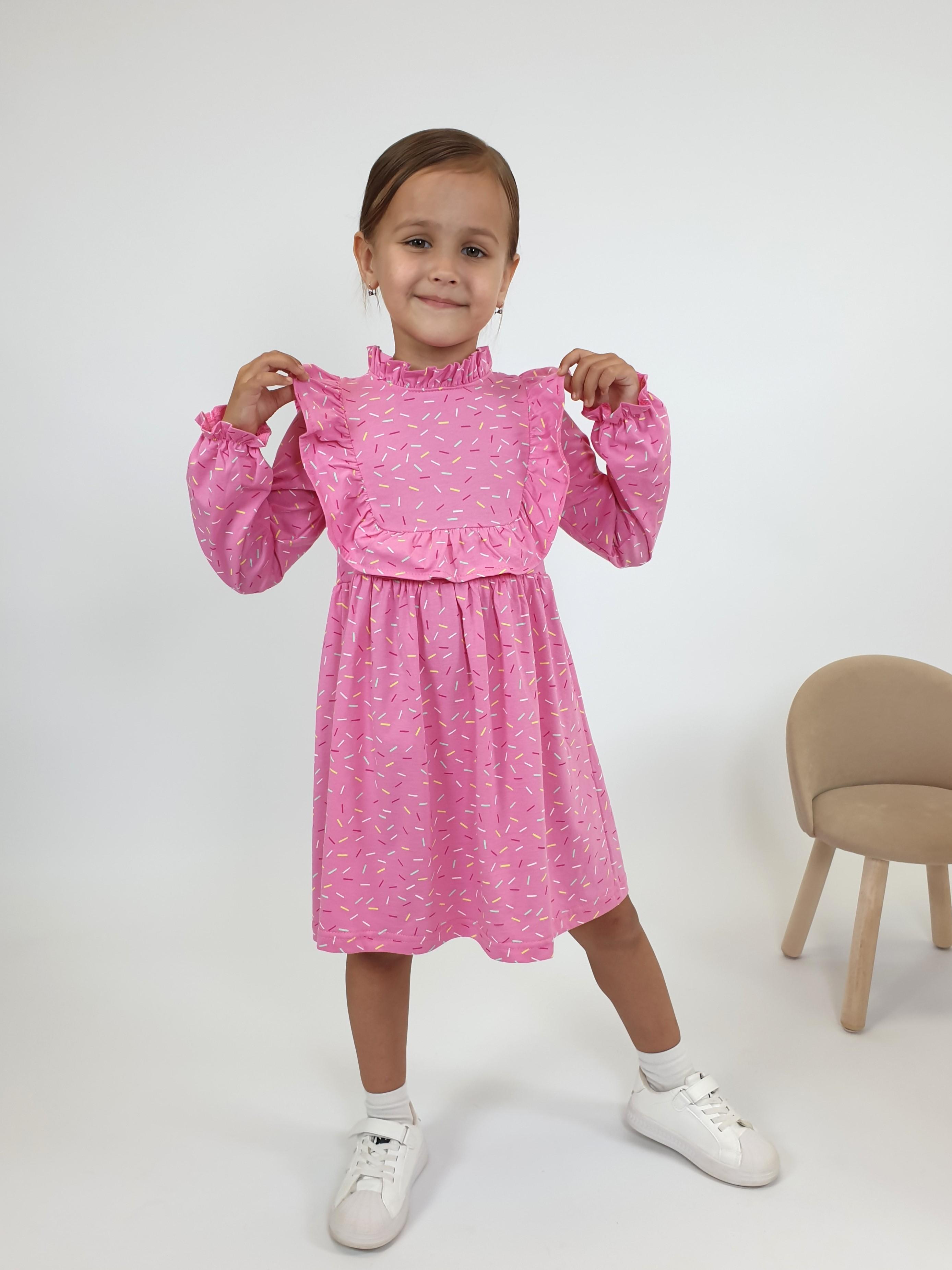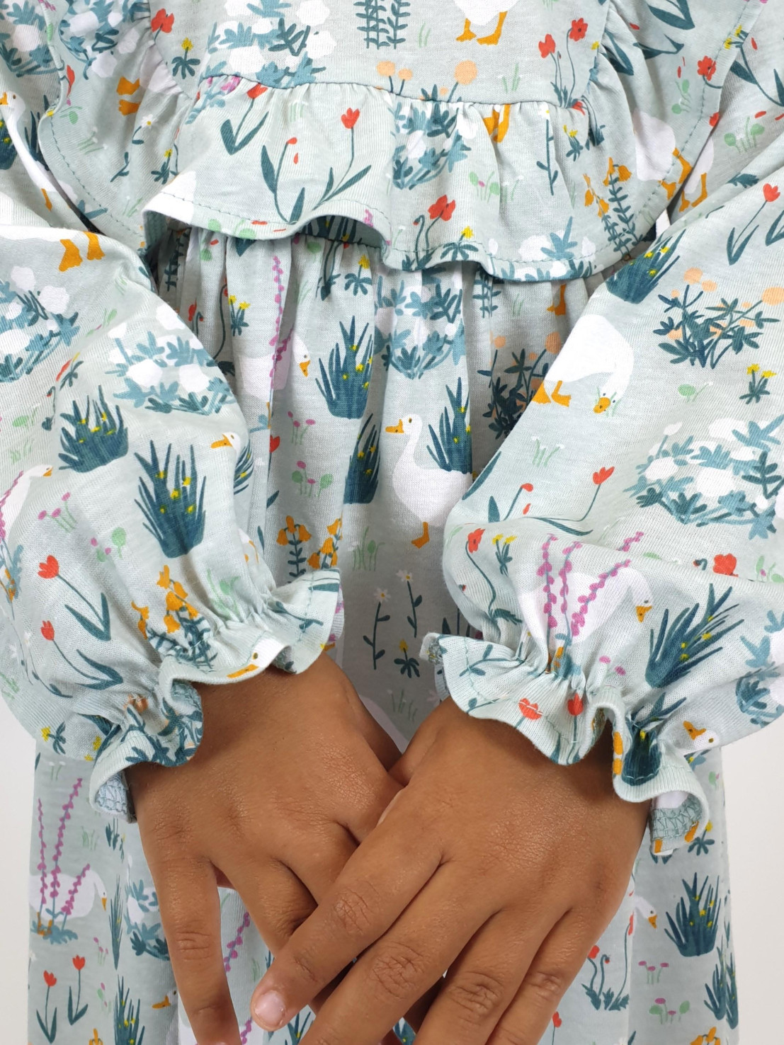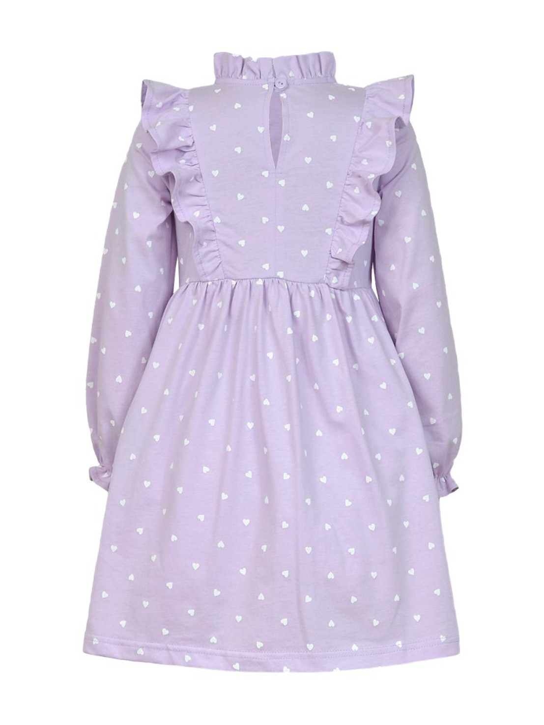 Кулирное полотно (набивка):100%х/б. Платье-отрезная юбка в сборку,кокетка переда и рельефы спинки с рюшей.Рукав длинный,внизу на резинке(венгерке).В горловине рюша со сгибом,шов окантован и подшит.Застежка по спинке на пуговицу.