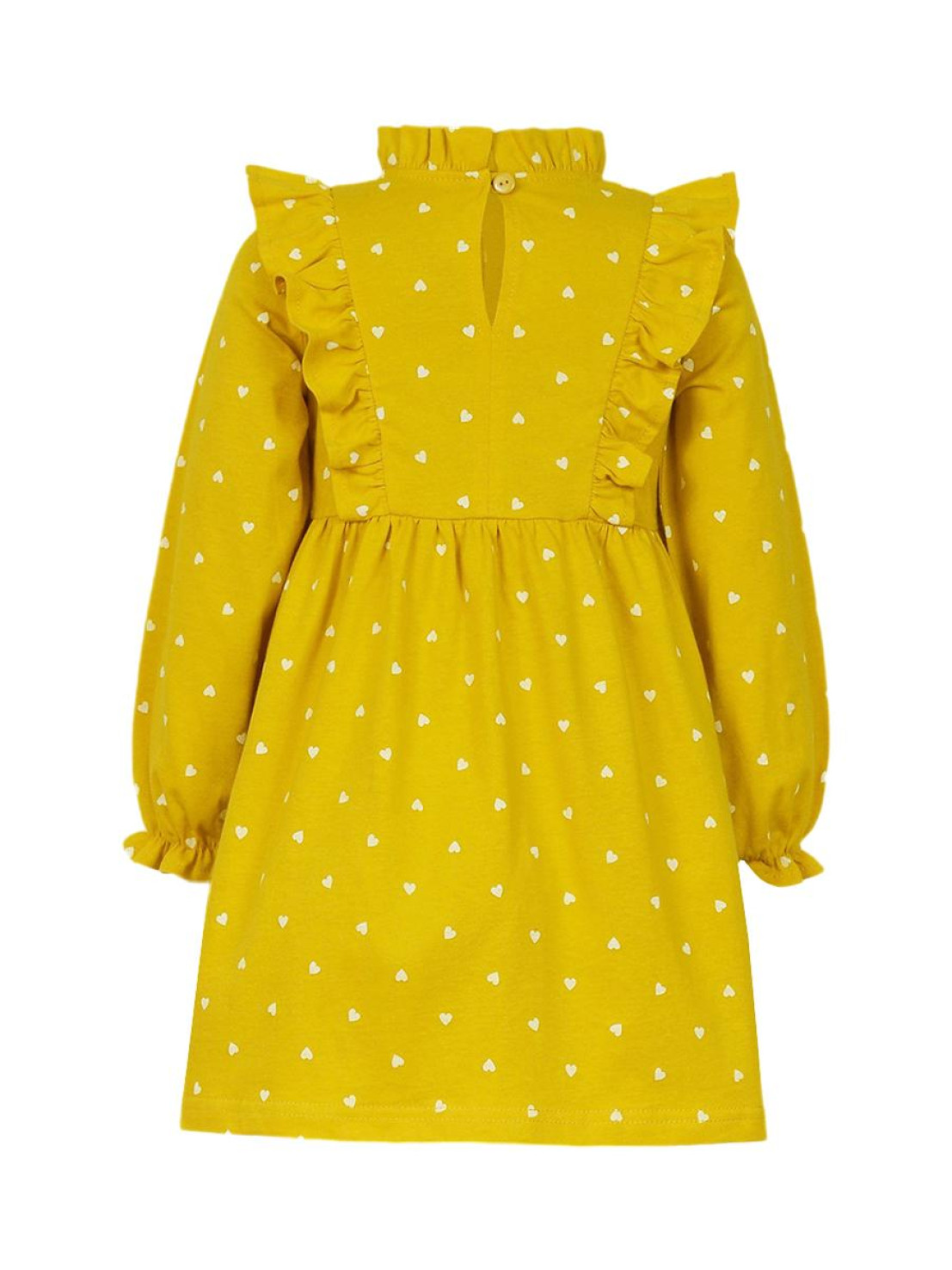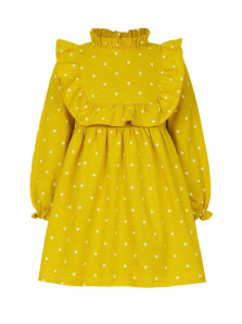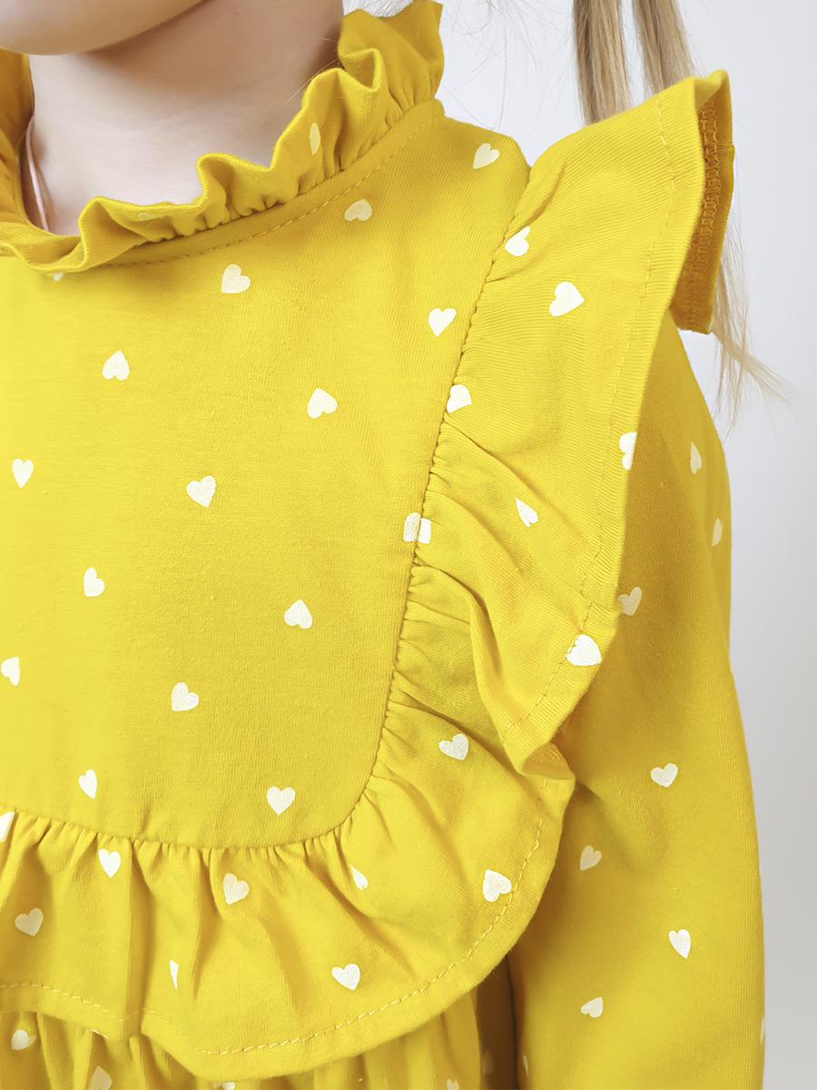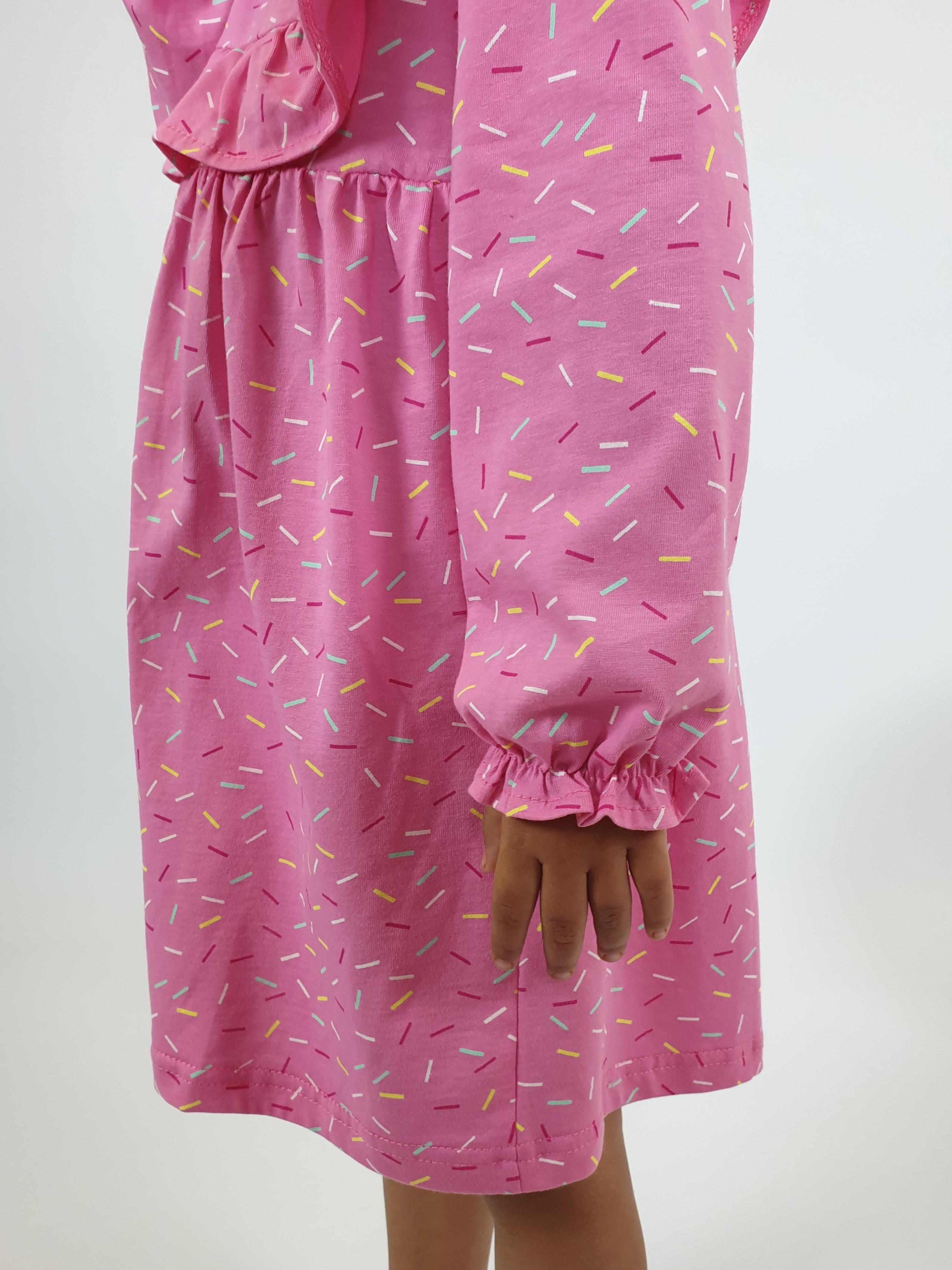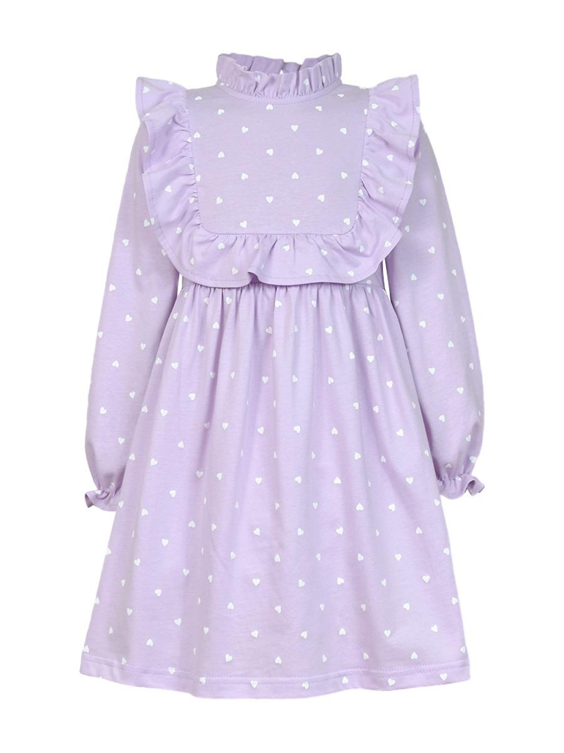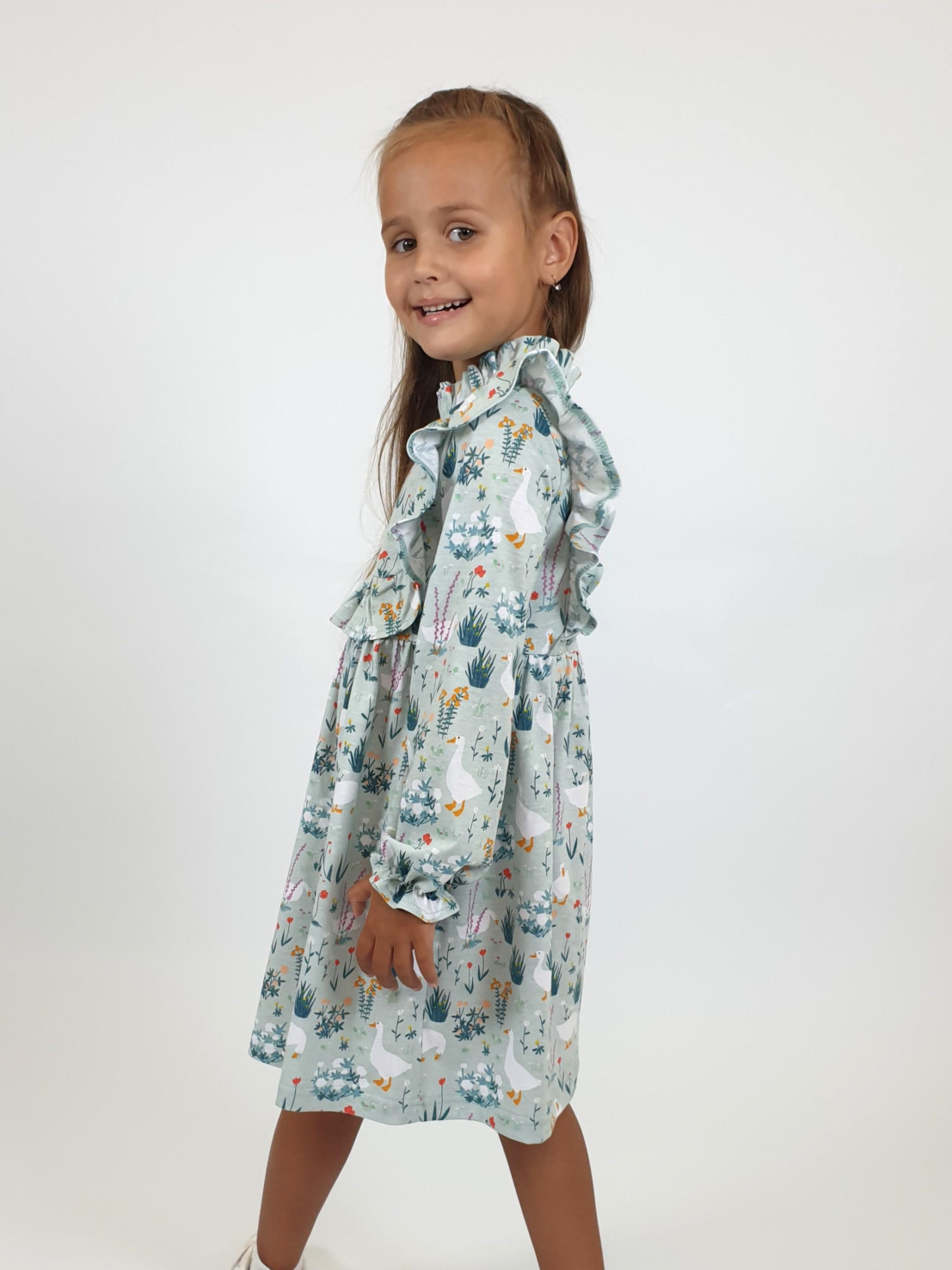 Кулирное полотно (набивка):100%х/б. Платье-отрезная юбка в сборку,кокетка переда и рельефы спинки с рюшей.Рукав длинный,внизу на резинке(венгерке).В горловине рюша со сгибом,шов окантован и подшит.Застежка по спинке на пуговицу.