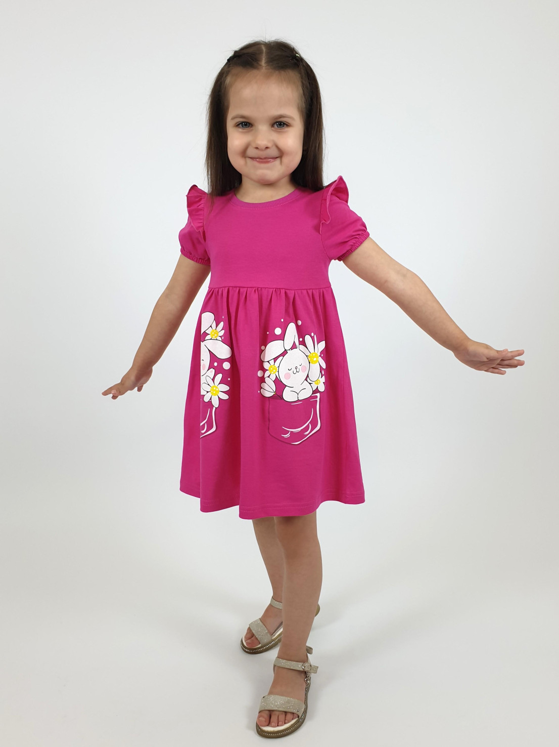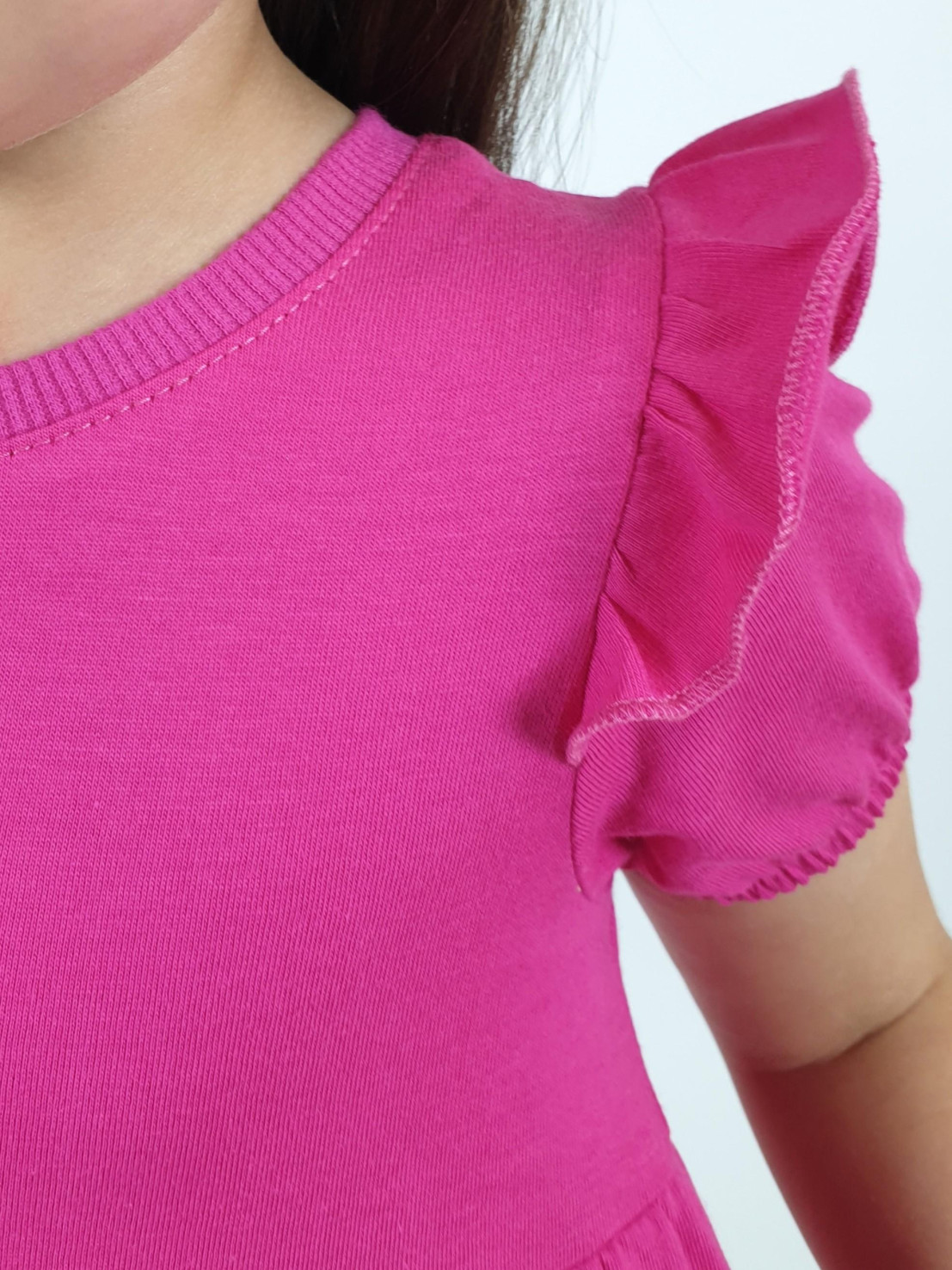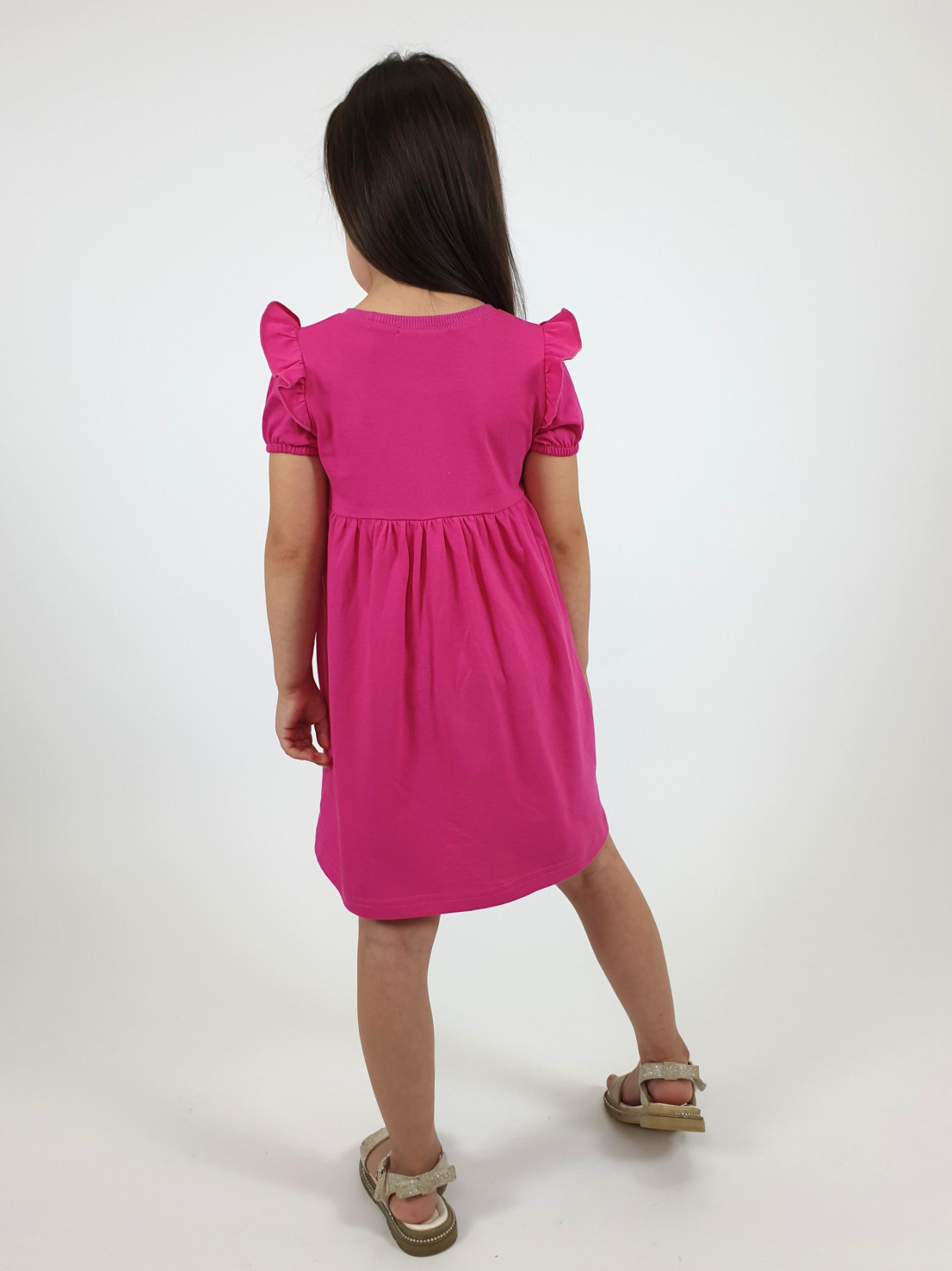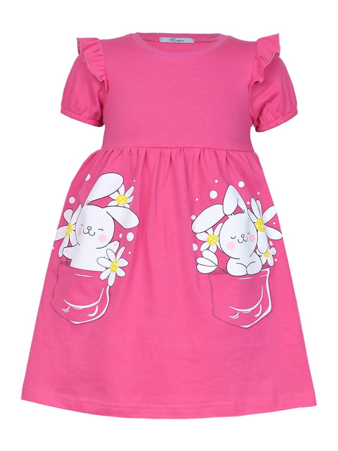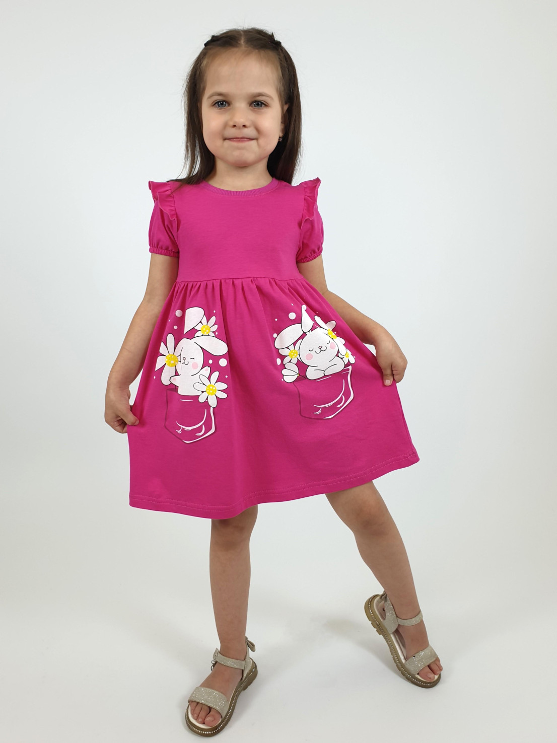 Кулирное полотно:100% х/б. Платье-перед и спинка с кокеткой,сборка по верху юбки.Рукав короткий,внизу собран на резинку,в пройме рюша.Горловина обработана ластиком.Печать на переднем полотнище юбки.