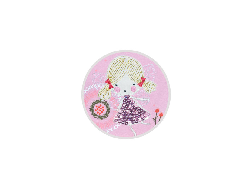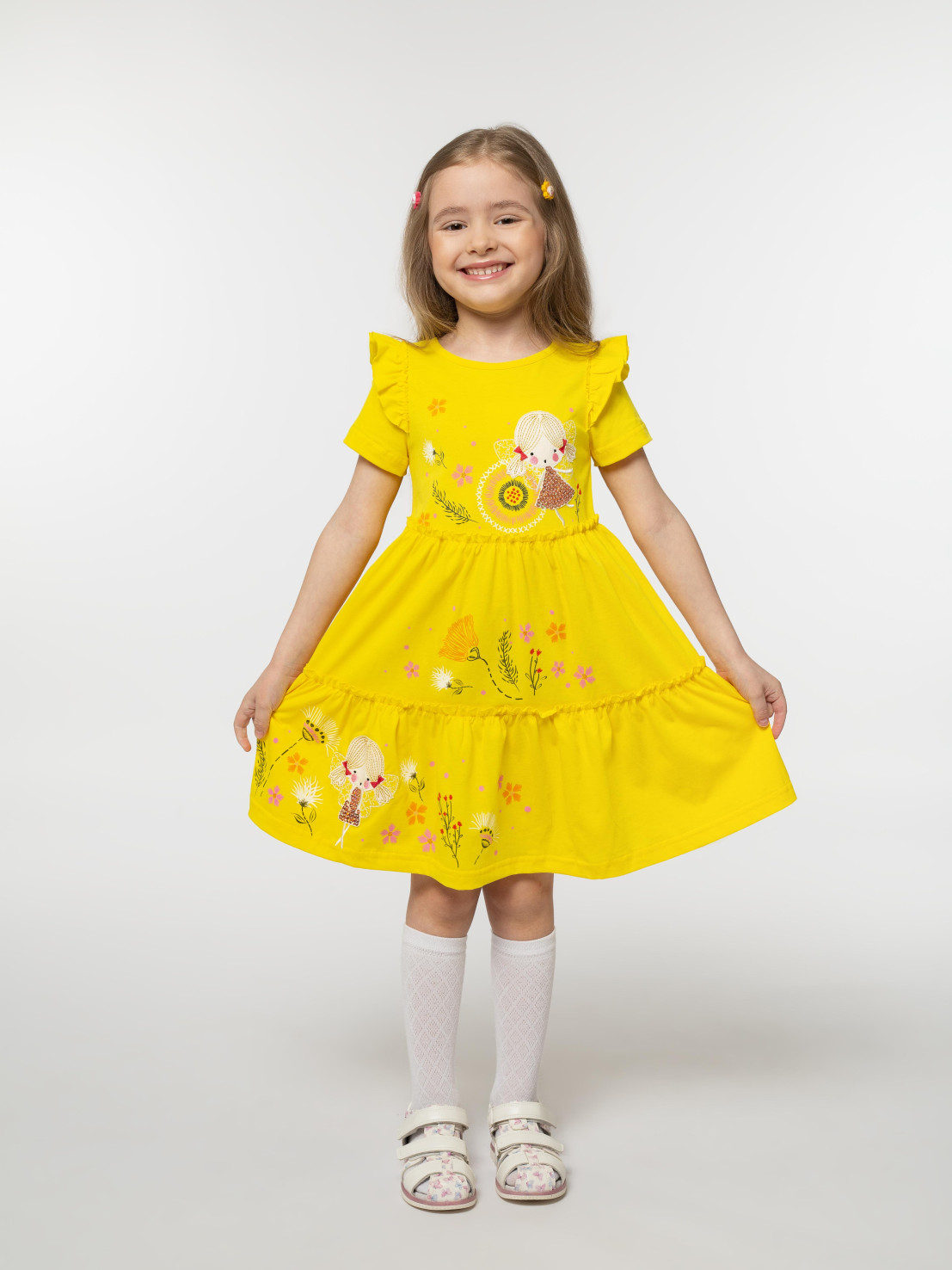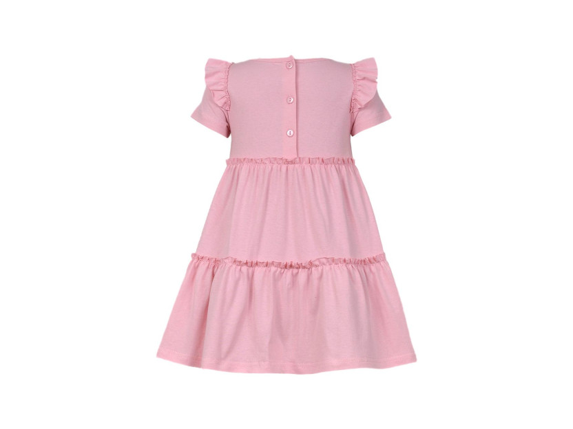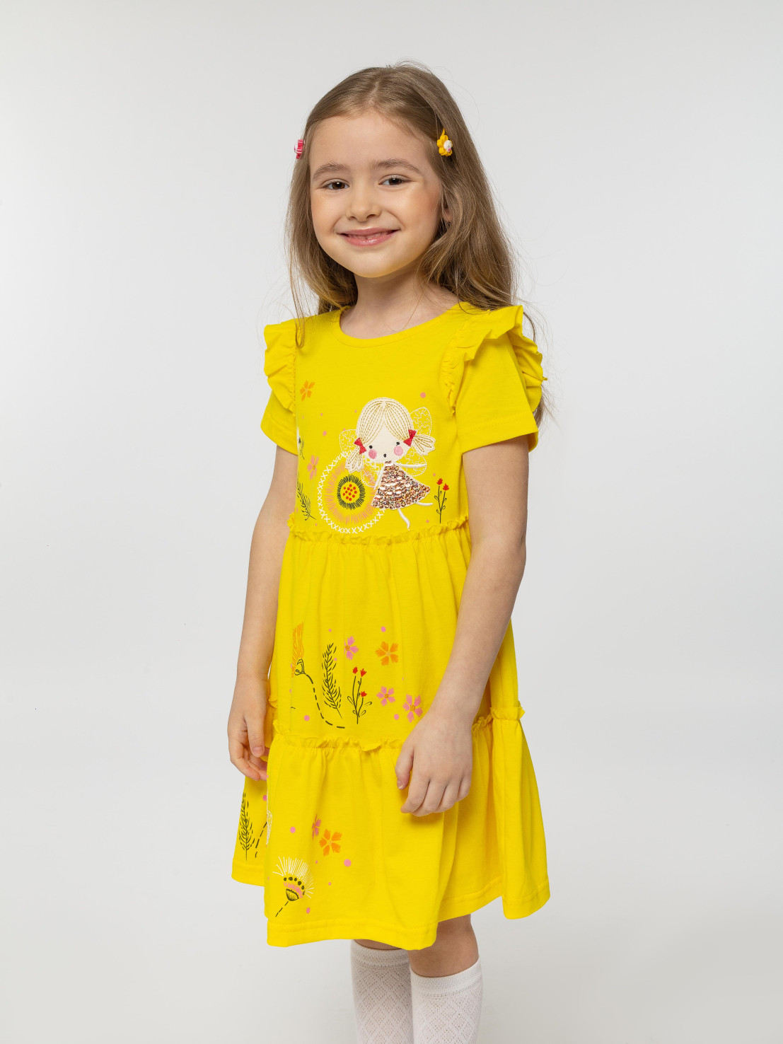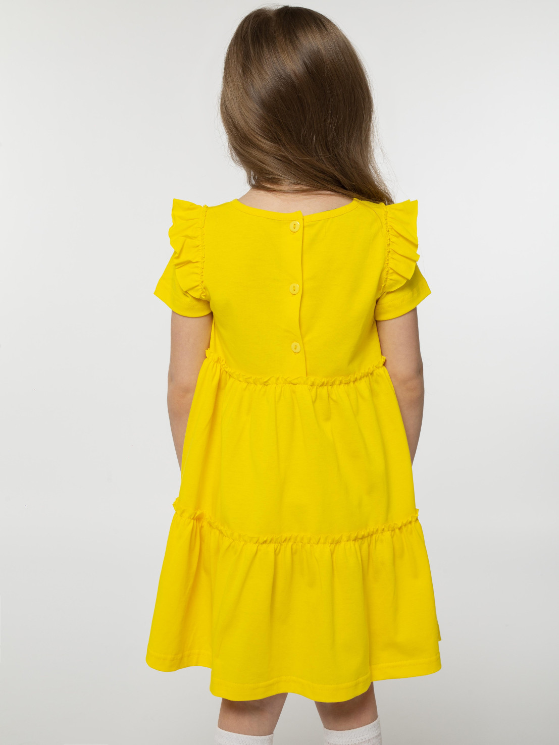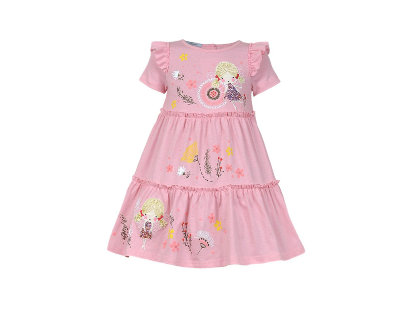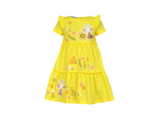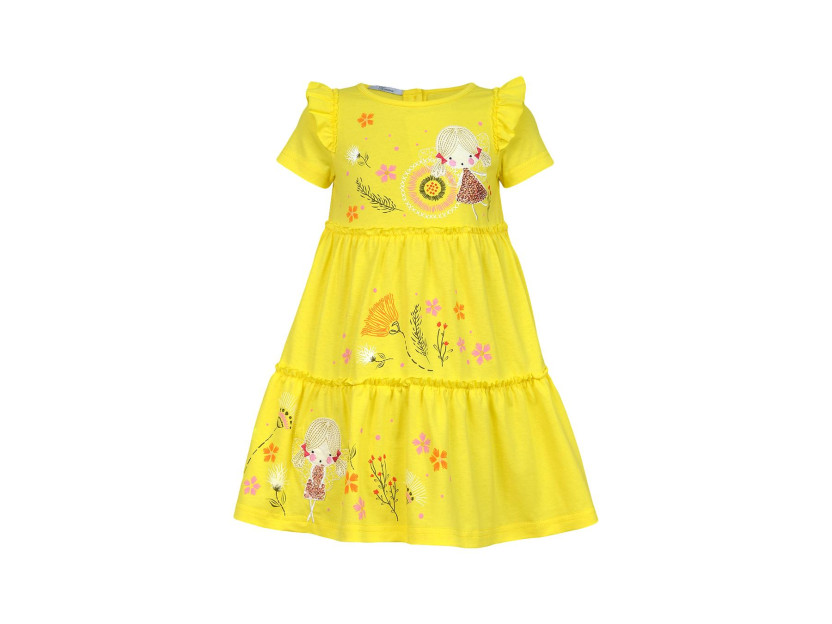 Кулирное полотно:100% х/б. Платье-силуэт трапеция,короткий втачной рукав с настрочной рюшей по пройме.Юбка переда и спинки из двух воланов,по передним воланам печать.Кокетка переда с печатью,застежка по спинке на пуговицы.Горловина окантована.Вышивка(пайетки)-на кокетке переда и нижнем волане.