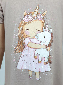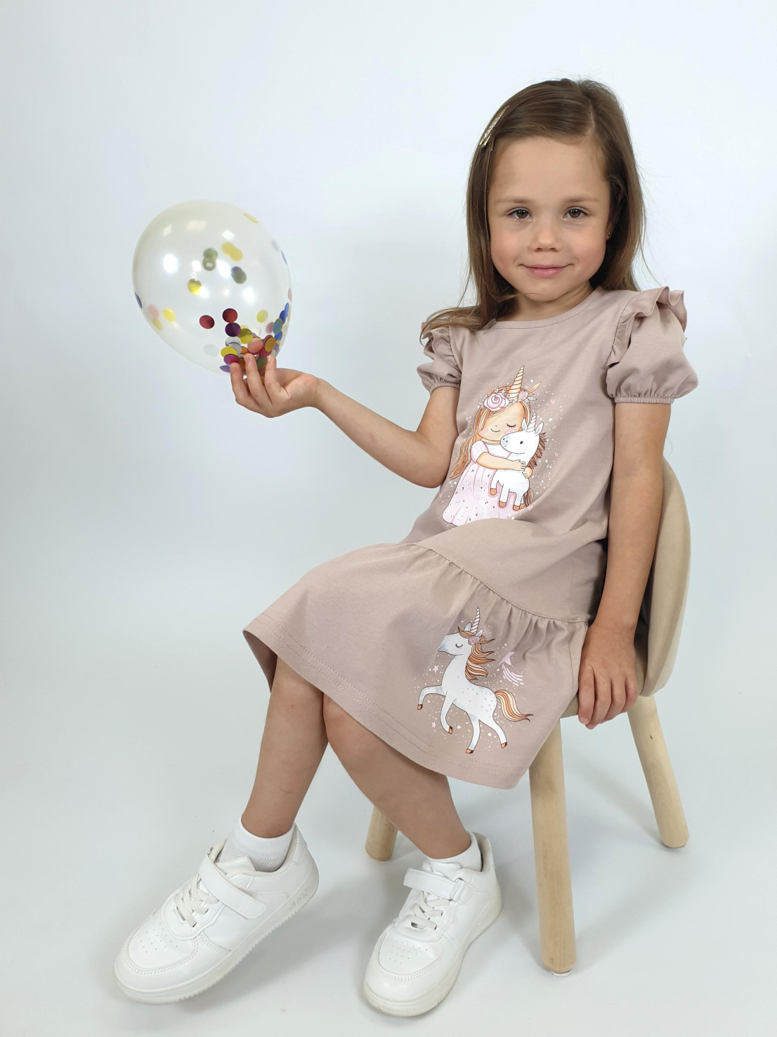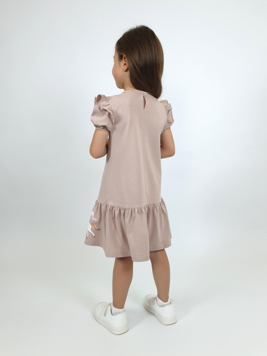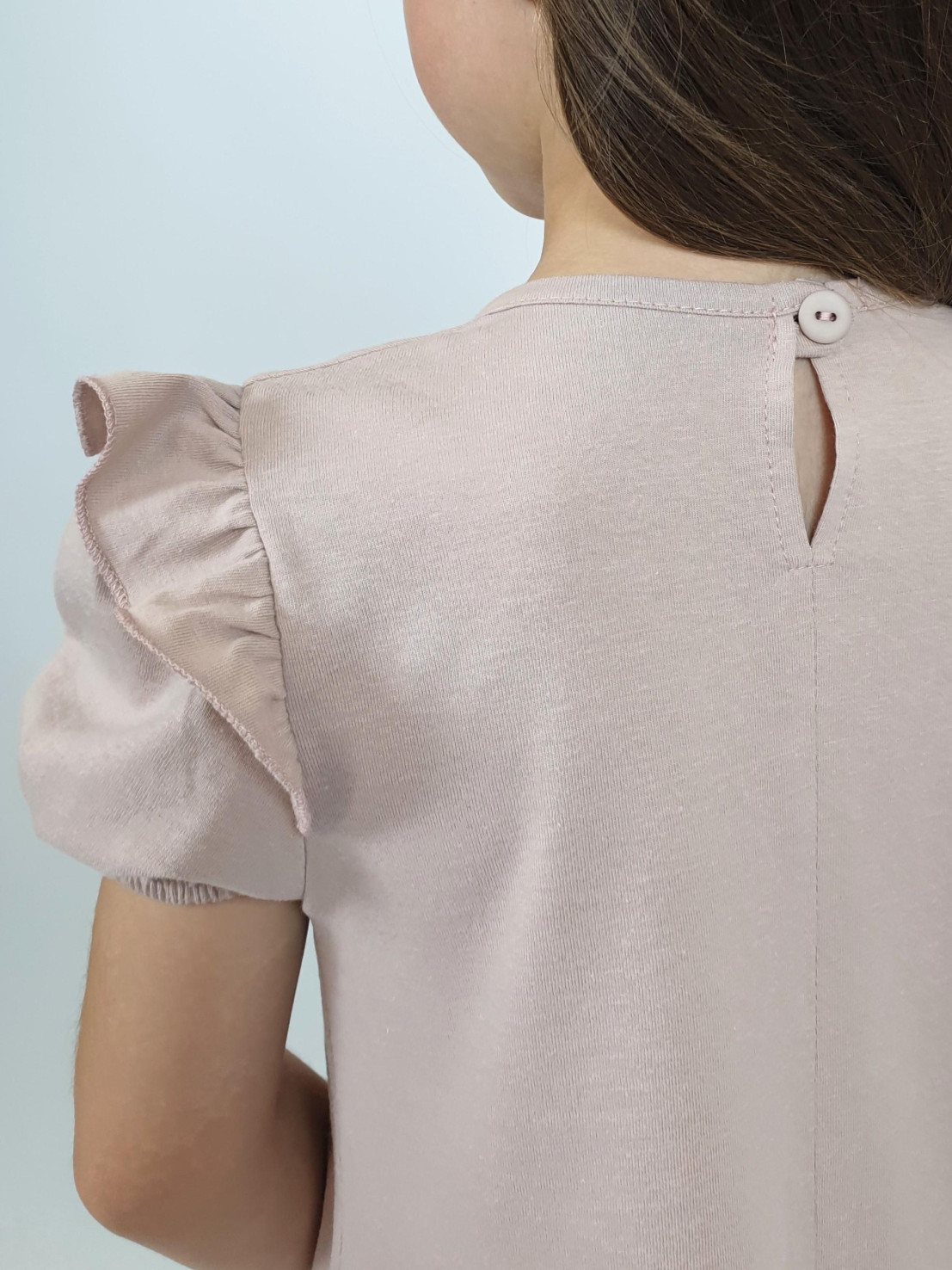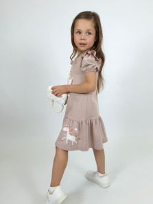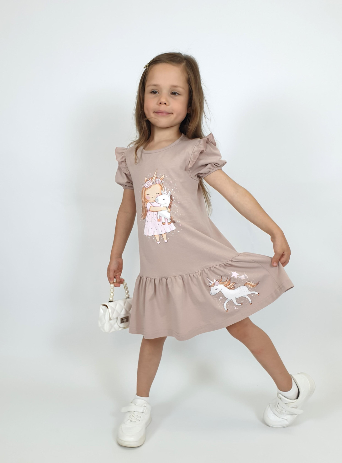 Кулирное полотно:100% х/б. Платье-силуэт трапеция,короткий рукав "фонарик"на резинке,в пройму вставлена рюша.Юбка отрезная со сборкой.Горловина окантована,застежка по спинке на пуговицу.Печать на переде.
