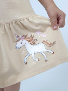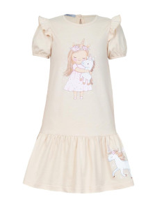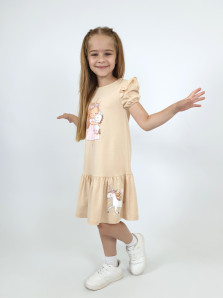 Кулирное полотно:100% х/б. Платье-силуэт трапеция,короткий рукав "фонарик"на резинке,в пройму вставлена рюша.Юбка отрезная со сборкой.Горловина окантована,застежка по спинке на пуговицу.Печать на переде.