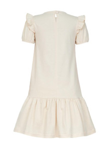 Кулирное полотно:100% х/б. Платье-силуэт трапеция,короткий рукав "фонарик"на резинке,в пройму вставлена рюша.Юбка отрезная со сборкой.Горловина окантована,застежка по спинке на пуговицу.Печать на переде.