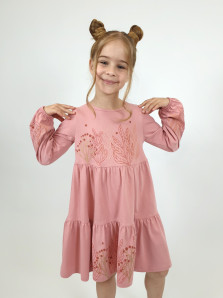 Кулирное полотно:100% х/б. Платье-силуэт трапеция,длинный втачной рукав,внизу собран на резинку.Юбка переда и спинки из двух воланов.Горловина окантована,застежка на пуговицы по спинке.Печать на переде кокетки,на нижнем волане и на рукавах.