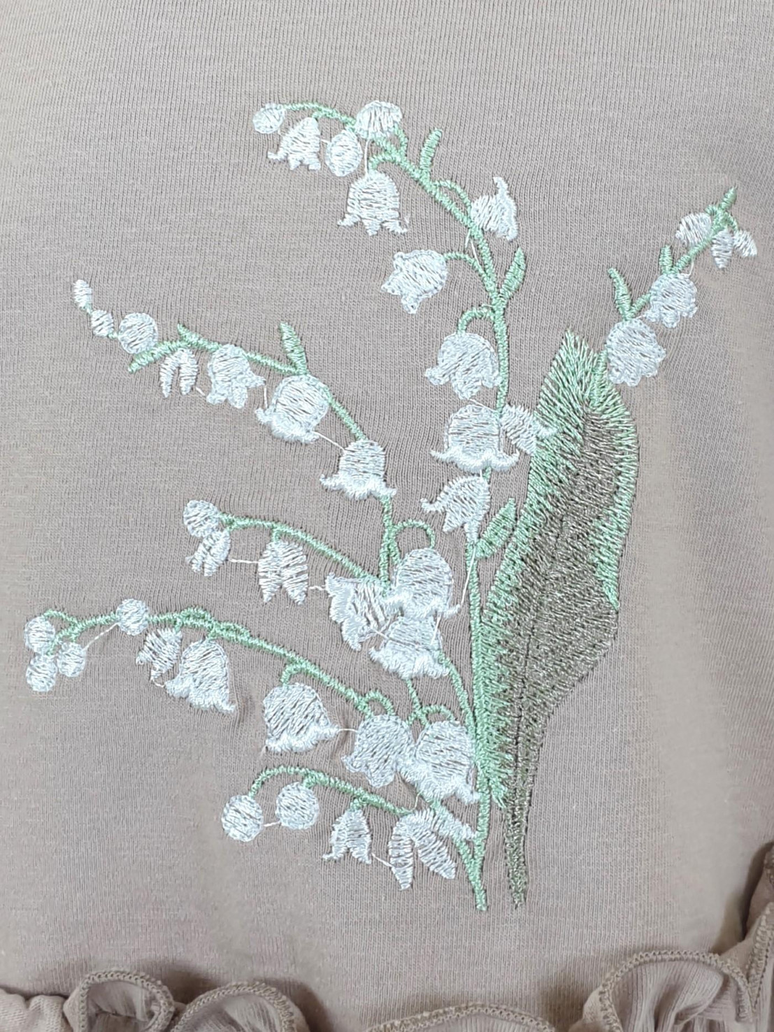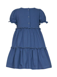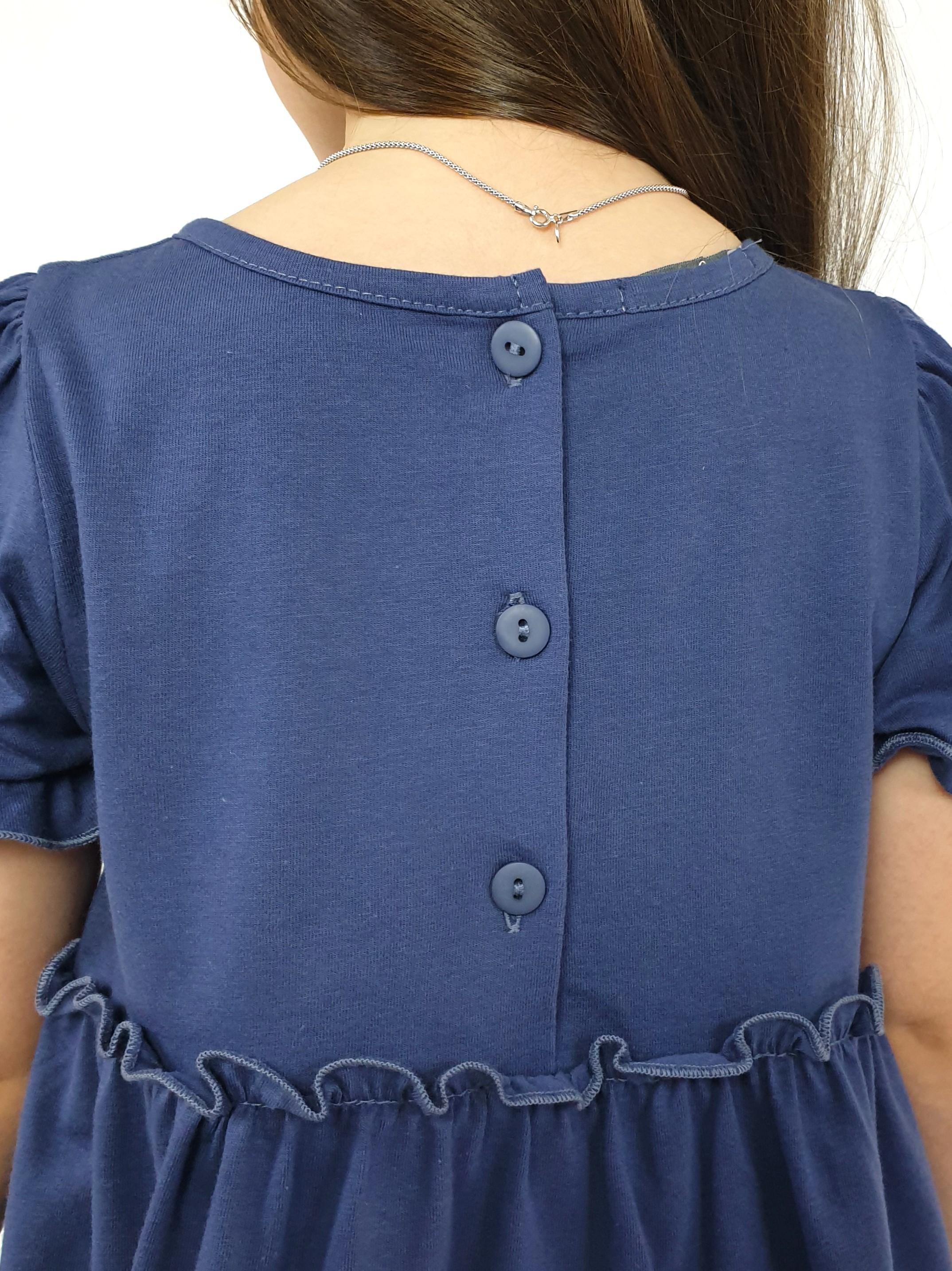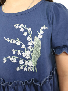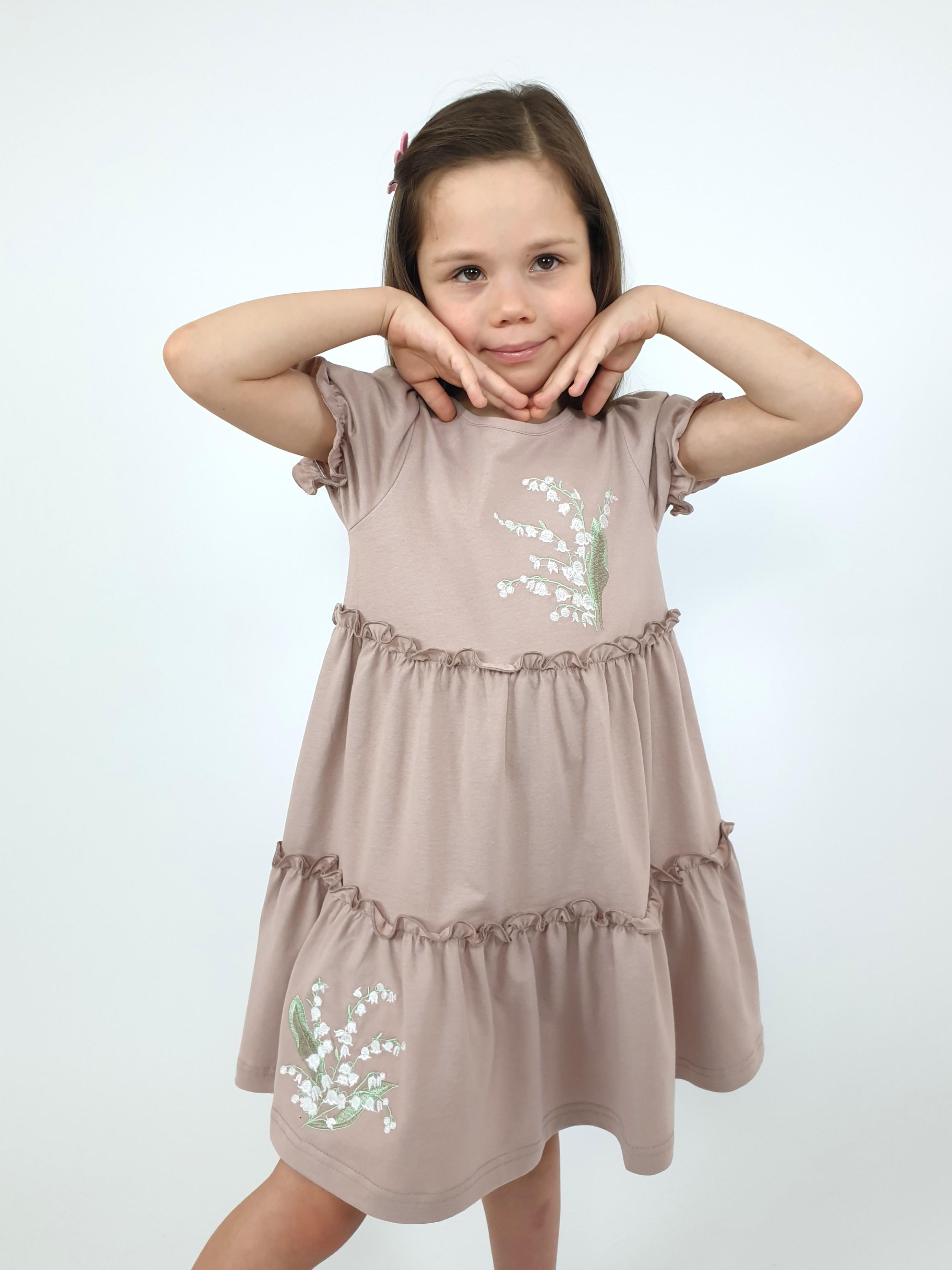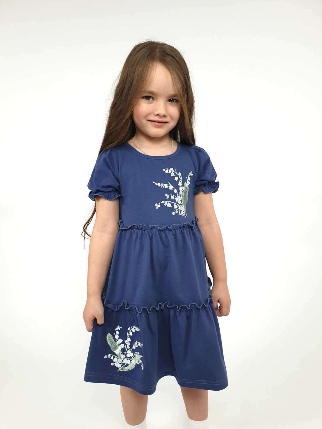 Кулирное полотно:100% х/б. Платье-силуэт трапеция,короткий рукав "фонарик".Юбка переда и спинки из двух воланов,по передднему нижнему волану вышивка.Кокетка переда с вышивкой,застежка по спинке на пуговицы.Горловина окантована.