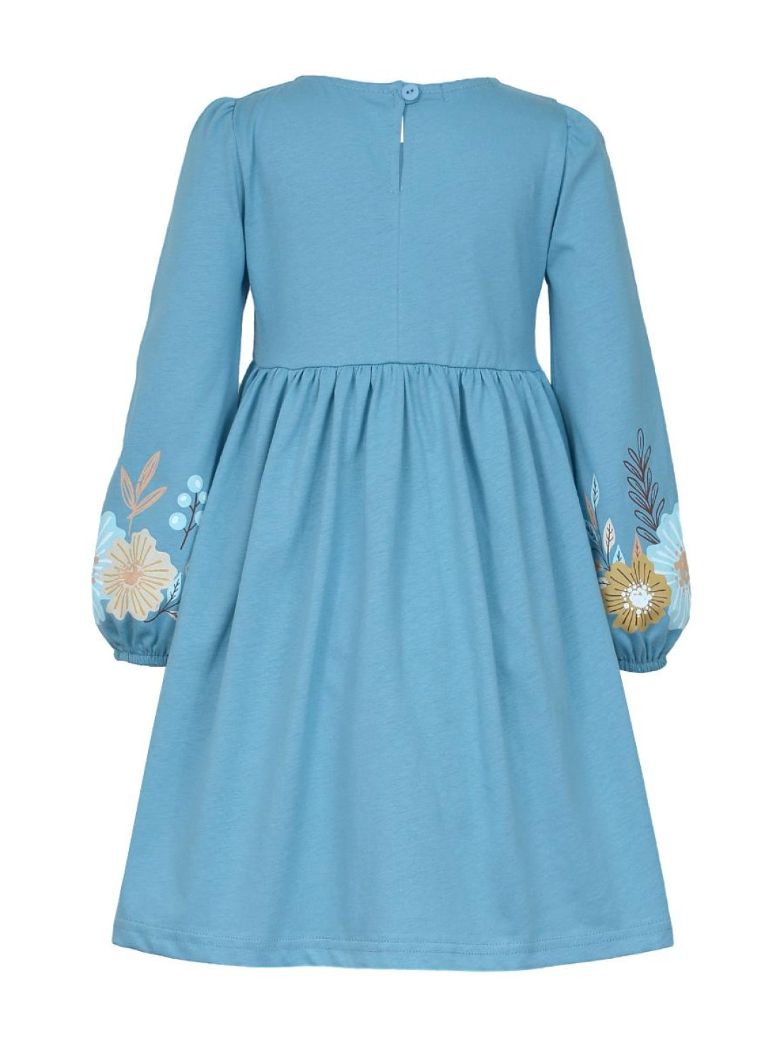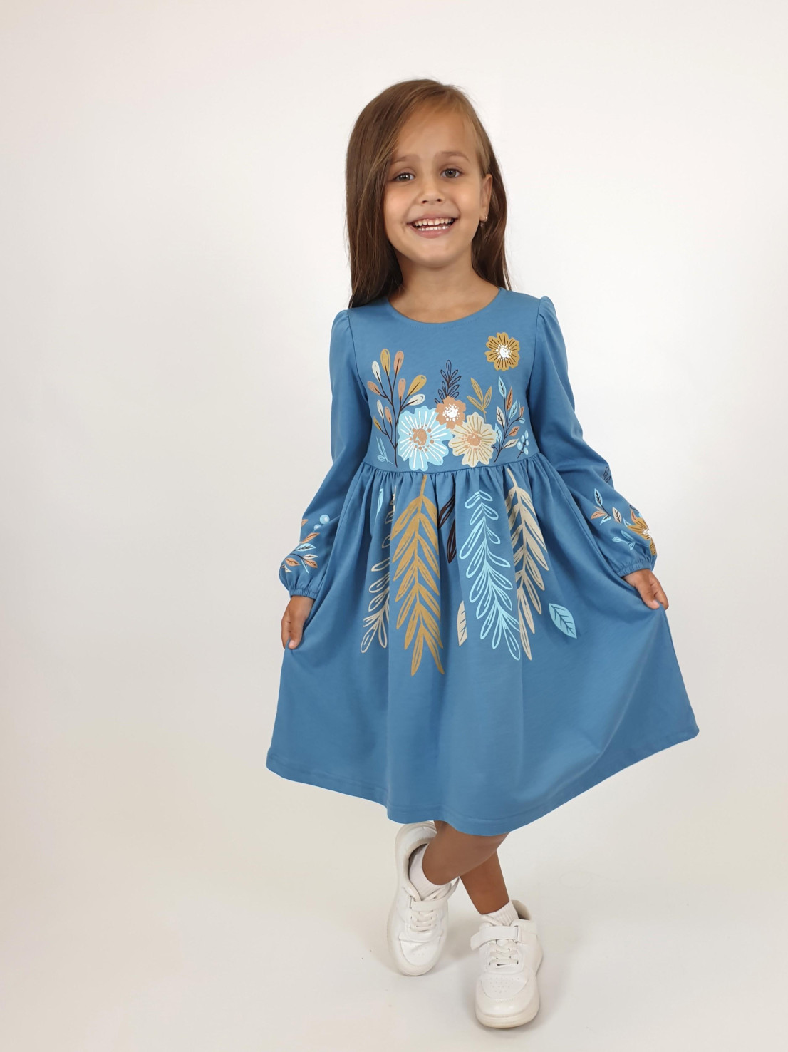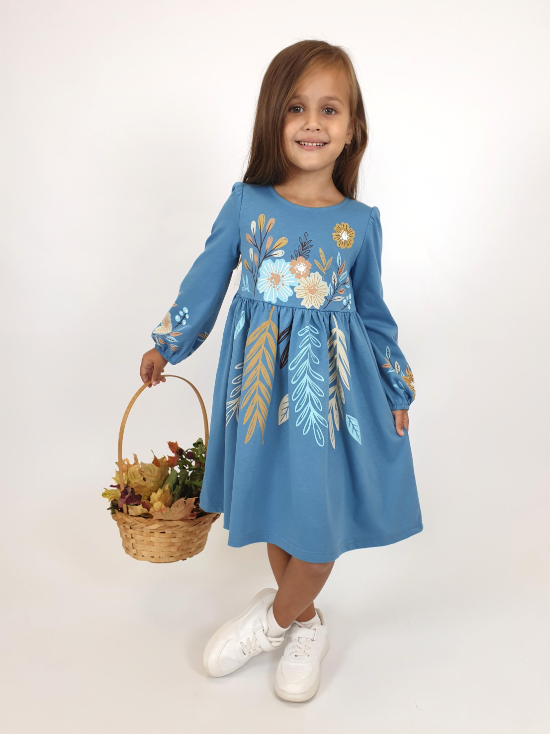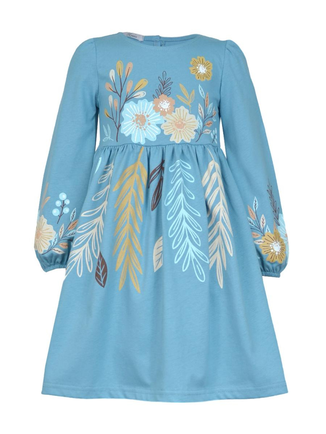 Кулирное полотно:100% х/б. Платье-приталенный силуэт.Длинный рукав-сборка по окату,внизу на резинке.Горловина окантована и подшита,по спинке разрез-застежка на пуговицу.Печать на полочке,юбке переда,рукавах.Отрезная юбка со сборкой.
