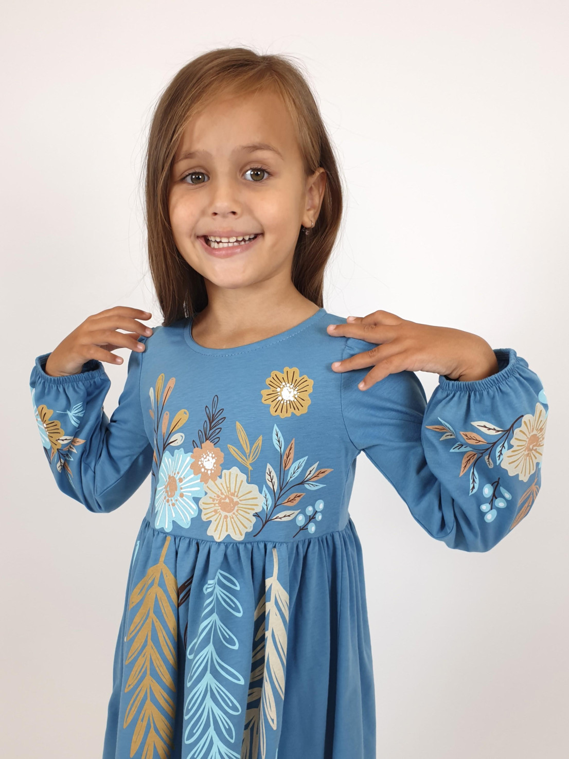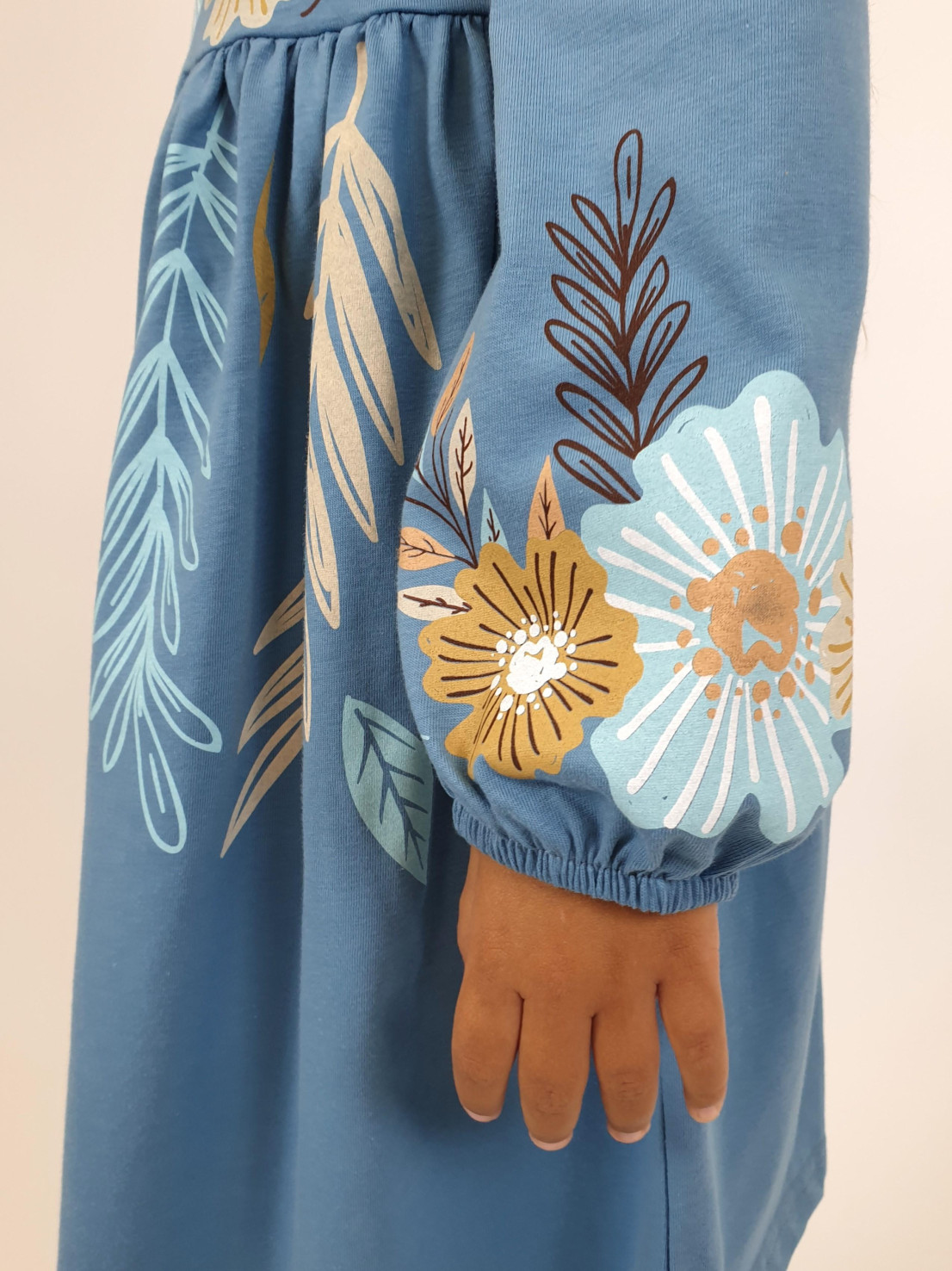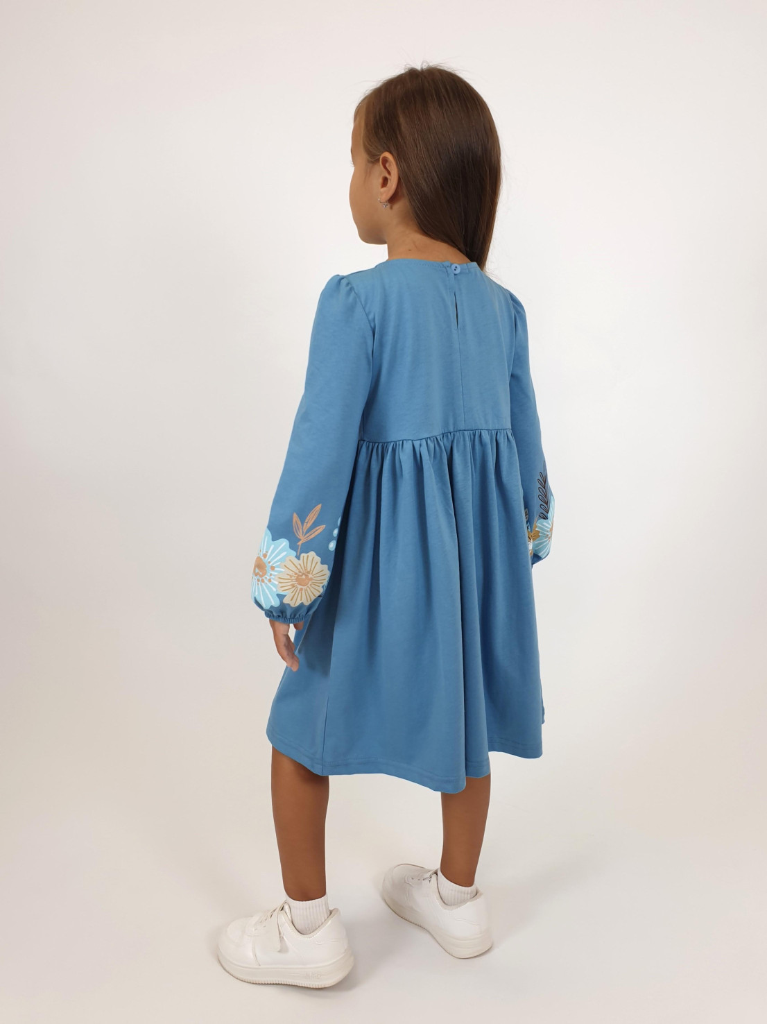 Кулирное полотно:100% х/б. Платье-приталенный силуэт.Длинный рукав-сборка по окату,внизу на резинке.Горловина окантована и подшита,по спинке разрез-застежка на пуговицу.Печать на полочке,юбке переда,рукавах.Отрезная юбка со сборкой.