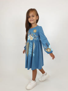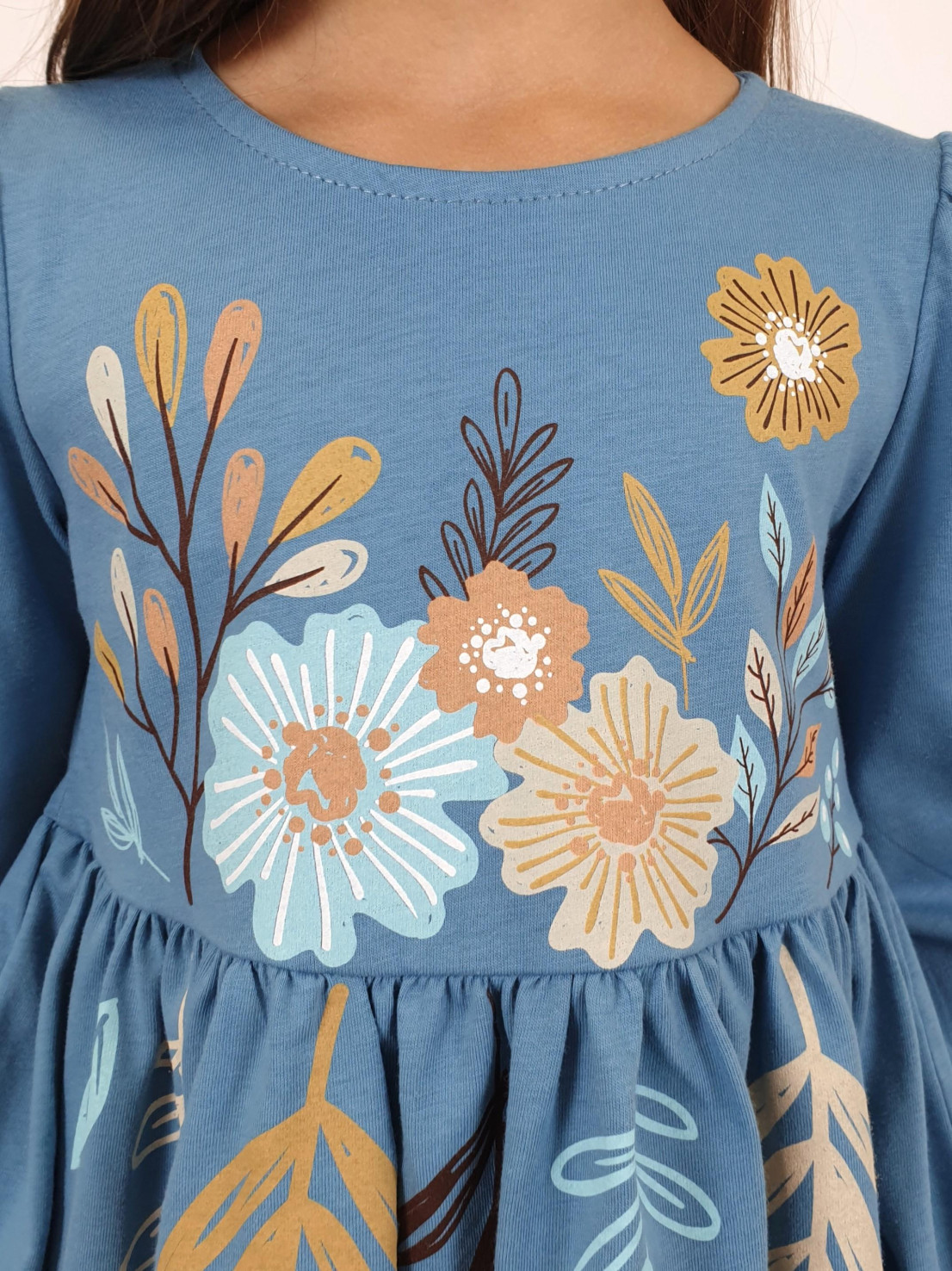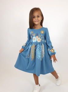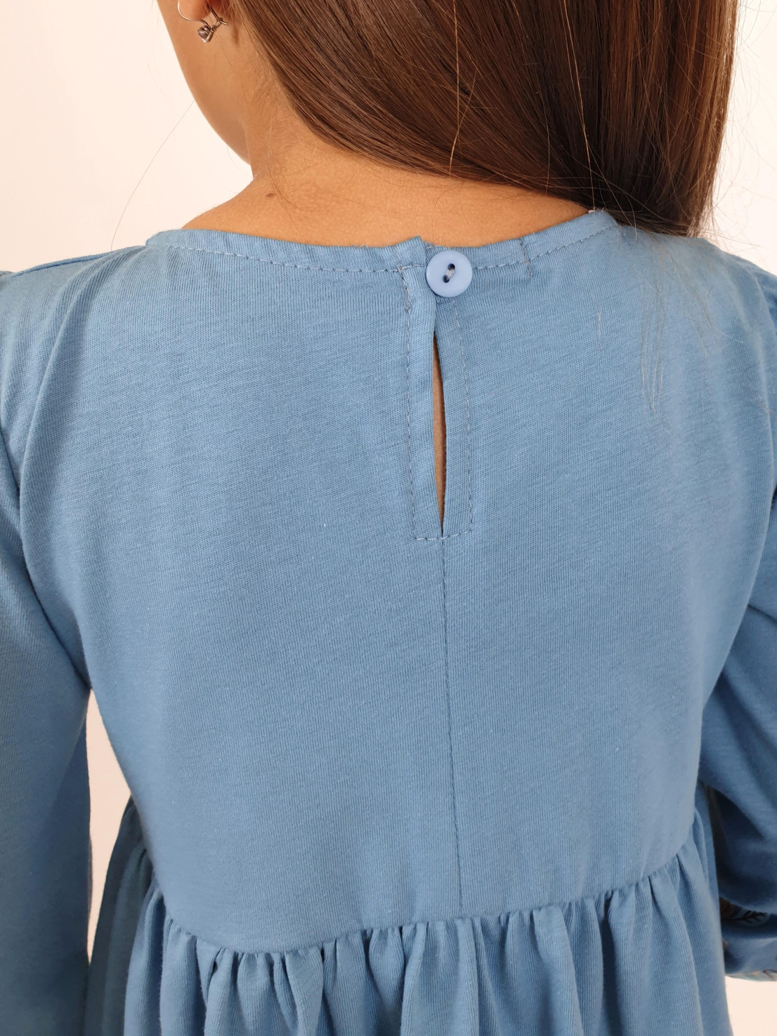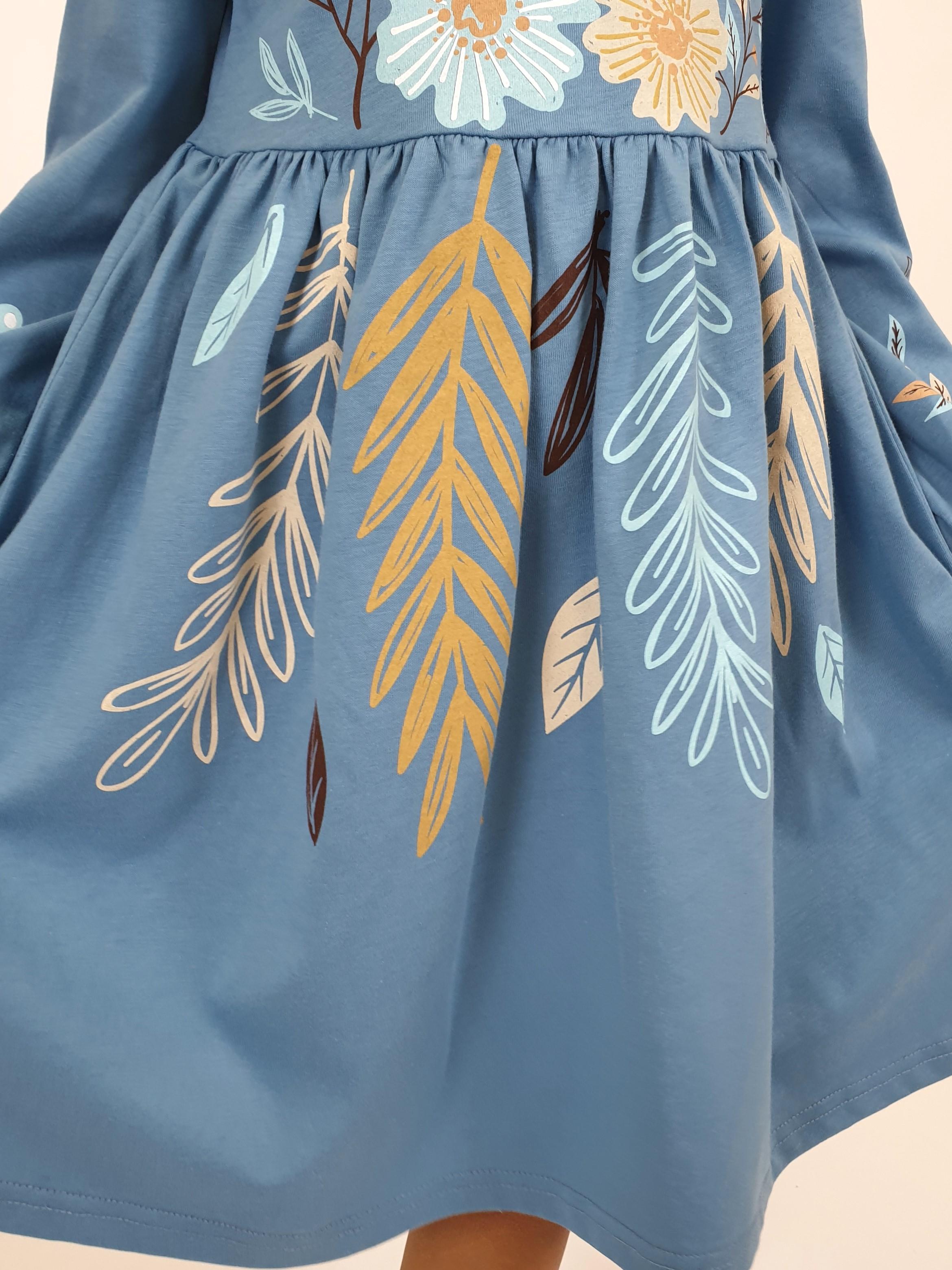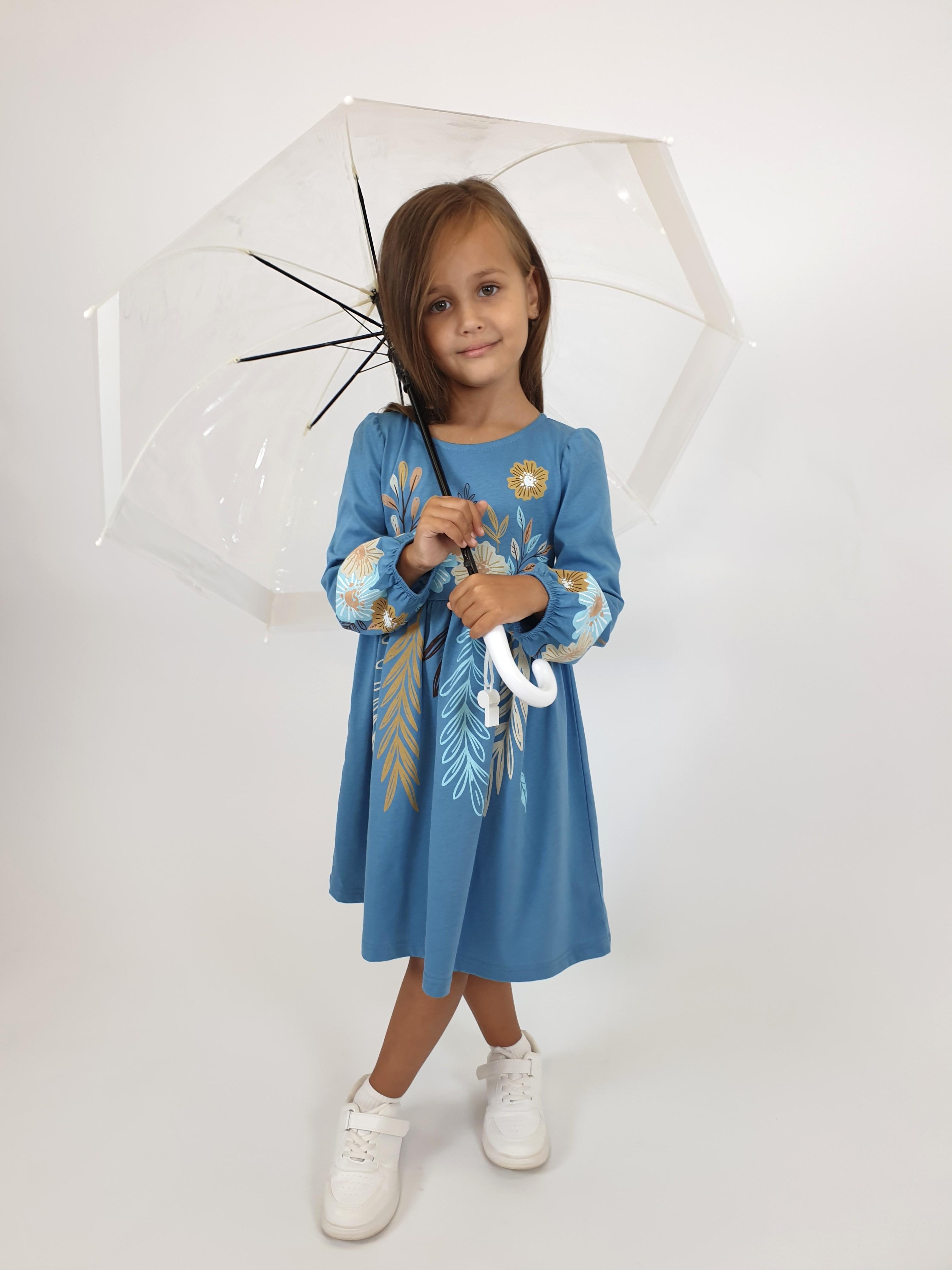Кулирное полотно:100% х/б. Платье-приталенный силуэт.Длинный рукав-сборка по окату,внизу на резинке.Горловина окантована и подшита,по спинке разрез-застежка на пуговицу.Печать на полочке,юбке переда,рукавах.Отрезная юбка со сборкой.