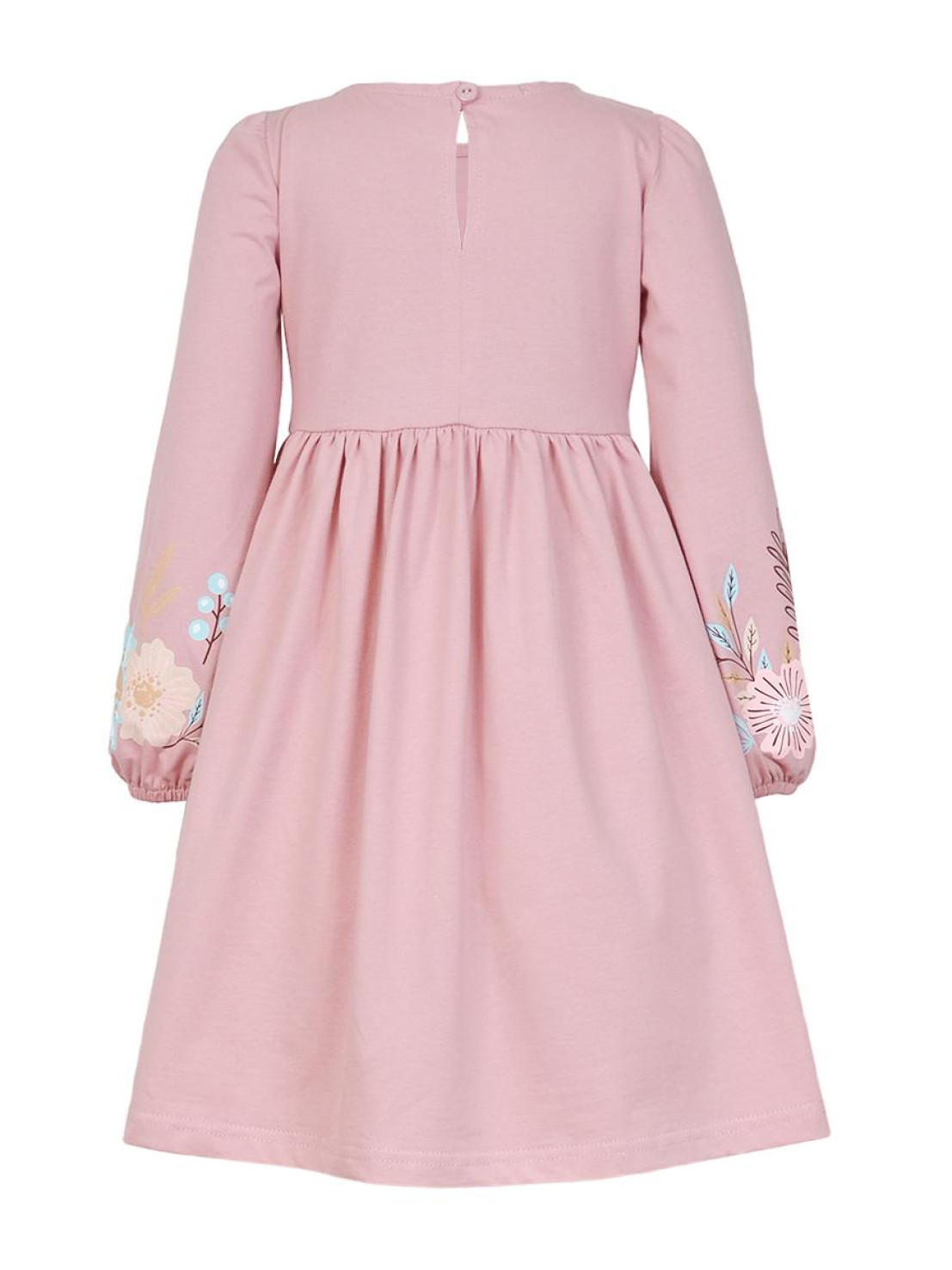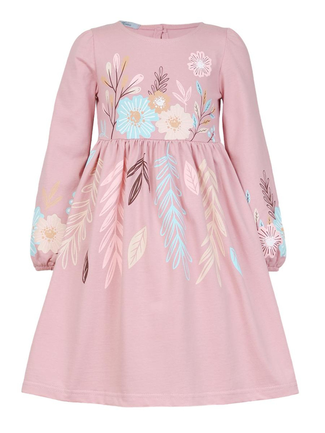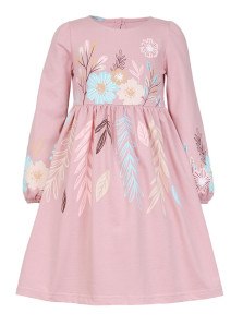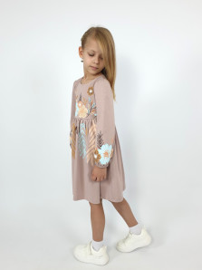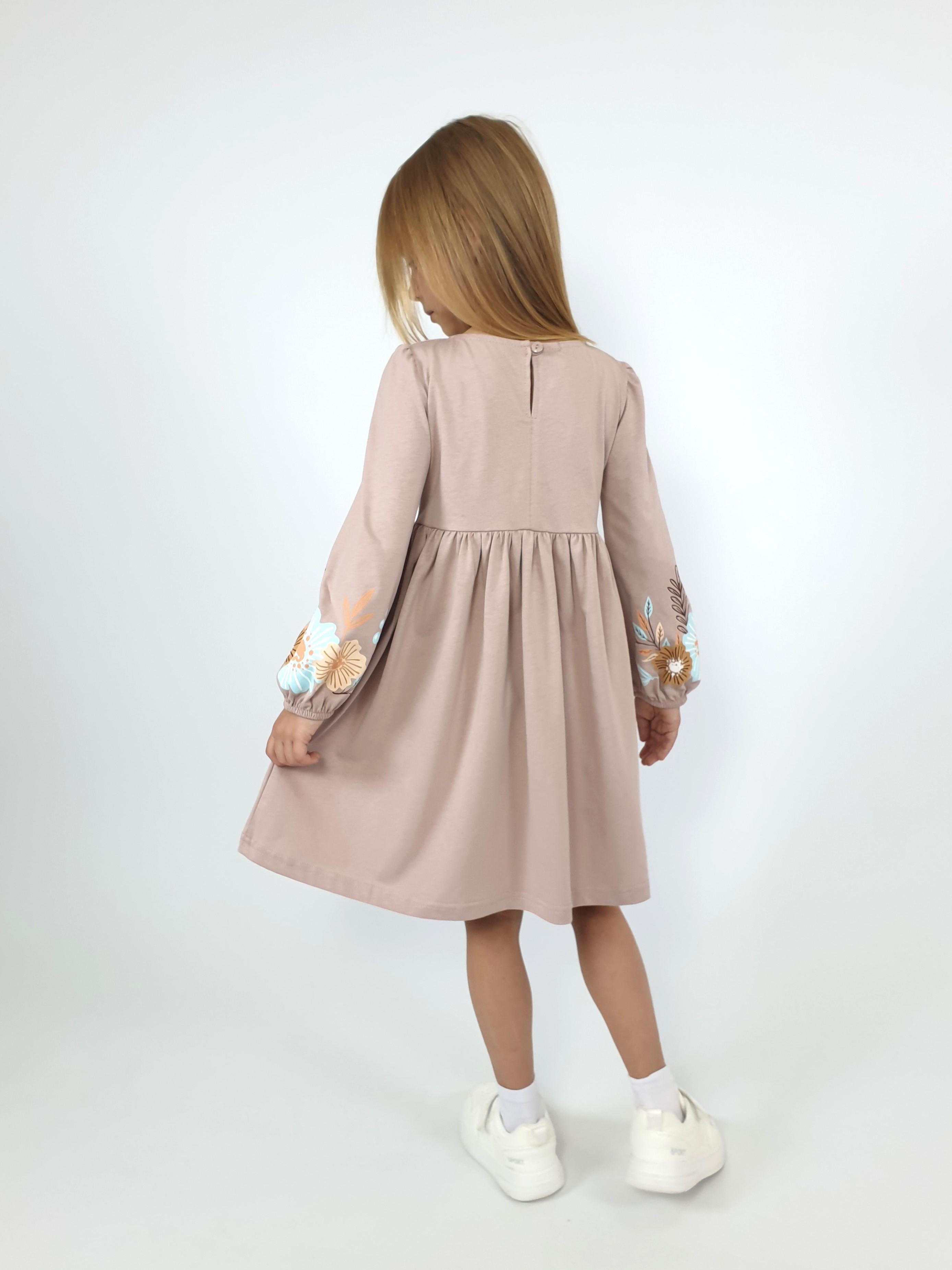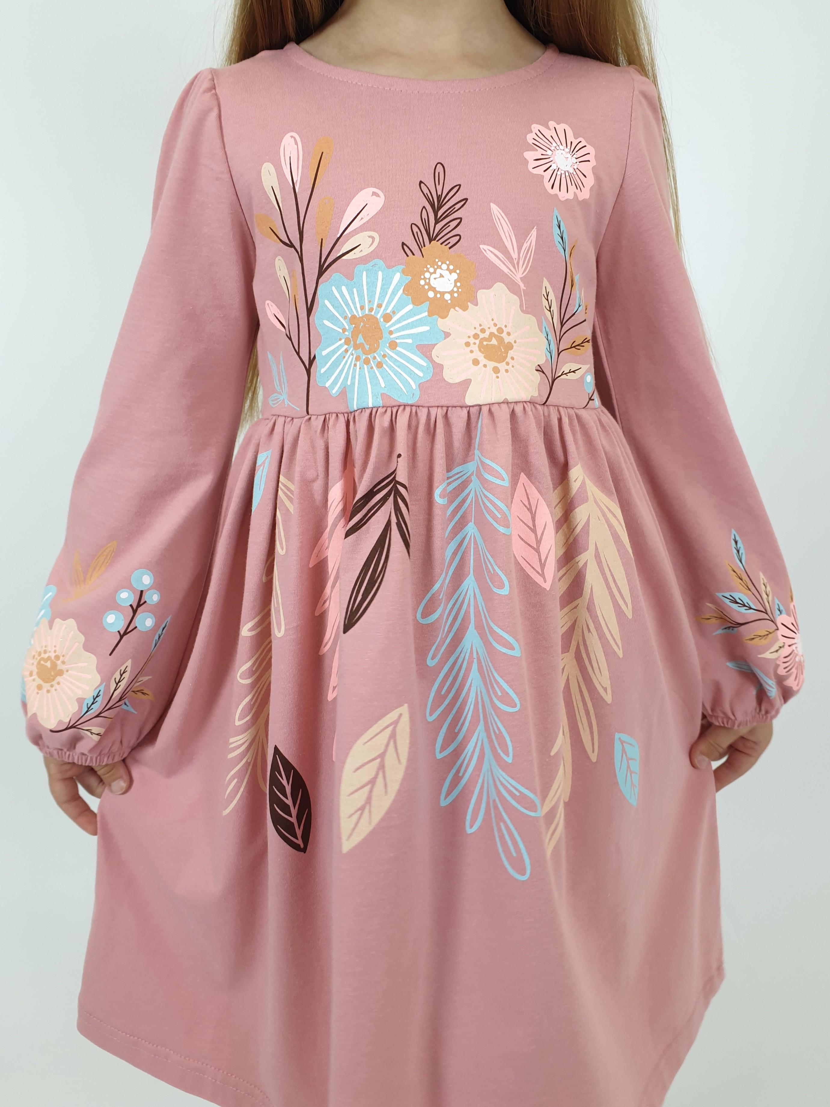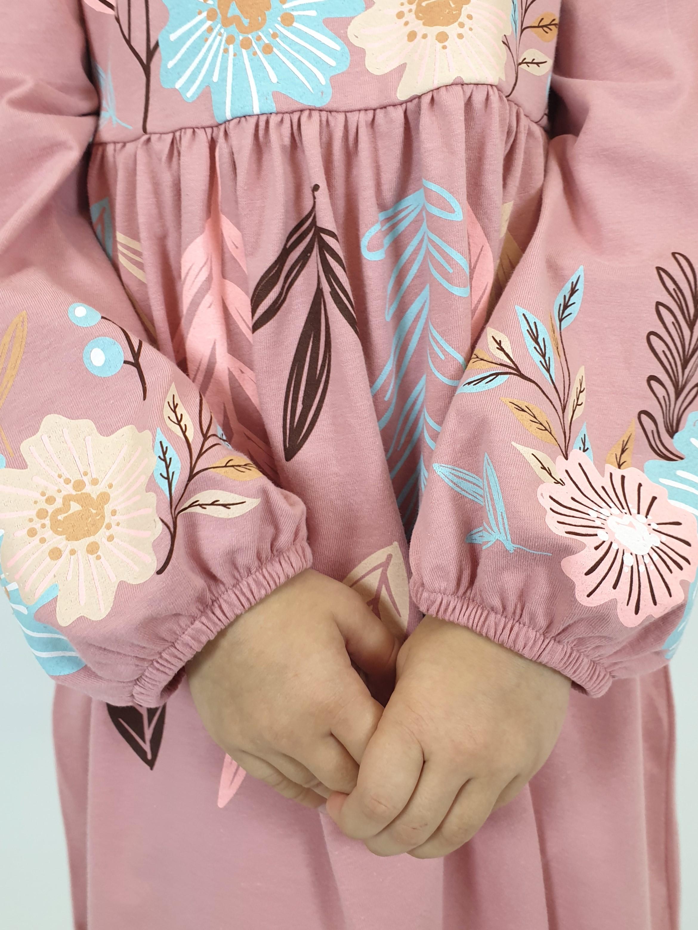 Кулирное полотно:100% х/б. Платье-приталенный силуэт.Длинный рукав-сборка по окату,внизу на резинке.Горловина окантована и подшита,по спинке разрез-застежка на пуговицу.Печать на полочке,юбке переда,рукавах.Отрезная юбка со сборкой.