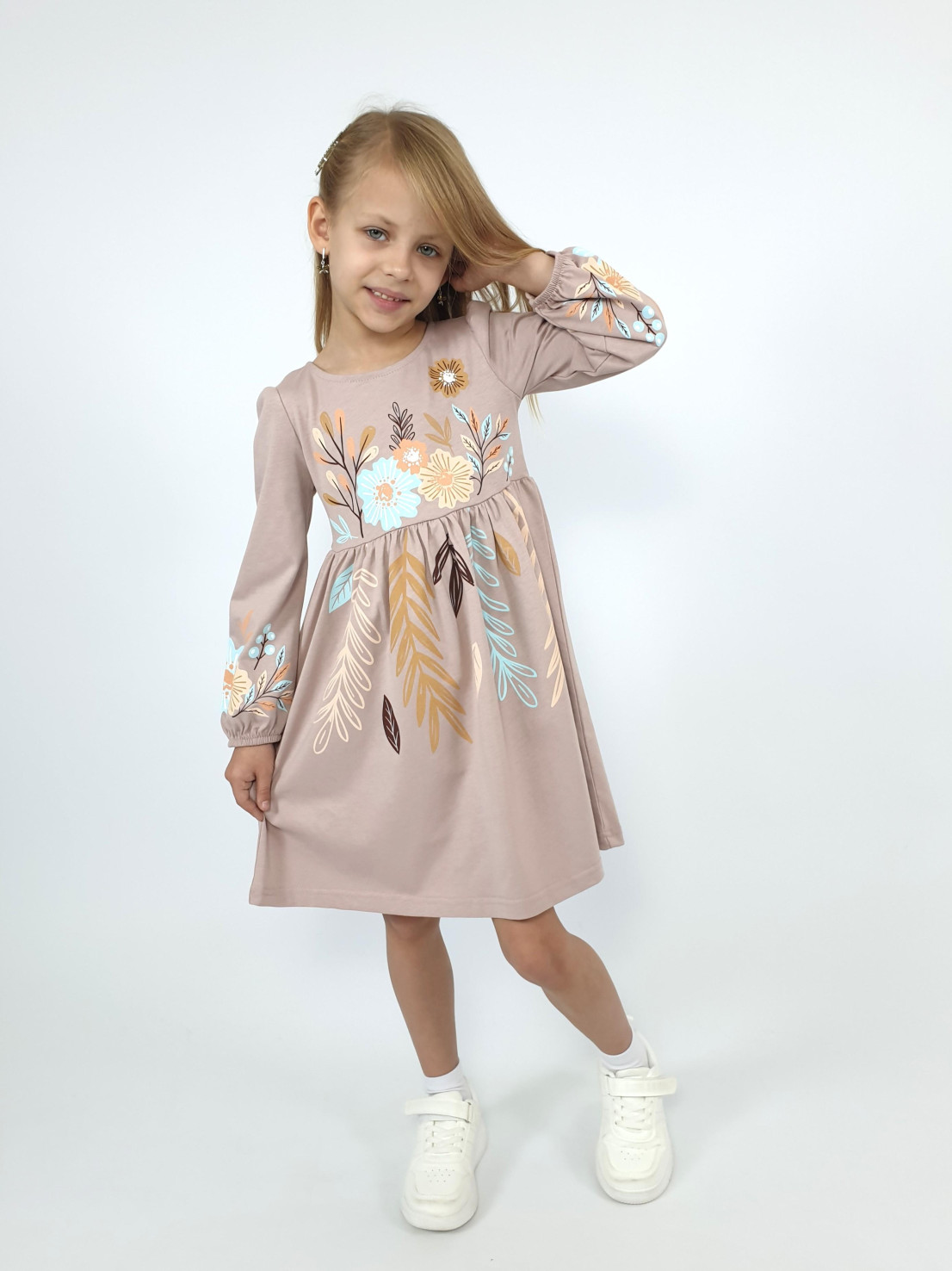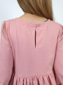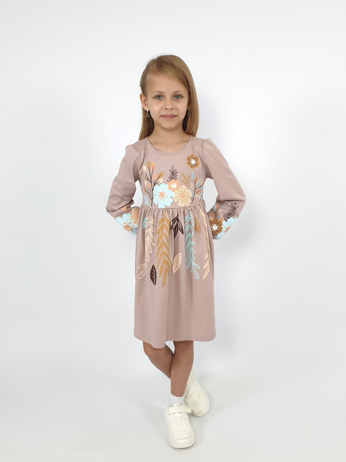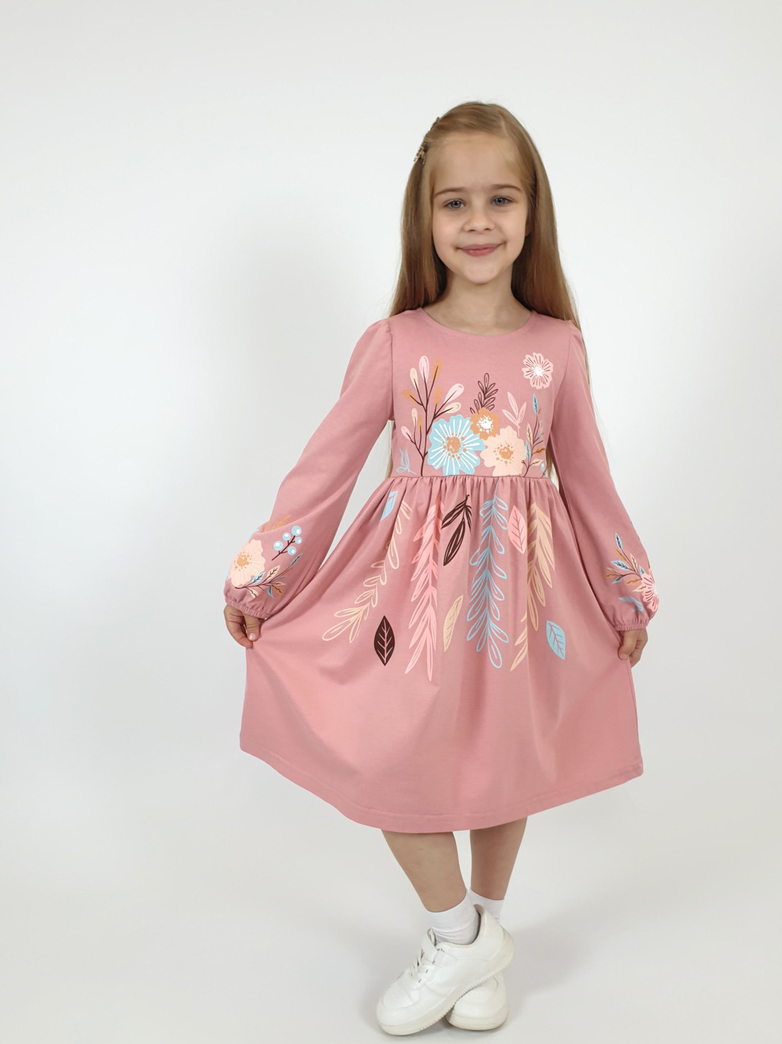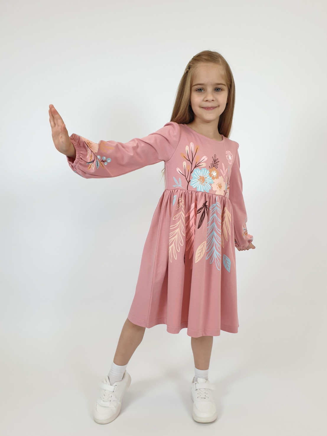 Кулирное полотно:100% х/б. Платье-приталенный силуэт.Длинный рукав-сборка по окату,внизу на резинке.Горловина окантована и подшита,по спинке разрез-застежка на пуговицу.Печать на полочке,юбке переда,рукавах.Отрезная юбка со сборкой.