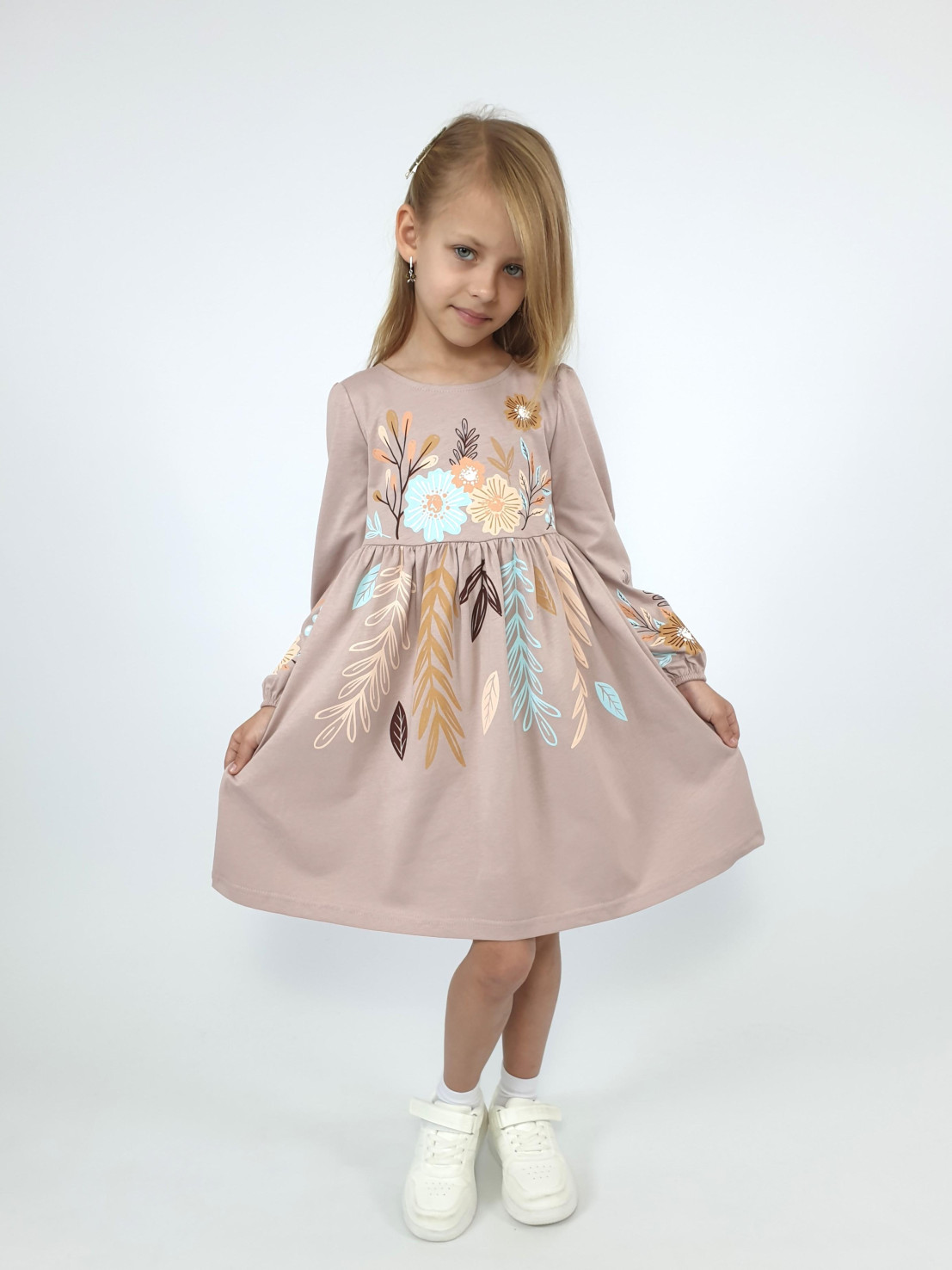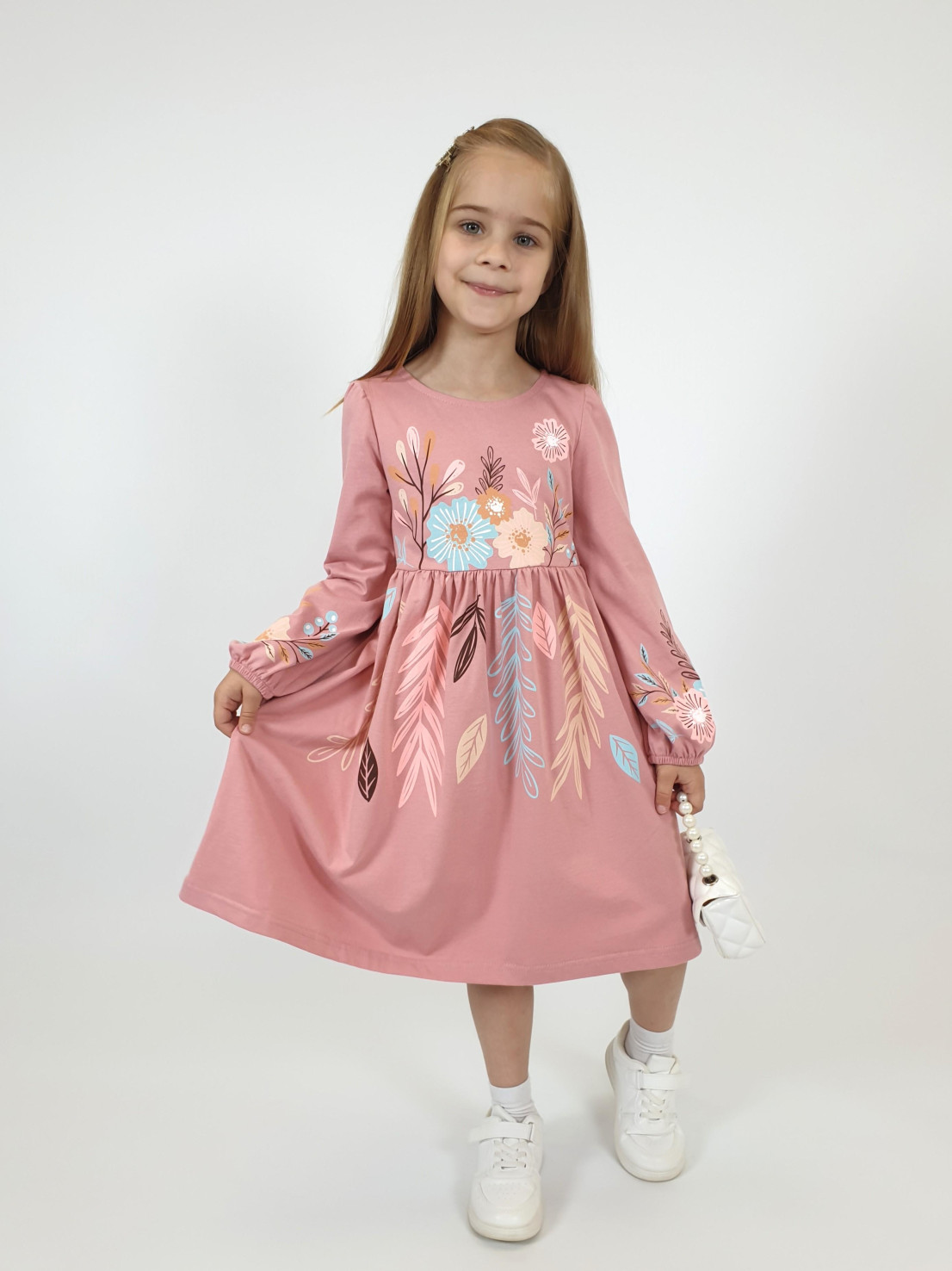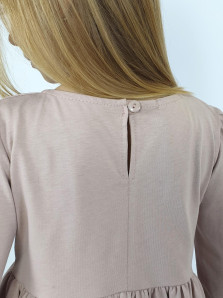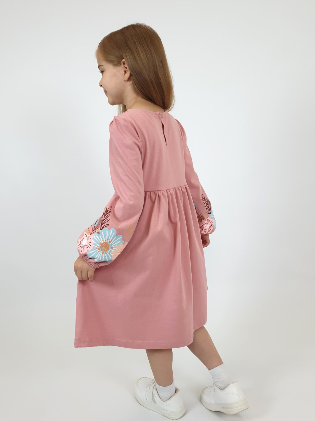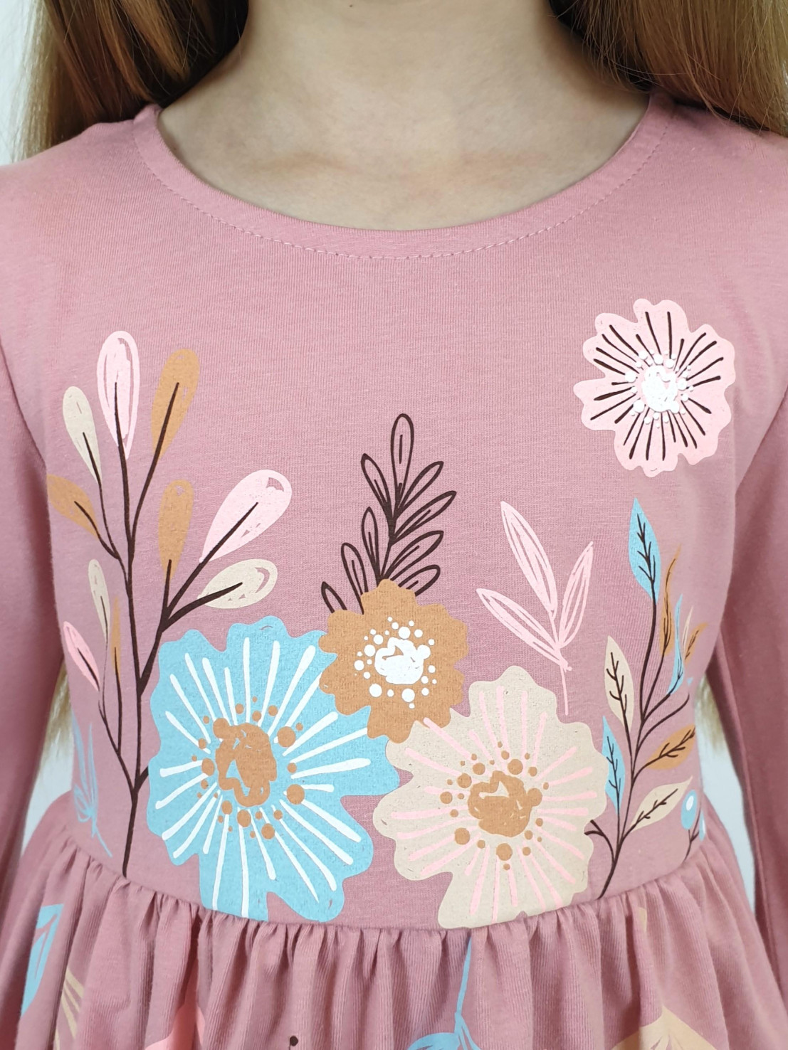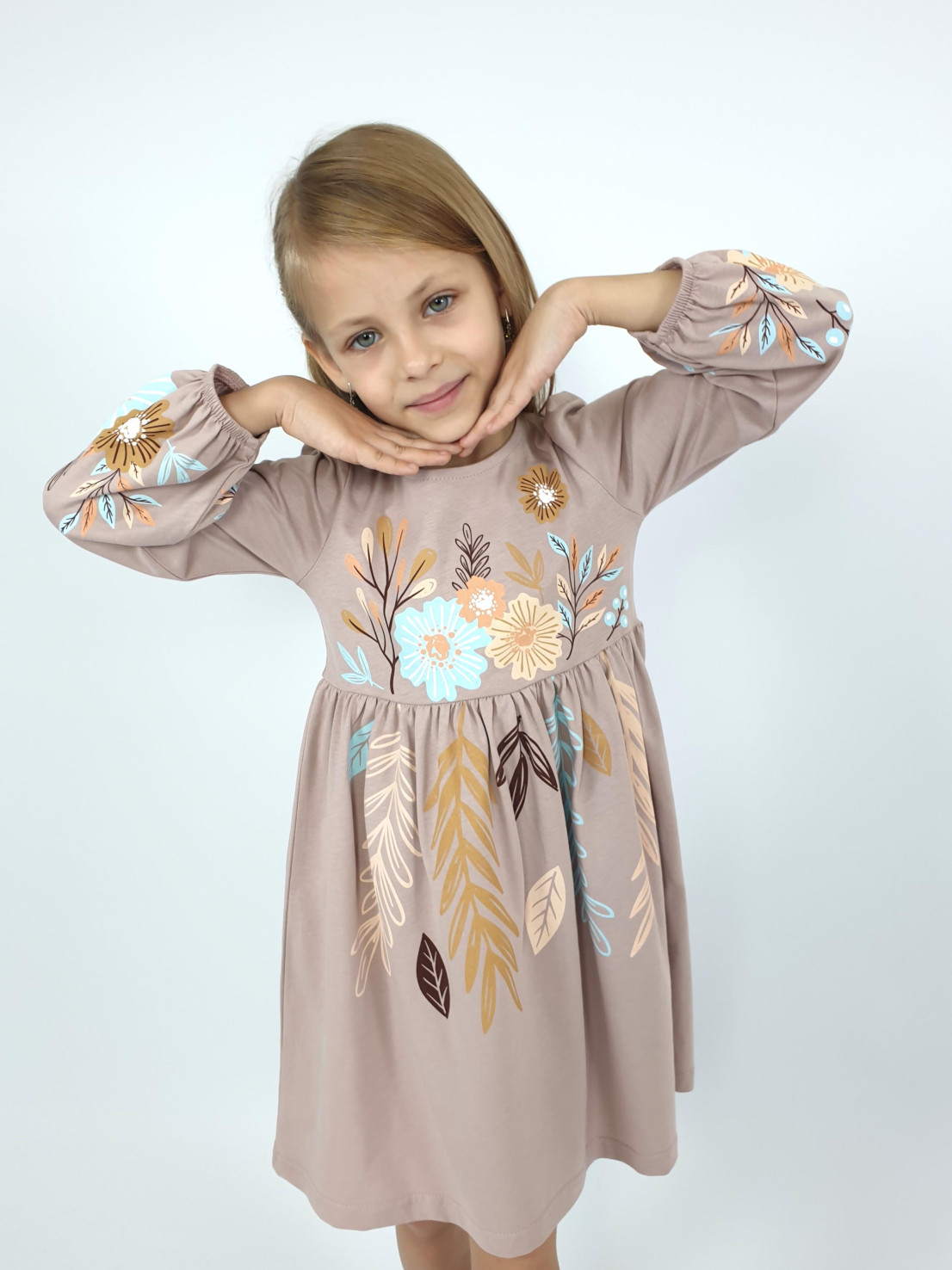 Кулирное полотно:100% х/б. Платье-приталенный силуэт.Длинный рукав-сборка по окату,внизу на резинке.Горловина окантована и подшита,по спинке разрез-застежка на пуговицу.Печать на полочке,юбке переда,рукавах.Отрезная юбка со сборкой.
