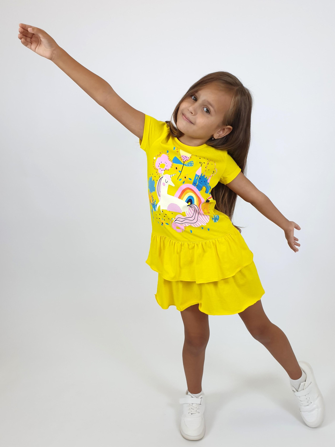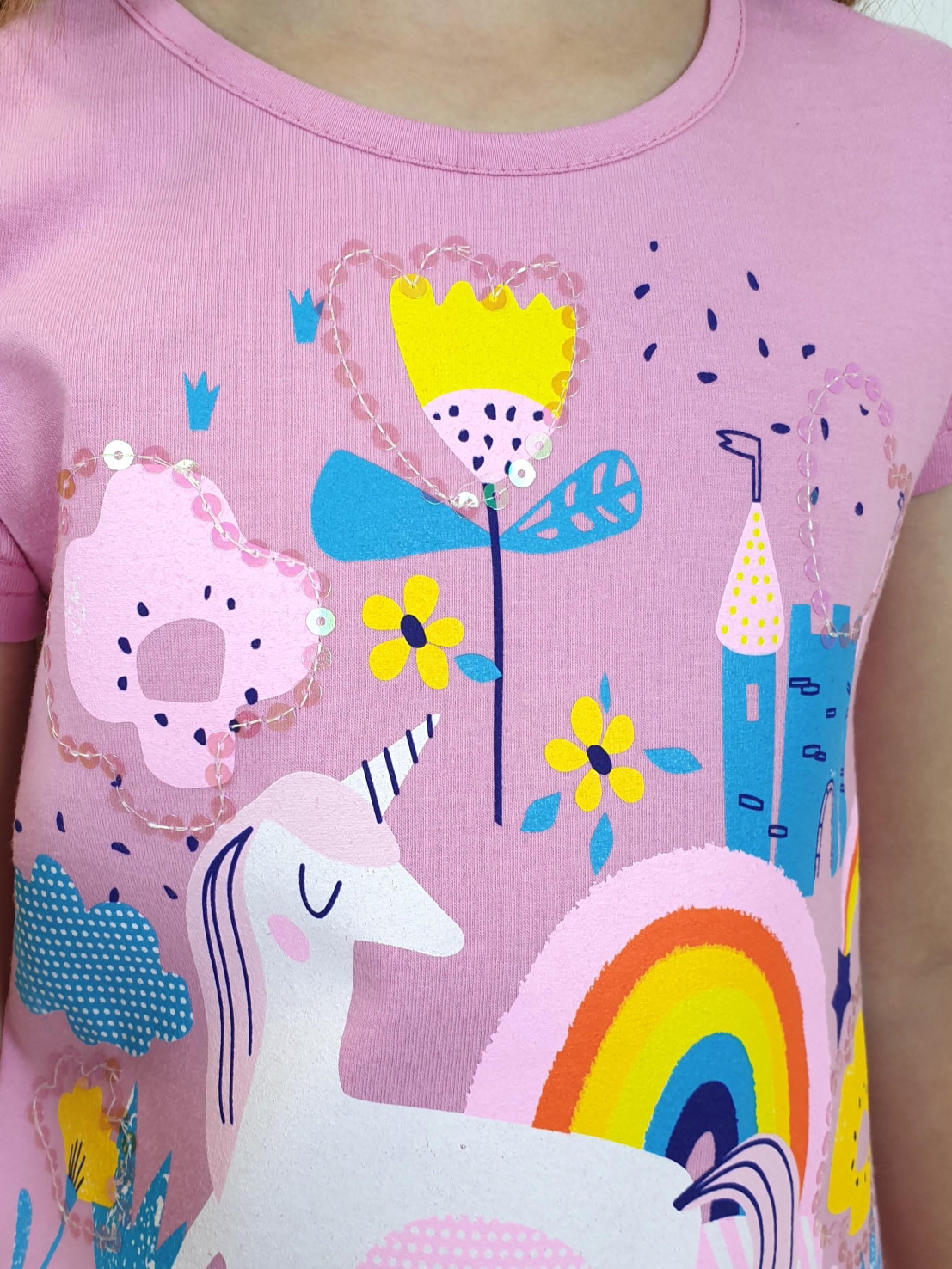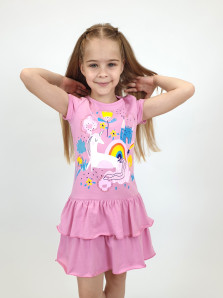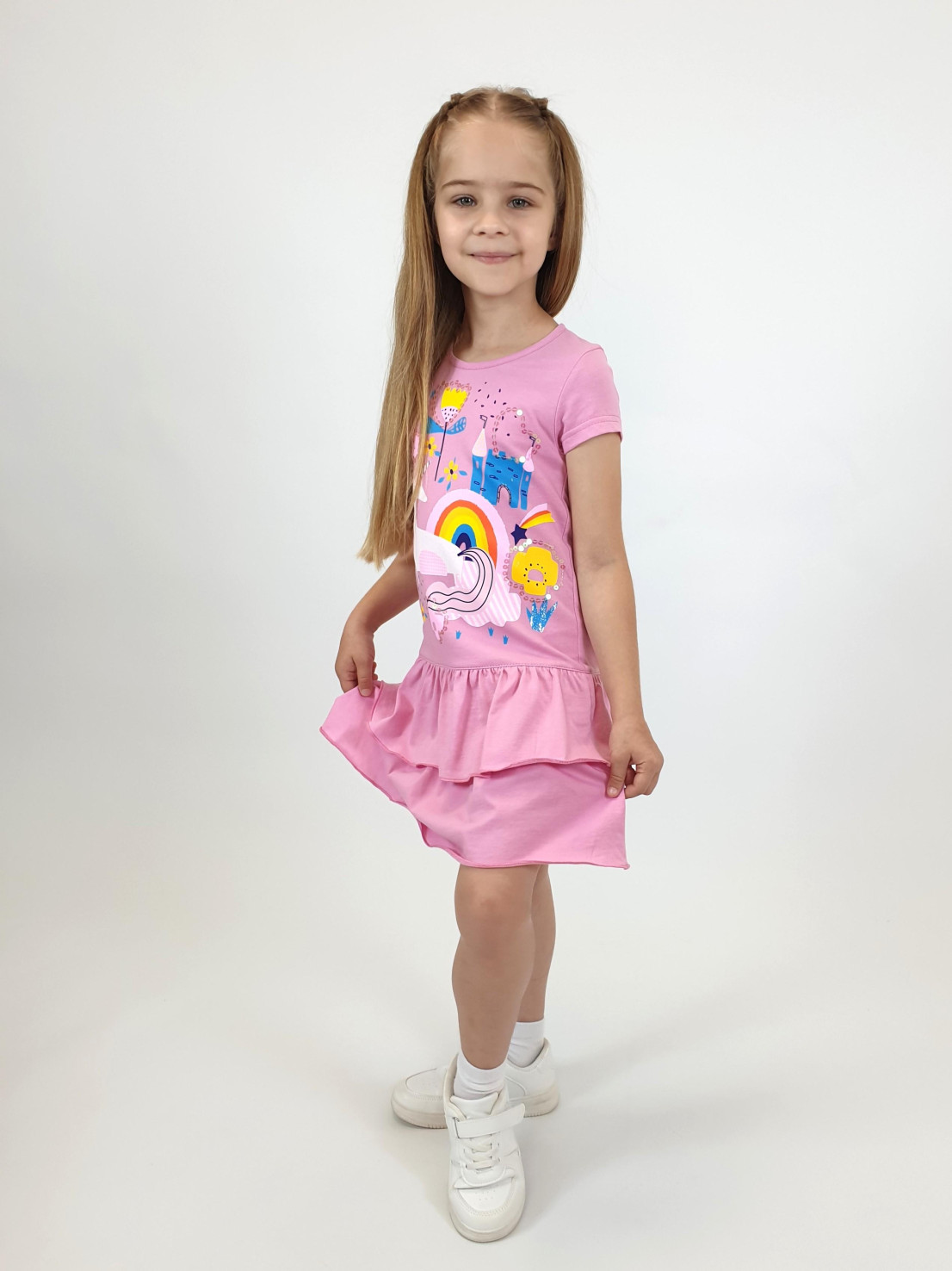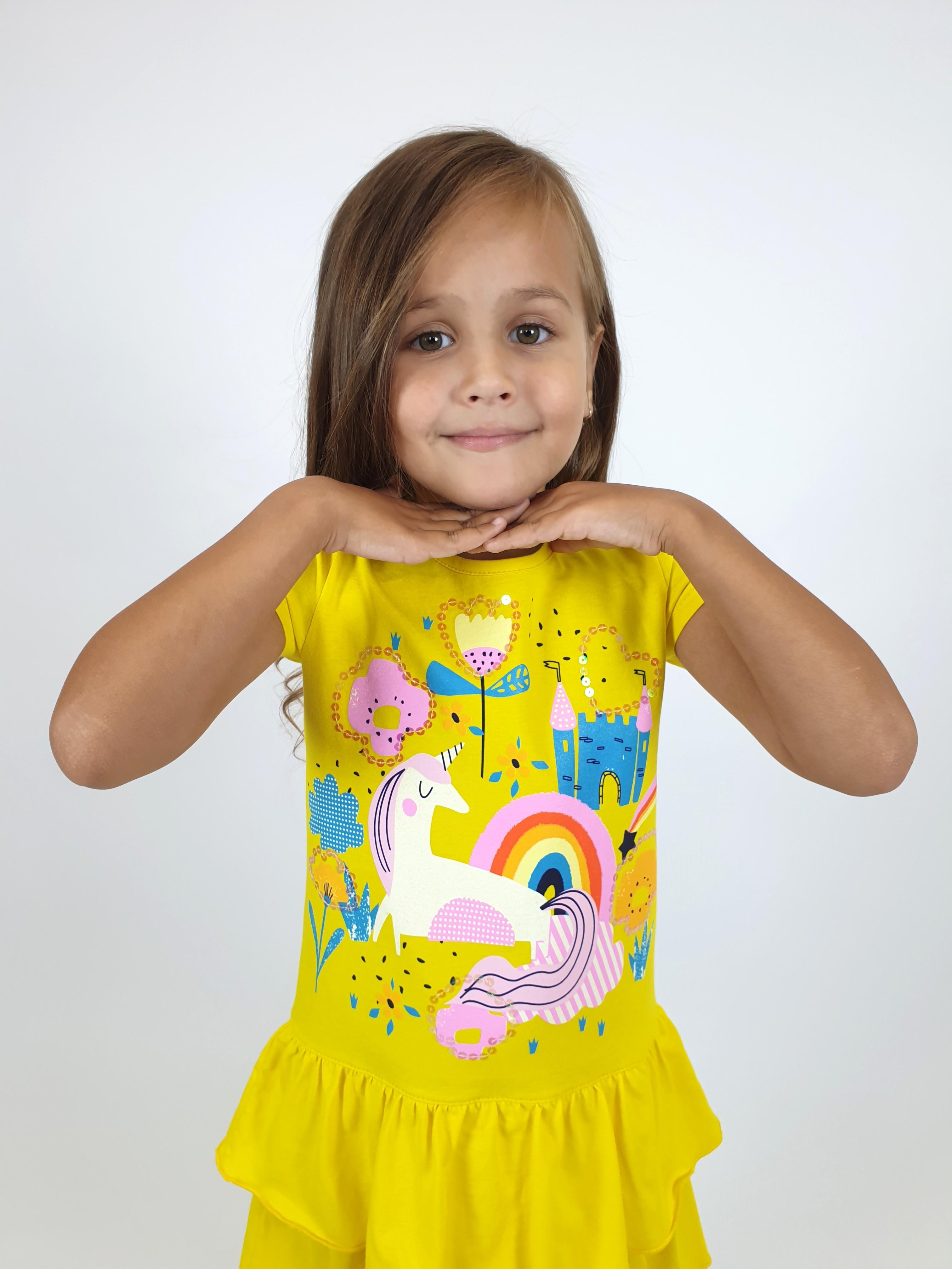 Кулирное полотно:100% х/б. Платье-силуэт трапеция.Короткий рукав,юбка из двух воланов.Застежка по спинке капелька на пуговицу.Горловина окантована.Печать и вышивка пайетки на переде.