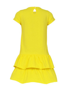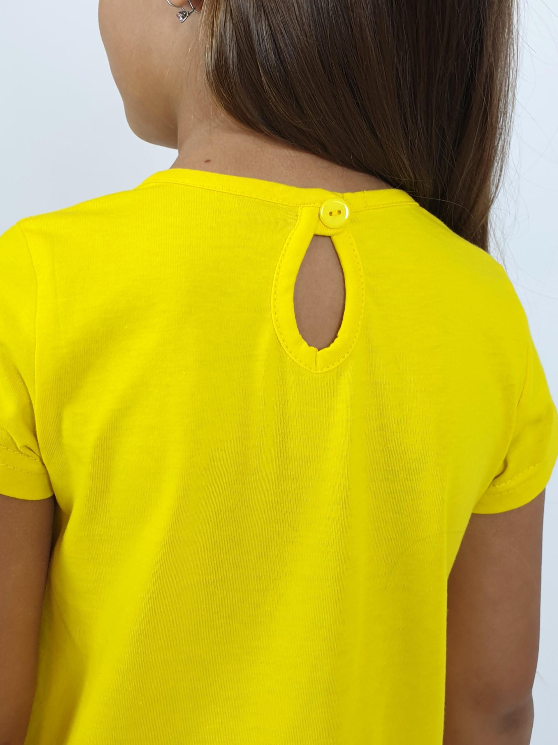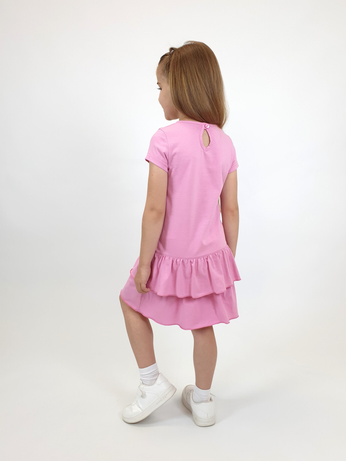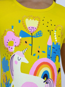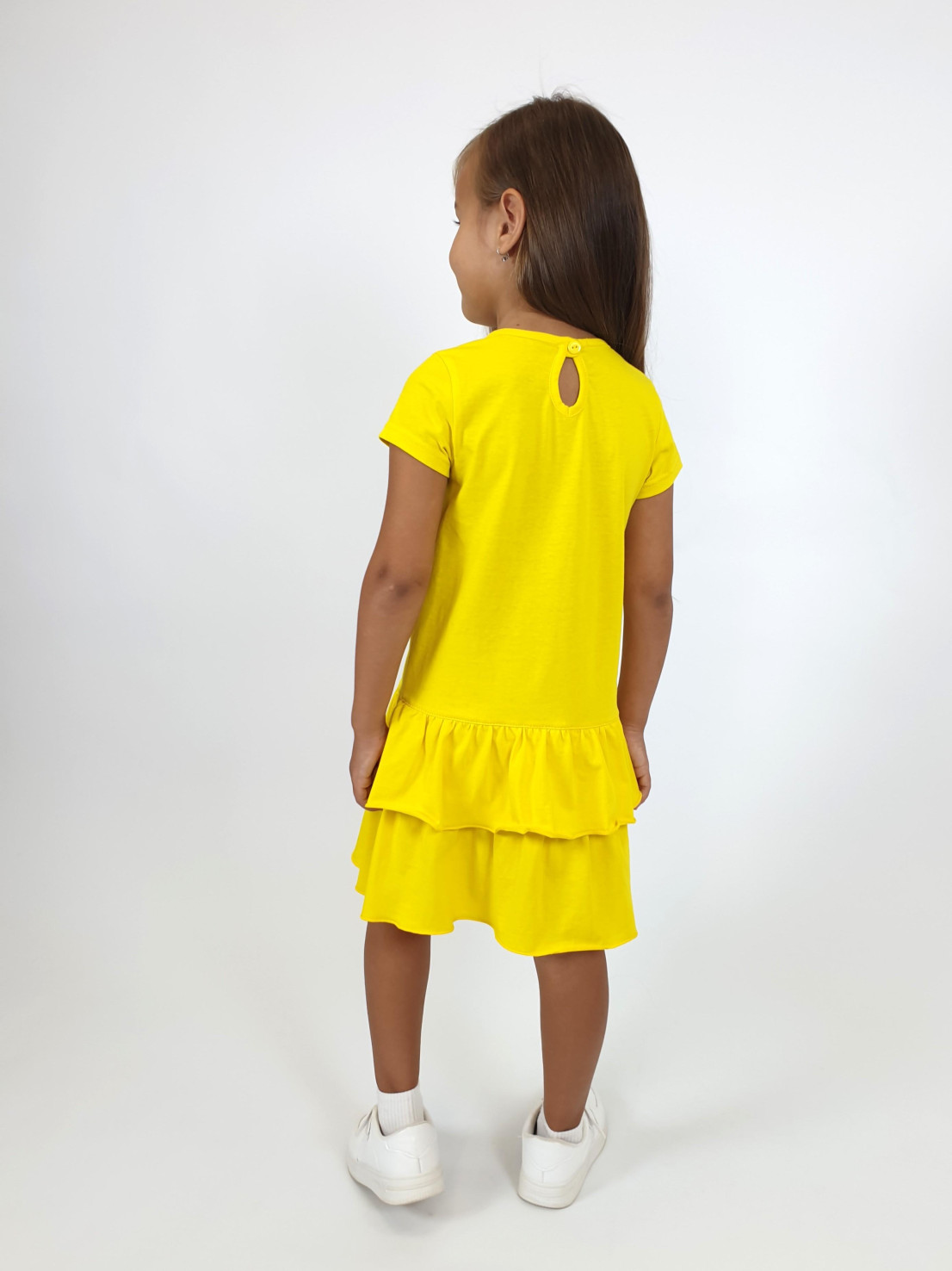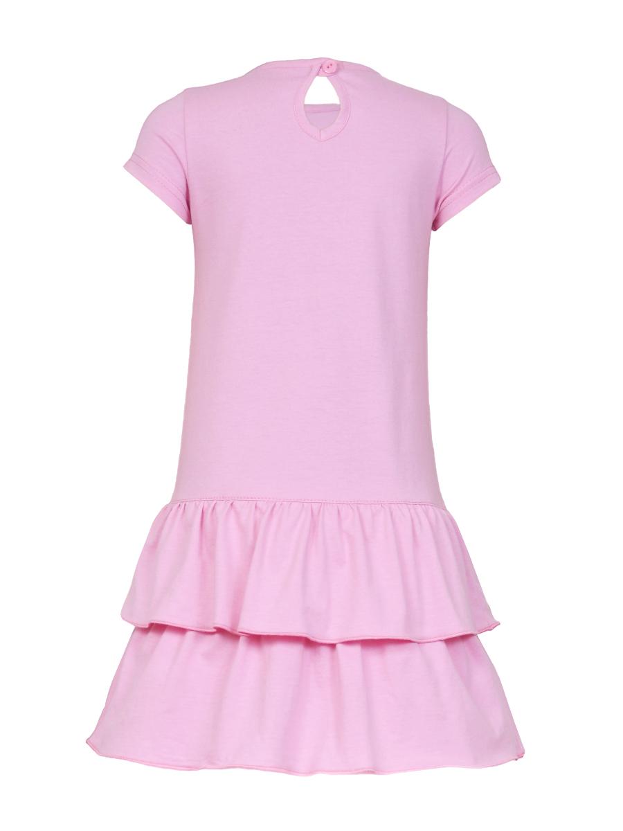 Кулирное полотно:100% х/б. Платье-силуэт трапеция.Короткий рукав,юбка из двух воланов.Застежка по спинке капелька на пуговицу.Горловина окантована.Печать и вышивка пайетки на переде.