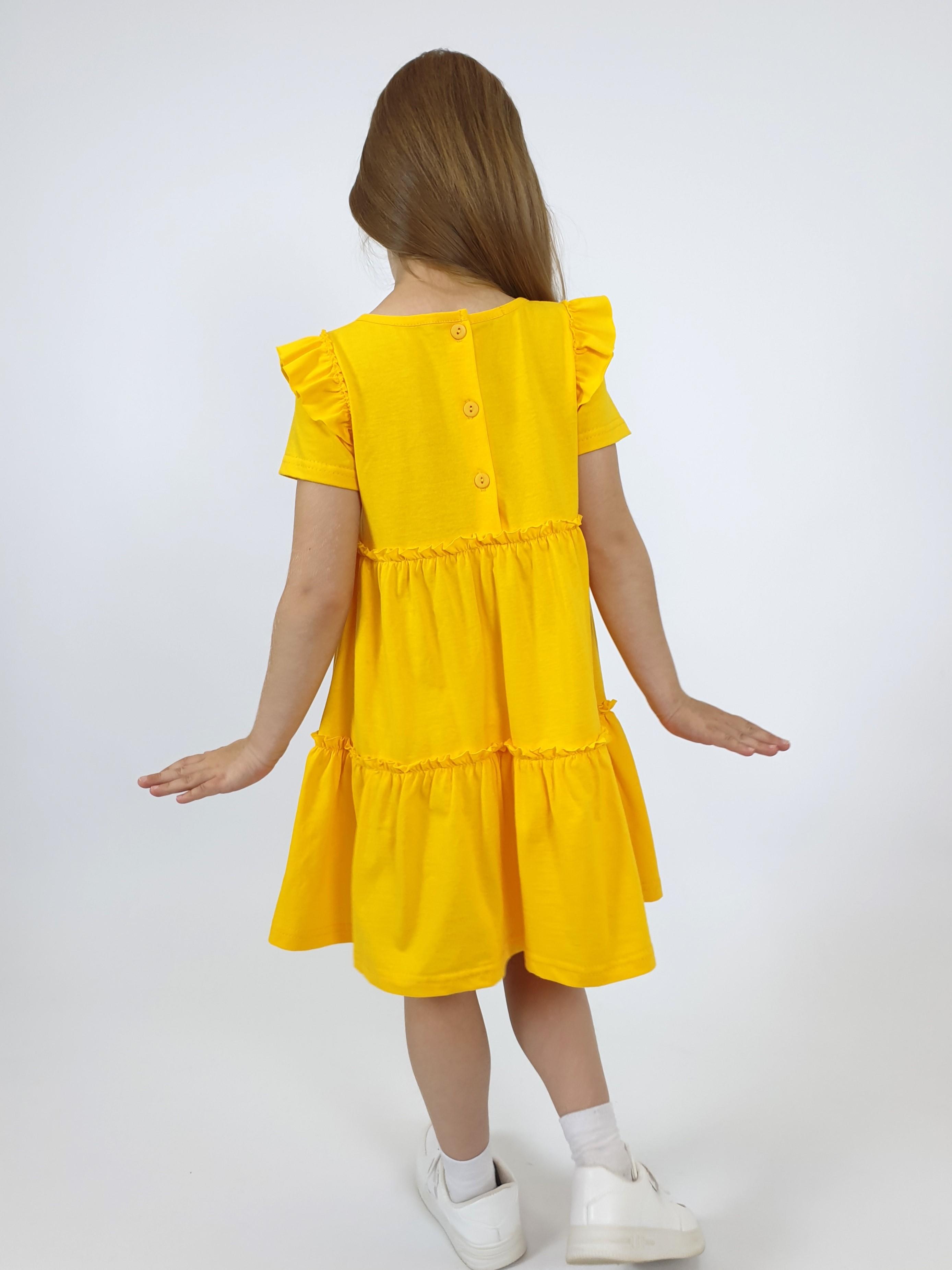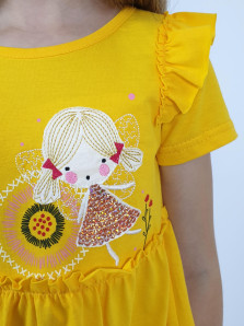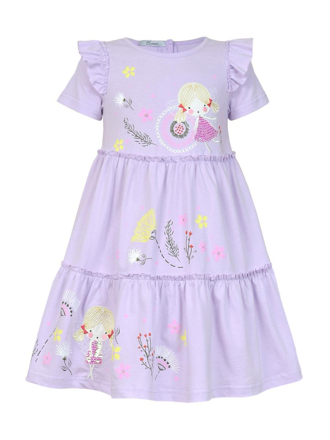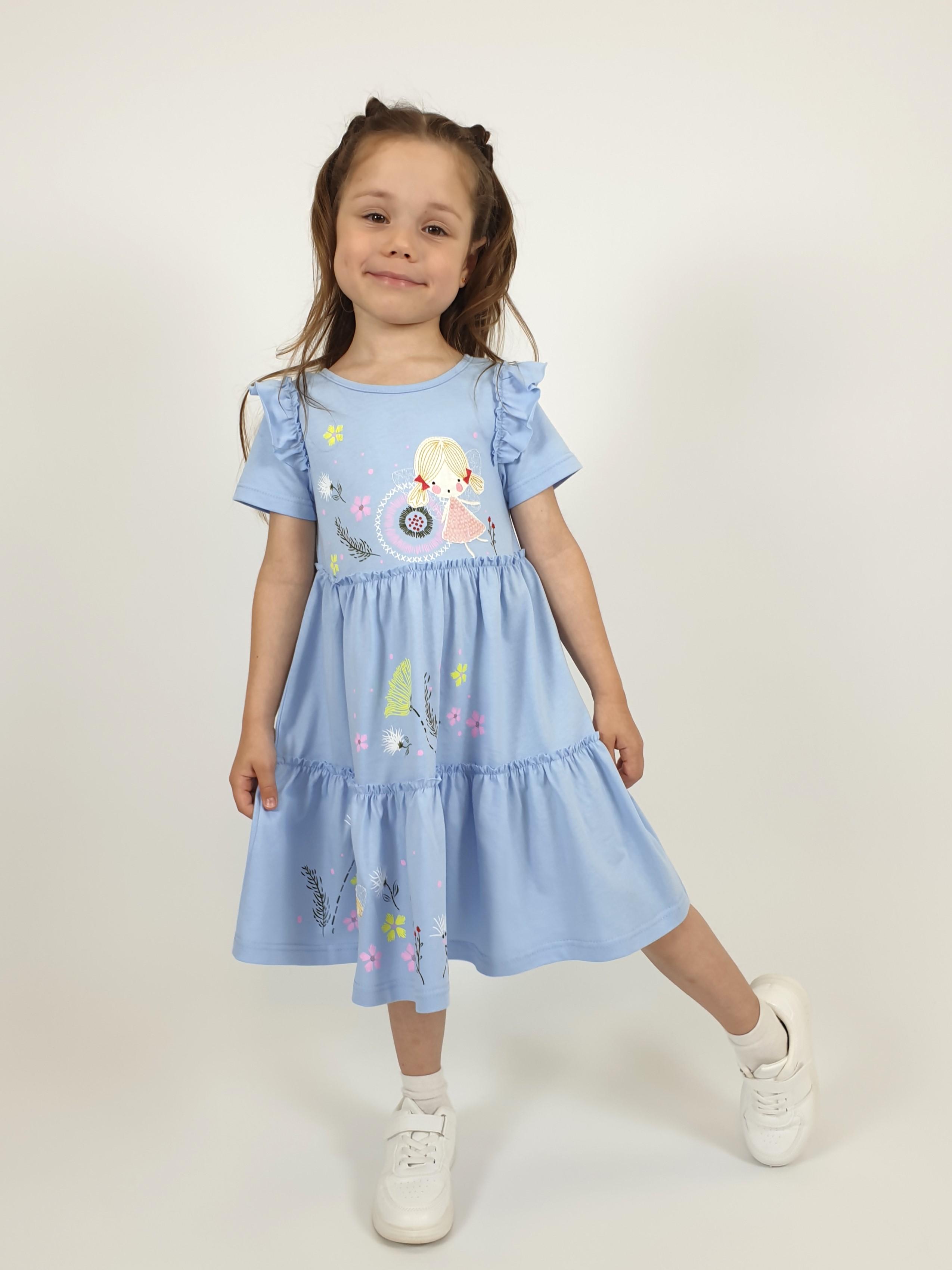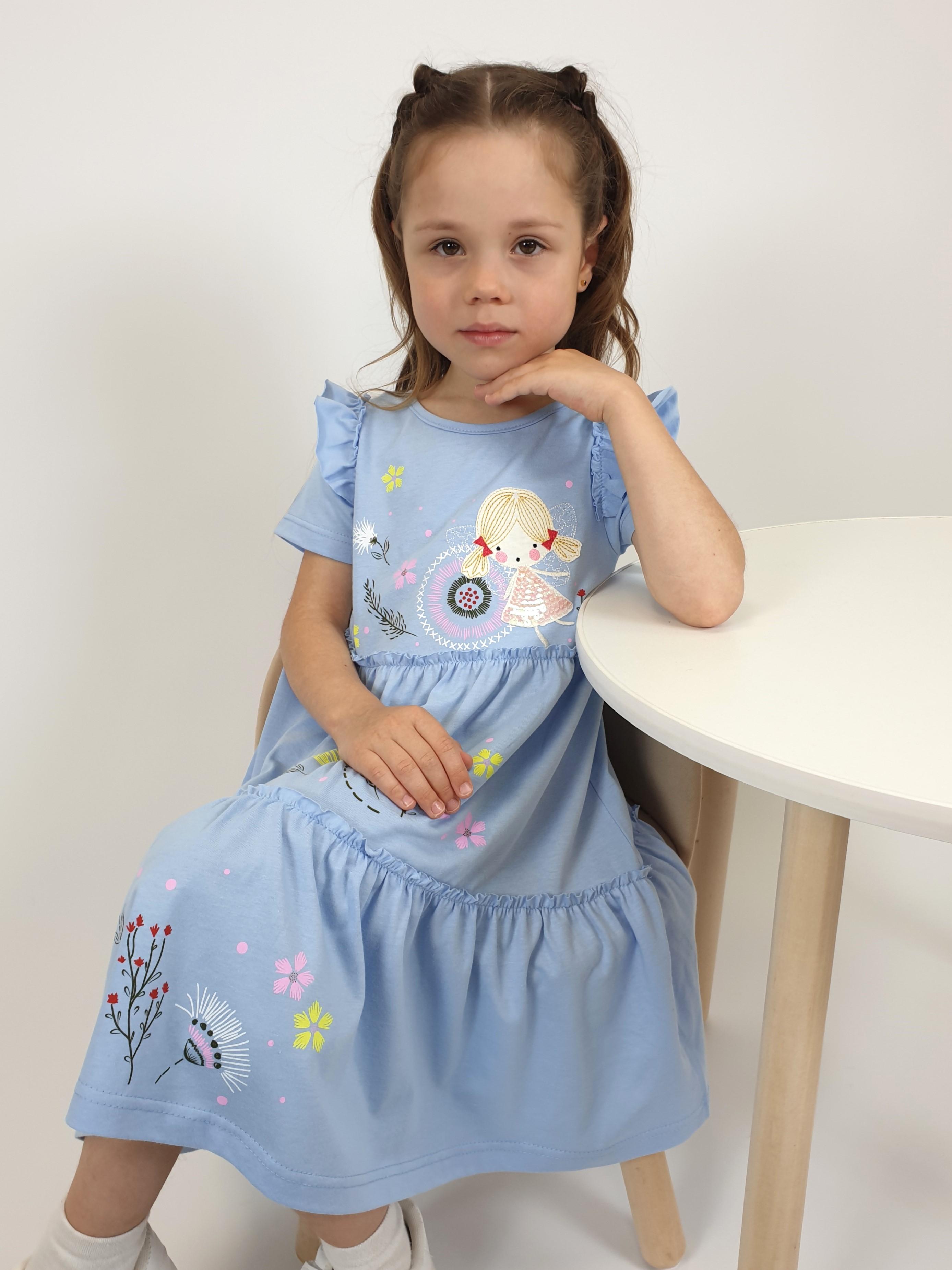 Кулирное полотно:100% х/б. Платье-силуэт трапеция,короткий втачной рукав с настрочной рюшей по пройме.Юбка переда и спинки из двух воланов,по передним воланам печать.Кокетка переда с печатью,застежка по спинке на пуговицы.Горловина окантована.Вышивка(пайетки)-на кокетке переда и нижнем волане.