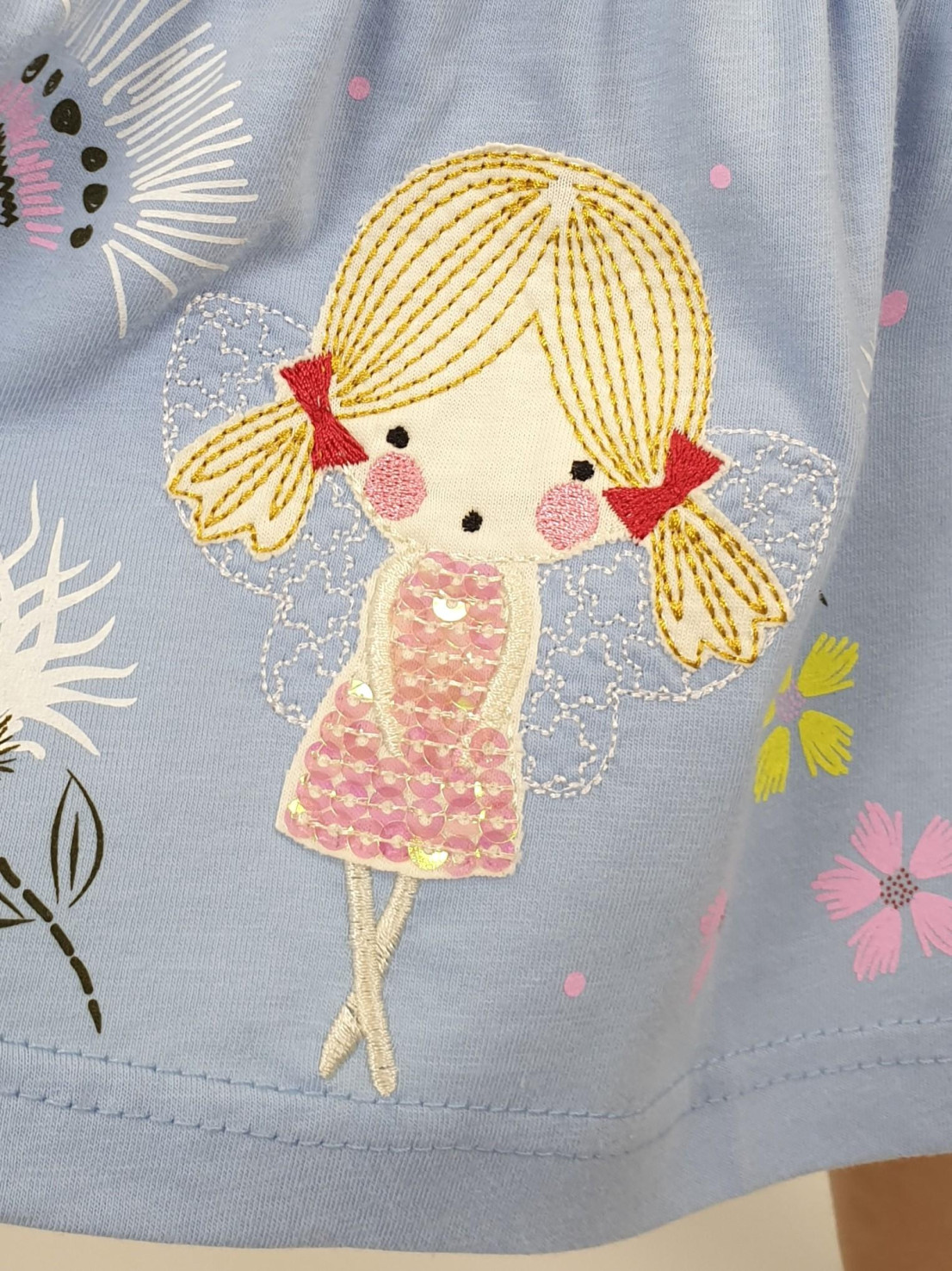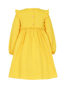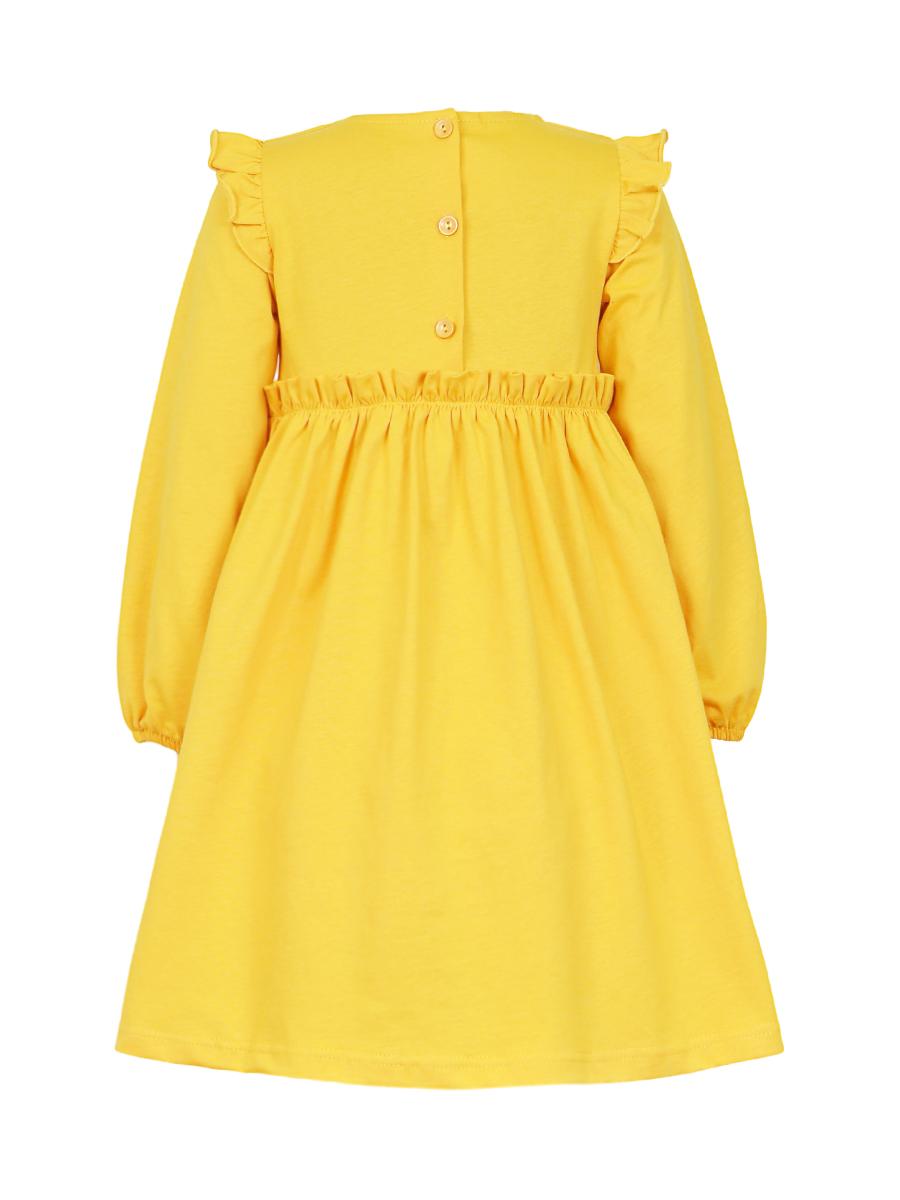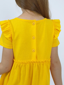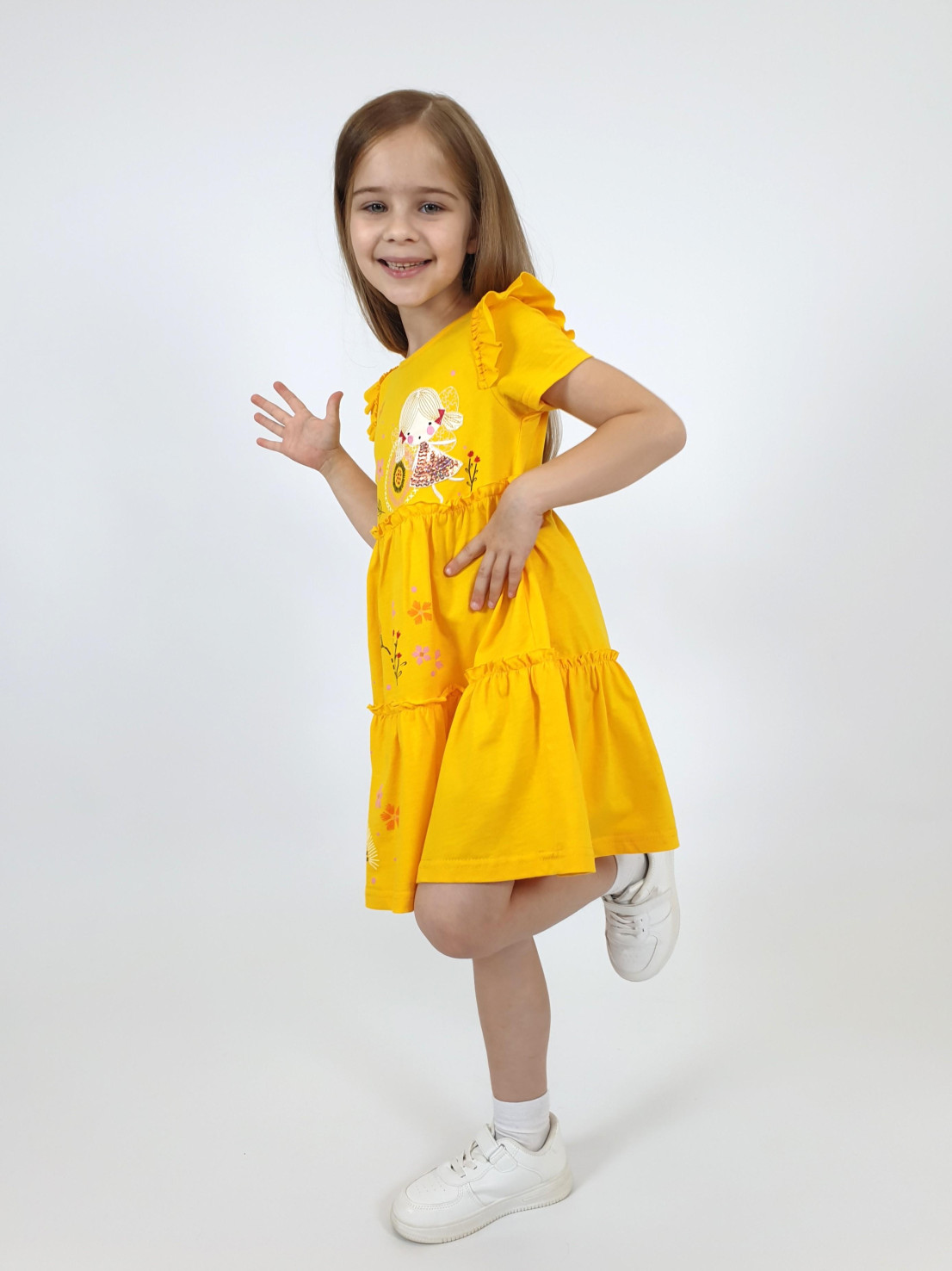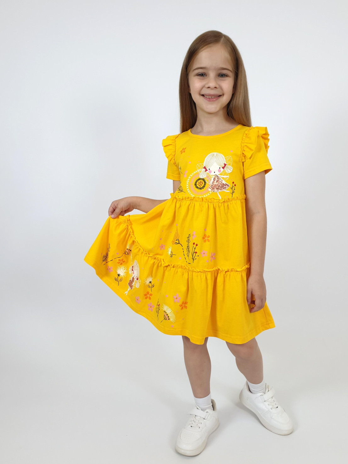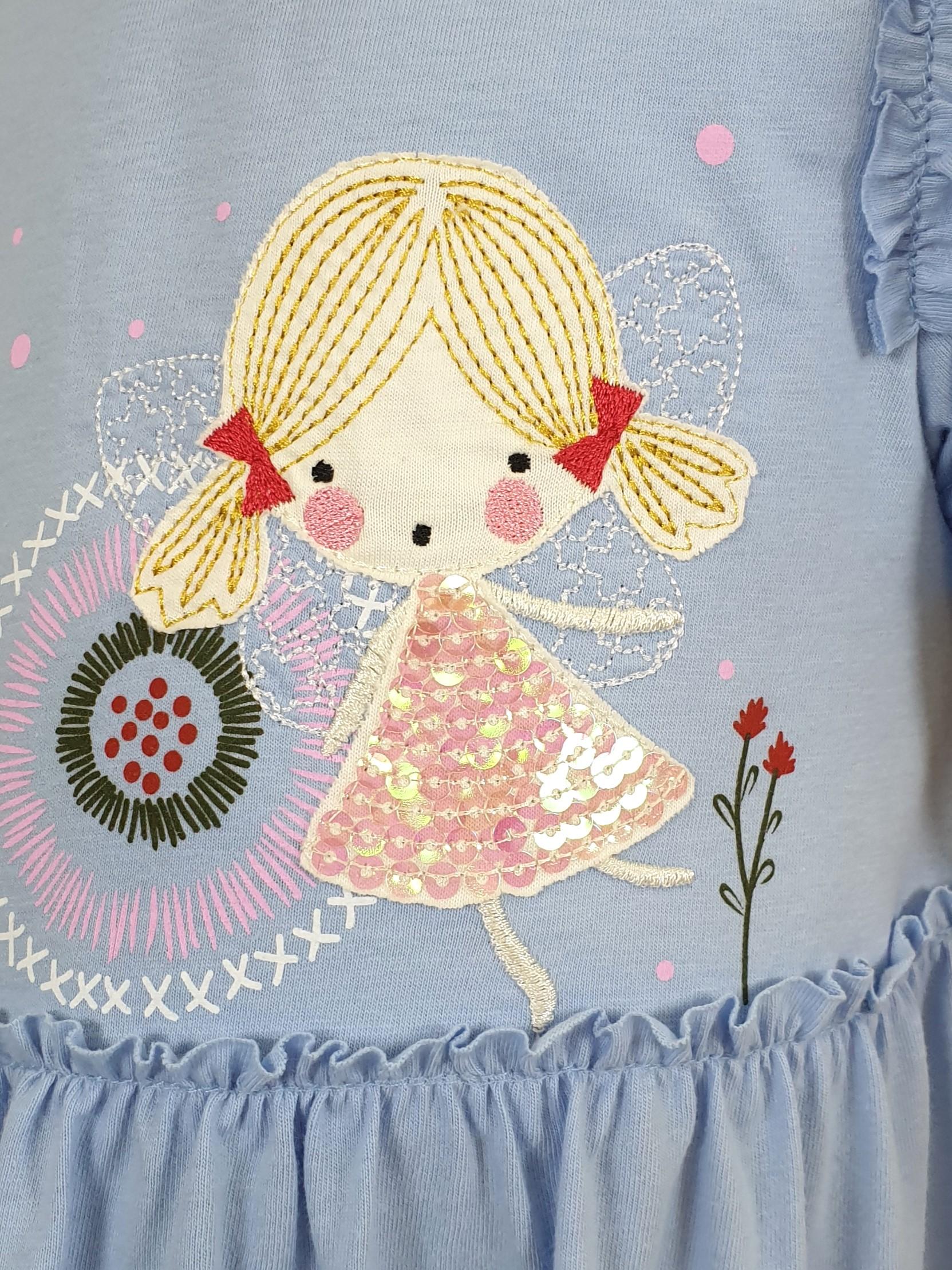 Кулирное полотно:100% х/б. Платье-силуэт трапеция,короткий втачной рукав с настрочной рюшей по пройме.Юбка переда и спинки из двух воланов,по передним воланам печать.Кокетка переда с печатью,застежка по спинке на пуговицы.Горловина окантована.Вышивка(пайетки)-на кокетке переда и нижнем волане.