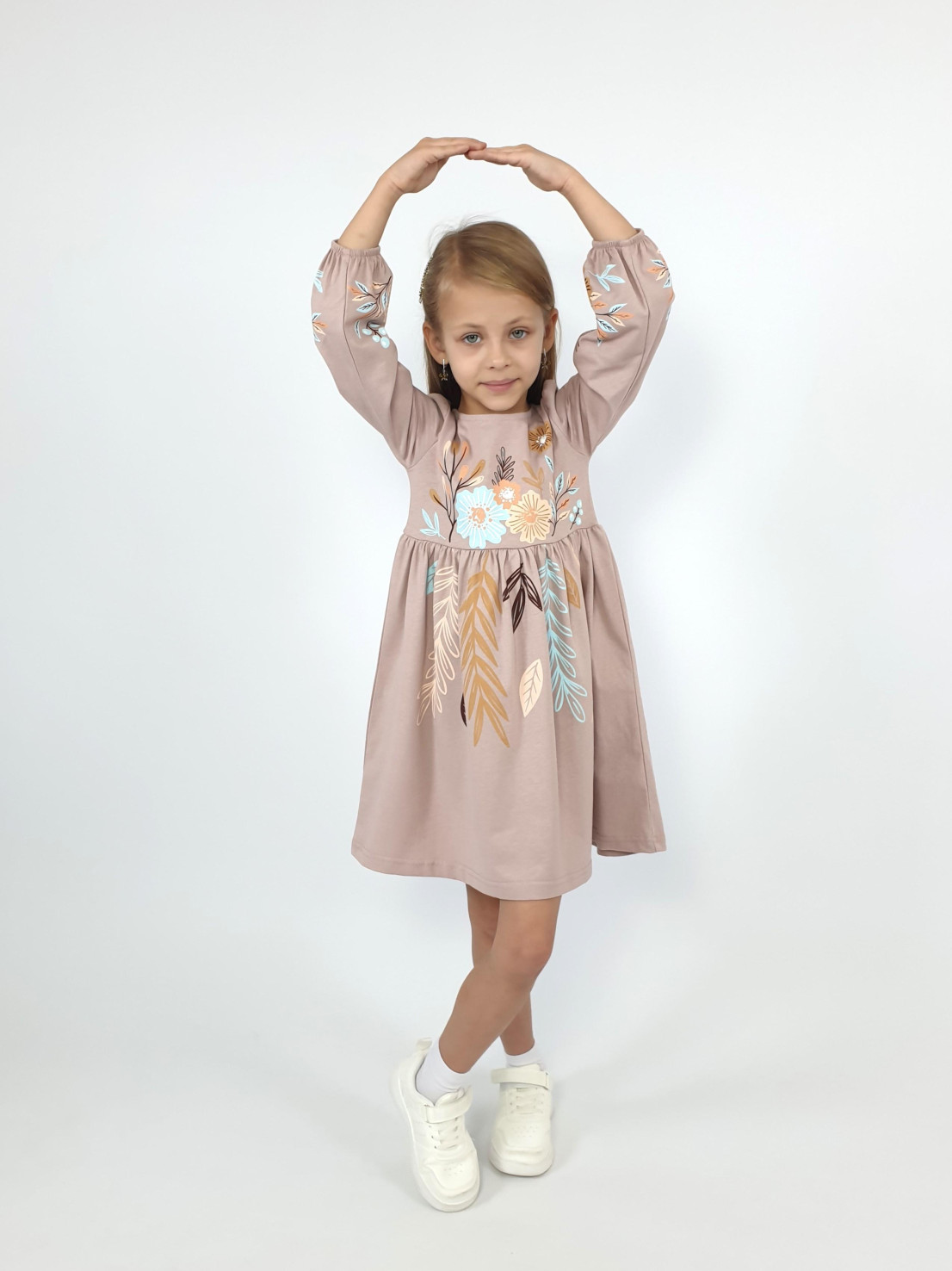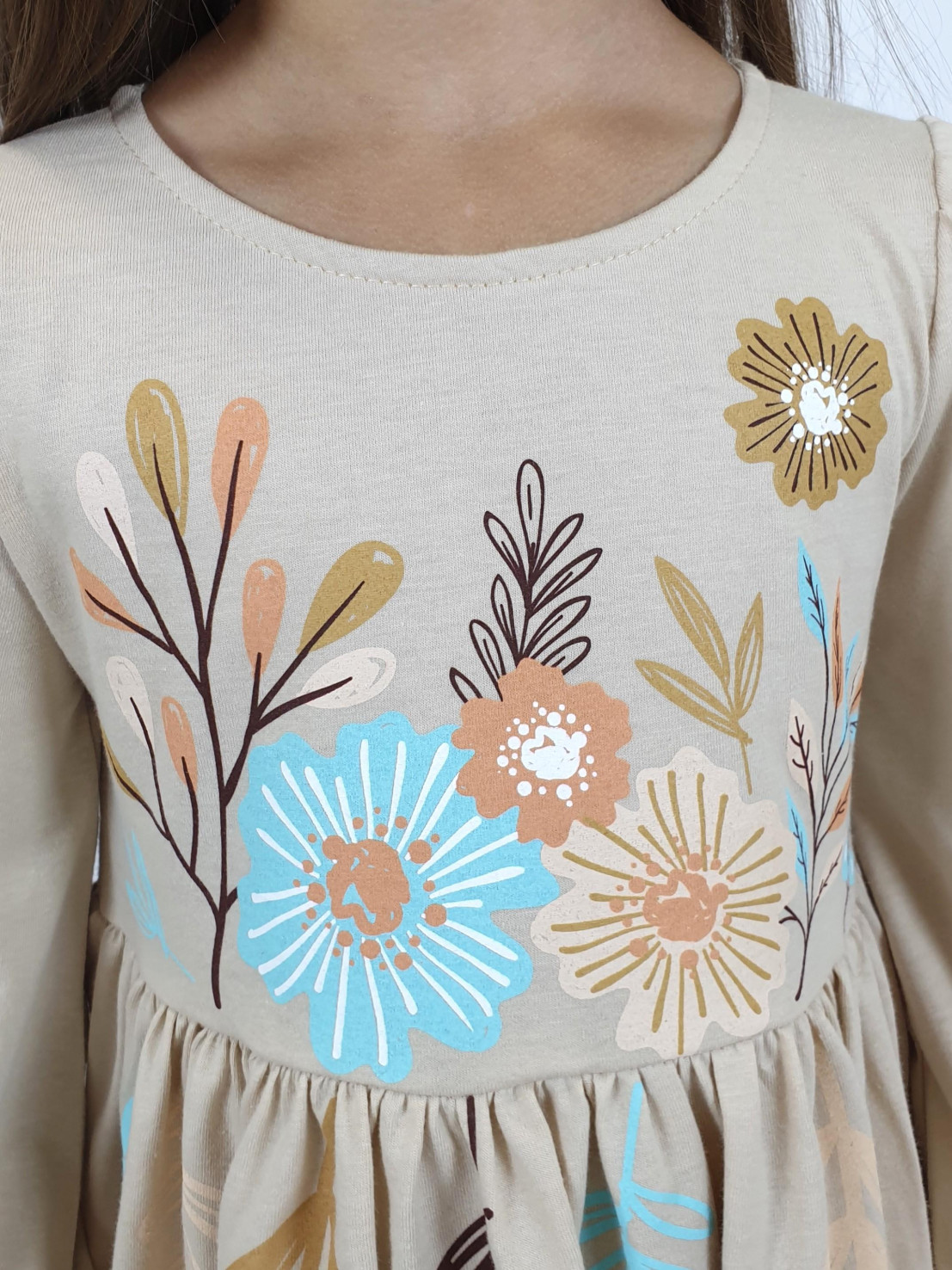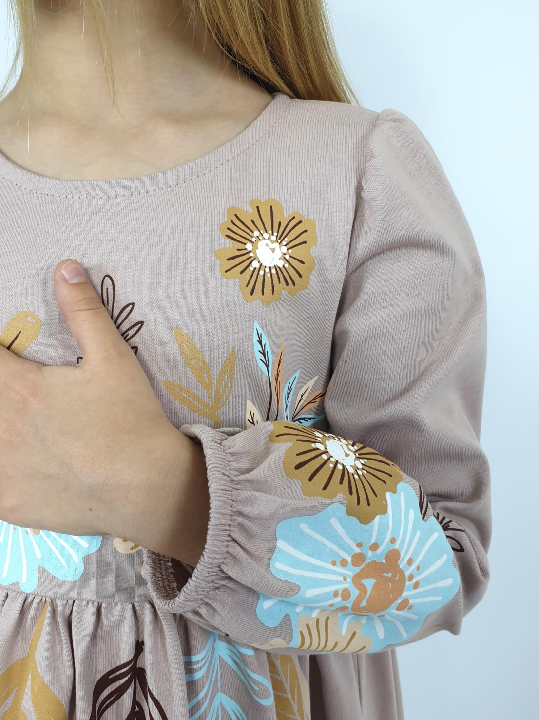 Кулирное полотно:100% х/б. Платье-приталенный силуэт.Длинный рукав-сборка по окату,внизу на резинке.Горловина окантована и подшита,по спинке разрез-застежка на пуговицу.Печать на полочке,юбке переда,рукавах.Отрезная юбка со сборкой.