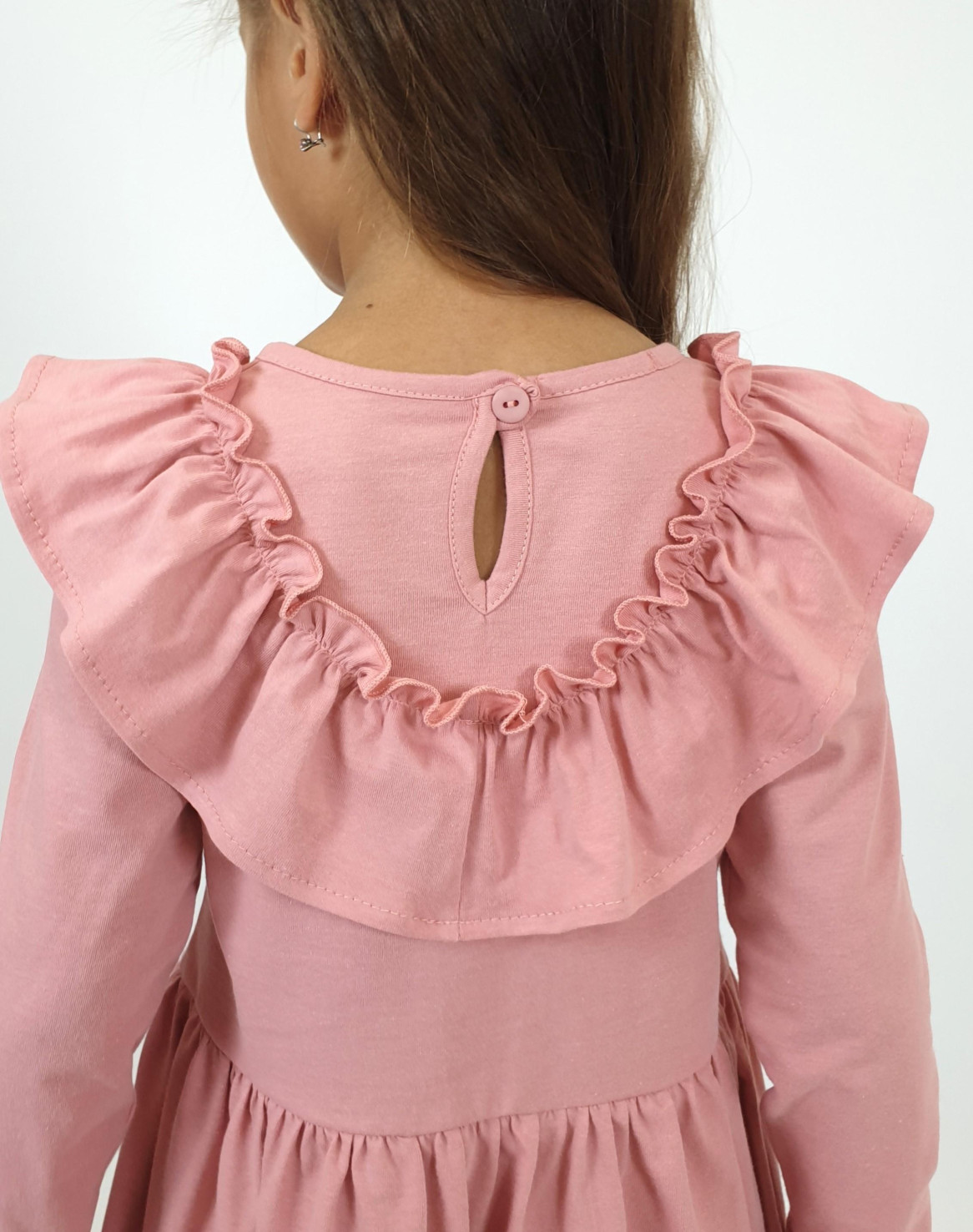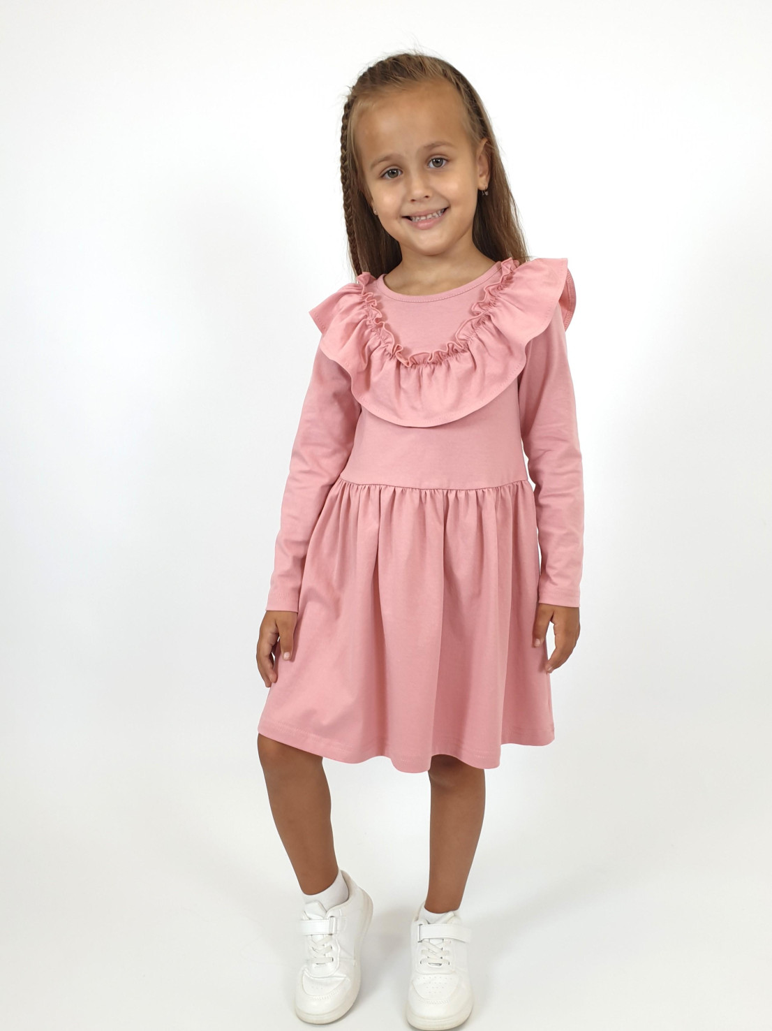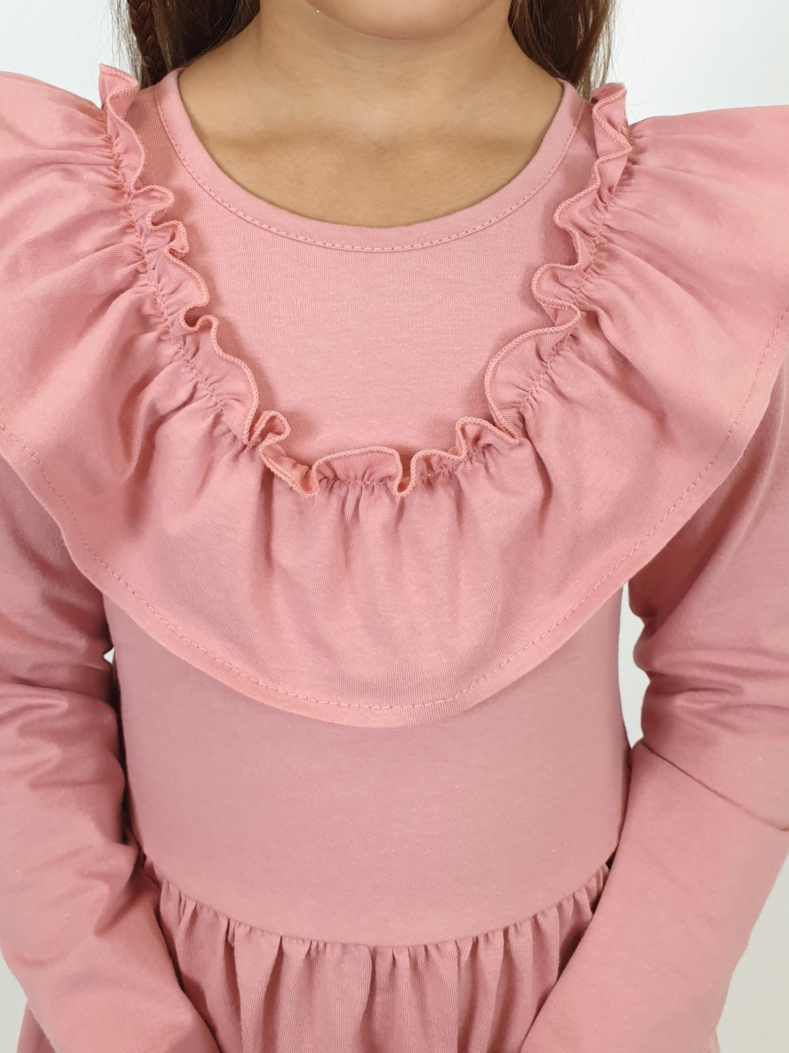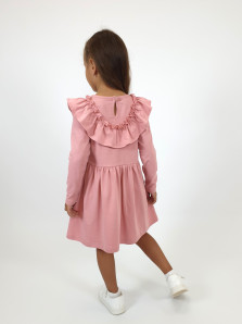 Кулирное полотно:100% х/б. Платье-полуприлегающего силуэта,отрезная юбка со сборкой.Втачной,длинный рукав.Рюша по переду и спинке.Застежка на спинке капля с пуговицей,горловина окантована.