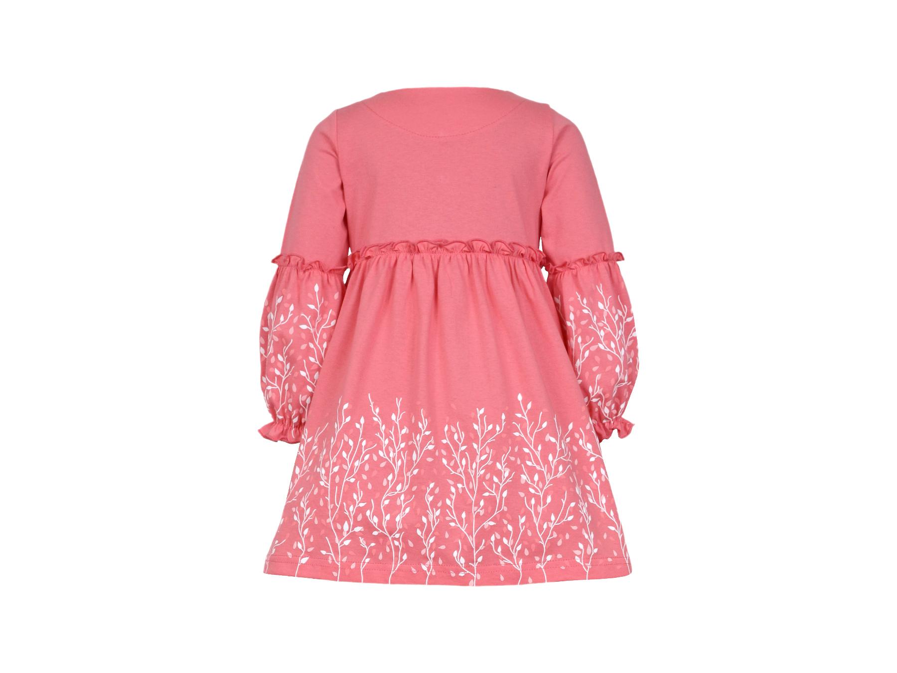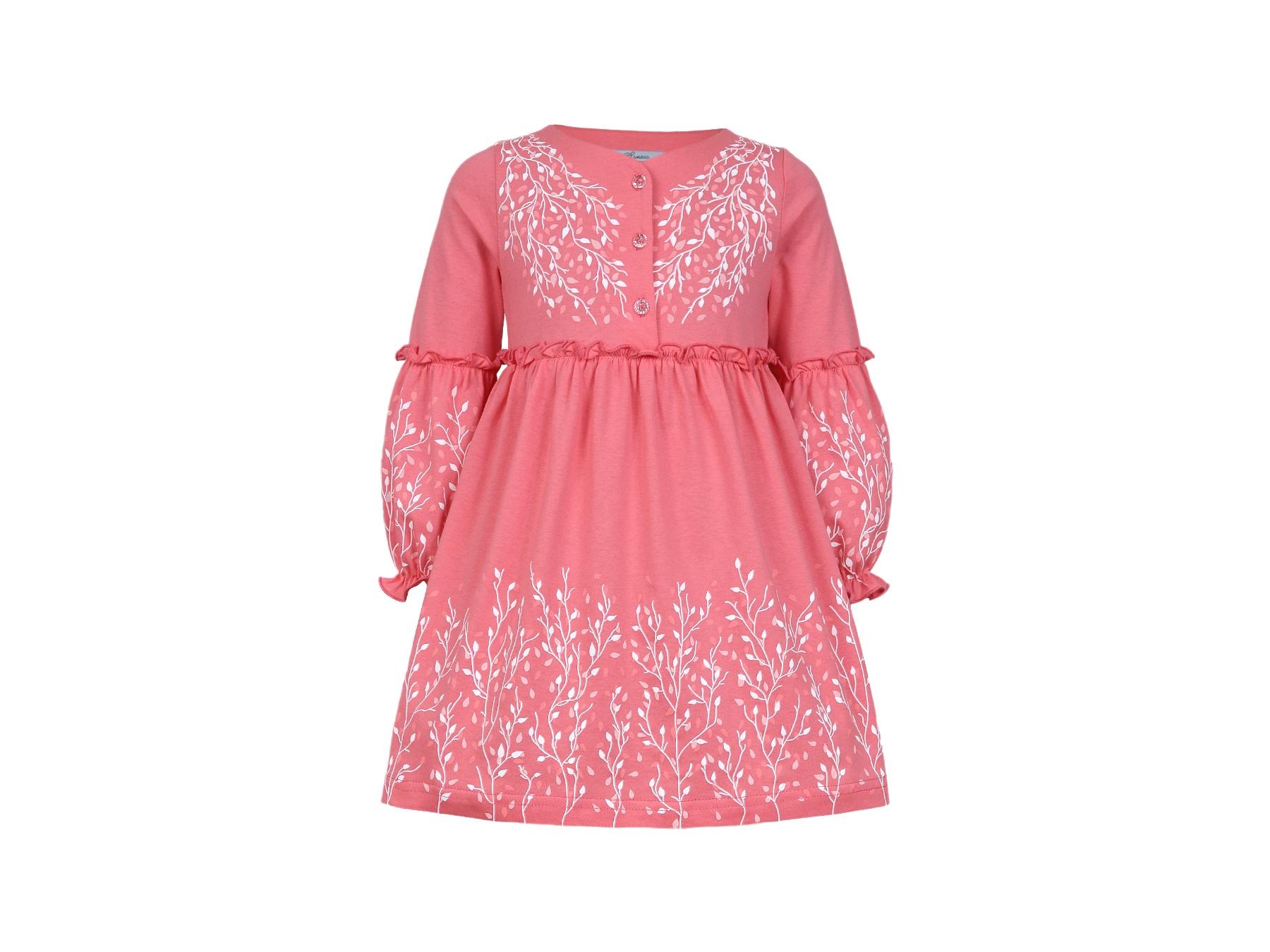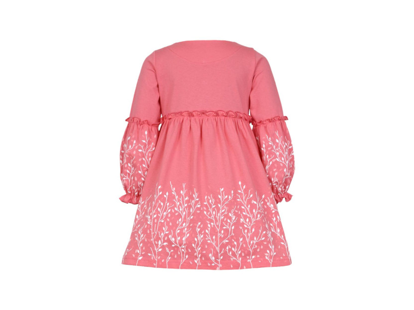 Кулирное полотно:100% х/б. Платье-силуэт трапеция.Длинный втачной рукав,внизу на резинке(шпульная).Завышена линия талии,отрезная юбка.Срезы нижней части рукава и верх юбки со сборкой,обработаны спиральным швом.Печать на переде,рукавах и юбке.Горловина обработана обтачкой.Застежка по переду на пуговицы.