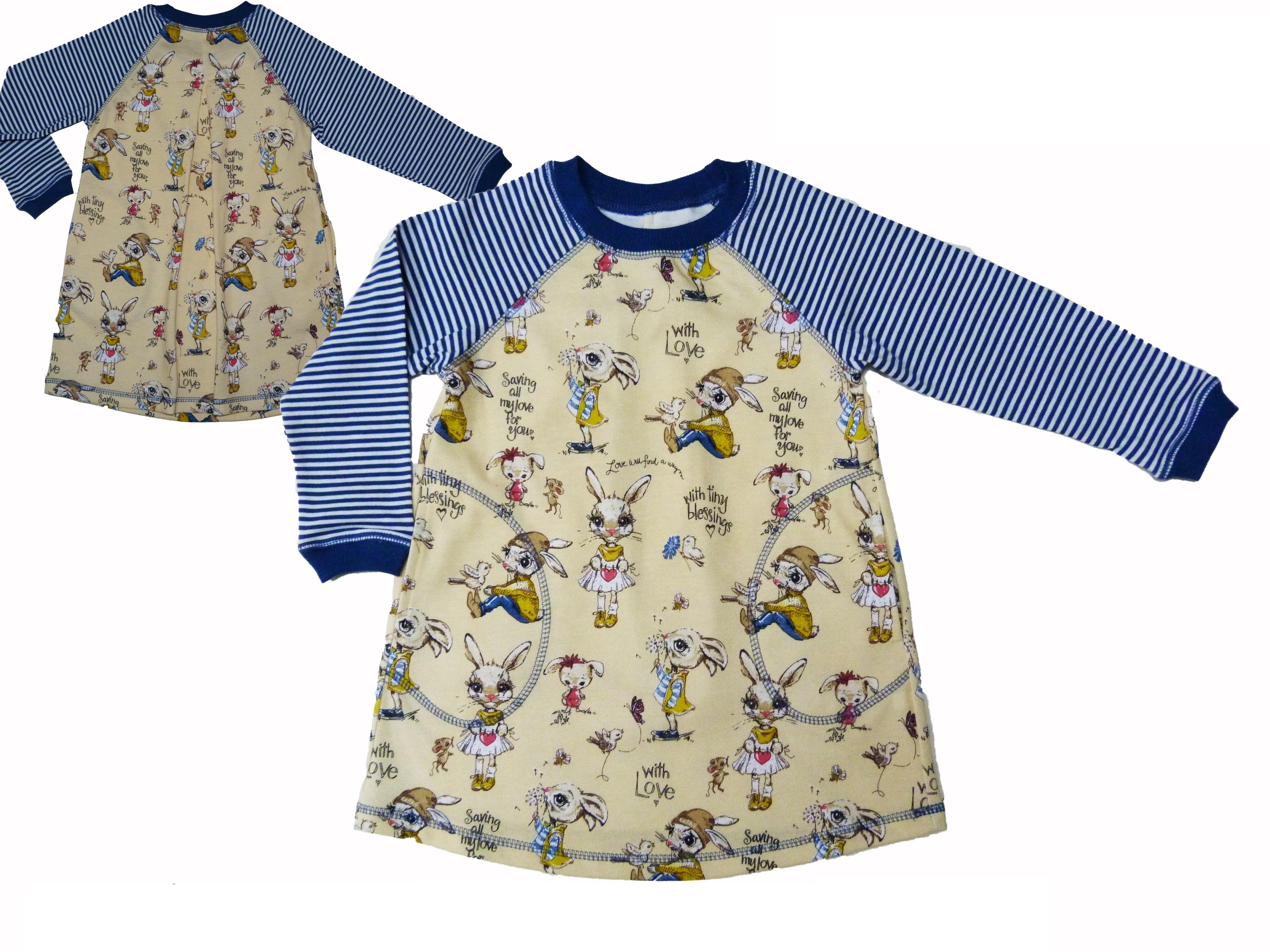 Платье. Кулирная гладь, 100% х/б (гладь + набивка). Силуэт трапеция, карманы в боковых швах. На спинке складка. Рукав реглан, длинный, с притачной манжетой из ластика. Низ изделия подшит. Горловина обработана ластиком.