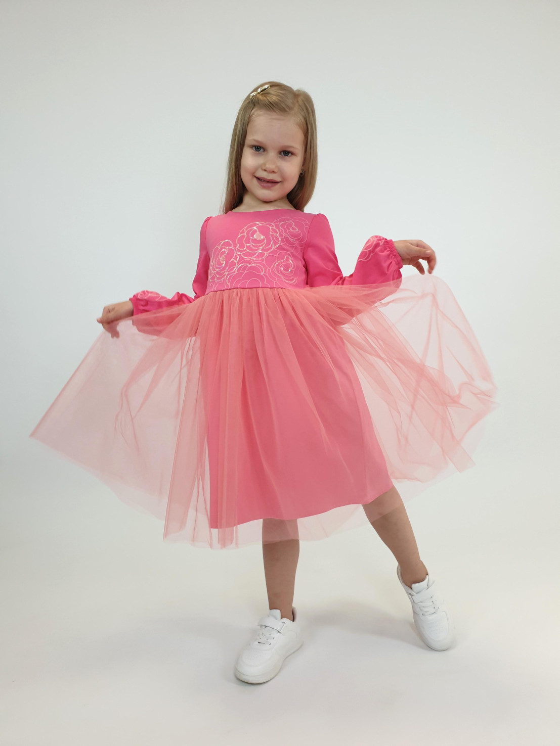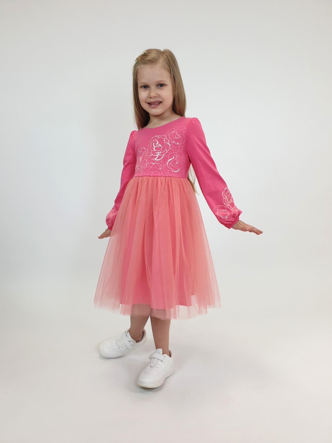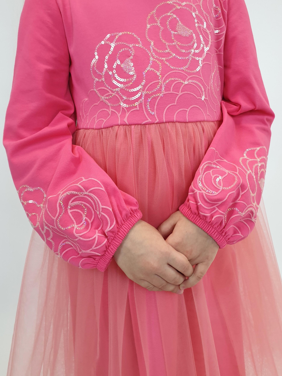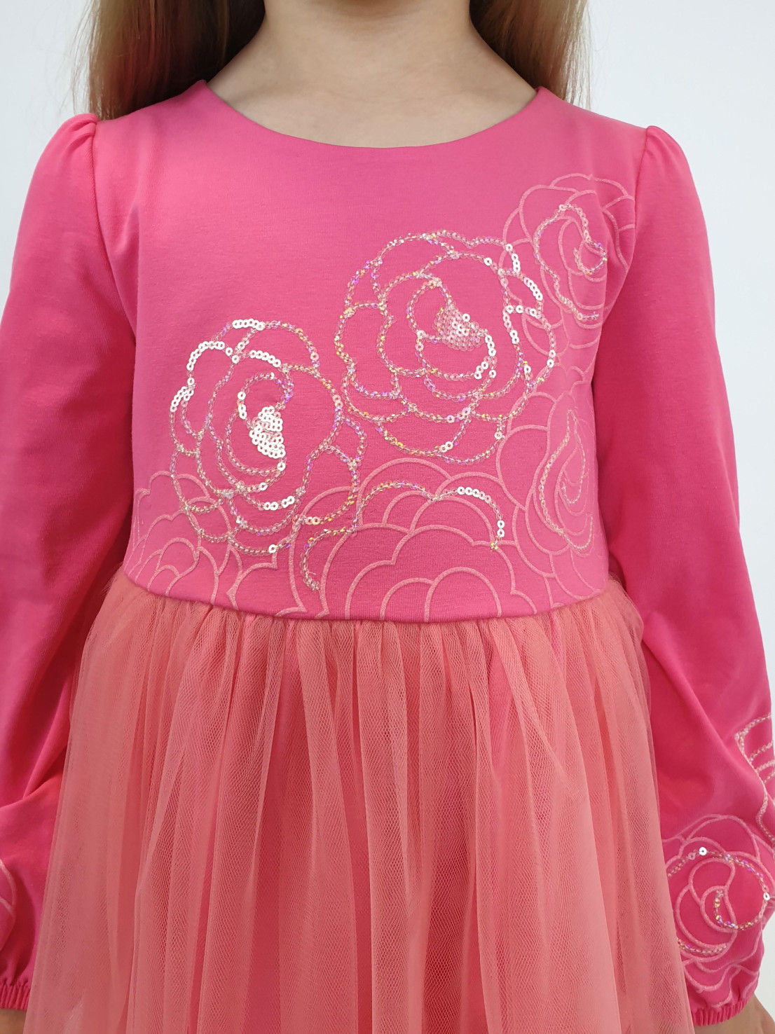Кулирное полотно:95% х/б,5% лайкра,(подкладка-100% х/б,сетка(отделка)-100% п/э. Платье-приталенный силуэт на подкладке.Длинный рукав-сборка по окату,внизу на резинке.Отрезная юбка на подкладке с сеткой в два слоя.Застежка по спинке на пуговицу.Печать и вышивка(пайетки) на переде и рукавах.