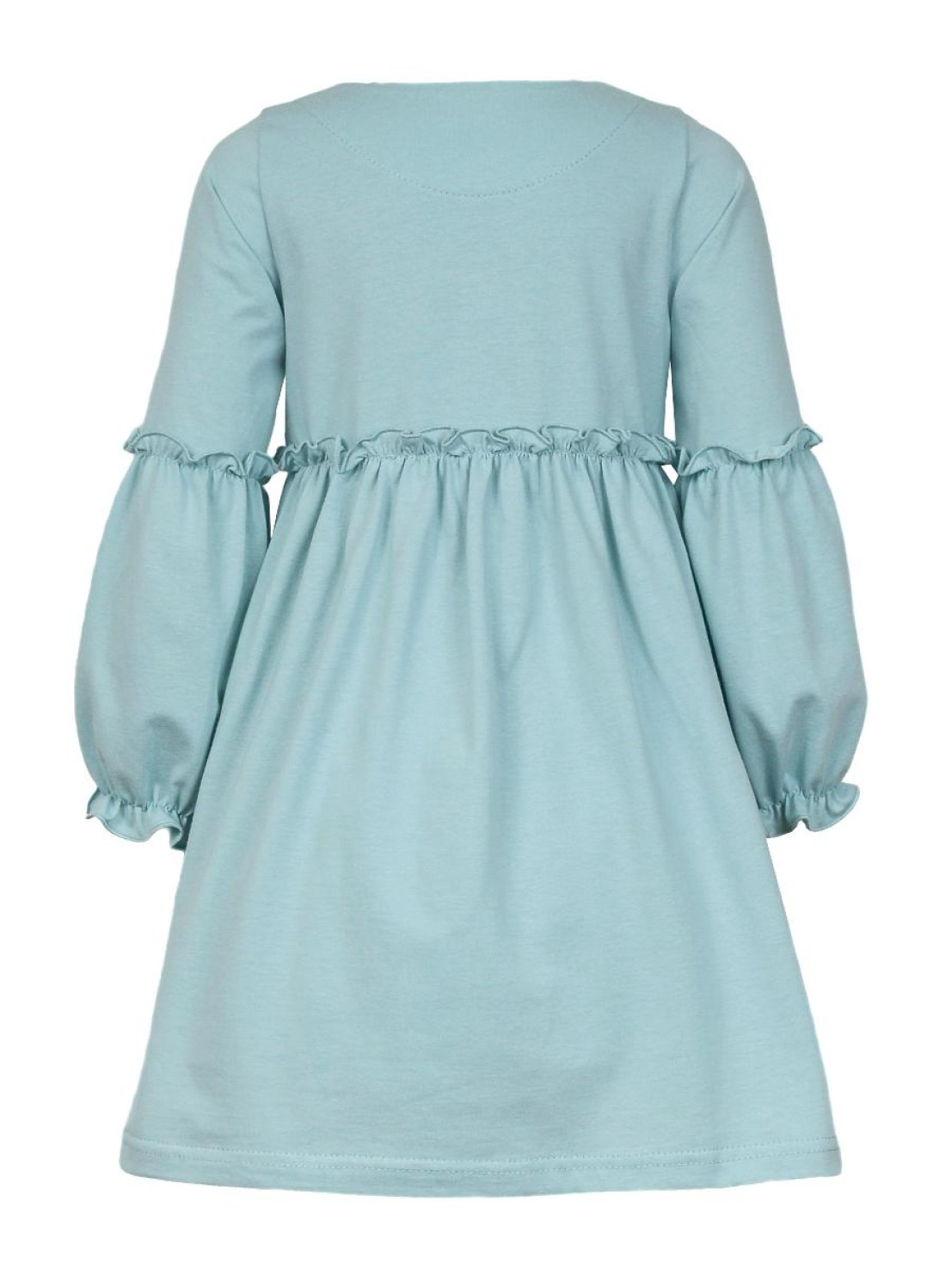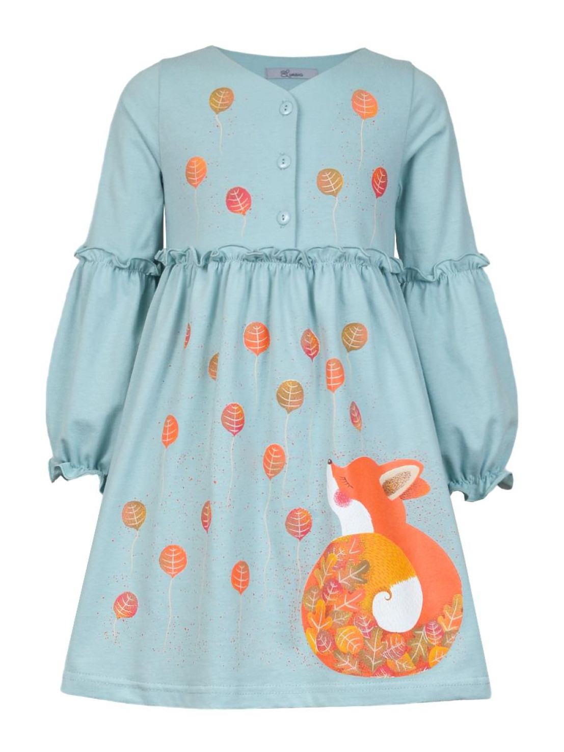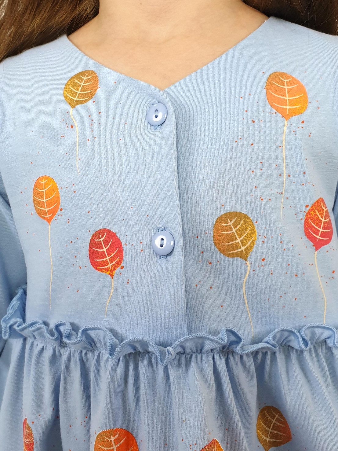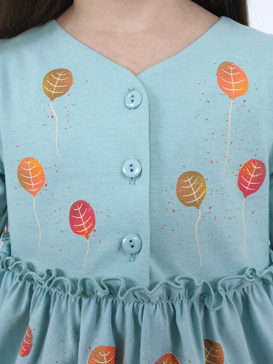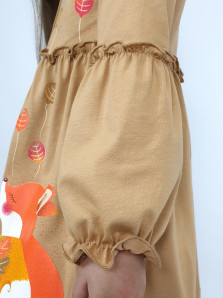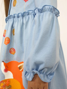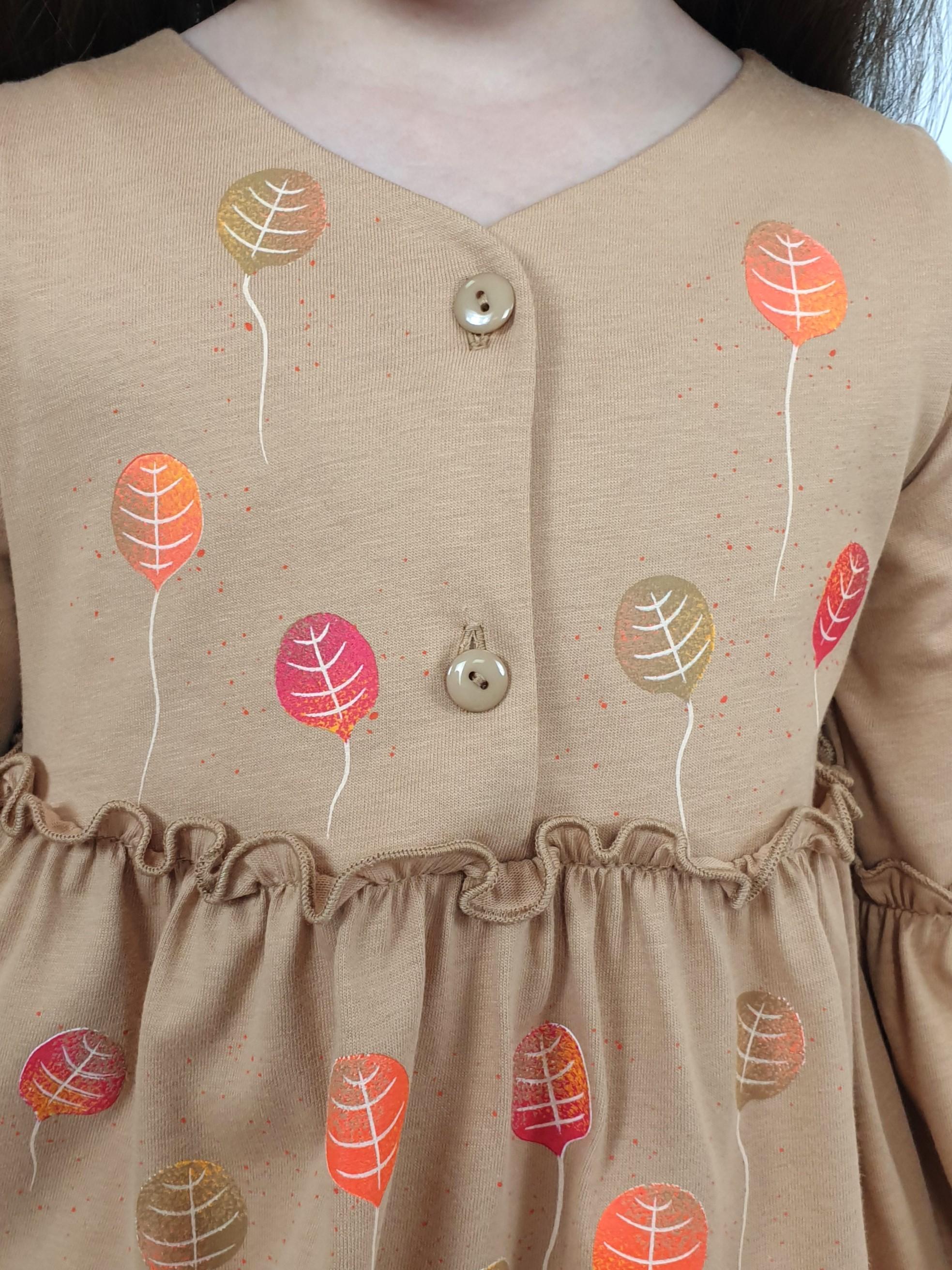 Кулирное полотно:100% х/б. Платье-силуэт трапеция,длинный втачной рукав,внизу на резинке(шпульная).Линия талии завышена,отрезная юбка.Срезы нижней части рукава и верх юбки со сборкой,обработанны спиральным швом.Печать на переде лифа и юбки.Горловина обработана обтачкой.Застежка по переду на пуговицы.