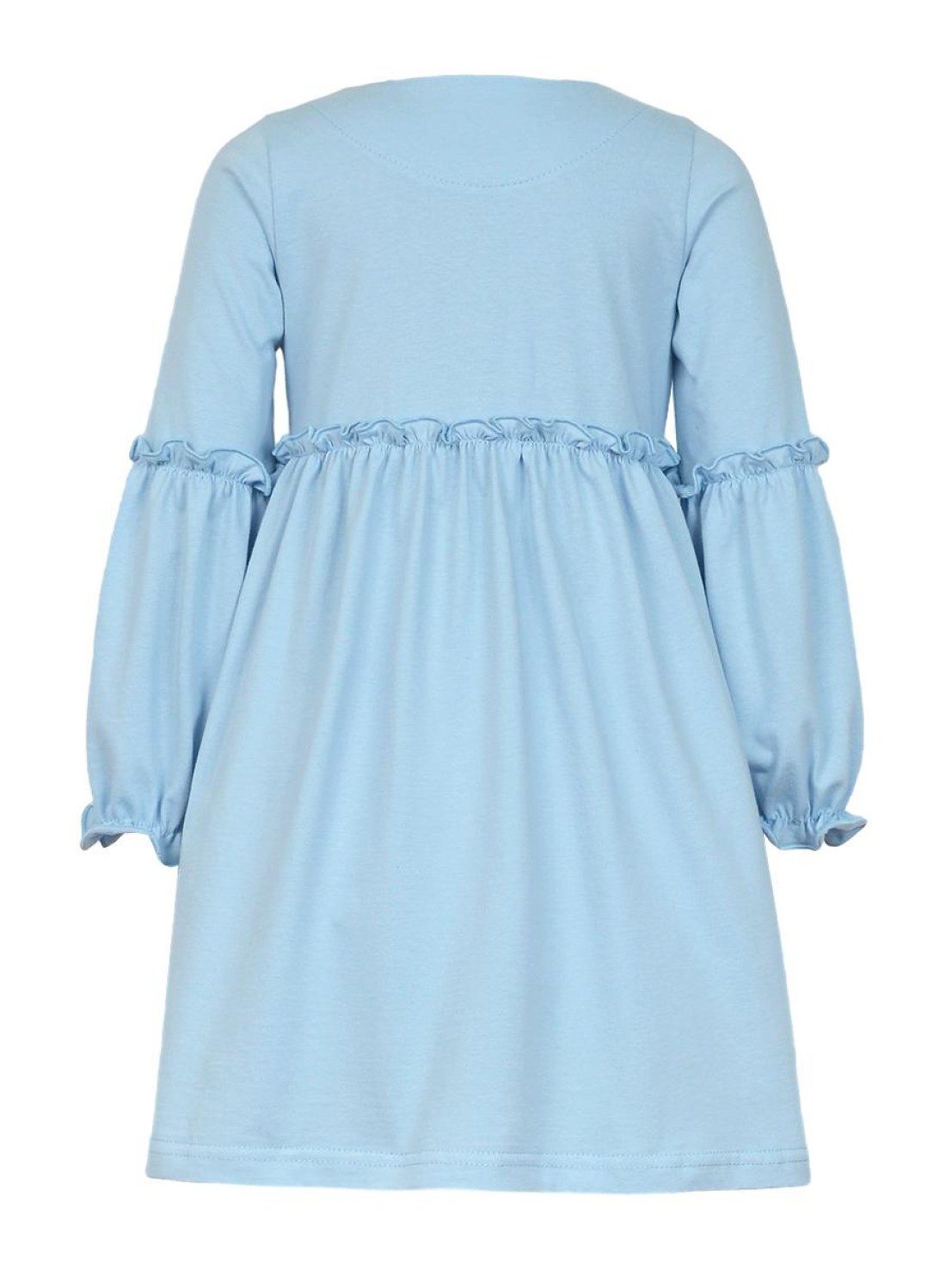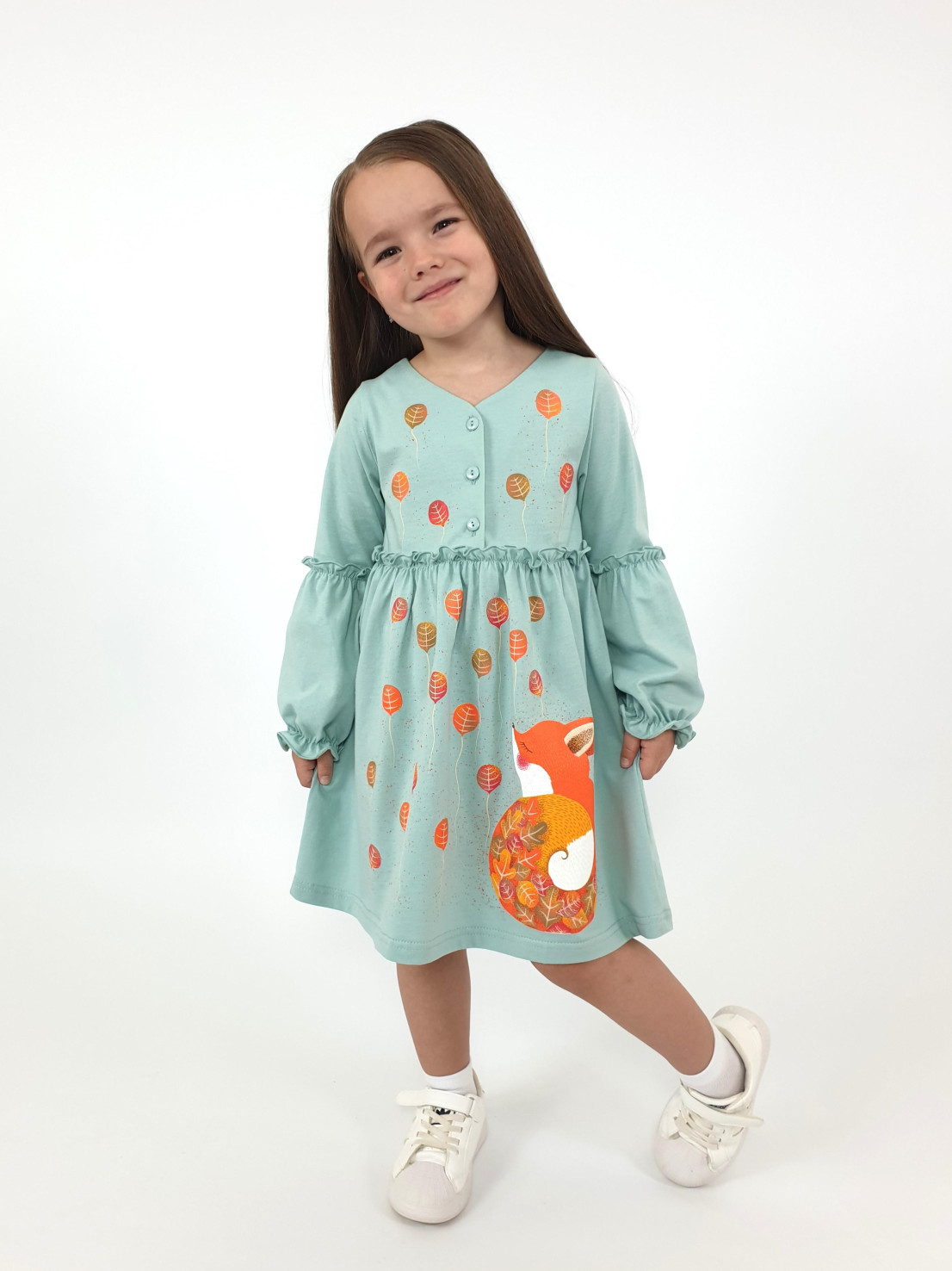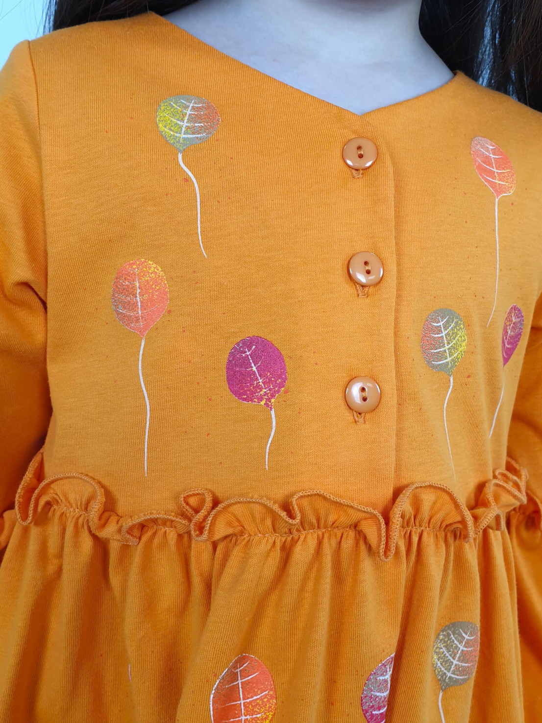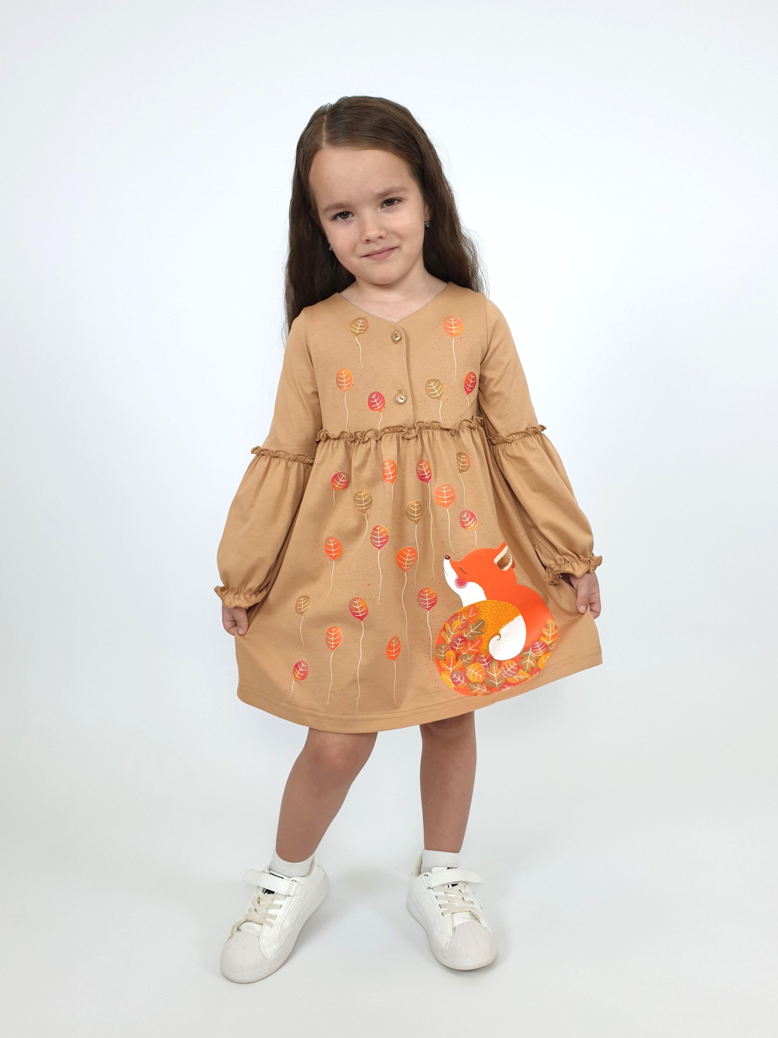 Кулирное полотно:100% х/б. Платье-силуэт трапеция,длинный втачной рукав,внизу на резинке(шпульная).Линия талии завышена,отрезная юбка.Срезы нижней части рукава и верх юбки со сборкой,обработанны спиральным швом.Печать на переде лифа и юбки.Горловина обработана обтачкой.Застежка по переду на пуговицы.