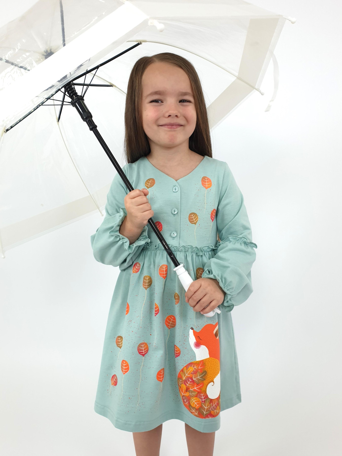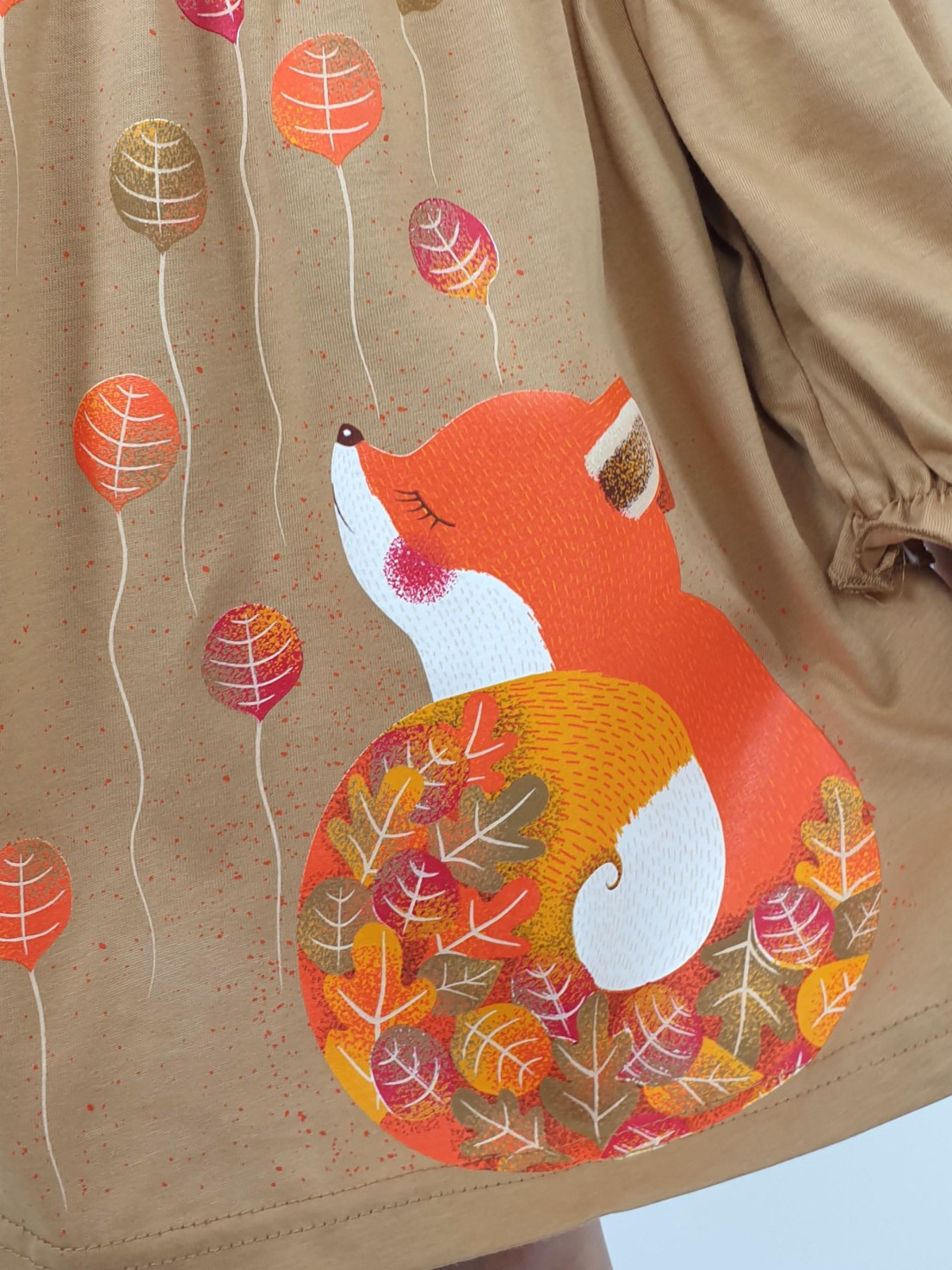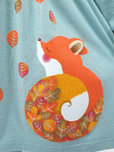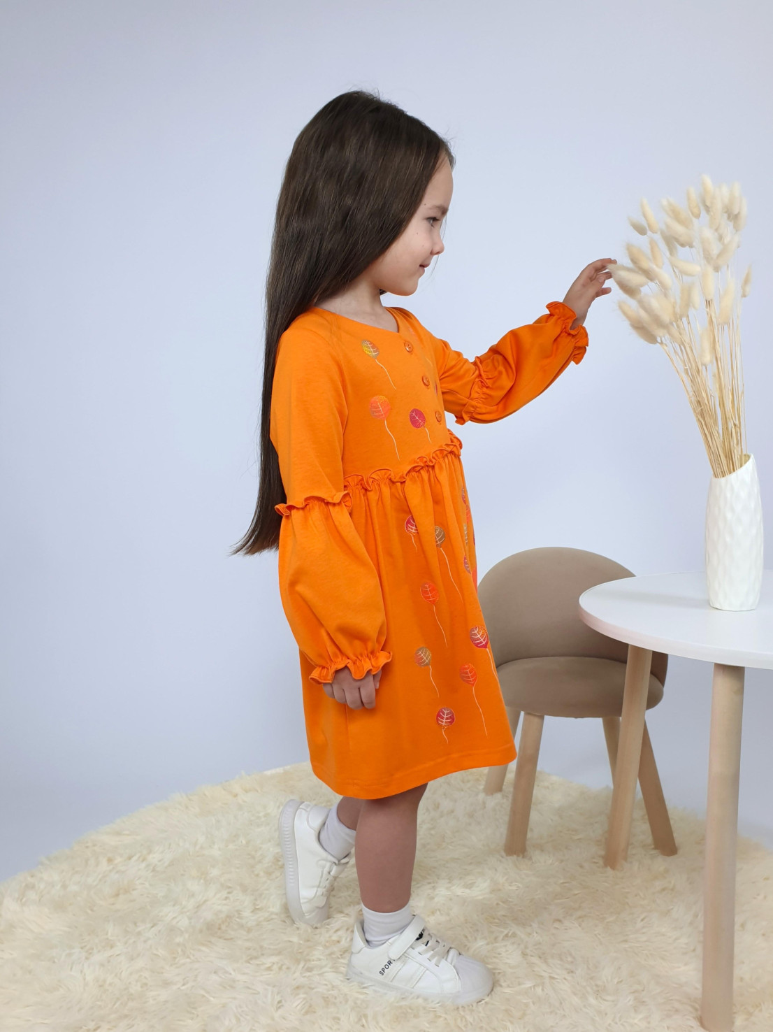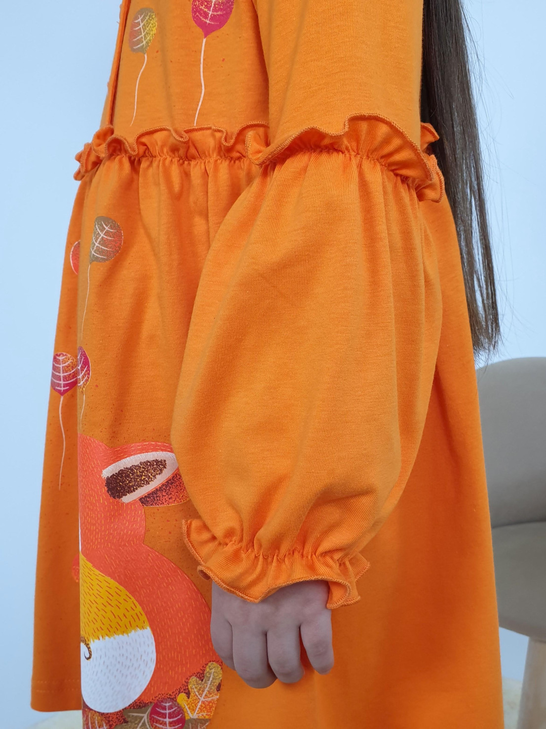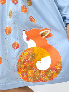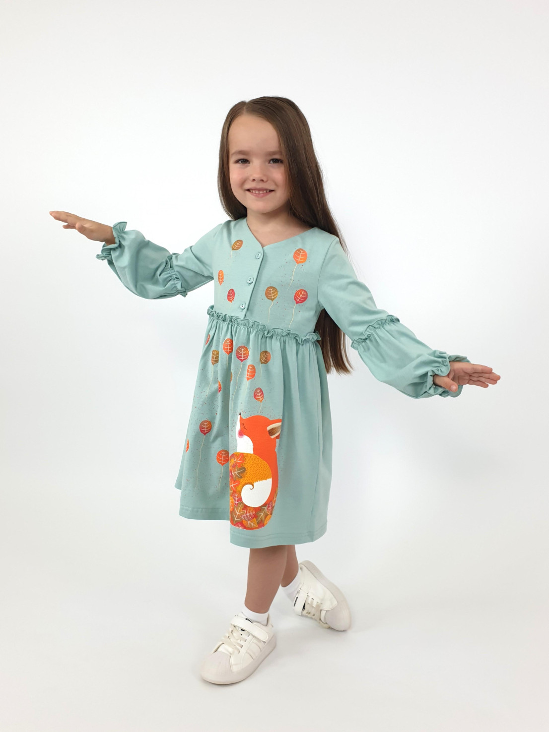 Кулирное полотно:100% х/б. Платье-силуэт трапеция,длинный втачной рукав,внизу на резинке(шпульная).Линия талии завышена,отрезная юбка.Срезы нижней части рукава и верх юбки со сборкой,обработанны спиральным швом.Печать на переде лифа и юбки.Горловина обработана обтачкой.Застежка по переду на пуговицы.
