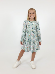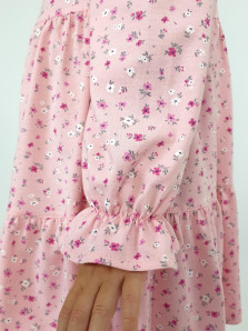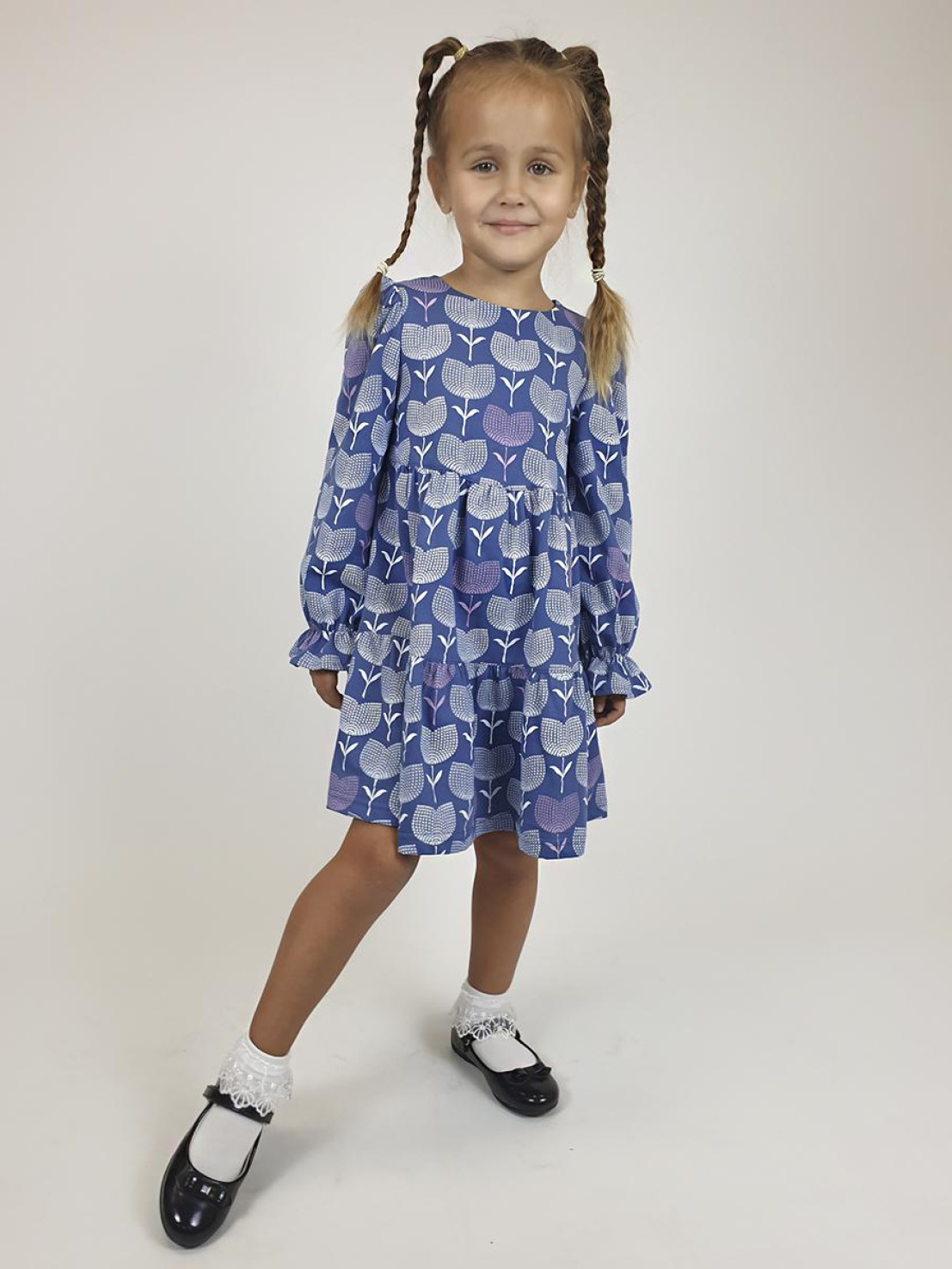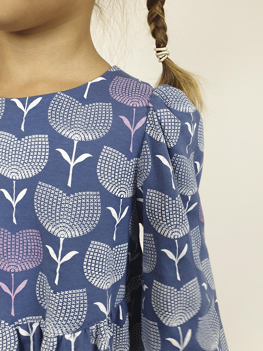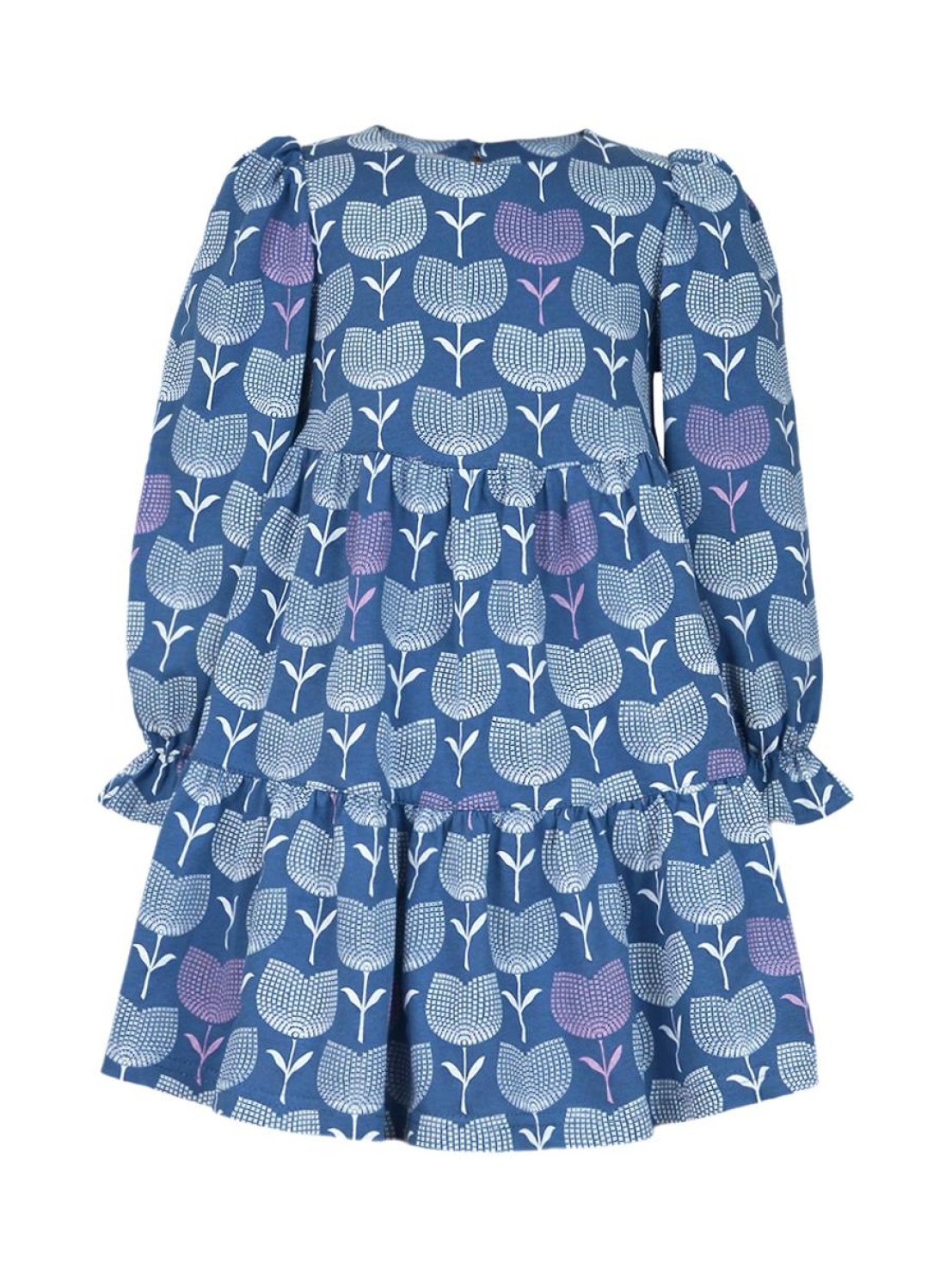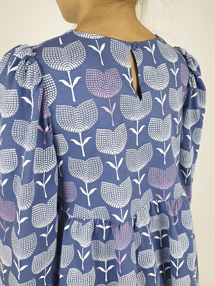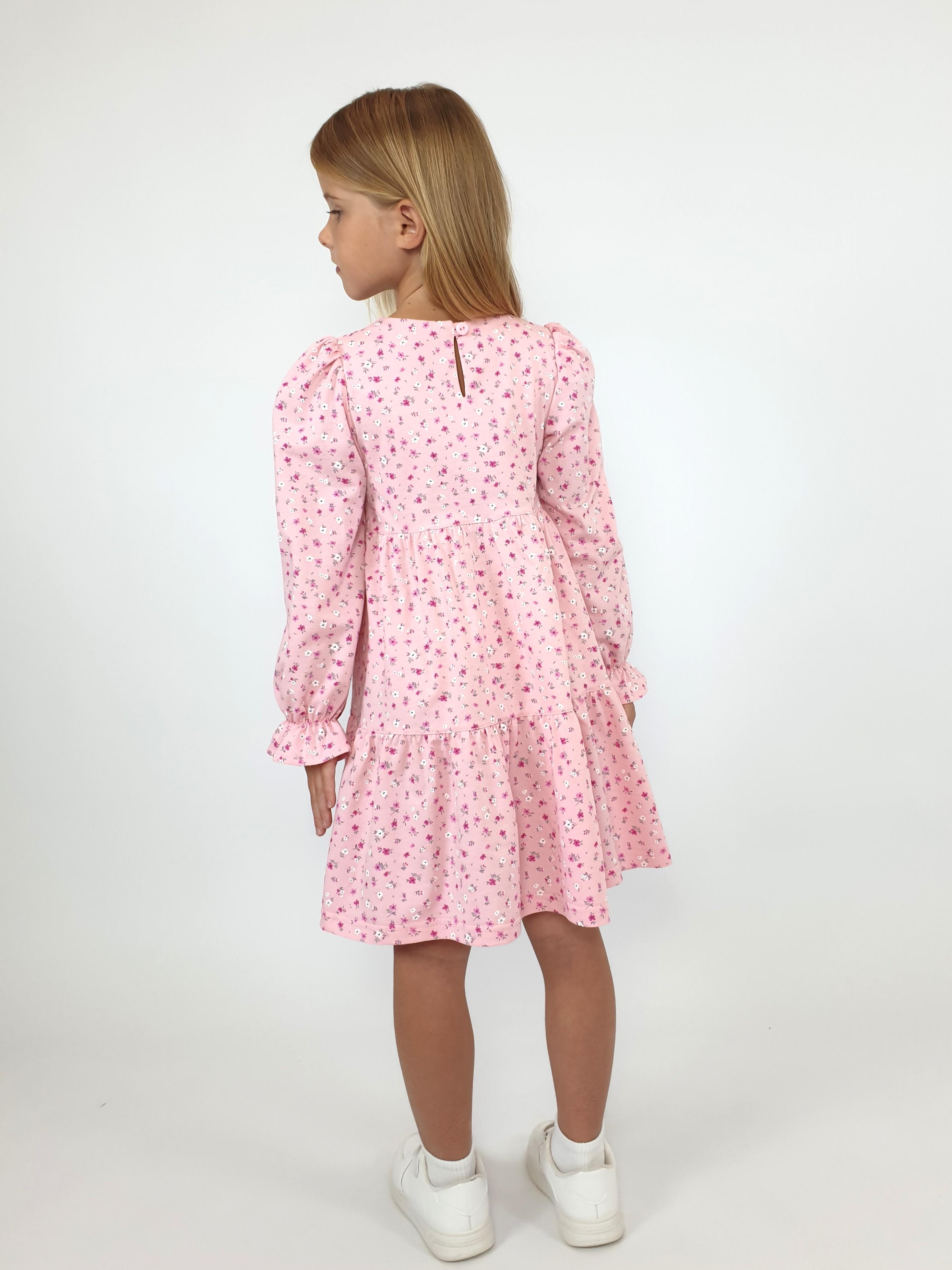 Кулирное полотно:100% х/б. Платье-силуэт трапеция,длинный втачной рукав сборка по окату,внизу собран на резинку.Юбка переда и спинки из двух воланов.Горловина обработана обтачкой,застежка на пуговицу по спинке.