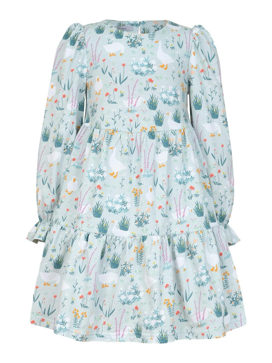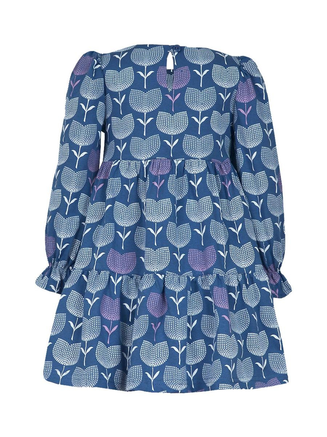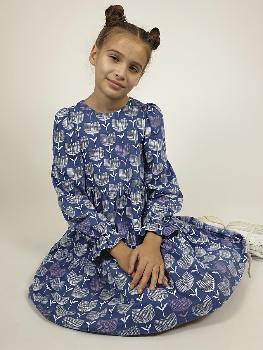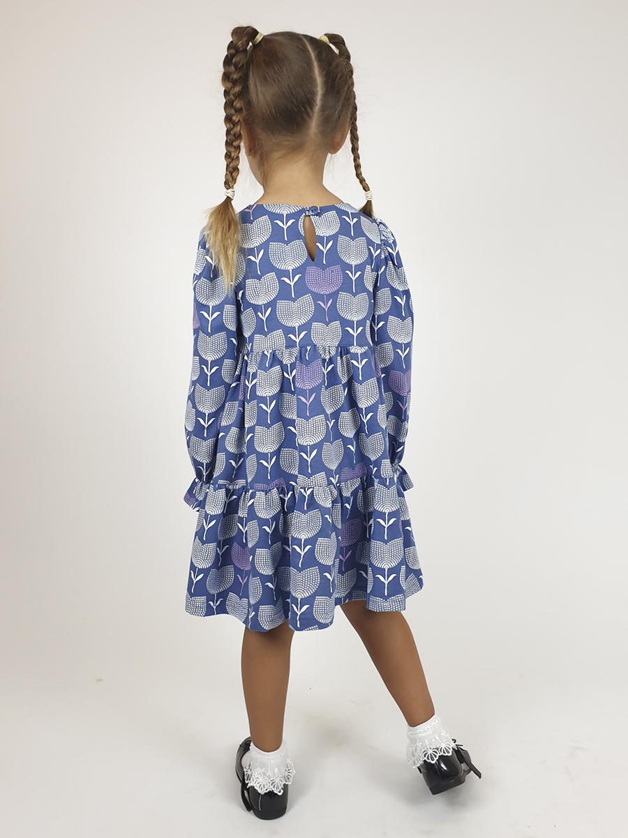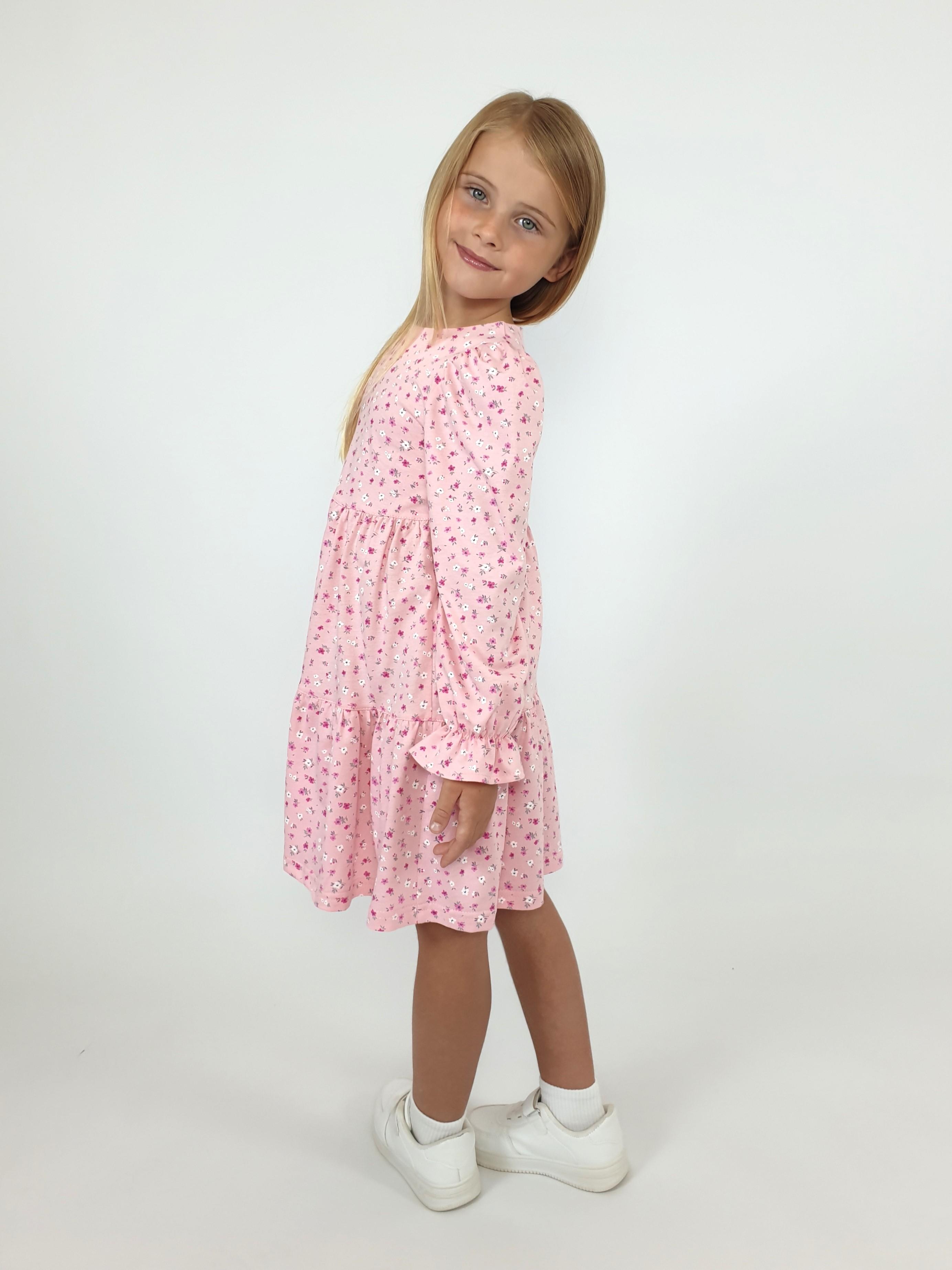 Кулирное полотно:100% х/б. Платье-силуэт трапеция,длинный втачной рукав сборка по окату,внизу собран на резинку.Юбка переда и спинки из двух воланов.Горловина обработана обтачкой,застежка на пуговицу по спинке.