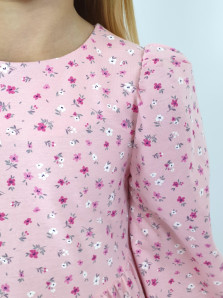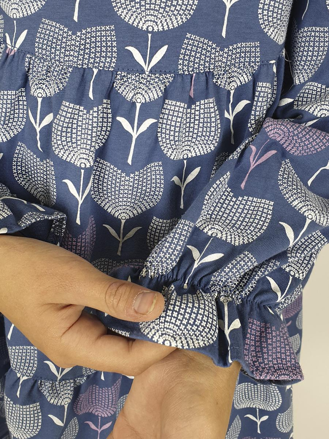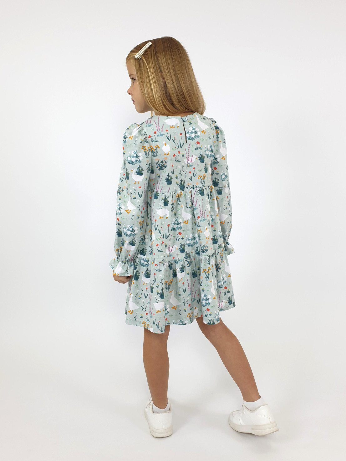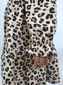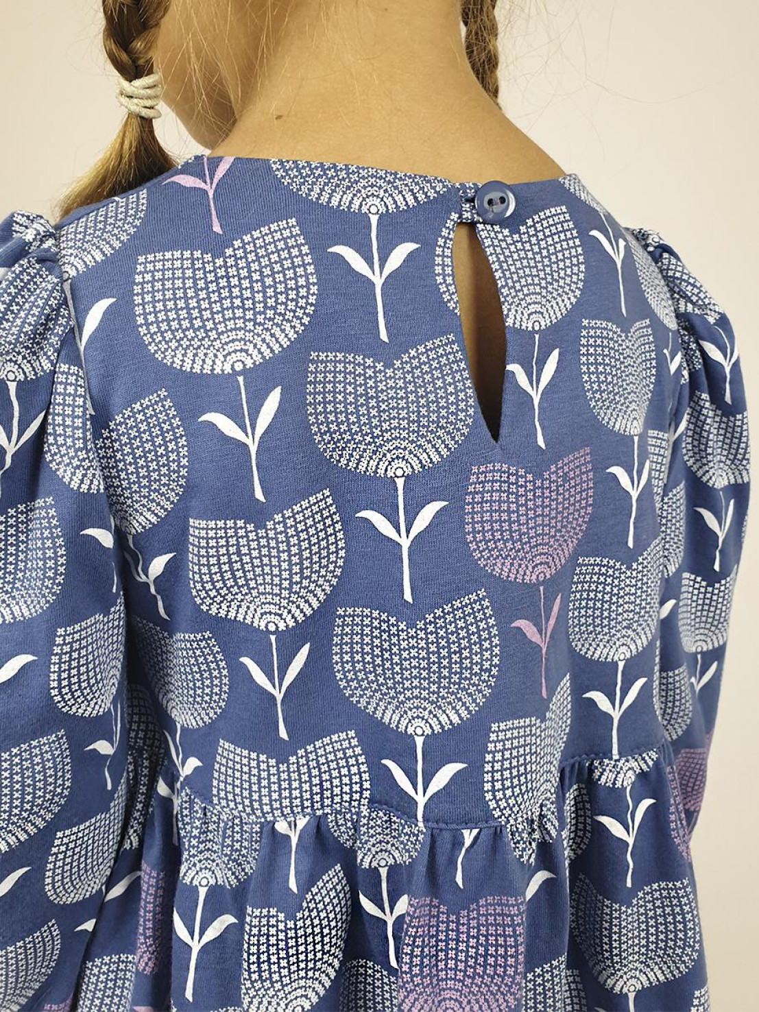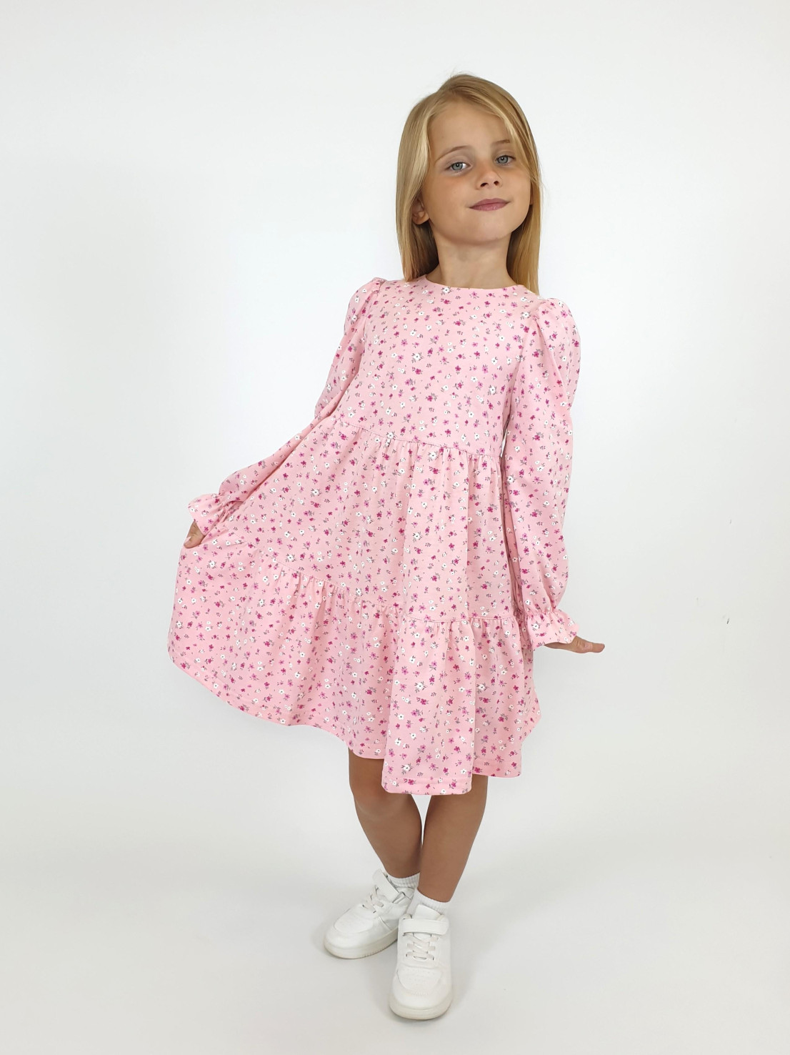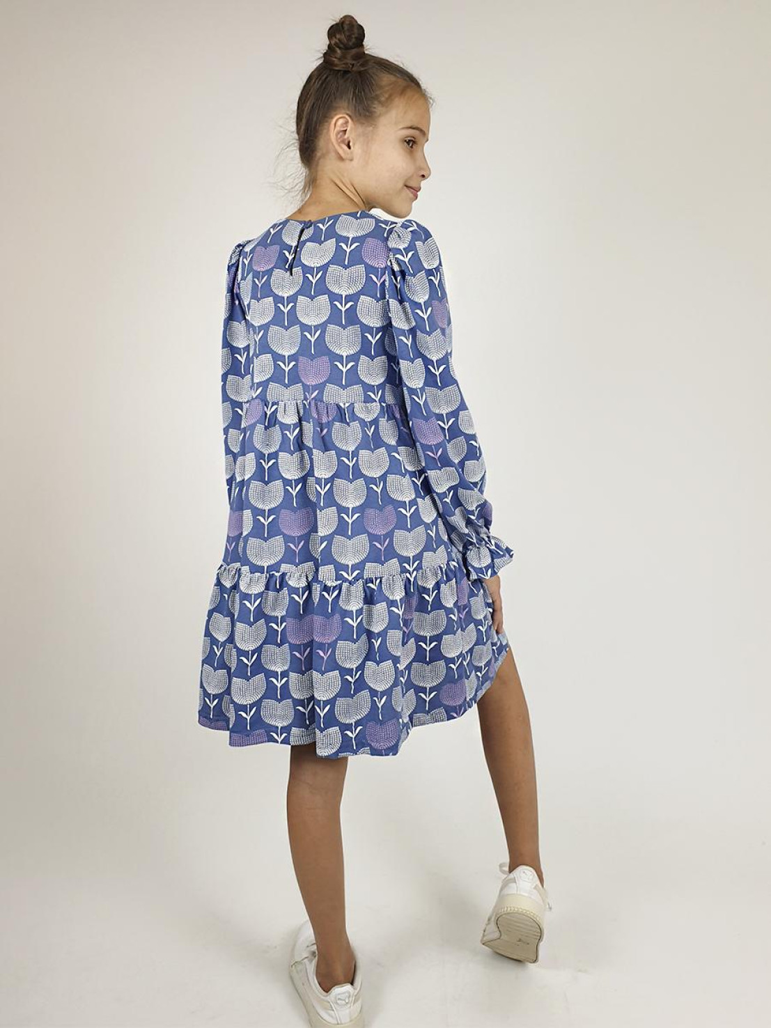 Кулирное полотно:100% х/б. Платье-силуэт трапеция,длинный втачной рукав сборка по окату,внизу собран на резинку.Юбка переда и спинки из двух воланов.Горловина обработана обтачкой,застежка на пуговицу по спинке.