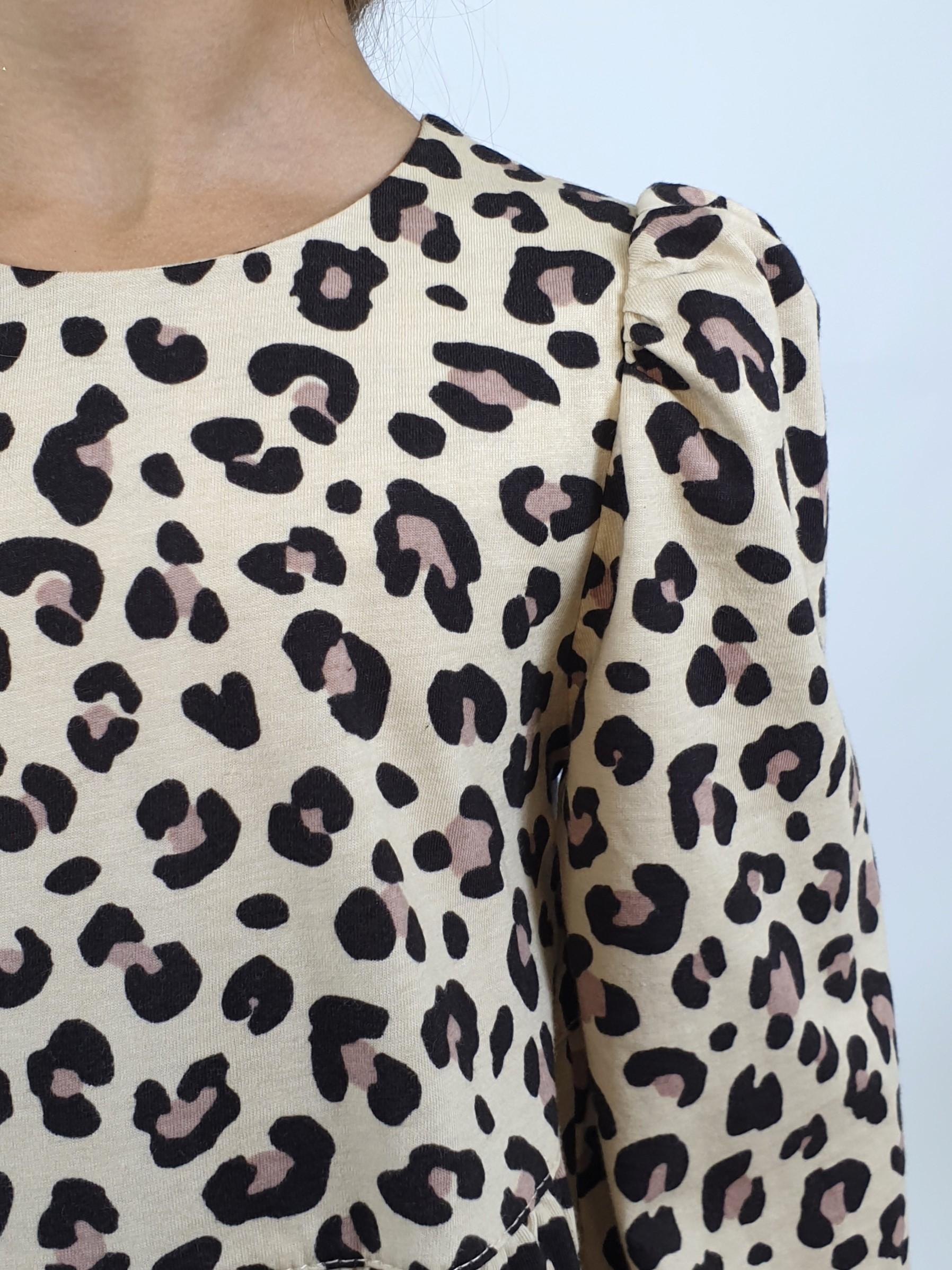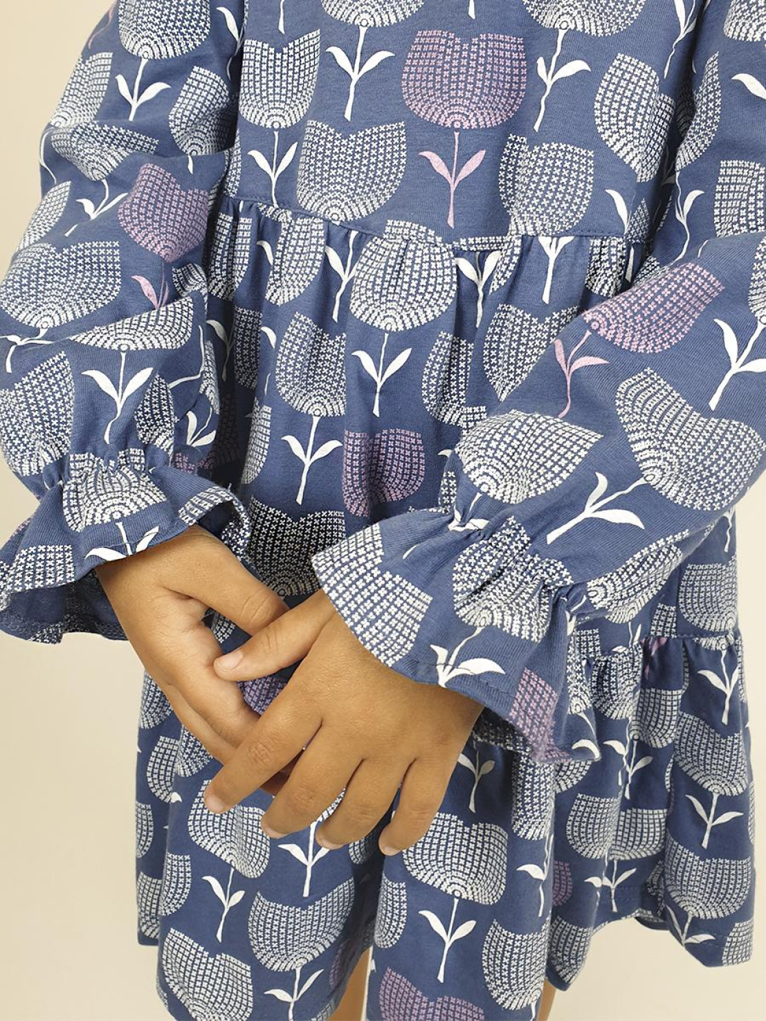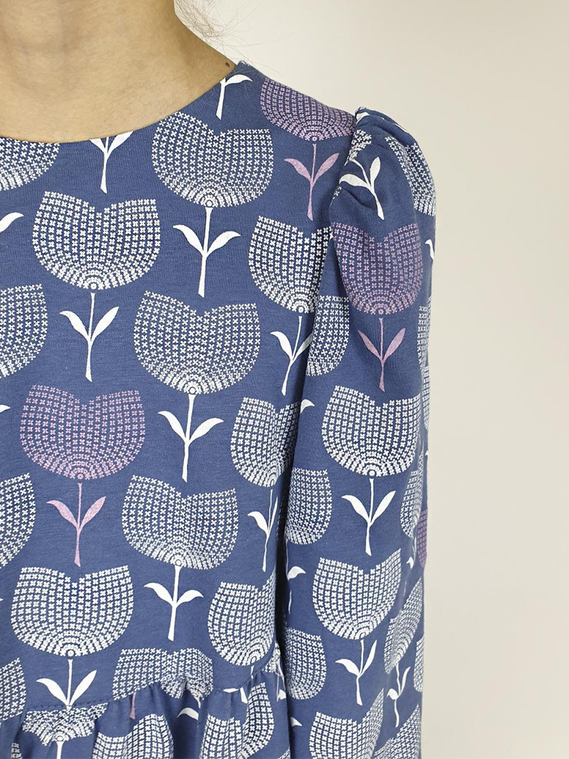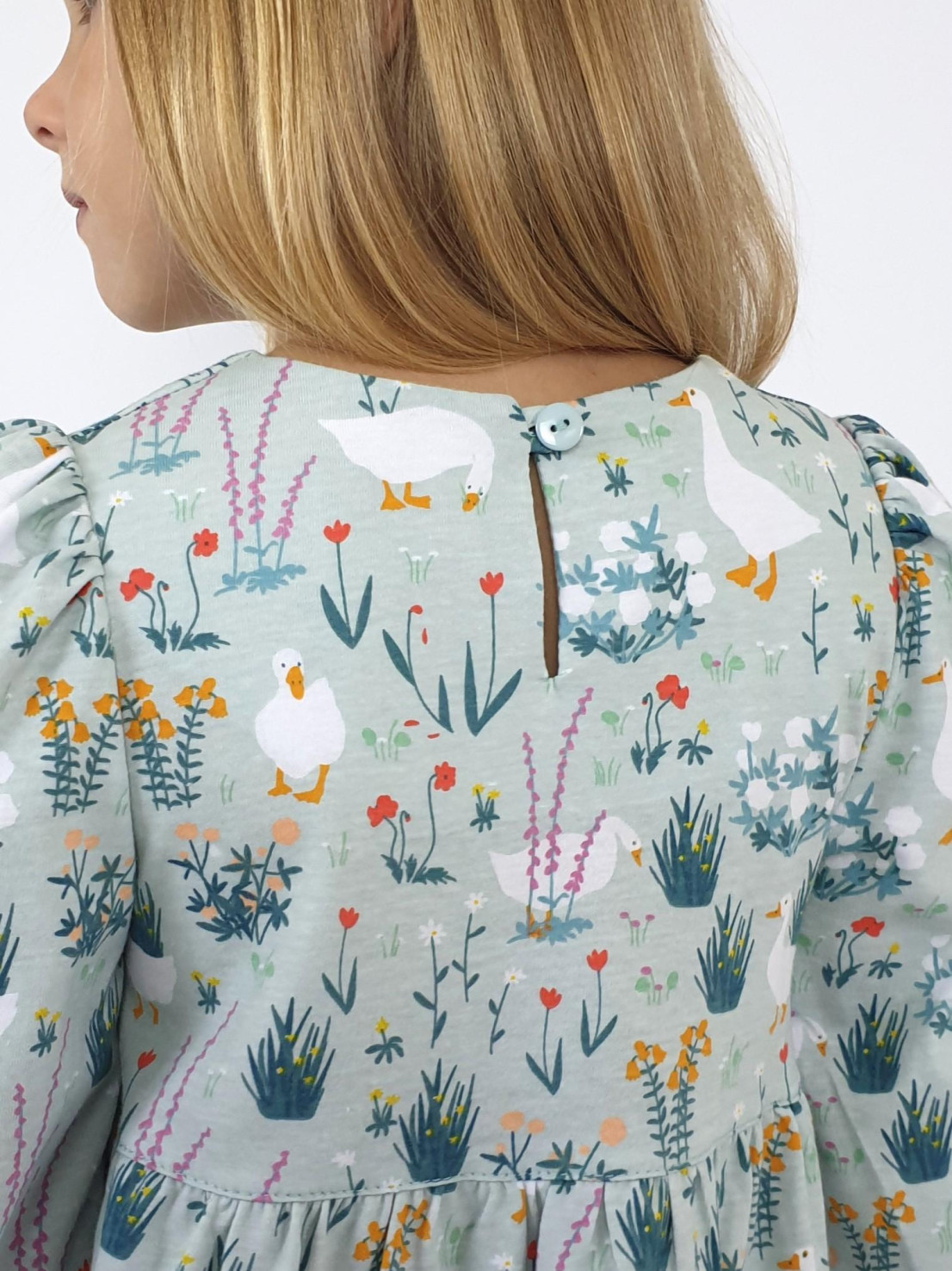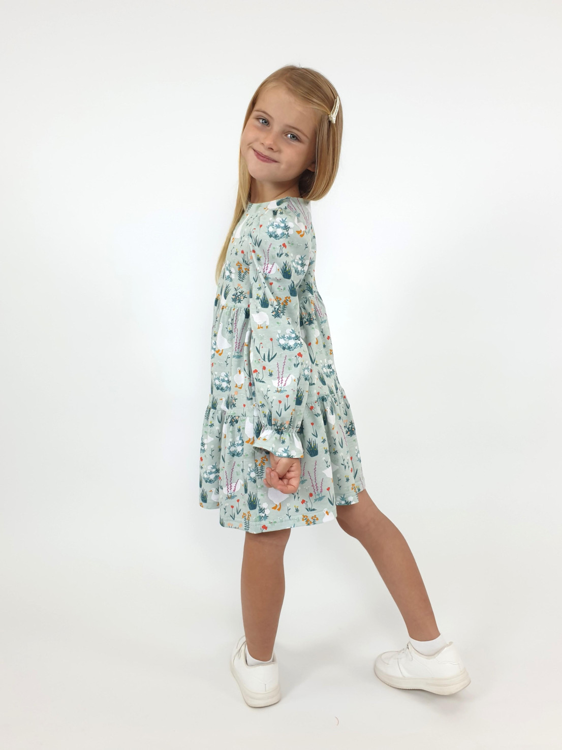 Кулирное полотно:100% х/б. Платье-силуэт трапеция,длинный втачной рукав сборка по окату,внизу собран на резинку.Юбка переда и спинки из двух воланов.Горловина обработана обтачкой,застежка на пуговицу по спинке.