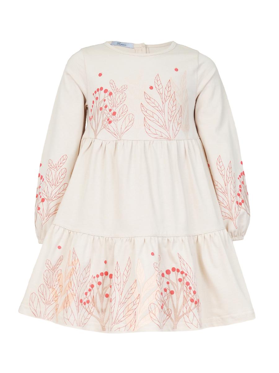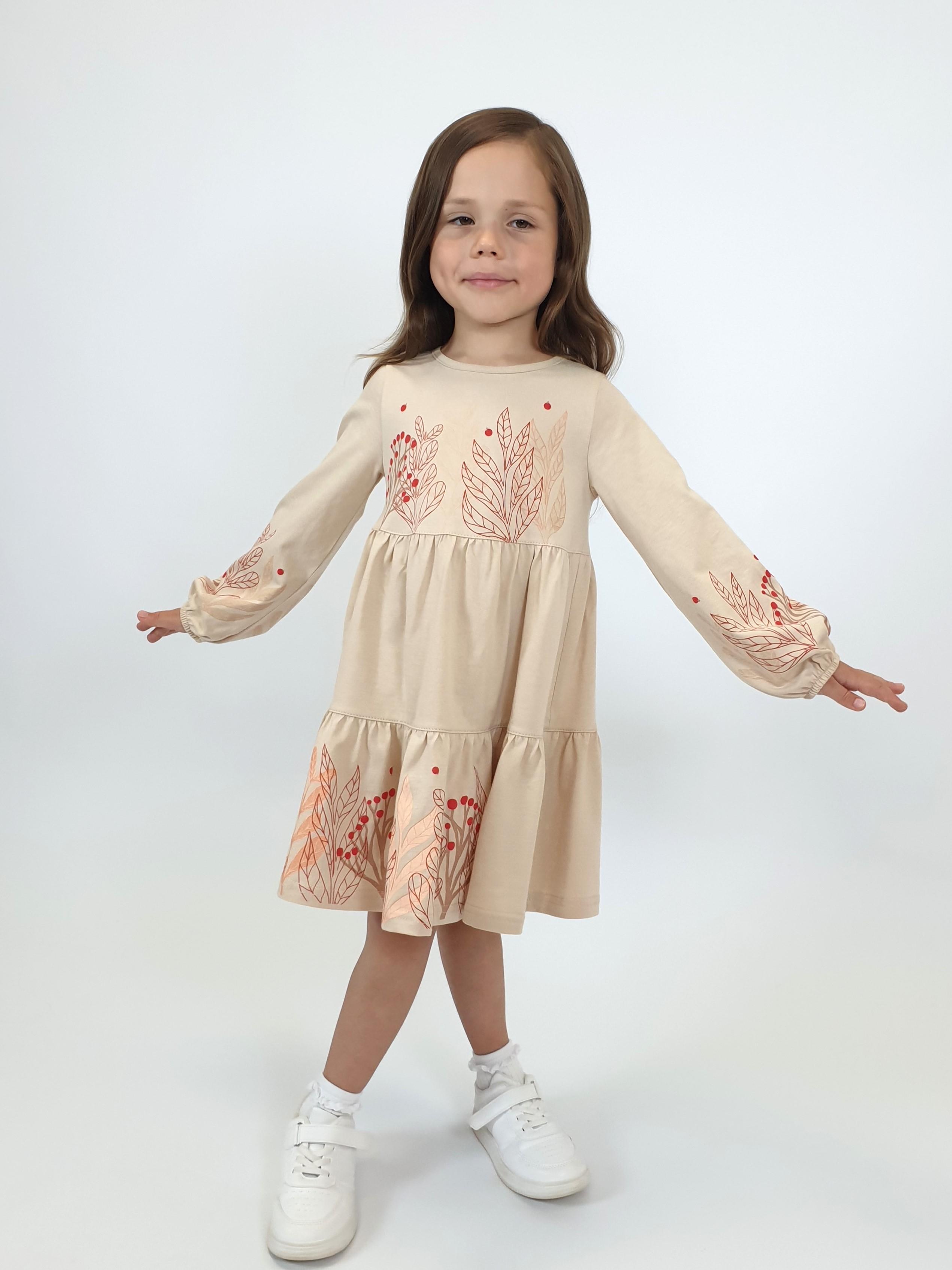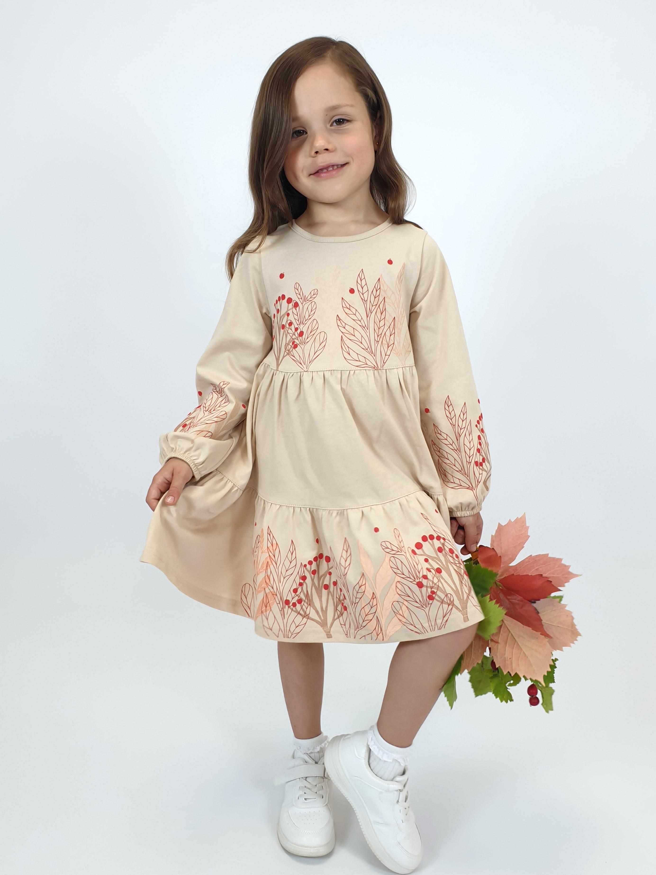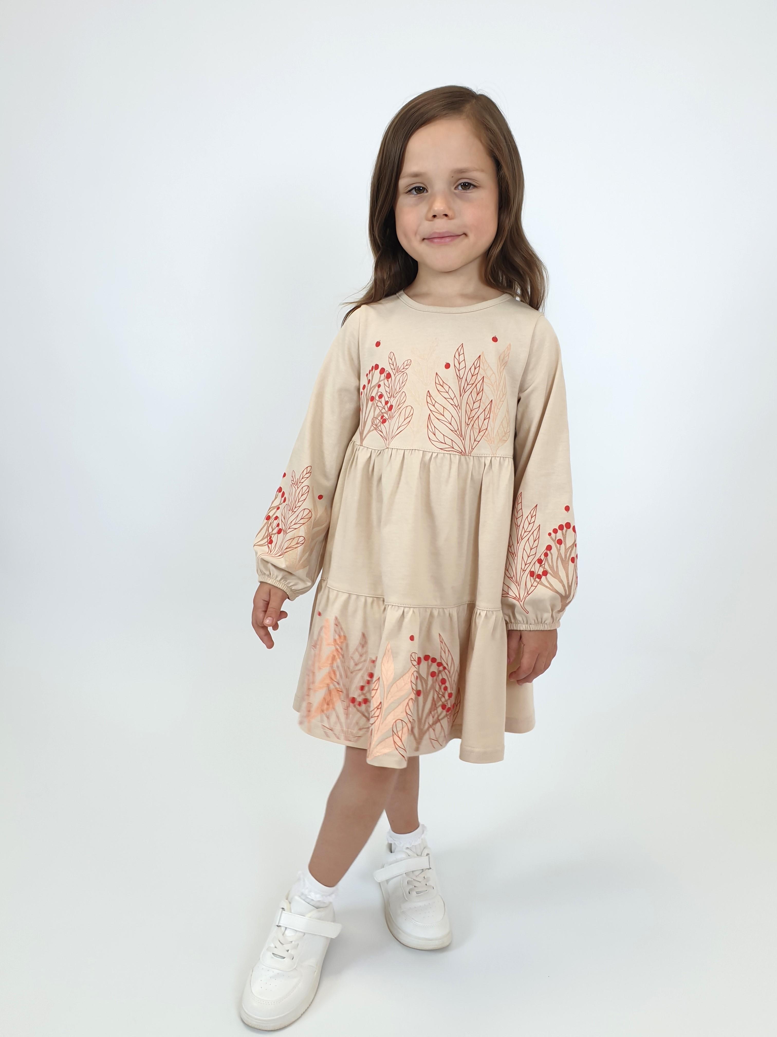 Кулирное полотно:100% х/б. Платье-силуэт трапеция,длинный втачной рукав,внизу собран на резинку.Юбка переда и спинки из двух воланов.Горловина окантована,застежка на пуговицы по спинке.Печать на переде кокетки,на нижнем волане и на рукавах.