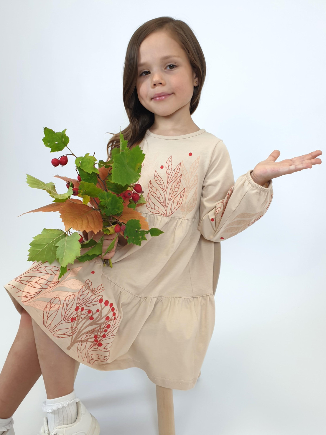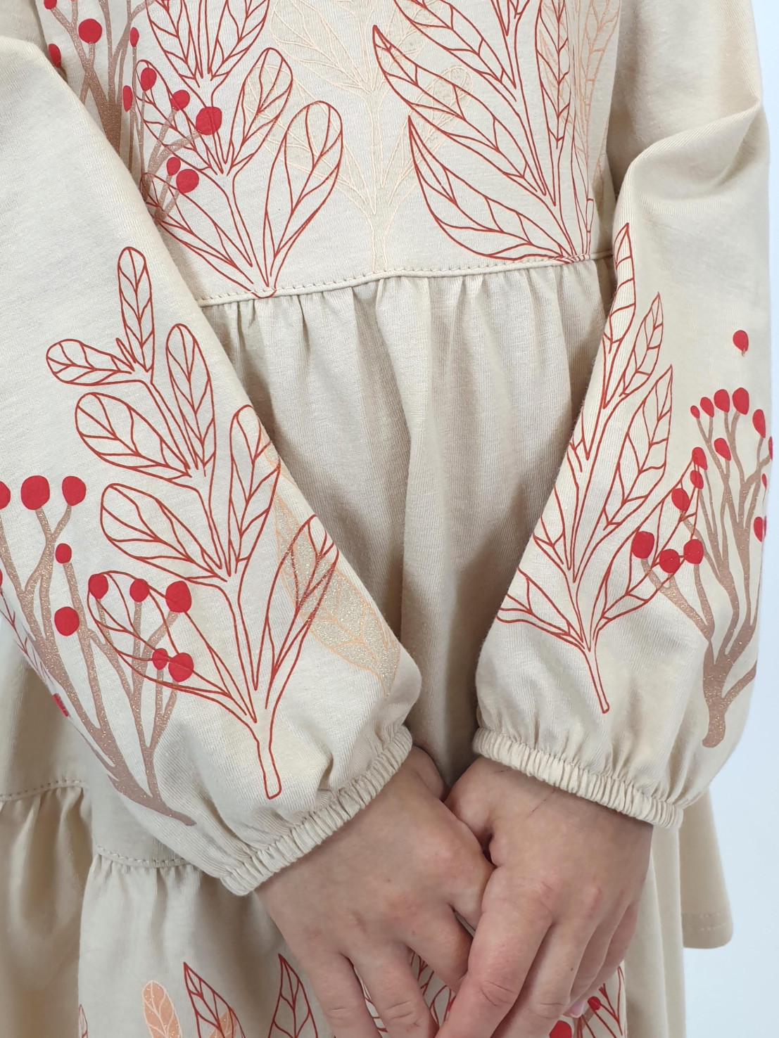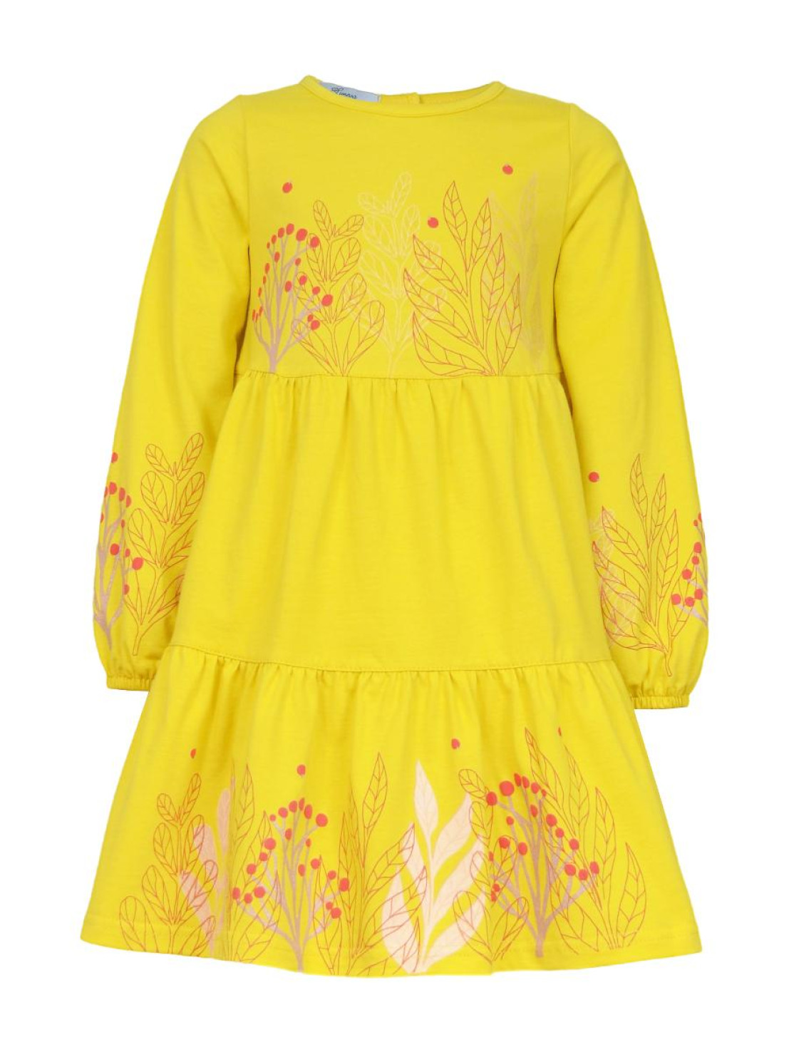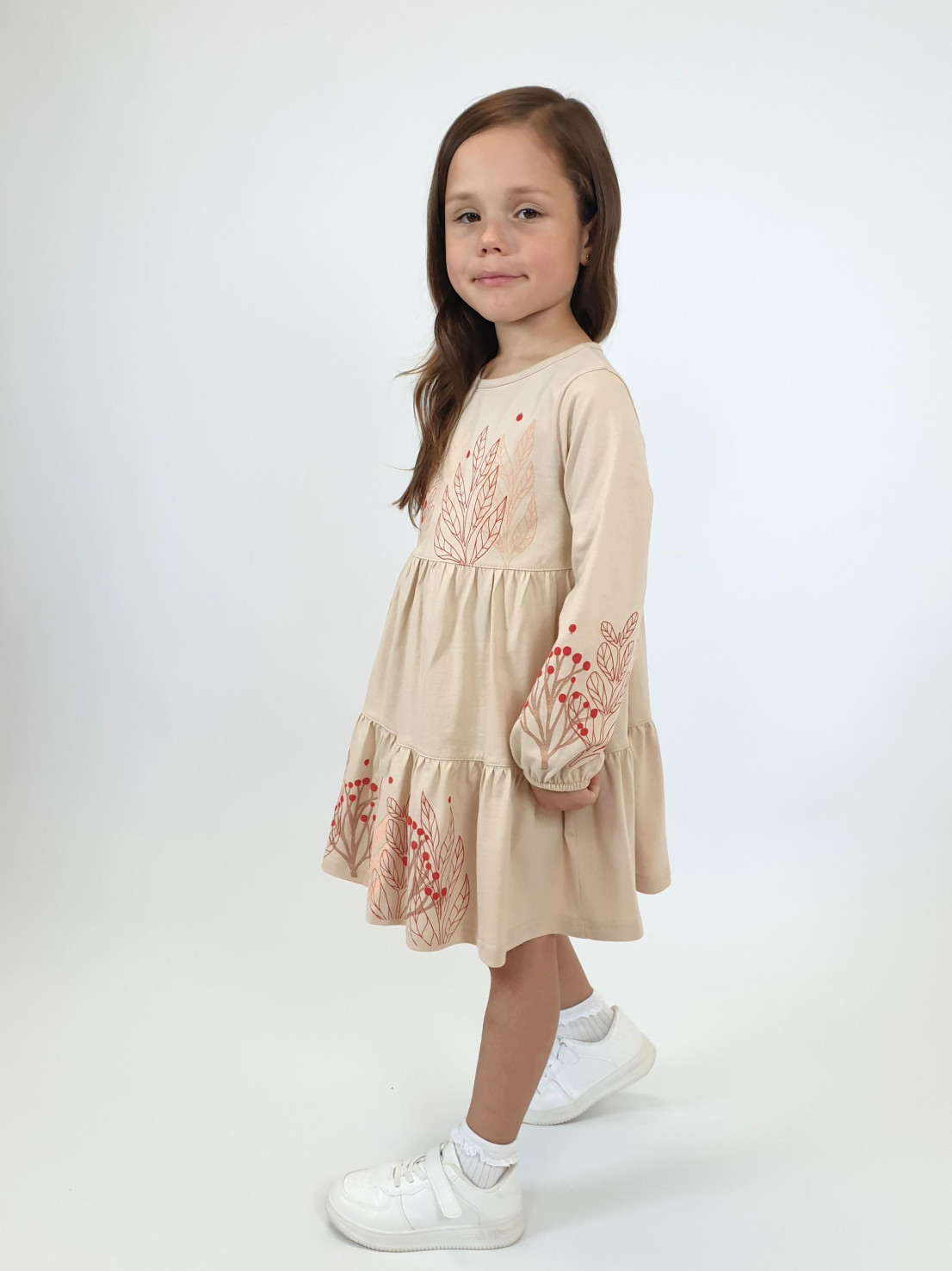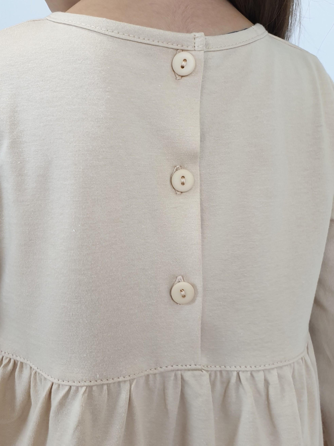 Кулирное полотно:100% х/б. Платье-силуэт трапеция,длинный втачной рукав,внизу собран на резинку.Юбка переда и спинки из двух воланов.Горловина окантована,застежка на пуговицы по спинке.Печать на переде кокетки,на нижнем волане и на рукавах.