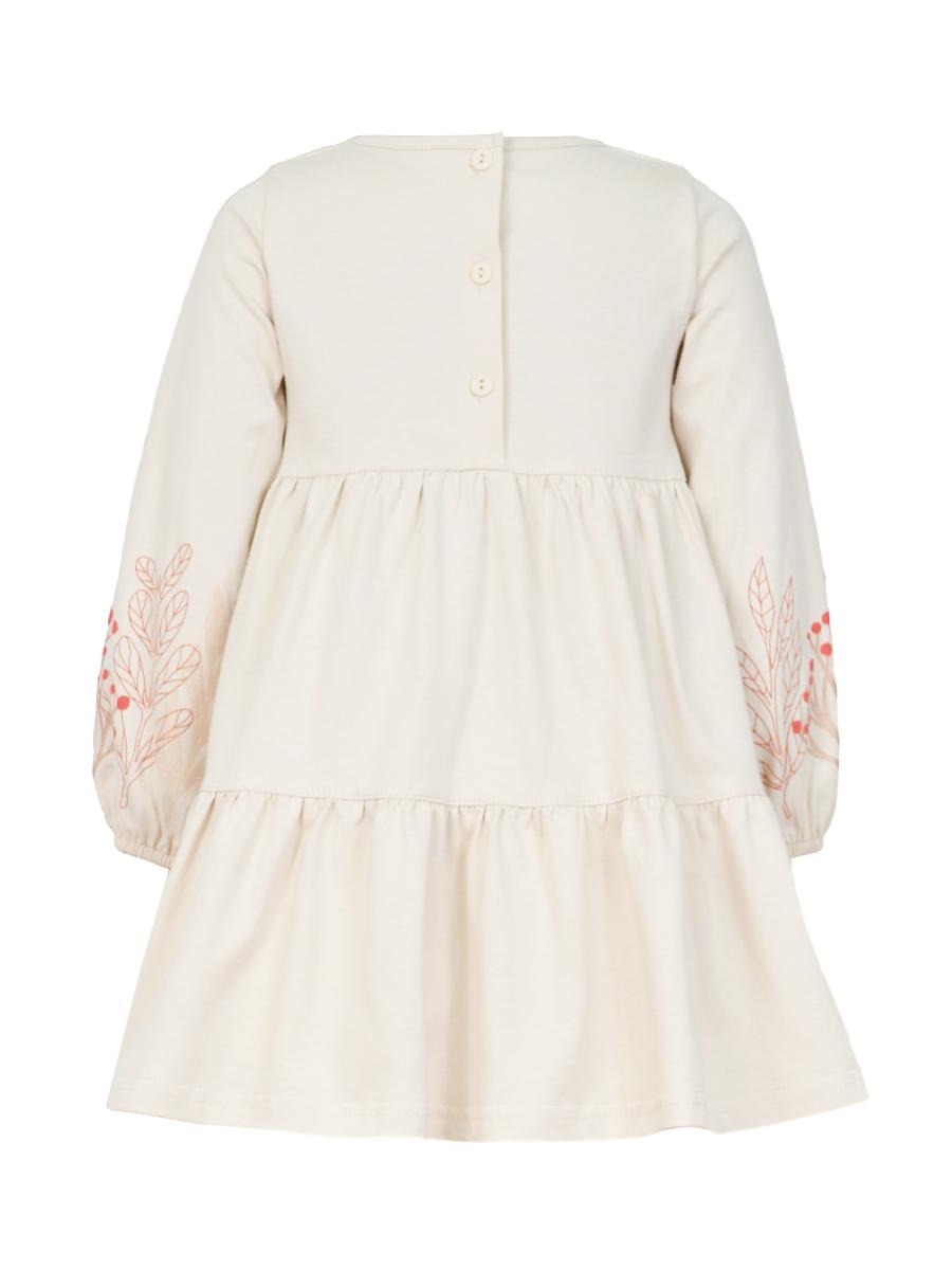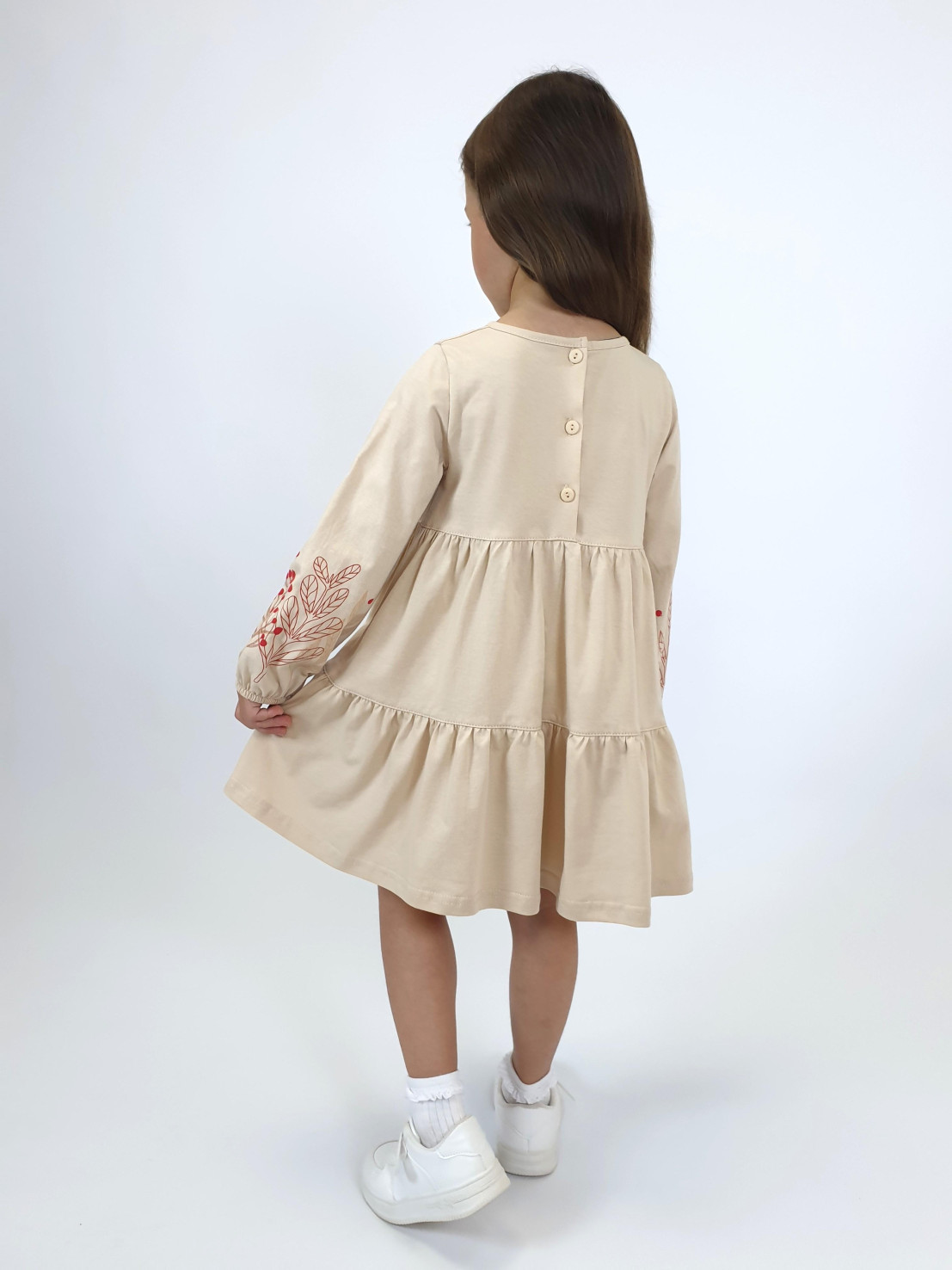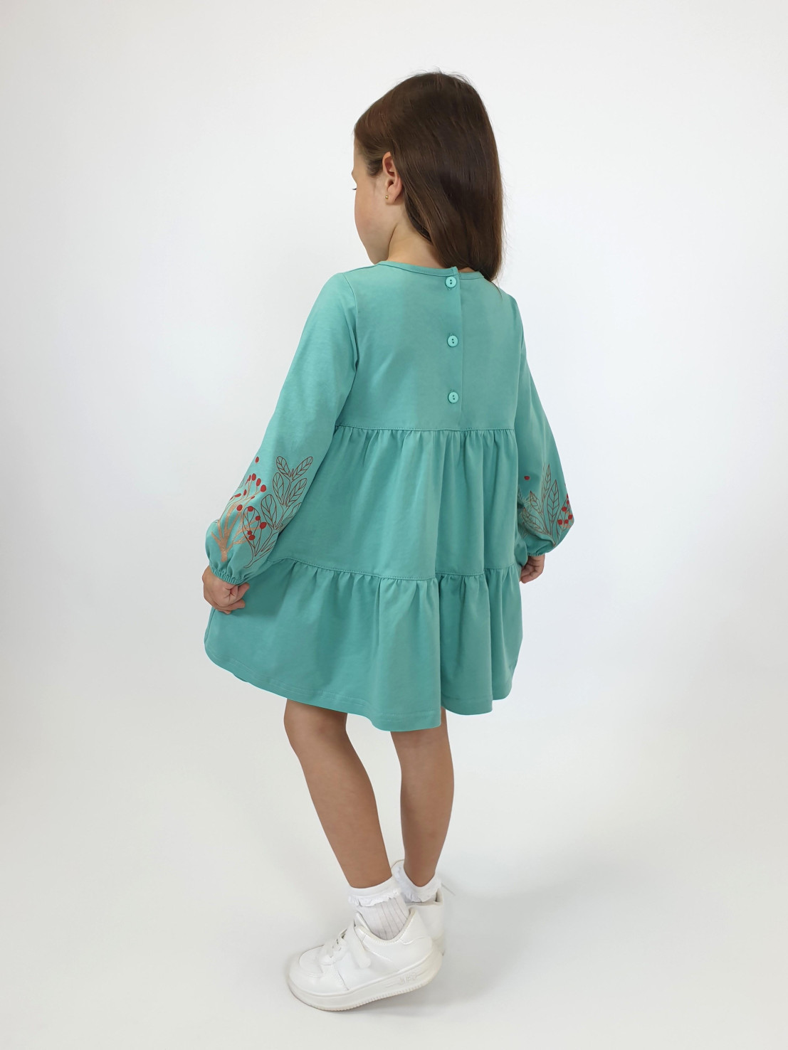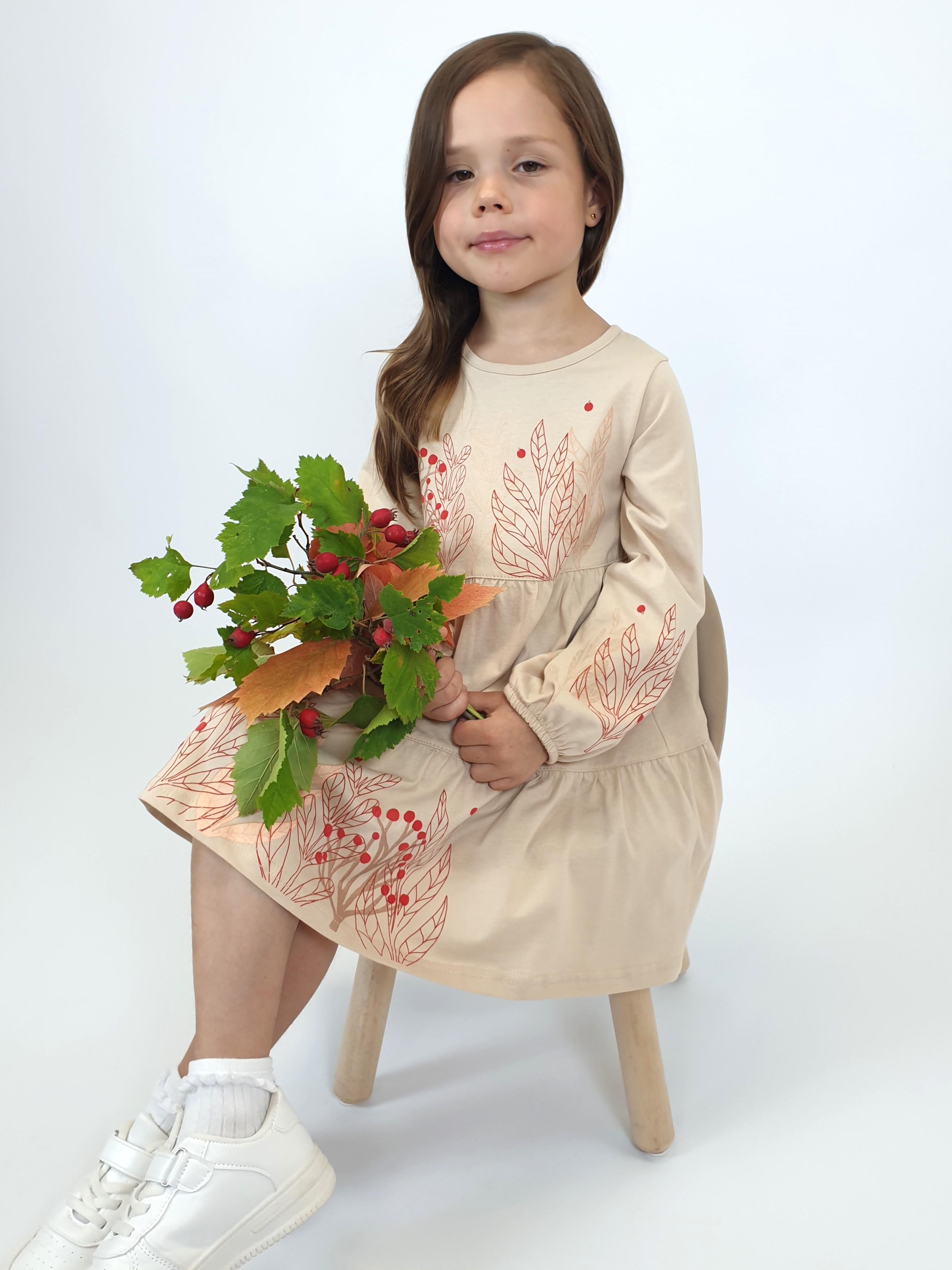 Кулирное полотно:100% х/б. Платье-силуэт трапеция,длинный втачной рукав,внизу собран на резинку.Юбка переда и спинки из двух воланов.Горловина окантована,застежка на пуговицы по спинке.Печать на переде кокетки,на нижнем волане и на рукавах.