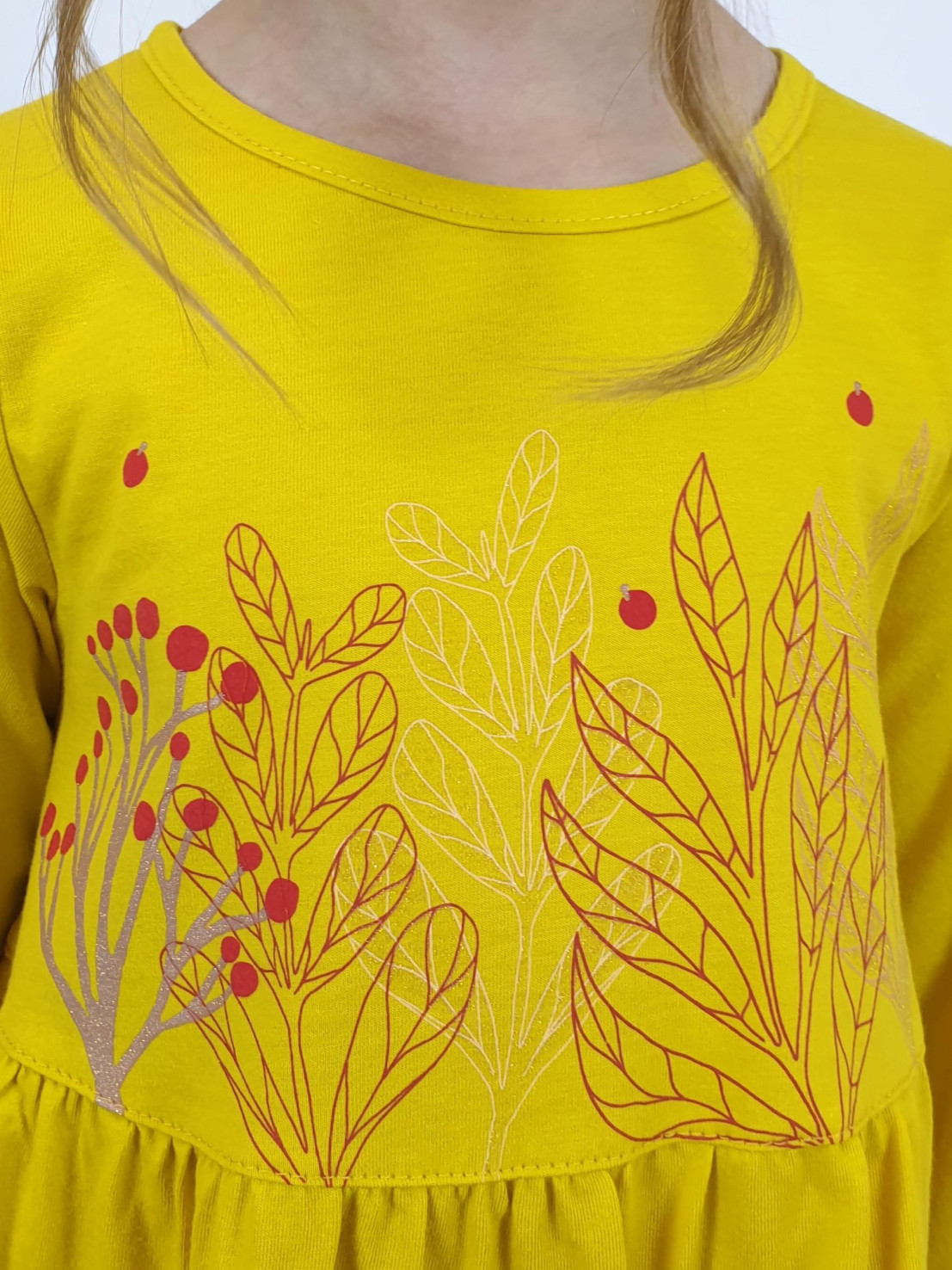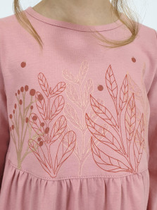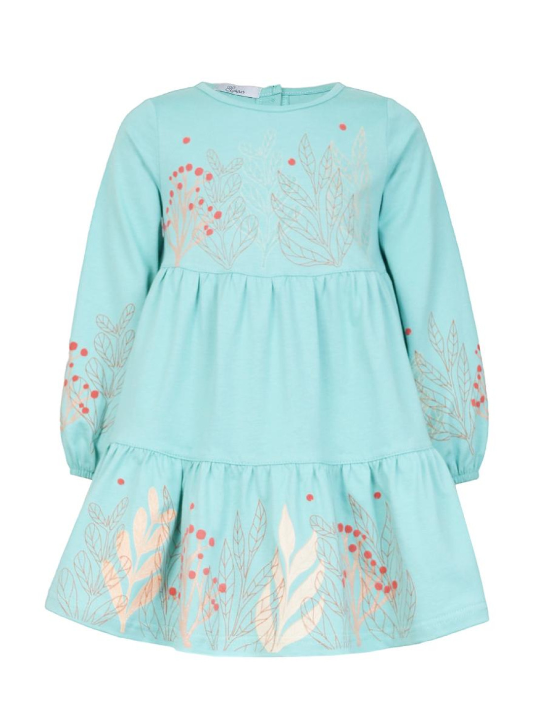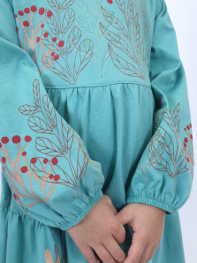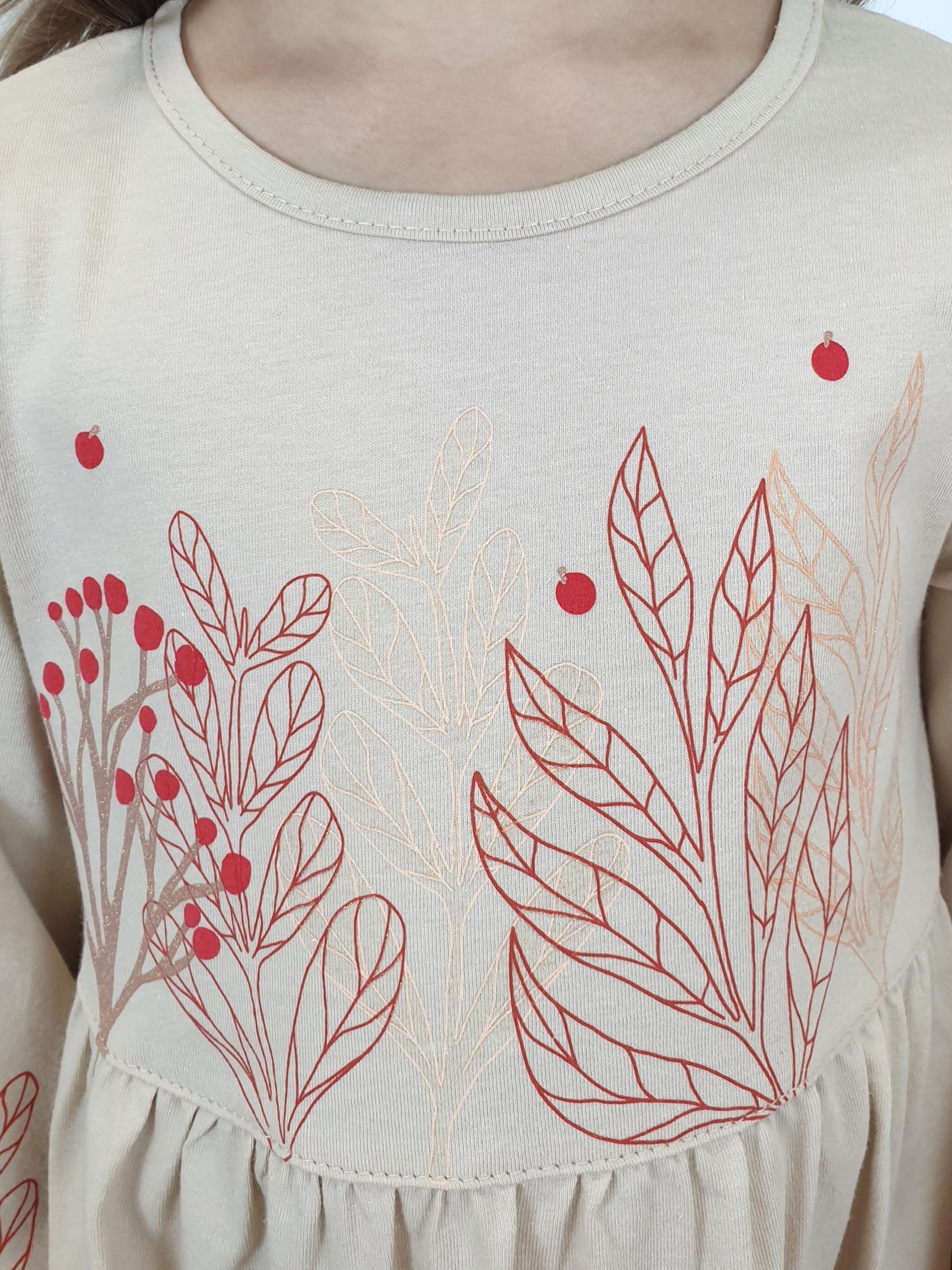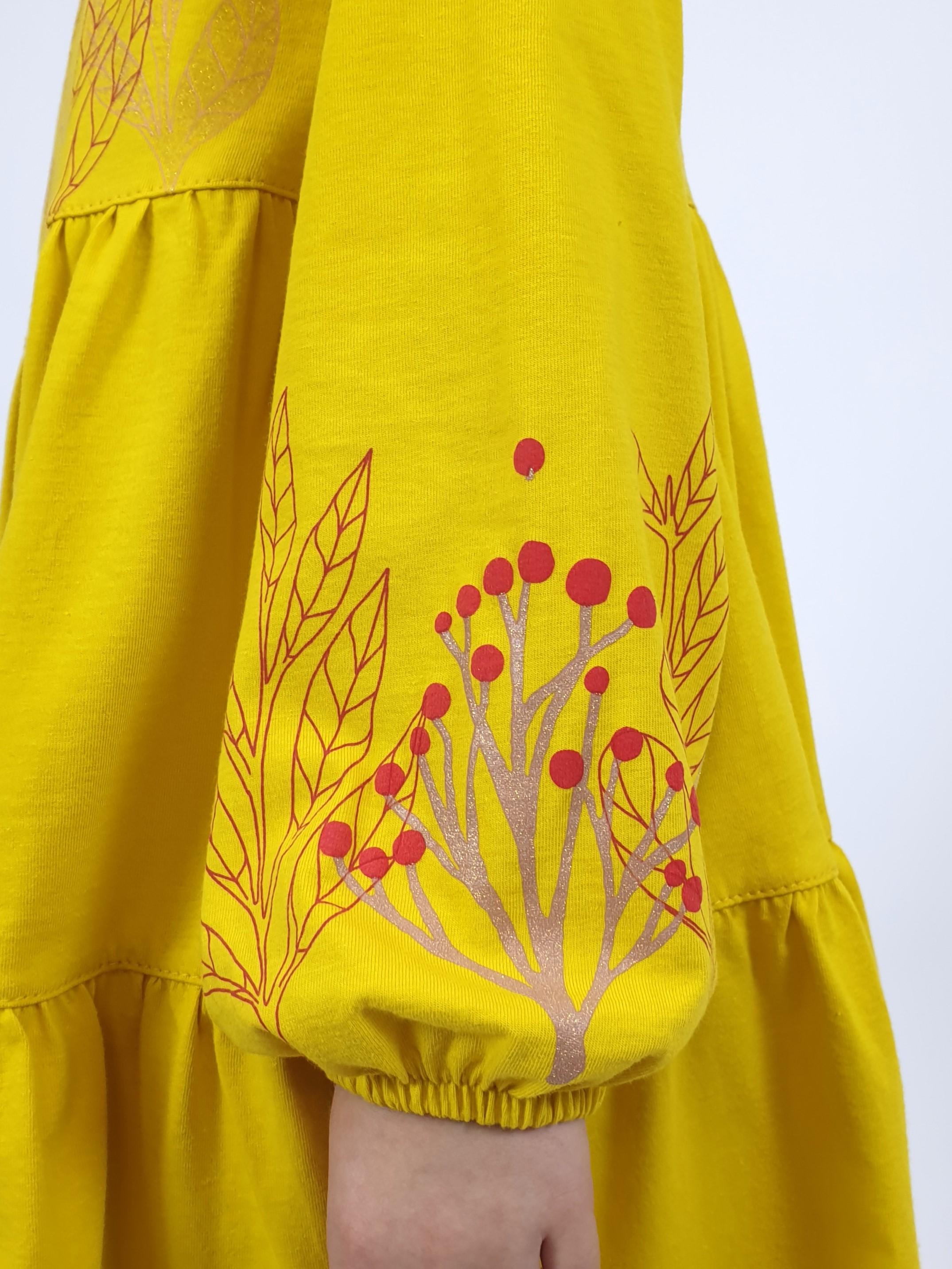 Кулирное полотно:100% х/б. Платье-силуэт трапеция,длинный втачной рукав,внизу собран на резинку.Юбка переда и спинки из двух воланов.Горловина окантована,застежка на пуговицы по спинке.Печать на переде кокетки,на нижнем волане и на рукавах.