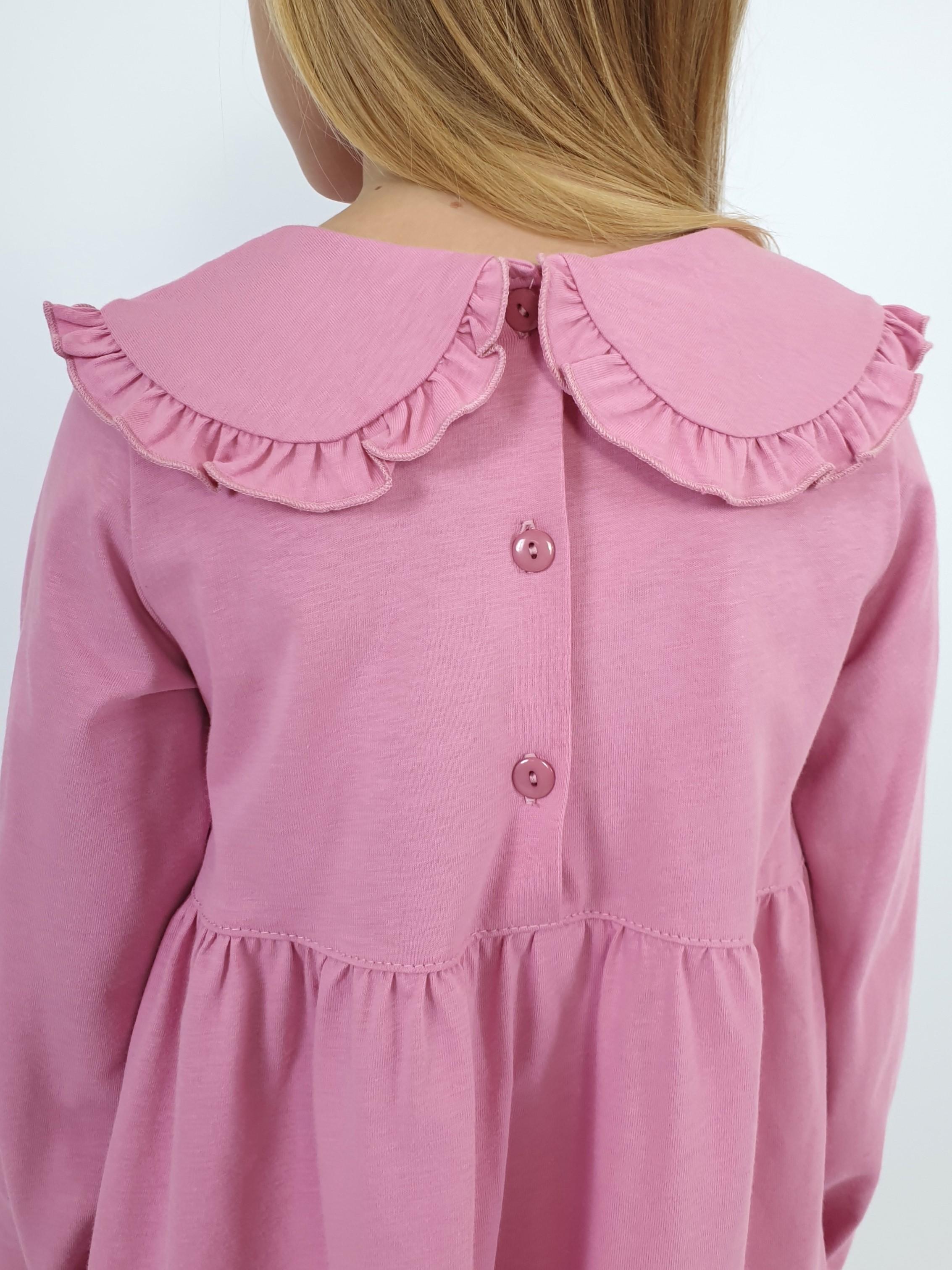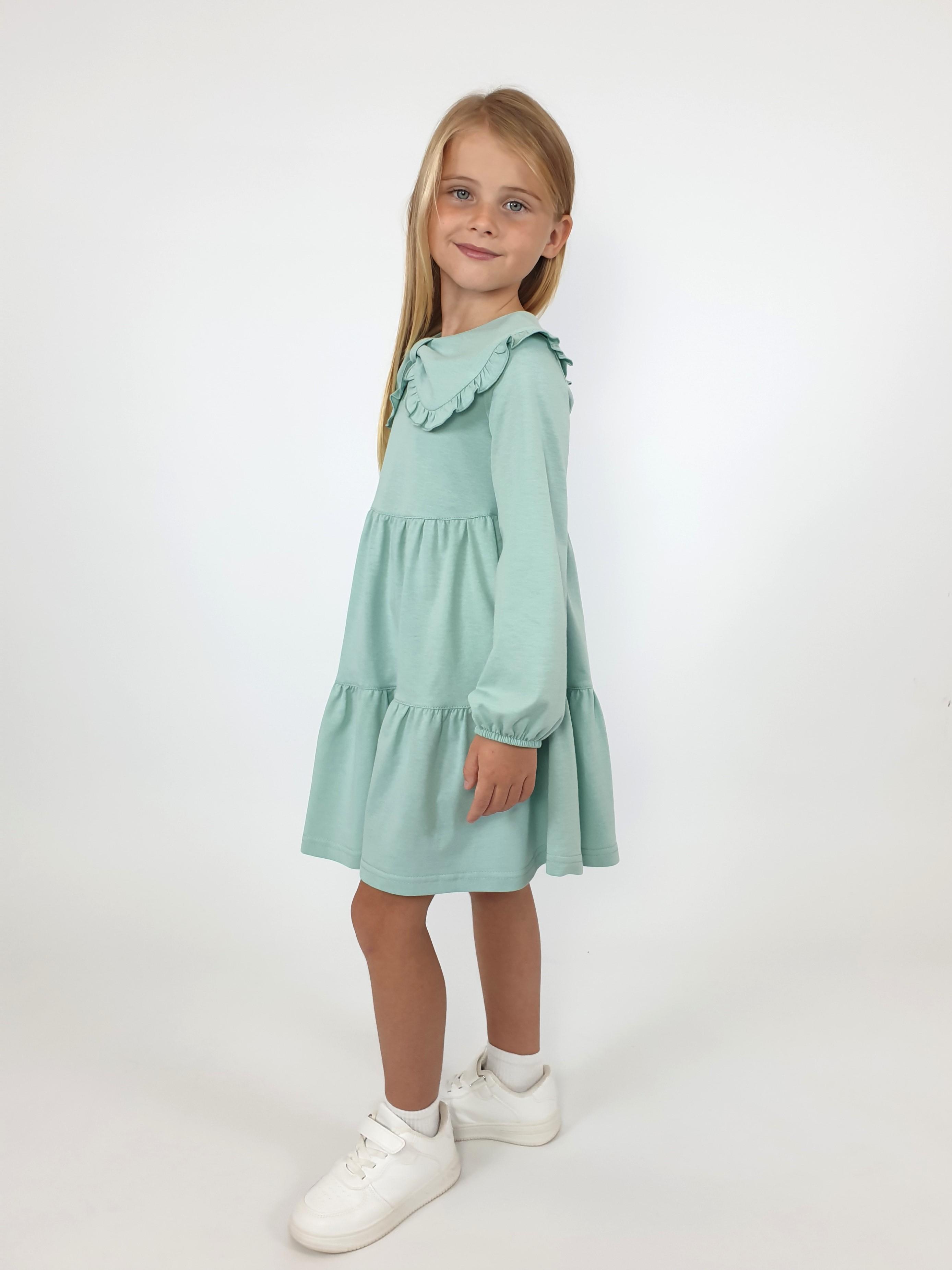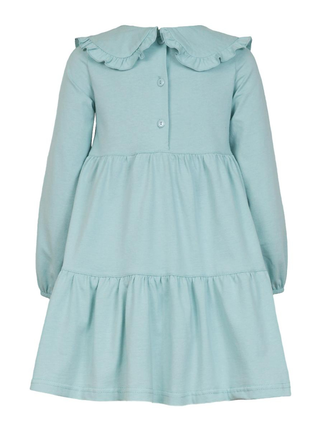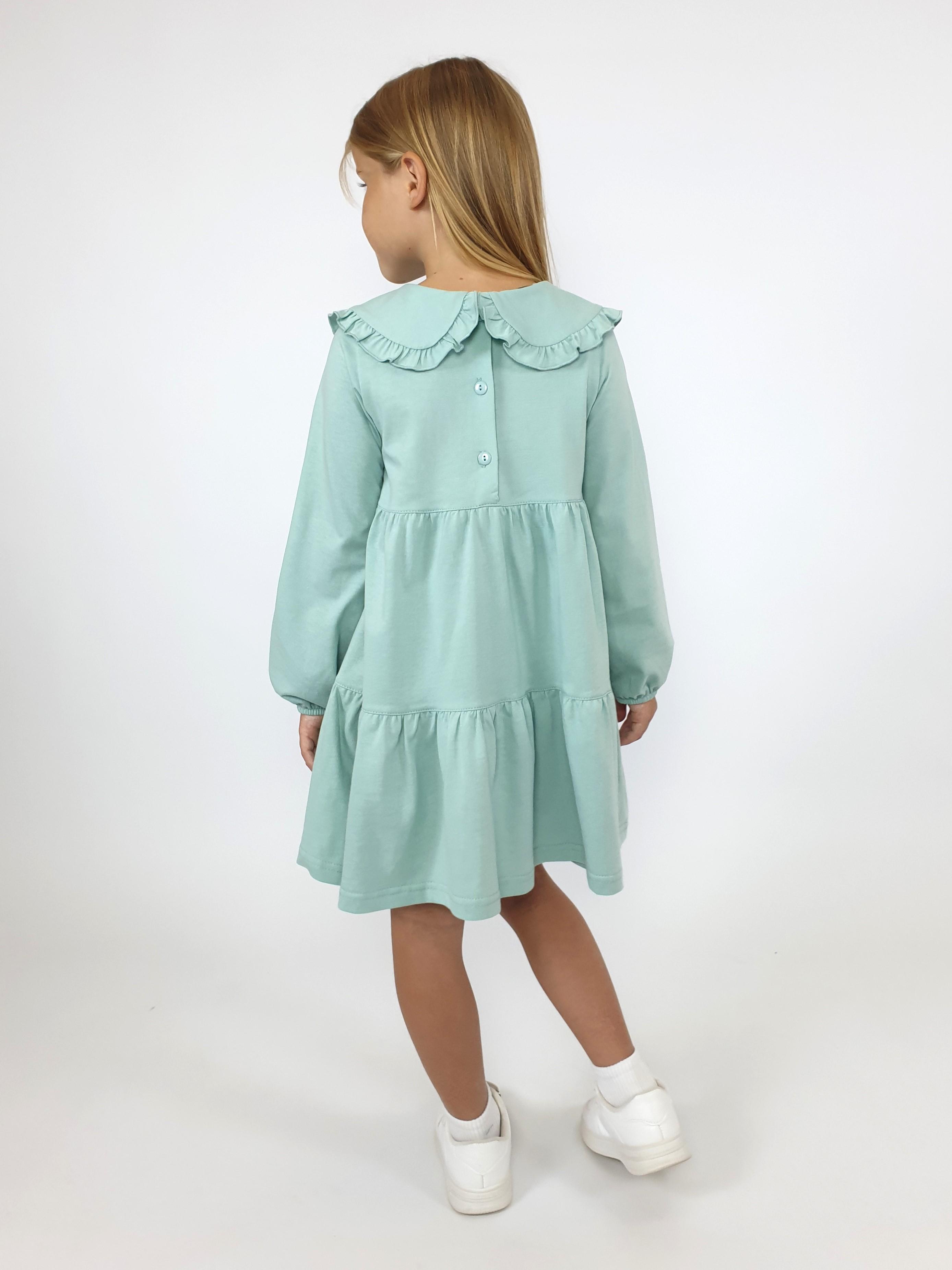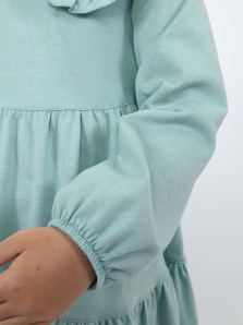 Кулирное полотно:100% х/б. Платье-силуэт трапеция,длинный втачной рукав,внизу собран на резинку.Юбка переда и спинки из двух воланов.В горловине плоско-лежащий воротник с рюшей.Застежка на пуговицы по спинке.