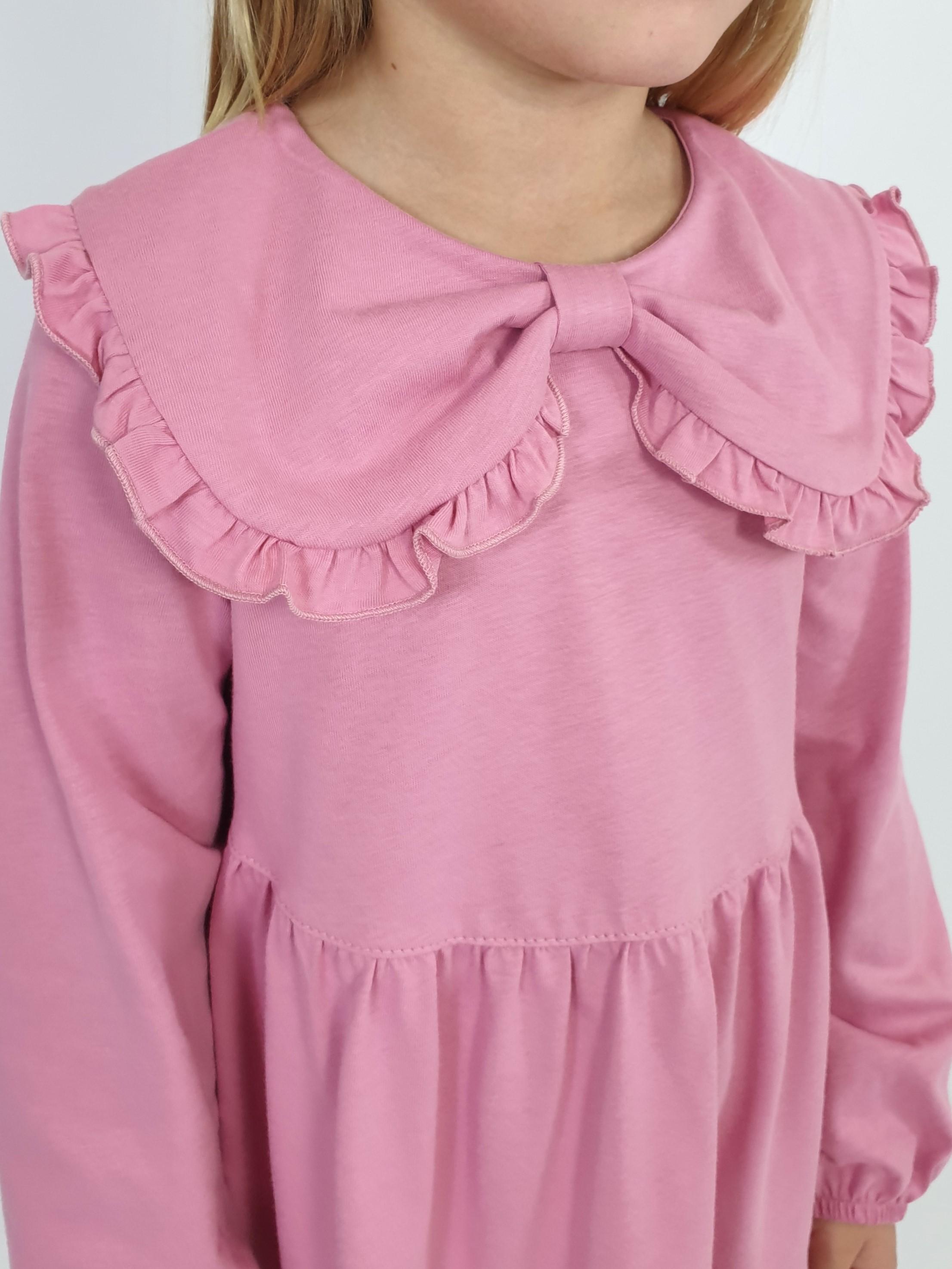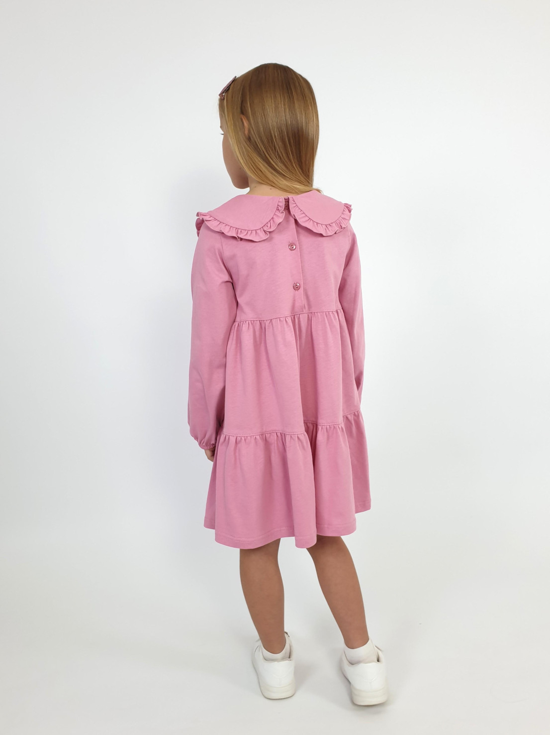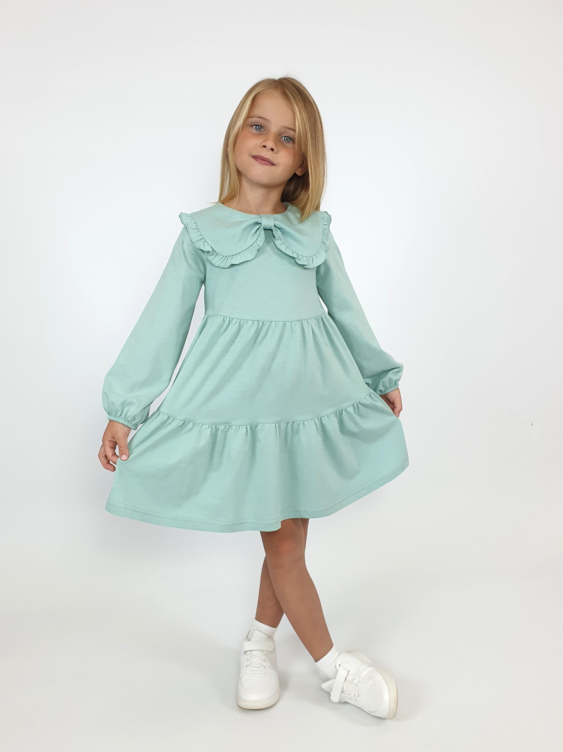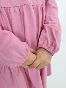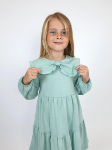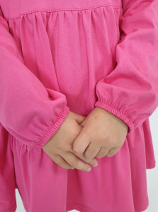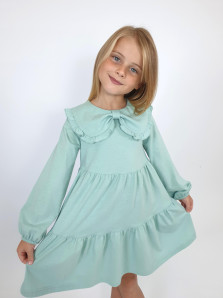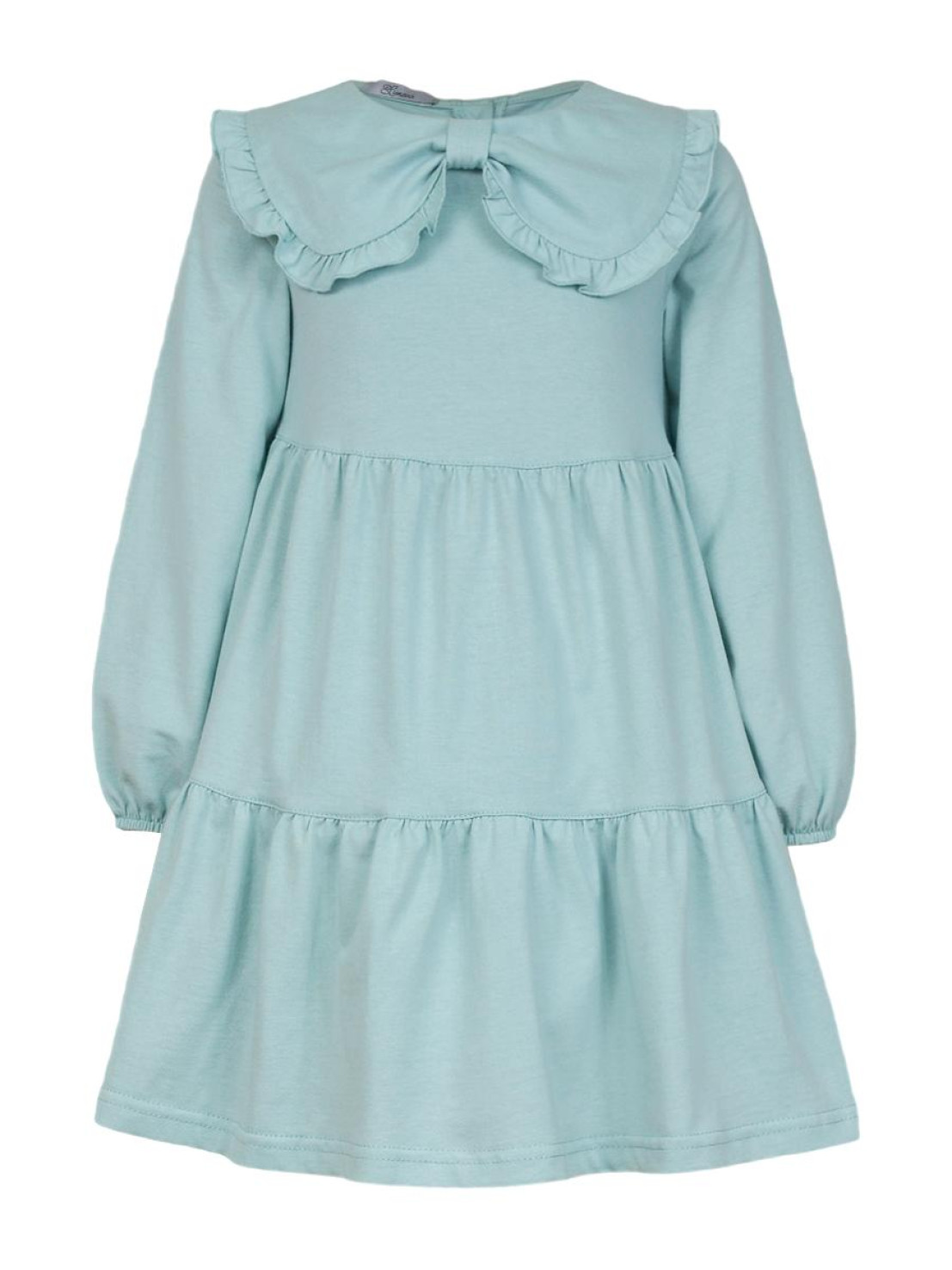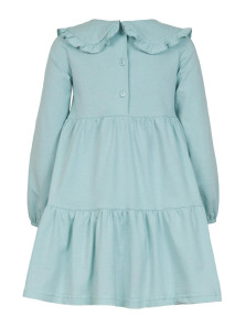 Кулирное полотно:100% х/б. Платье-силуэт трапеция,длинный втачной рукав,внизу собран на резинку.Юбка переда и спинки из двух воланов.В горловине плоско-лежащий воротник с рюшей.Застежка на пуговицы по спинке.