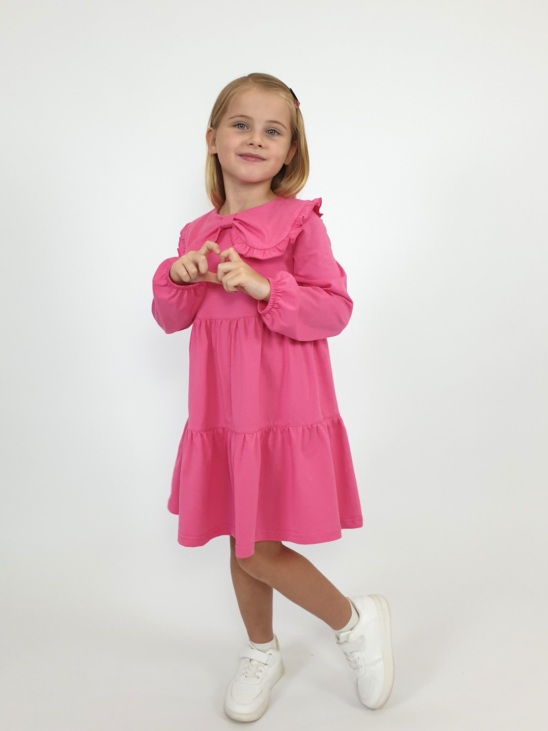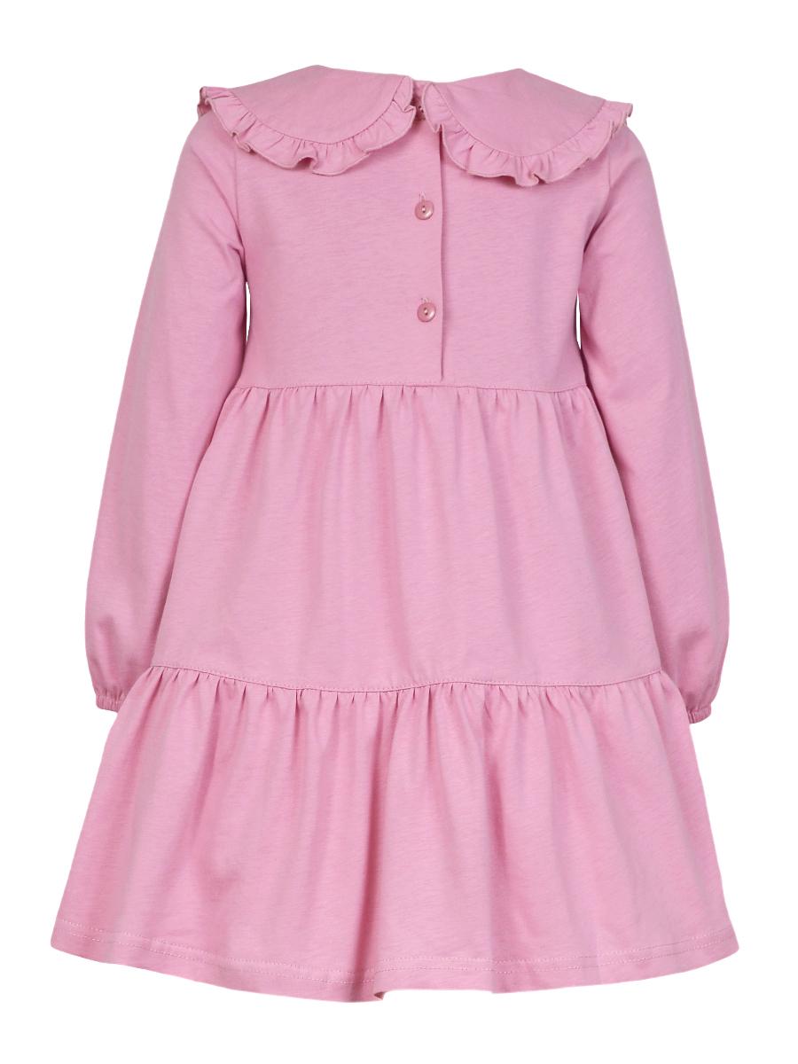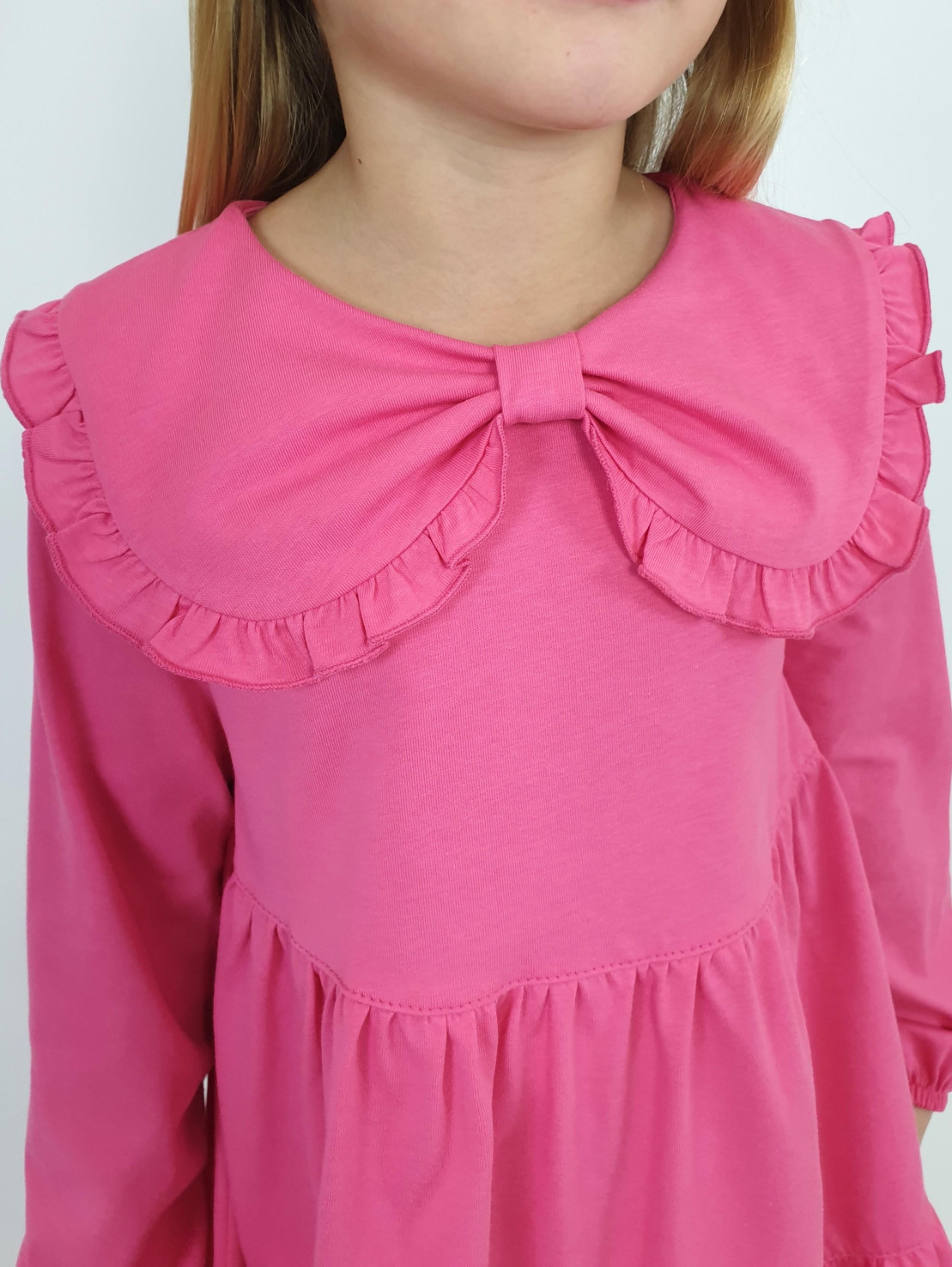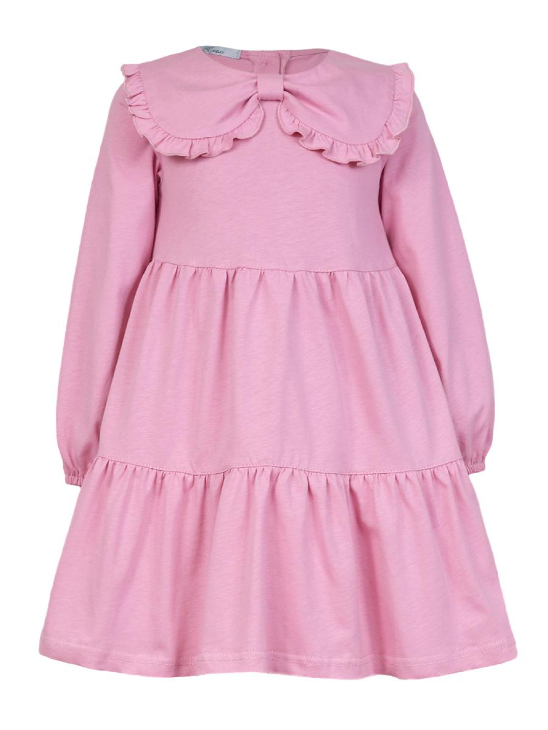 Кулирное полотно:100% х/б. Платье-силуэт трапеция,длинный втачной рукав,внизу собран на резинку.Юбка переда и спинки из двух воланов.В горловине плоско-лежащий воротник с рюшей.Застежка на пуговицы по спинке.