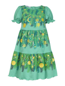 Кулирное полотно:100% х/б. Платье-силуэт трапеция,короткий рукав "фонарик". Юбка переда и спинки из двух воланов,по передним воланом печать и вышивка(пайетки).Кокетка переда с печатью и вышивкой(пайетки,застежка по спинке на пуговицы.Горловина окантована и подшита.