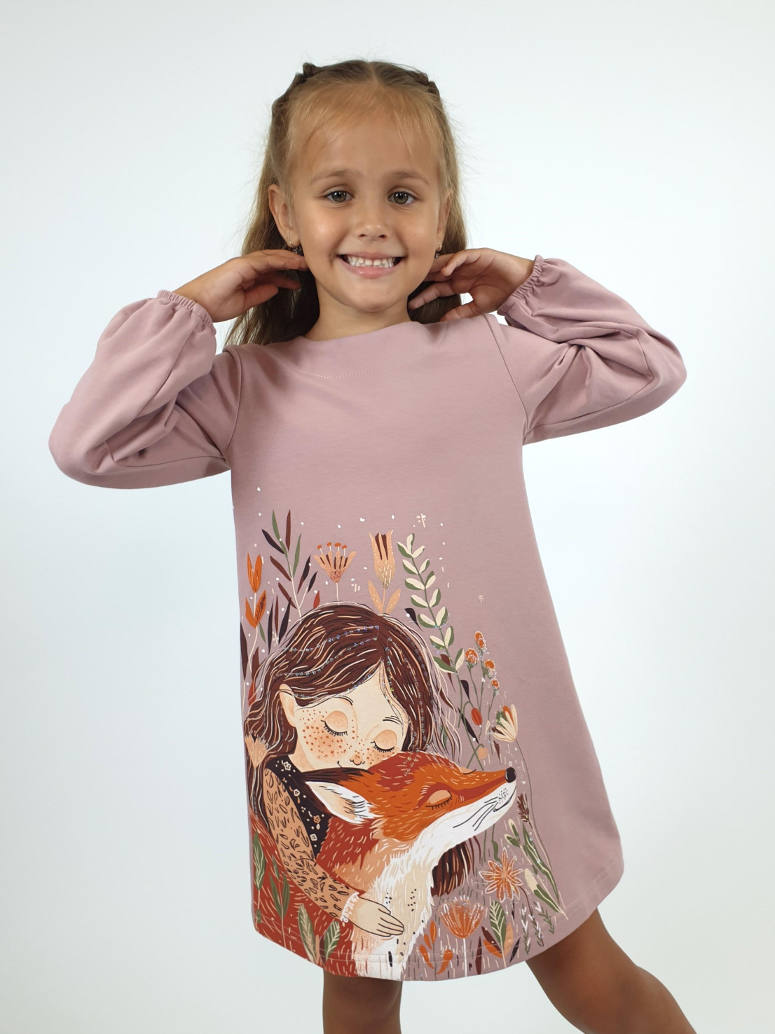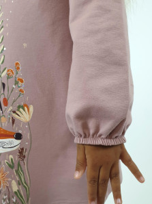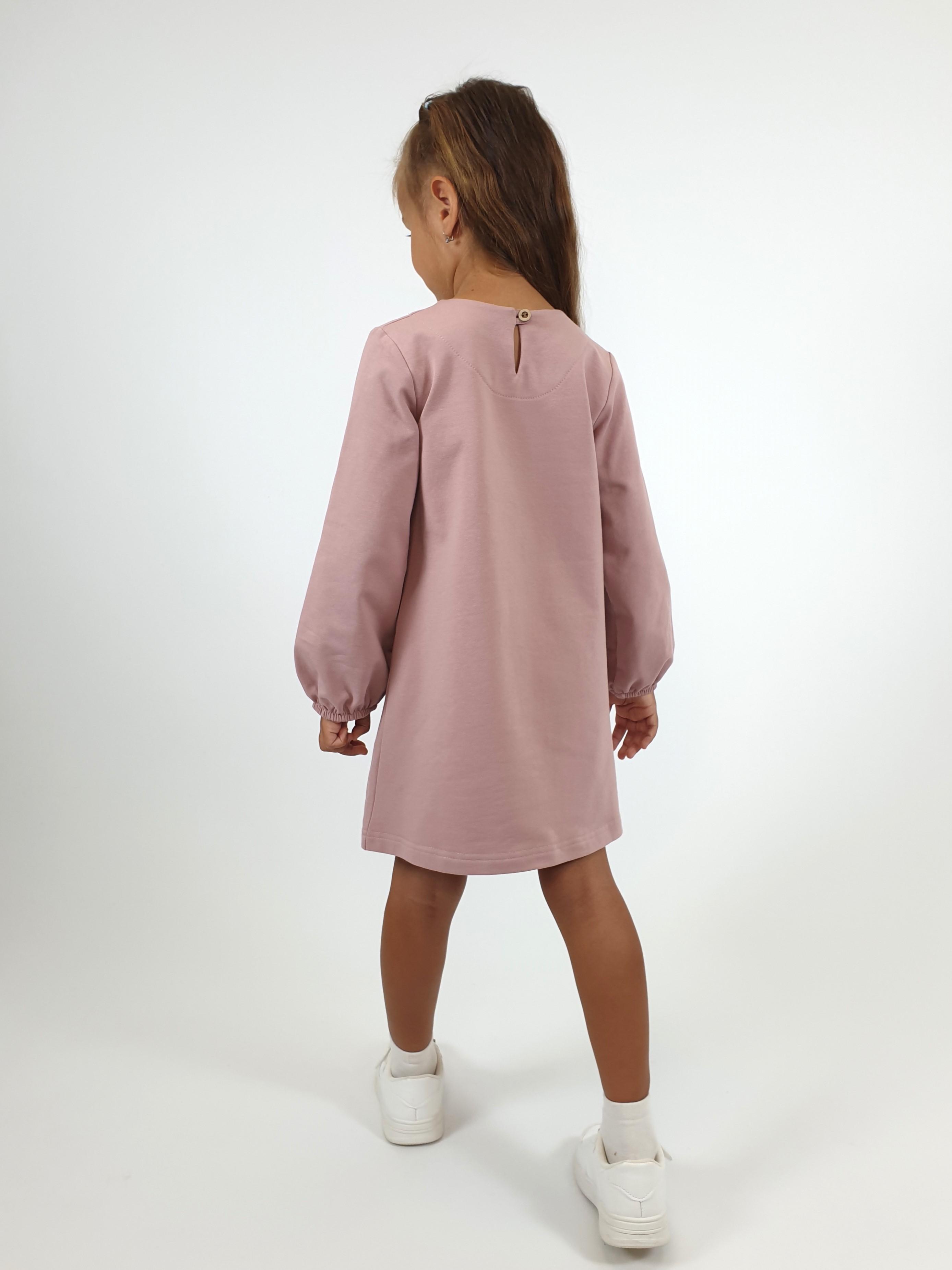 Футер 2-х нитка:95% х/б,5% лайкра. Платье-силуэт трапеция,рукав втачной длинный,внизу на резинке.Печать и вышивка пайетки по переду,горловина обработана обтачкой.Застежка по спинке на пуговицу.