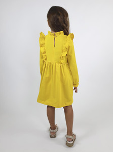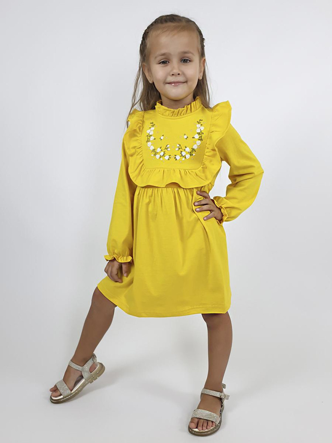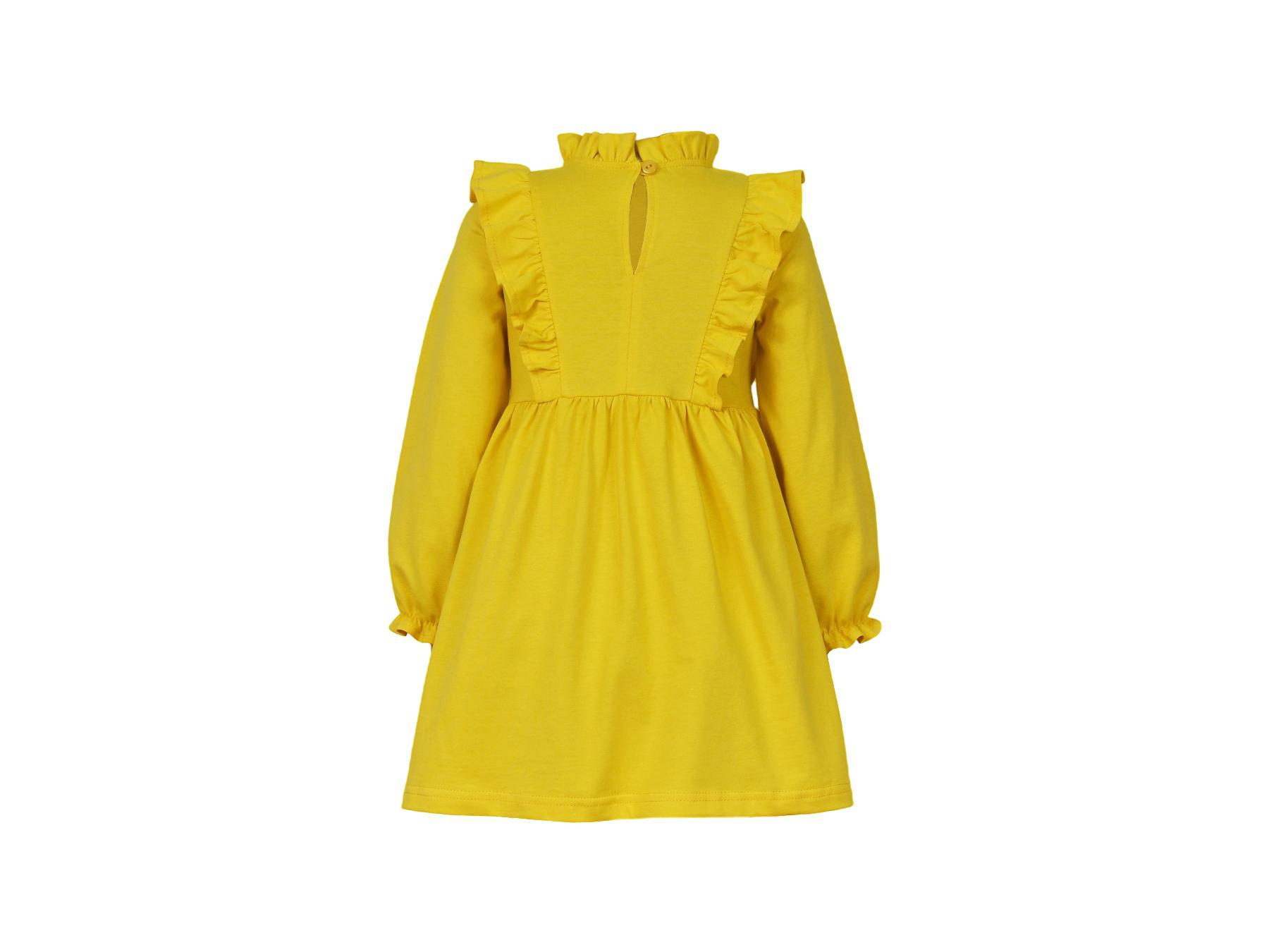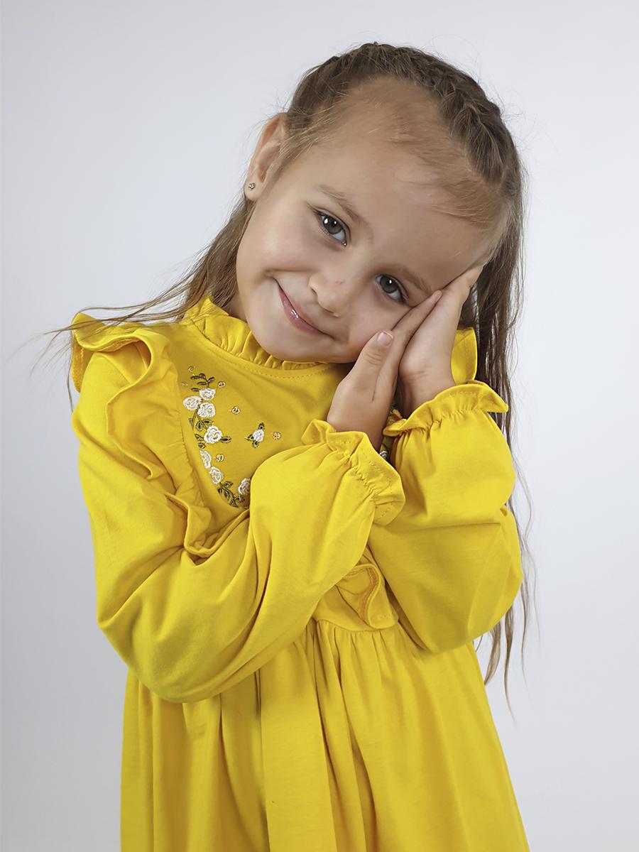 Кулирное полотно (гладь):100%х/б. Платье-отрезная юбка в сборку,кокетка переда и рельефы спинки с рюшей.Рукав длинный,внизу на резинке(венгерке).В горловине рюша со сгибом,шов окантован и подшит.Застежка по спинке на пуговицу.Кокетка с вышивкой.