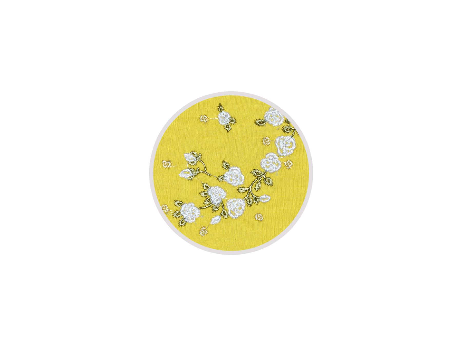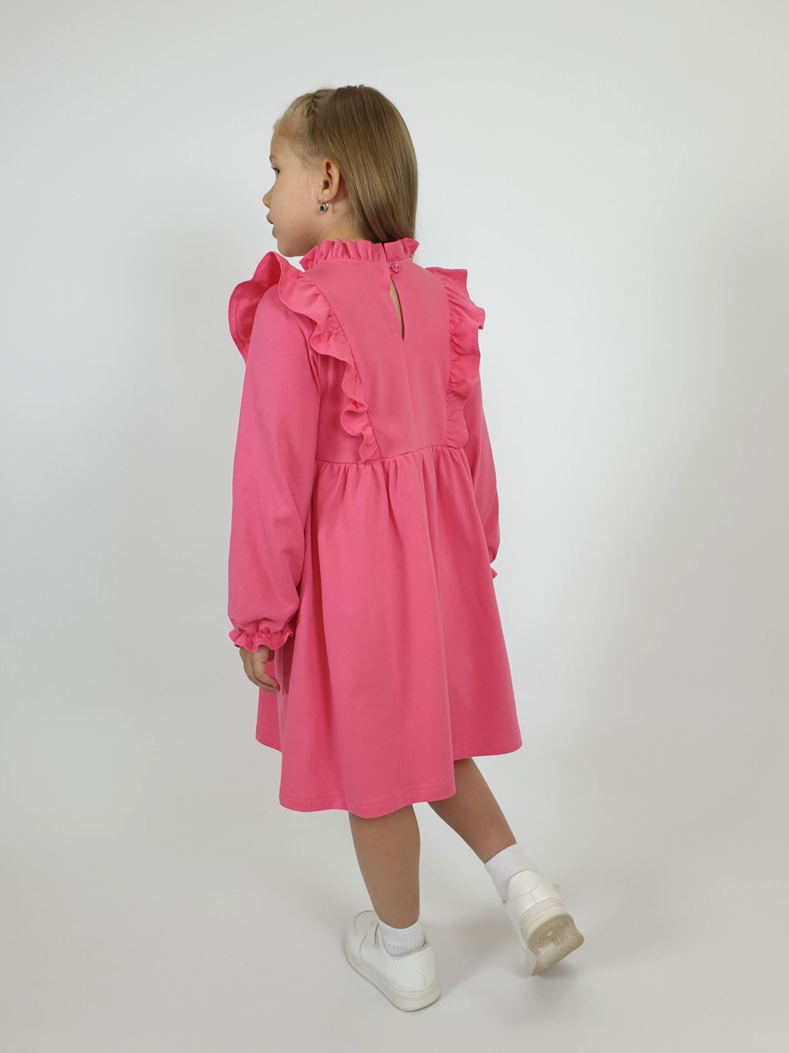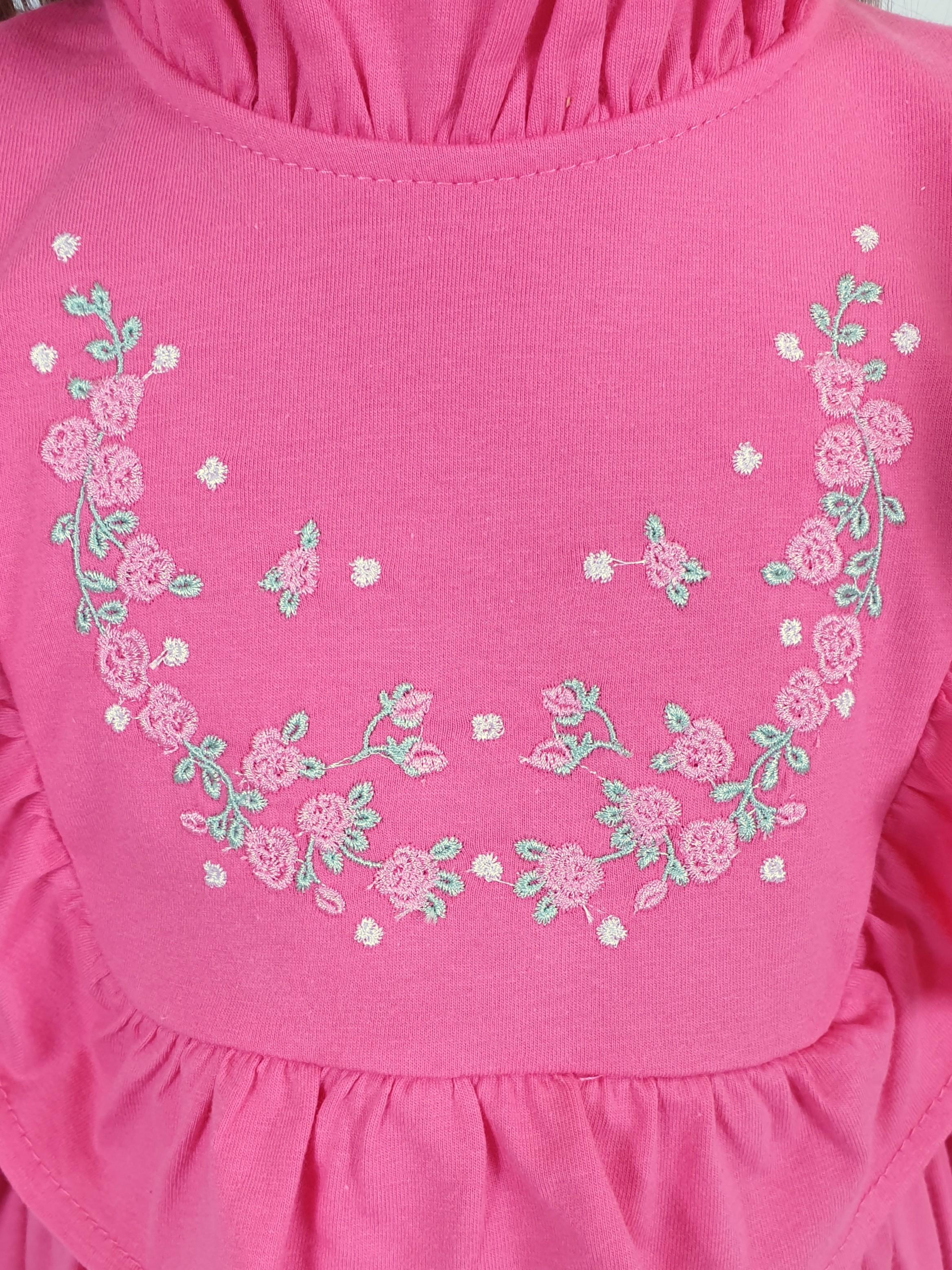 Кулирное полотно (гладь):100%х/б. Платье-отрезная юбка в сборку,кокетка переда и рельефы спинки с рюшей.Рукав длинный,внизу на резинке(венгерке).В горловине рюша со сгибом,шов окантован и подшит.Застежка по спинке на пуговицу.Кокетка с вышивкой.