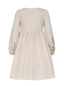 Кулирное полотно:100% х/б. Платье-приталенный силуэт.Длинный рукав-сборка по окату,внизу на резинке.Горловина окантована и подшита,по спинке разрез-застежка на пуговицу.Печать на полочке,юбке переда,рукавах.Отрезная юбка со сборкой.
