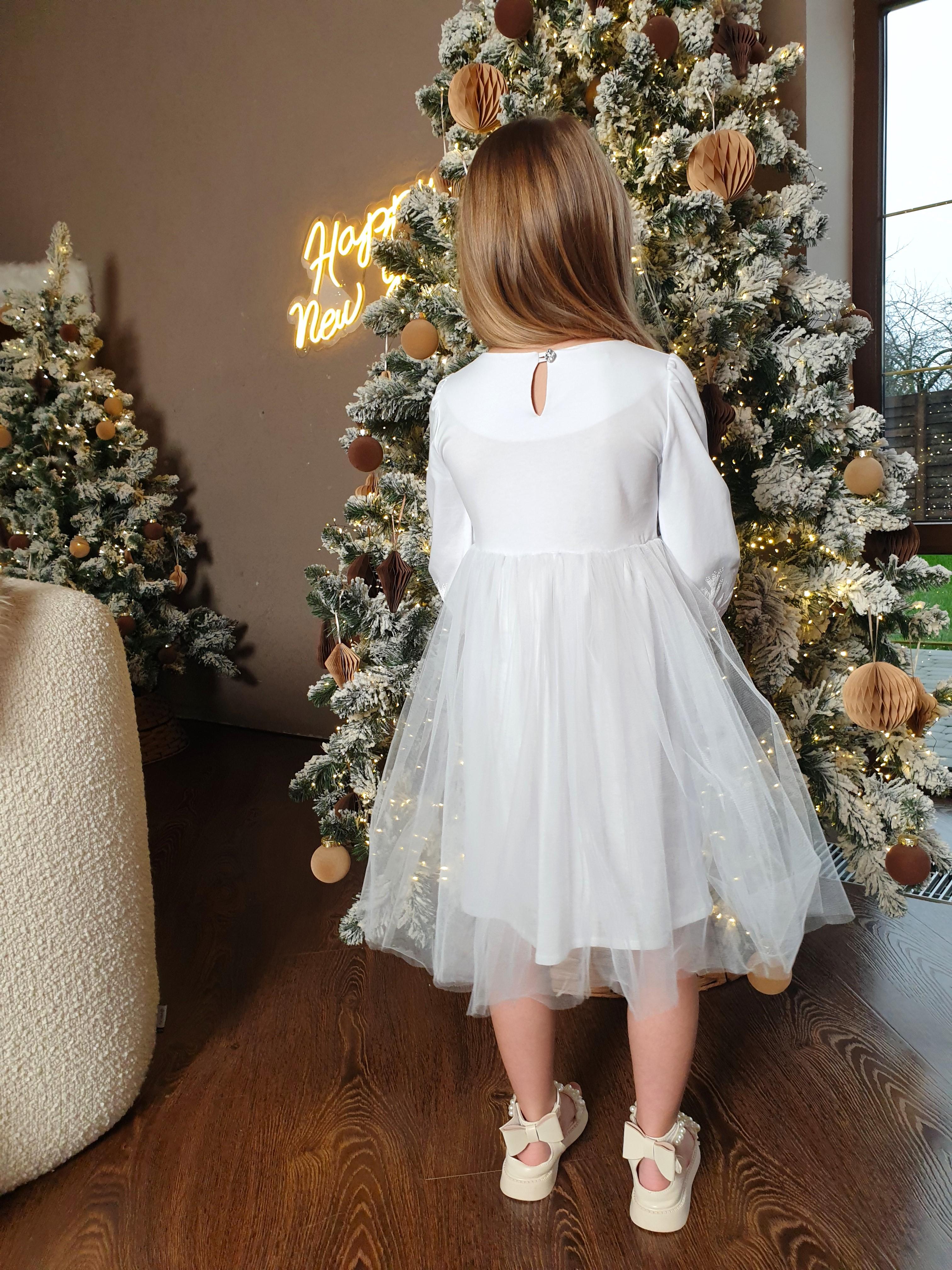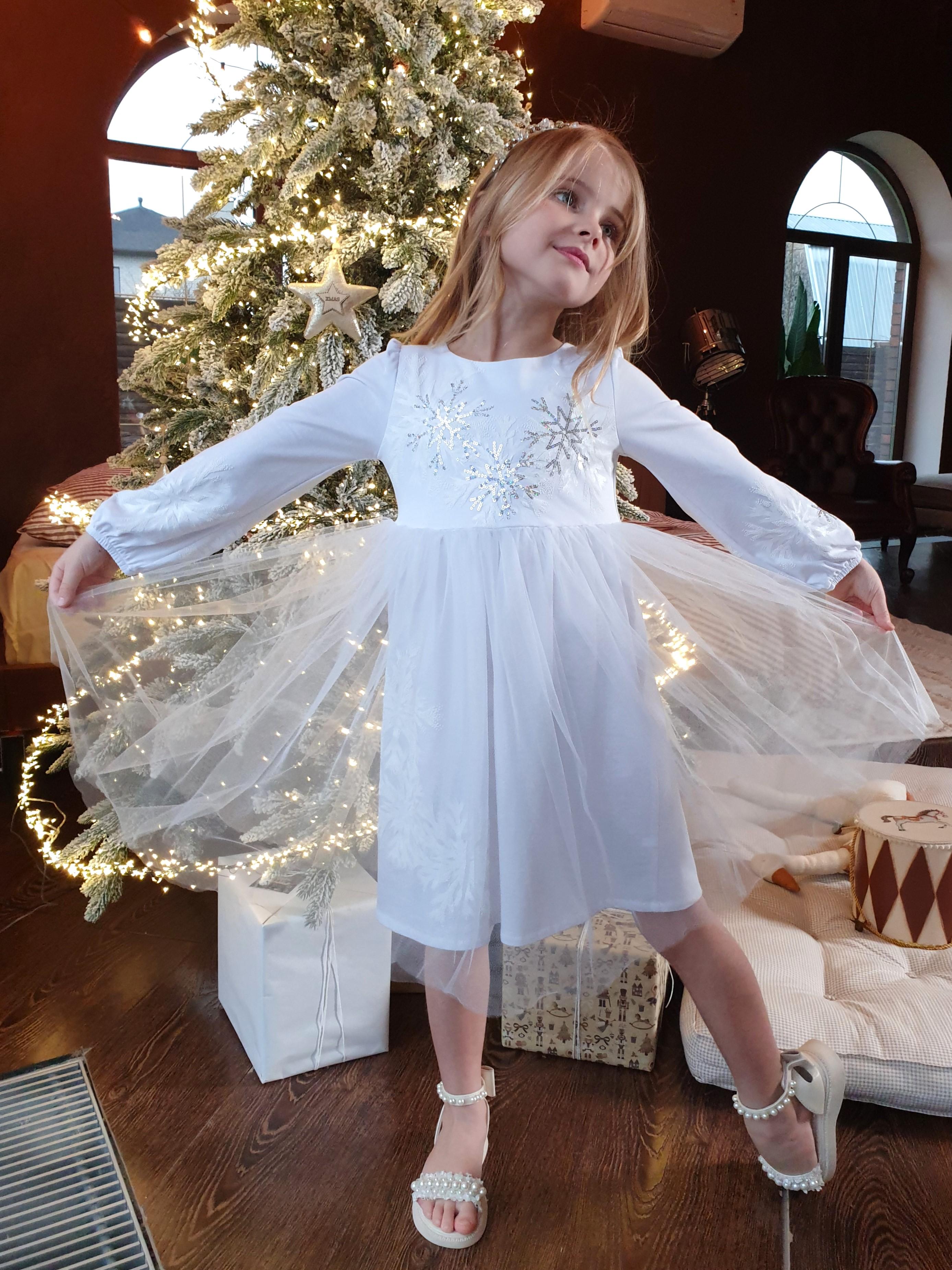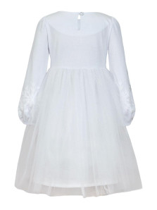 Кулирное полотно:95% х/б.,5% лайкра. (подкладка)-100% х/б. (сетка-отделка)-100% п/э. Платье-приталенный силуэт,на подкладке.Длинный рукав-сборка по окату,внизу на резинке.Оотрезная юбка на подкладке с сеткой в два слоя.Застежка по спинке на пуговицу.Печать и вышивка(пайетки) на переде и рукавах.