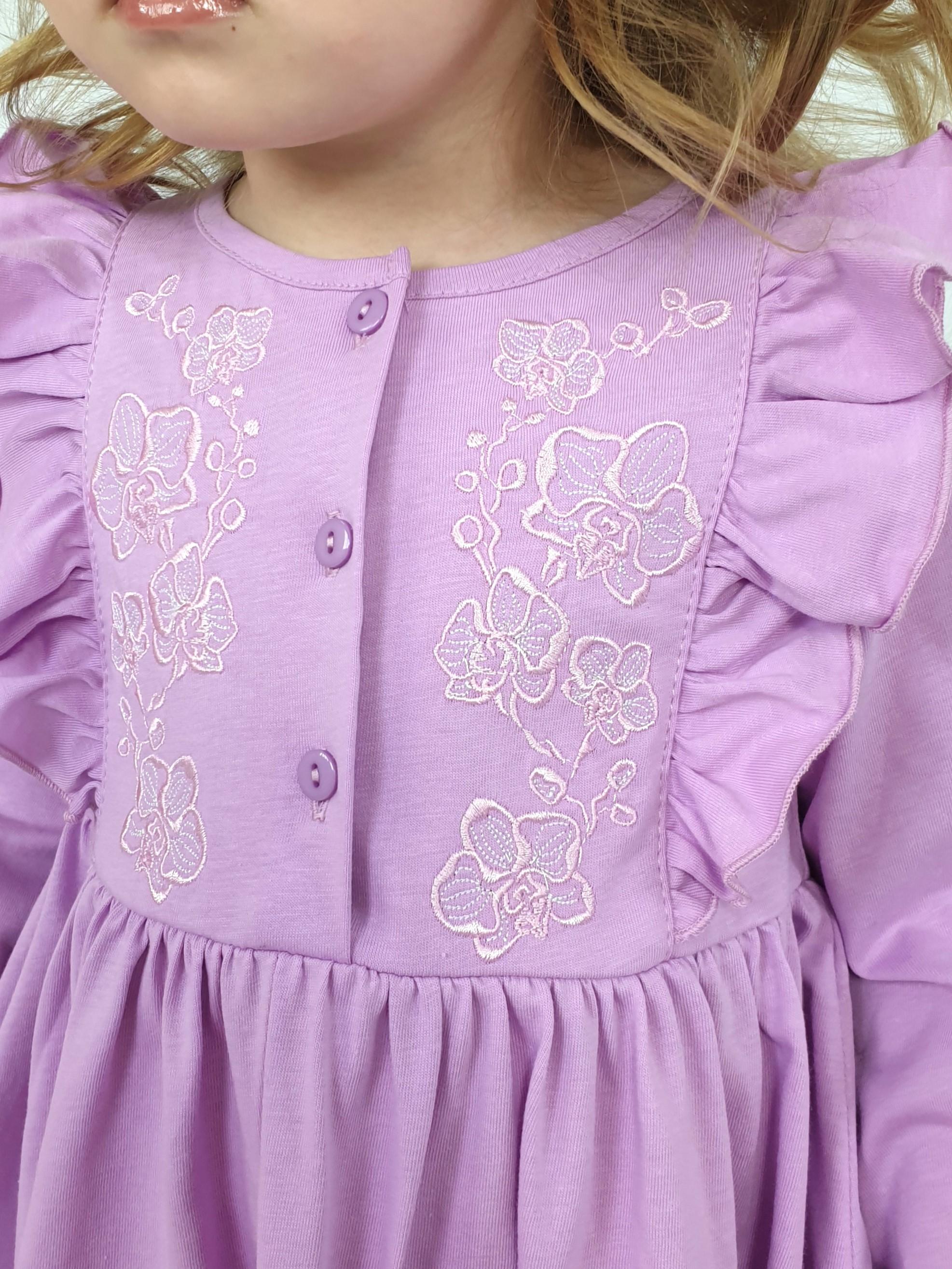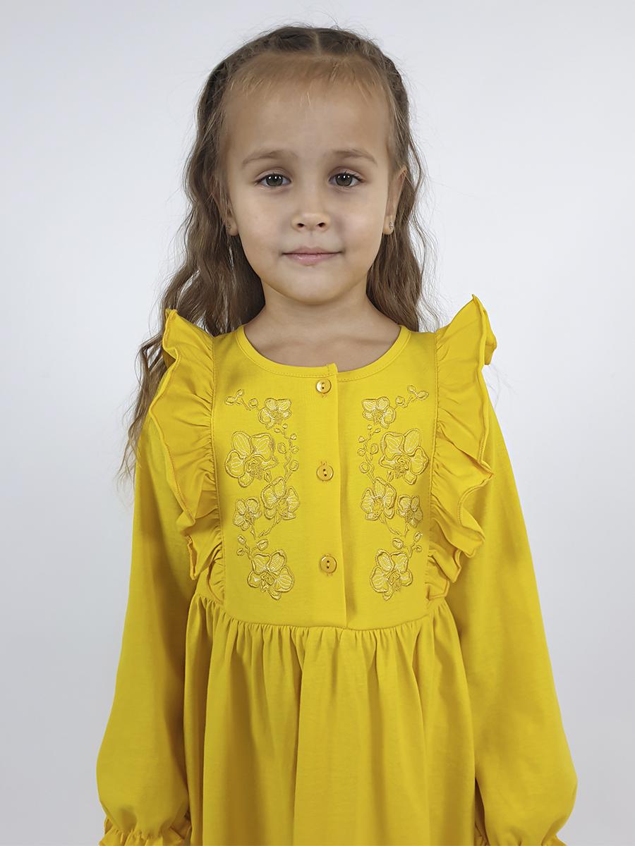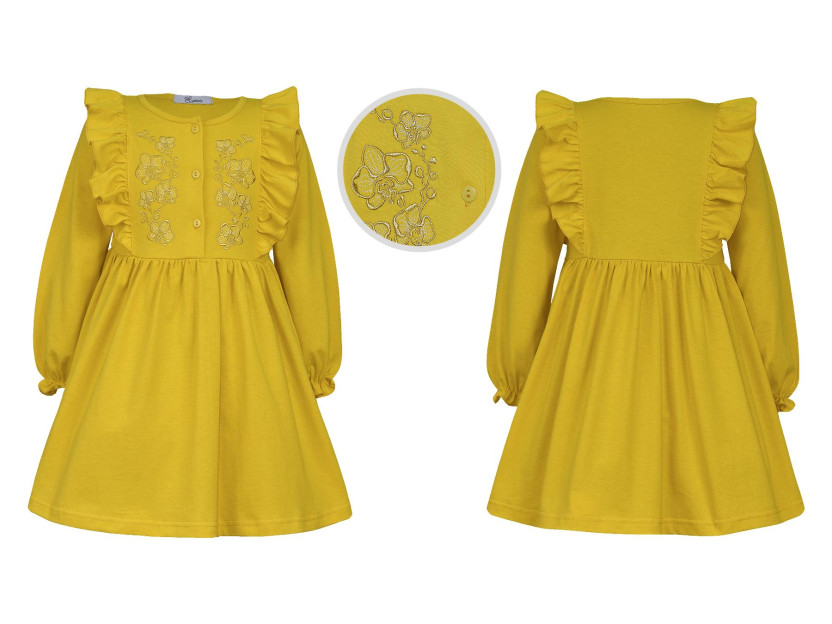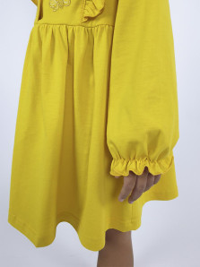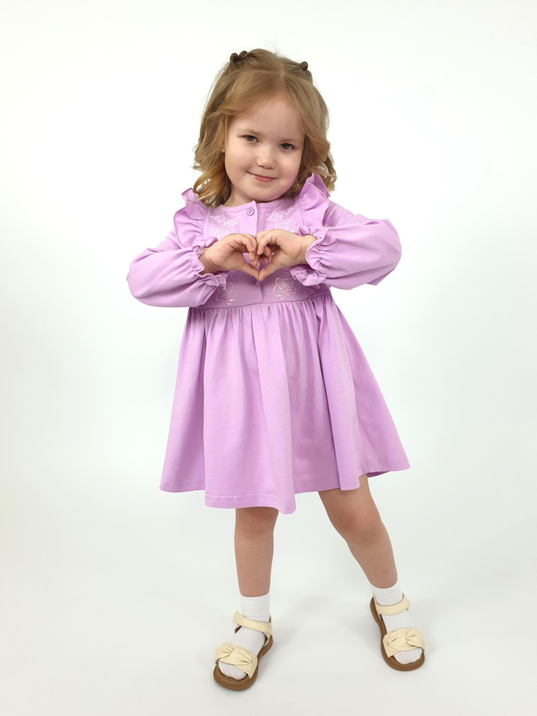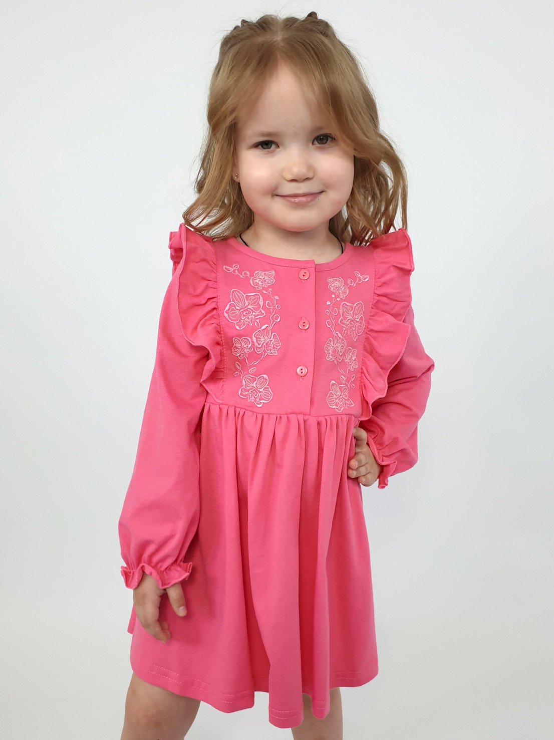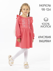 Кулирное полотно:100% х/б. Платье-полуприлегающего силуэта,длинный рукав с резинкой "венгерка" внизу.Отрезная юбка со сборкой.рельефы с рюшей.Вышивка на переде.Горловина окантована.застежка центральная на пуговицы.
