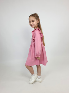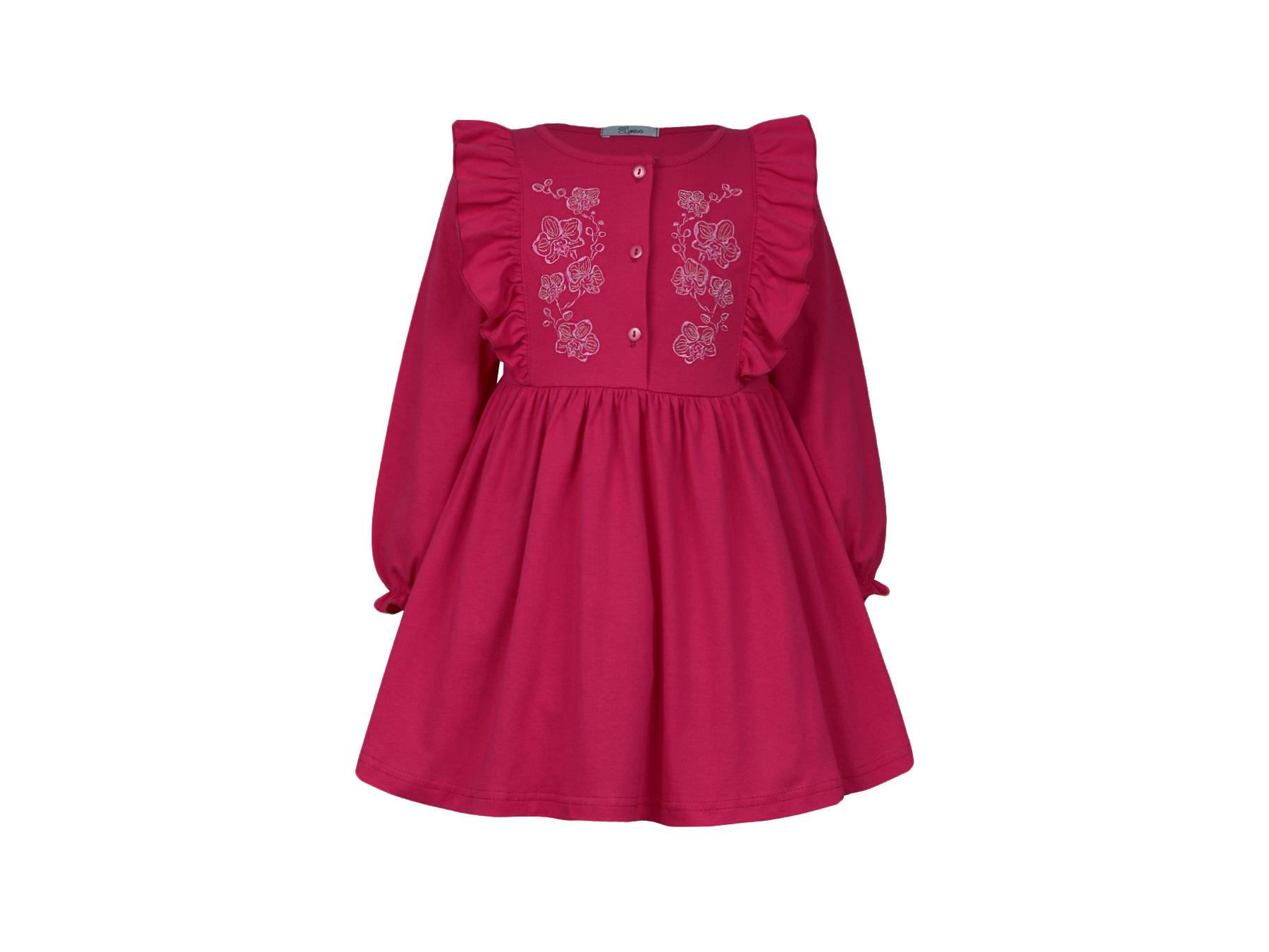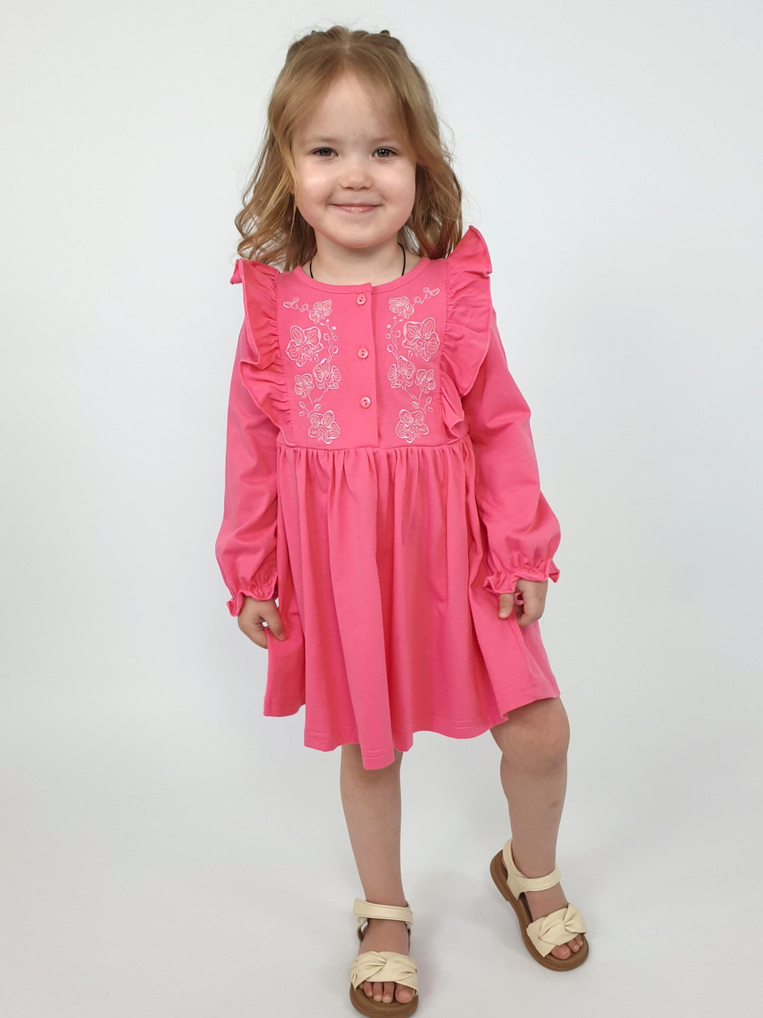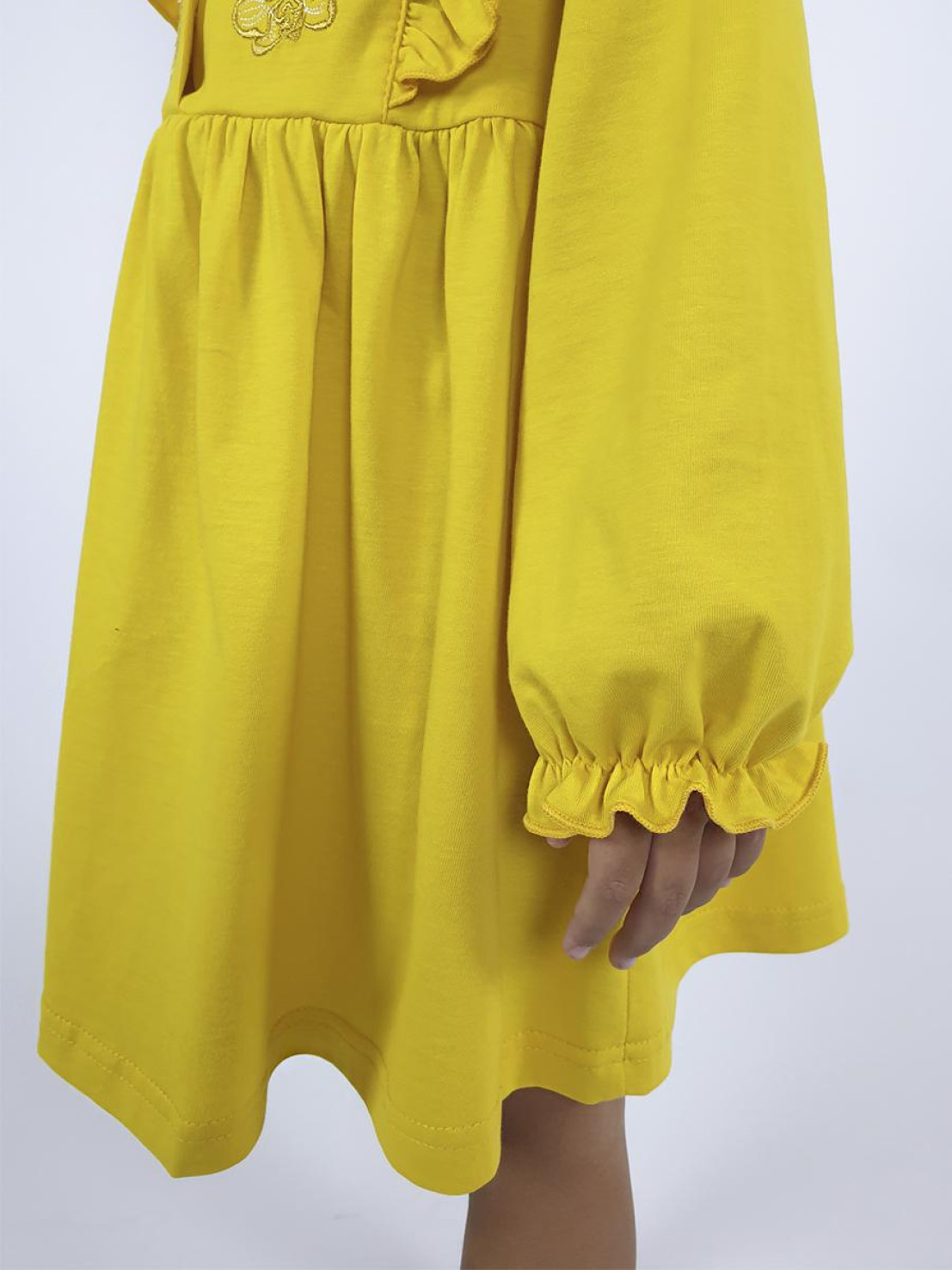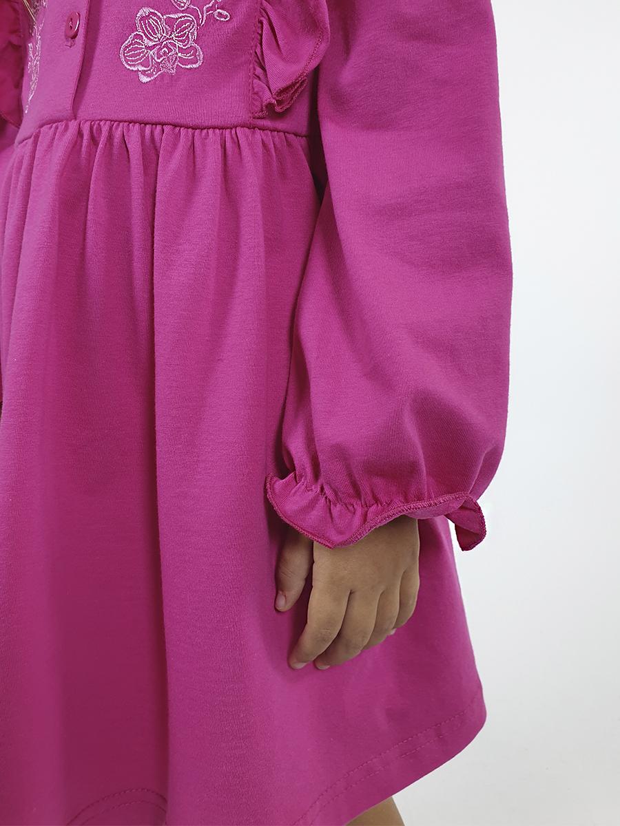 Кулирное полотно:100% х/б. Платье-полуприлегающего силуэта,длинный рукав с резинкой "венгерка" внизу.Отрезная юбка со сборкой.рельефы с рюшей.Вышивка на переде.Горловина окантована.застежка центральная на пуговицы.