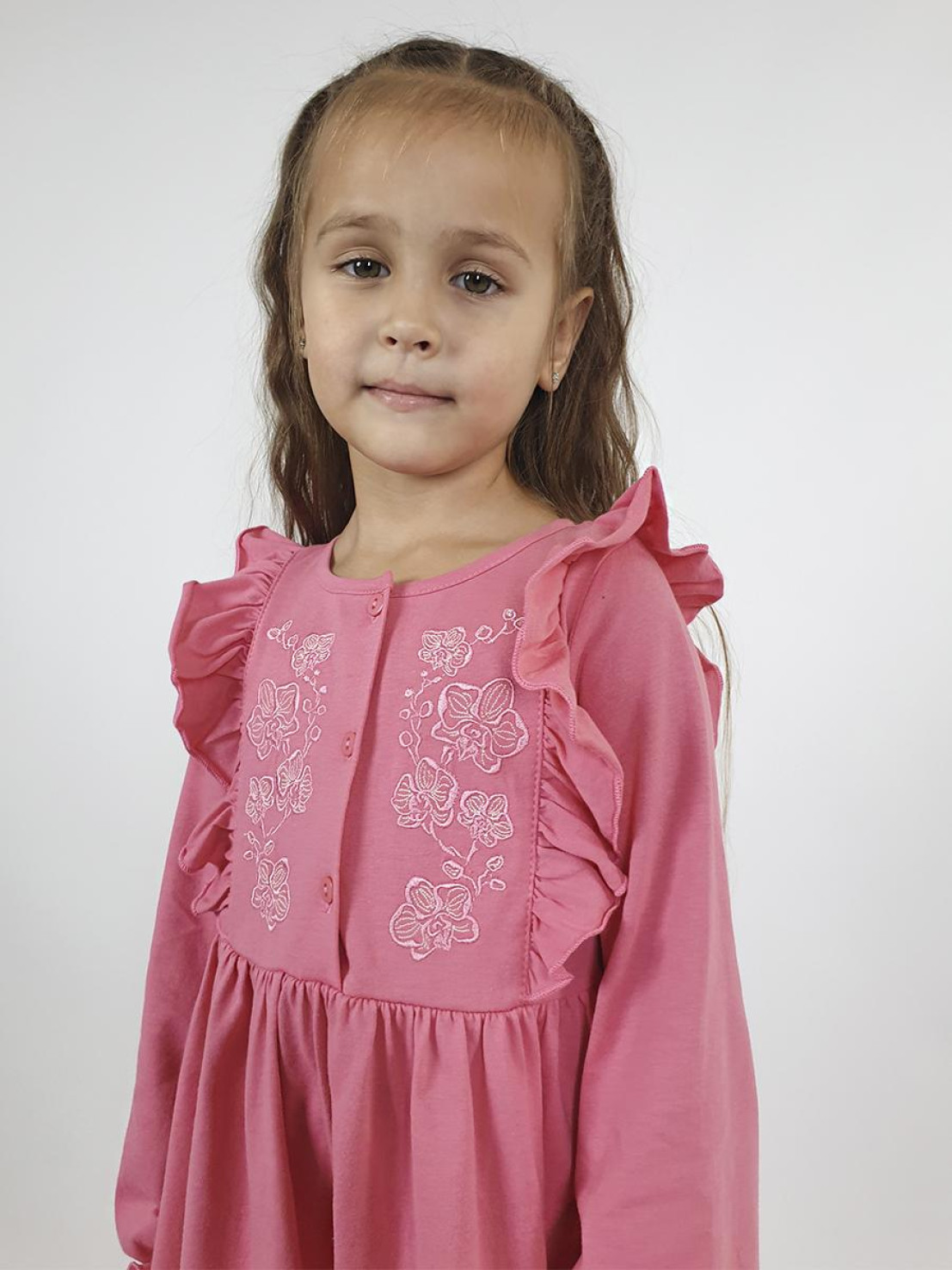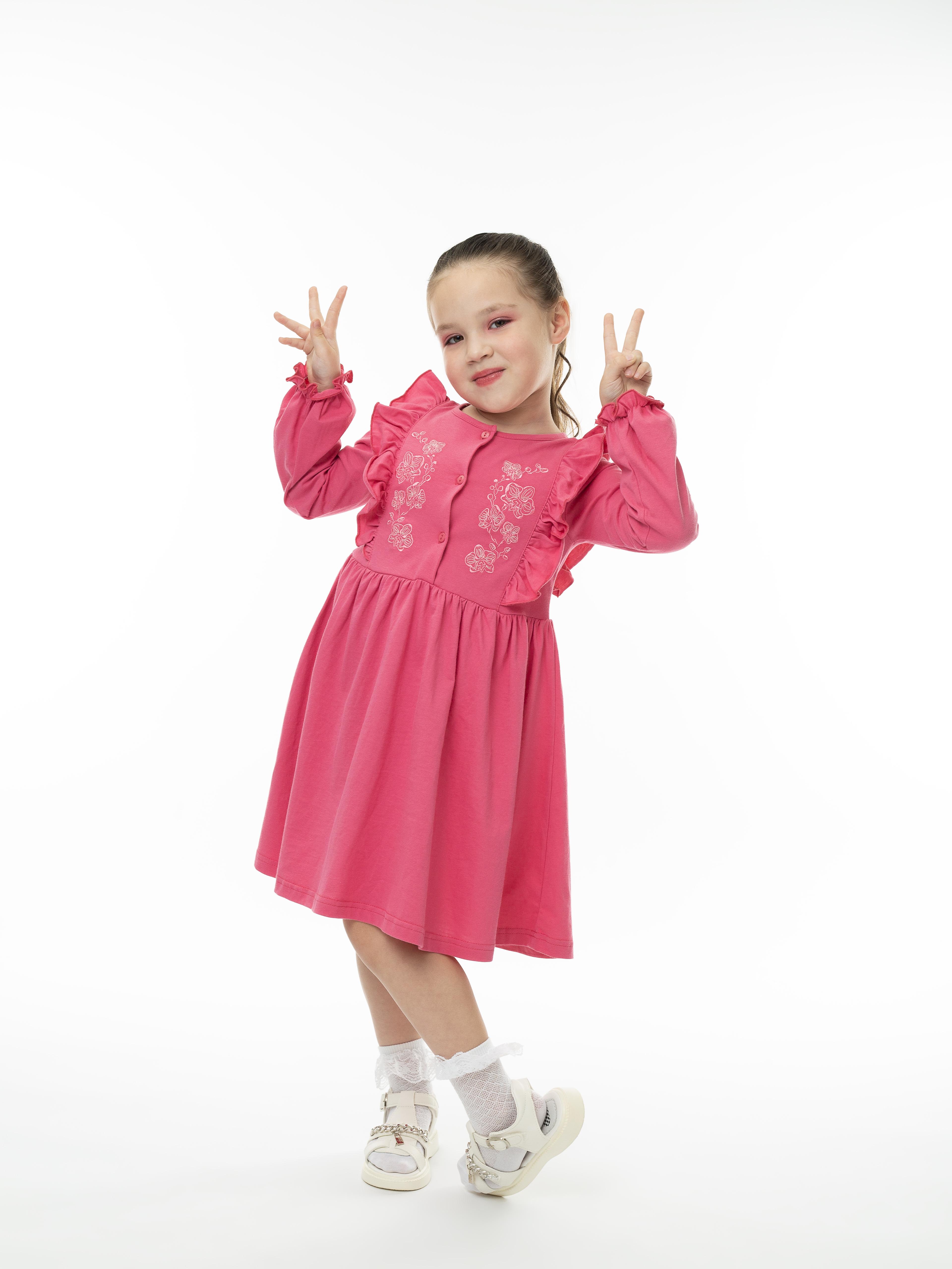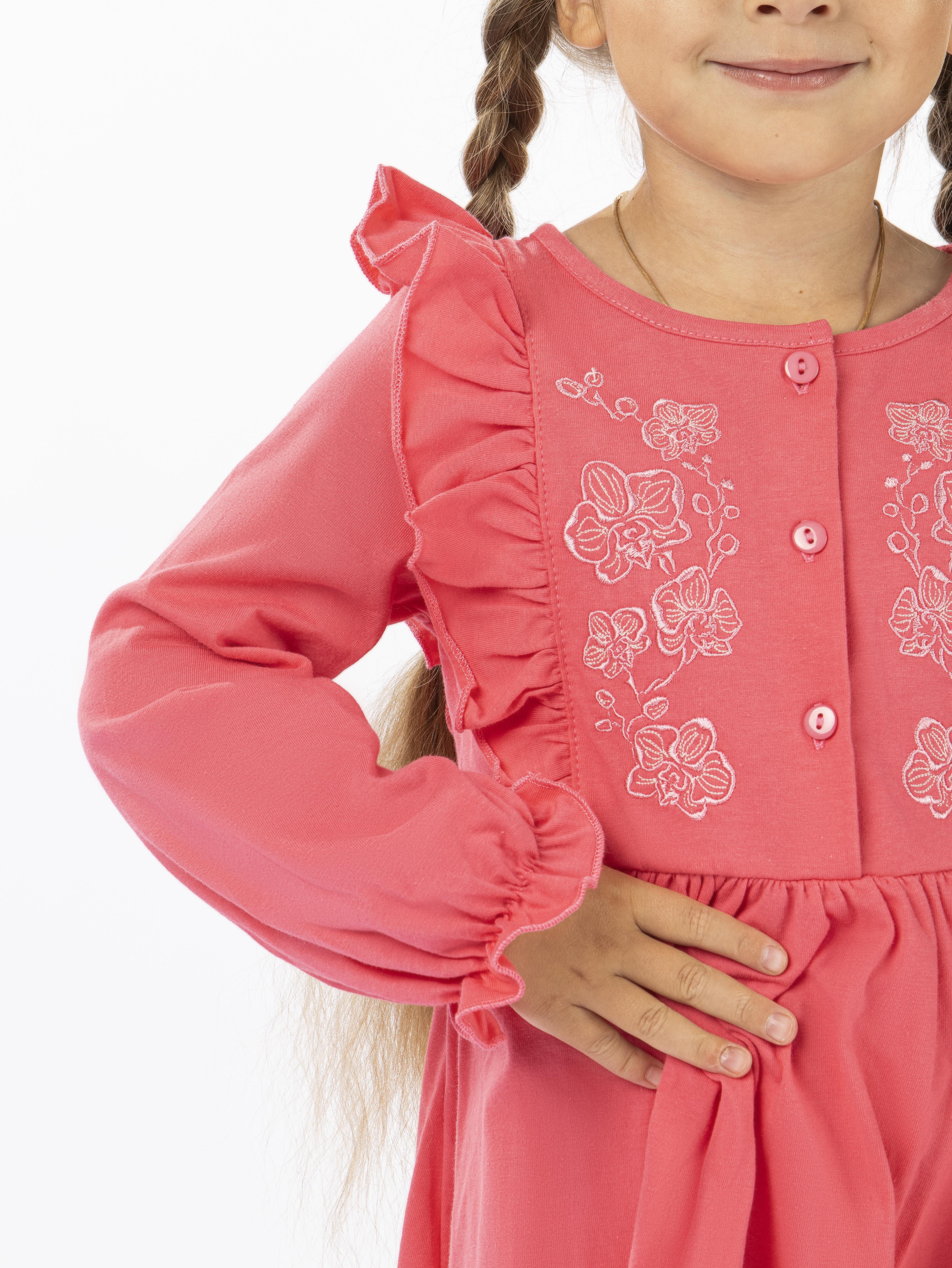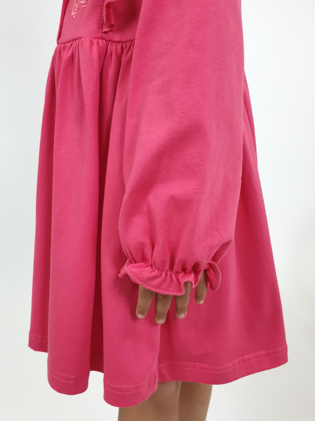 Кулирное полотно:100% х/б. Платье-полуприлегающего силуэта,длинный рукав с резинкой "венгерка" внизу.Отрезная юбка со сборкой.рельефы с рюшей.Вышивка на переде.Горловина окантована.застежка центральная на пуговицы.