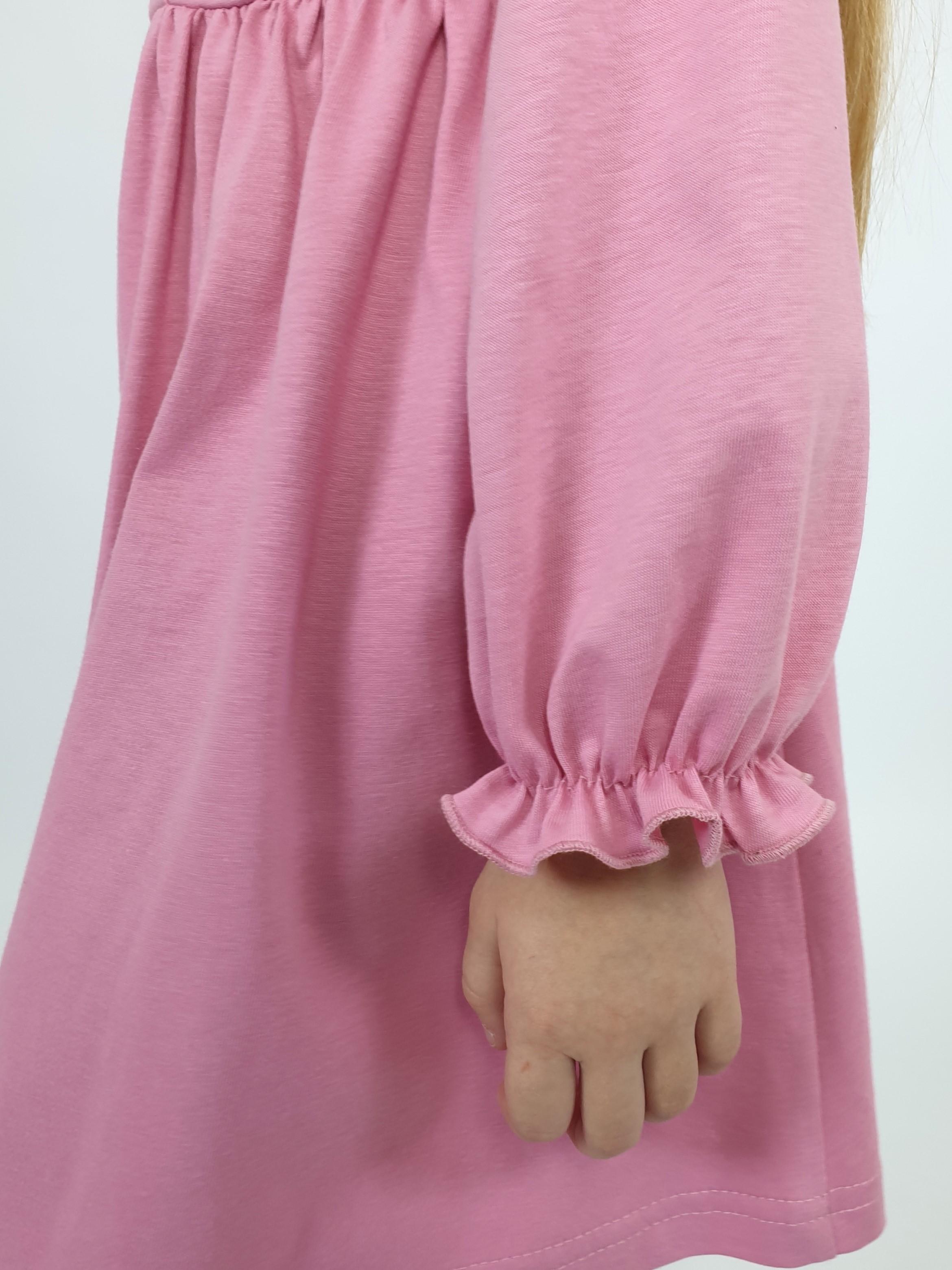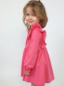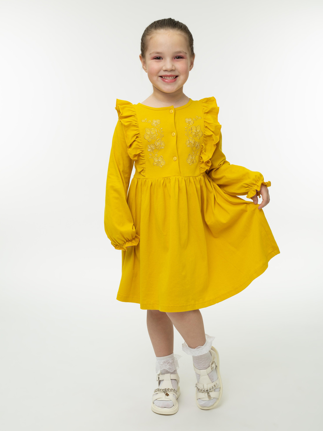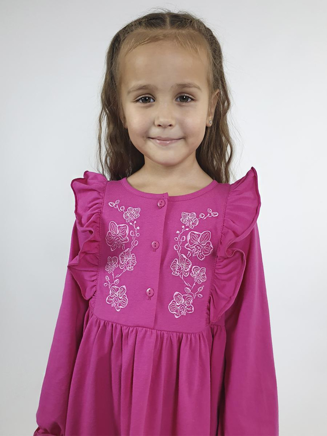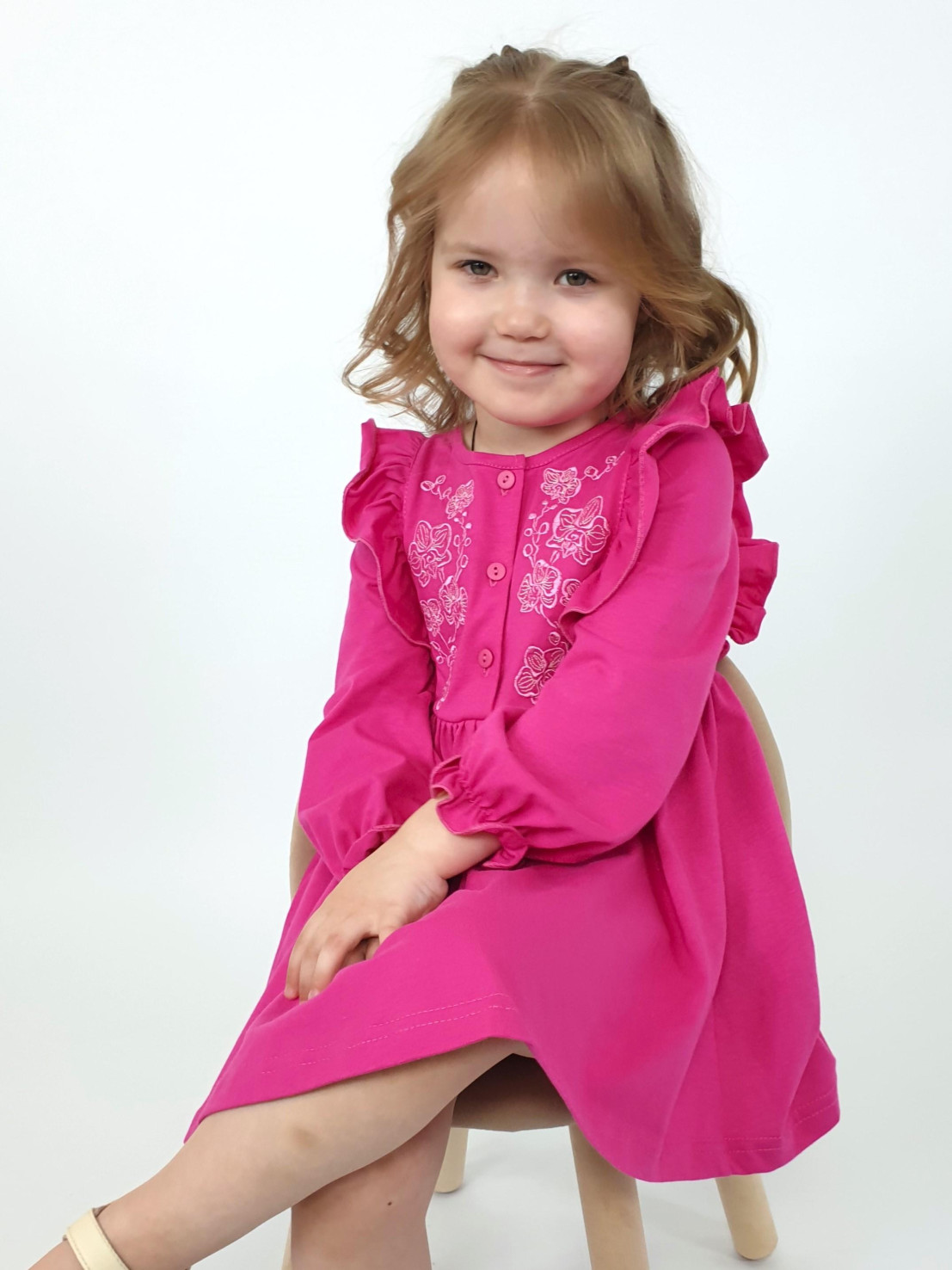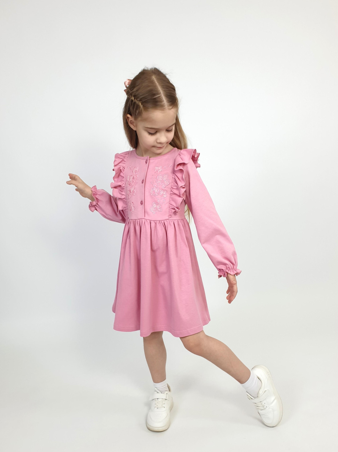 Кулирное полотно:100% х/б. Платье-полуприлегающего силуэта,длинный рукав с резинкой "венгерка" внизу.Отрезная юбка со сборкой.рельефы с рюшей.Вышивка на переде.Горловина окантована.застежка центральная на пуговицы.
